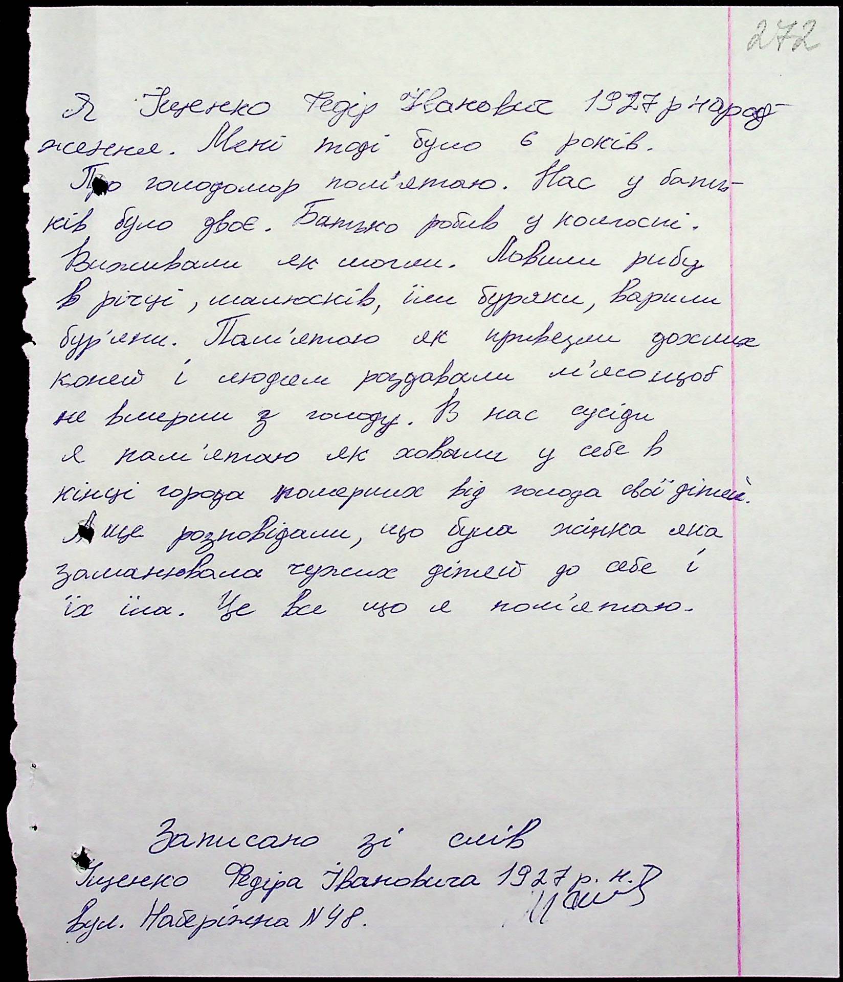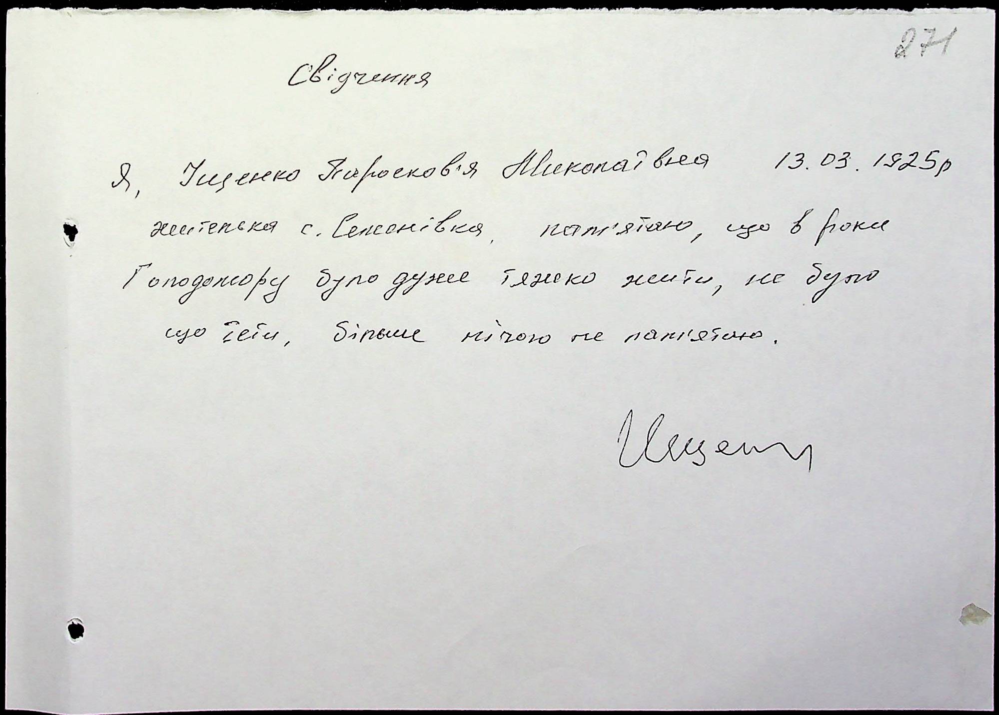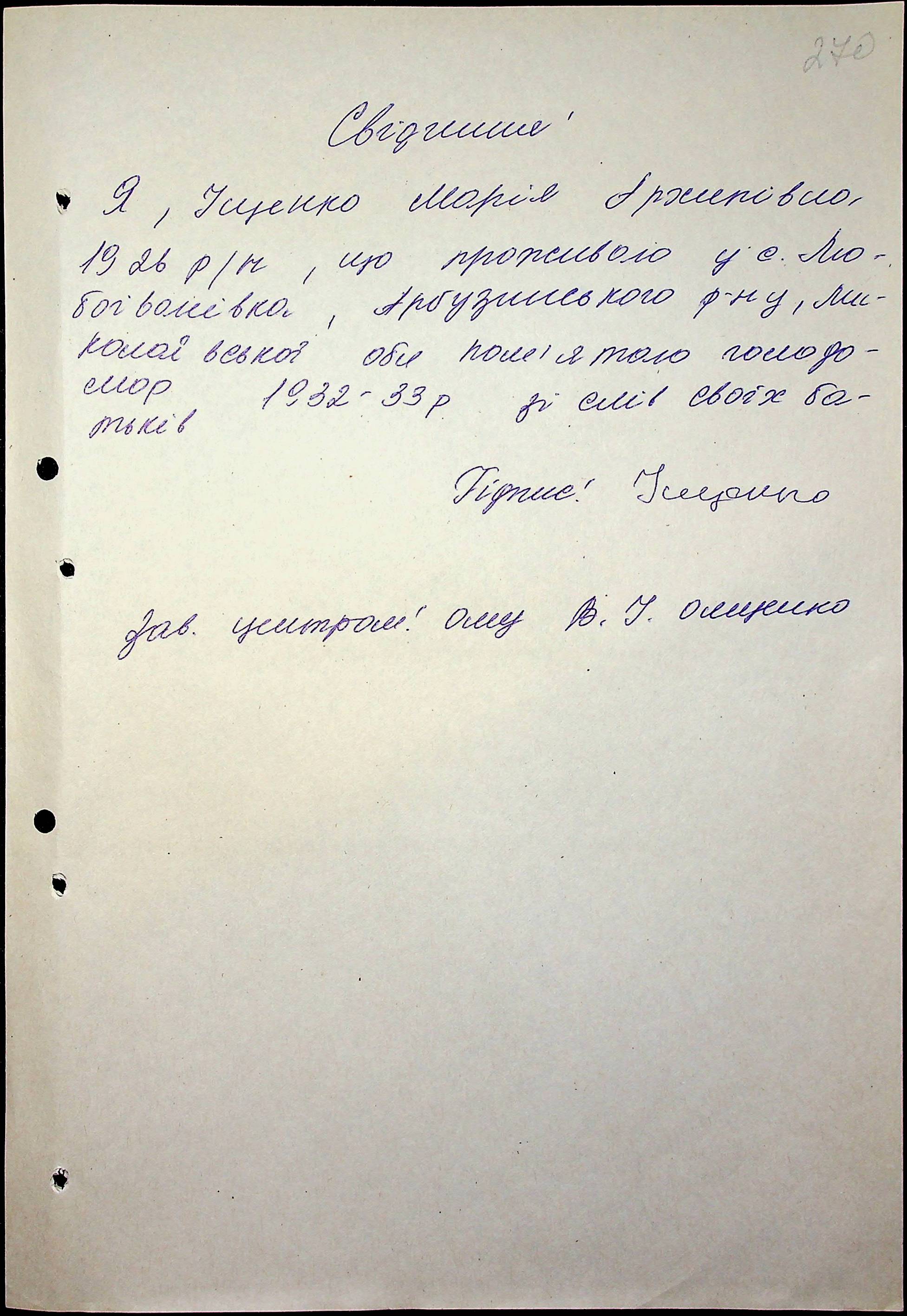 • • • • Справа № 1 “Свідчення очевидців Голодомору 1932-1933 років, які проживають в Арбузинському районі, з прізвищами на літери А–І. Том 1”