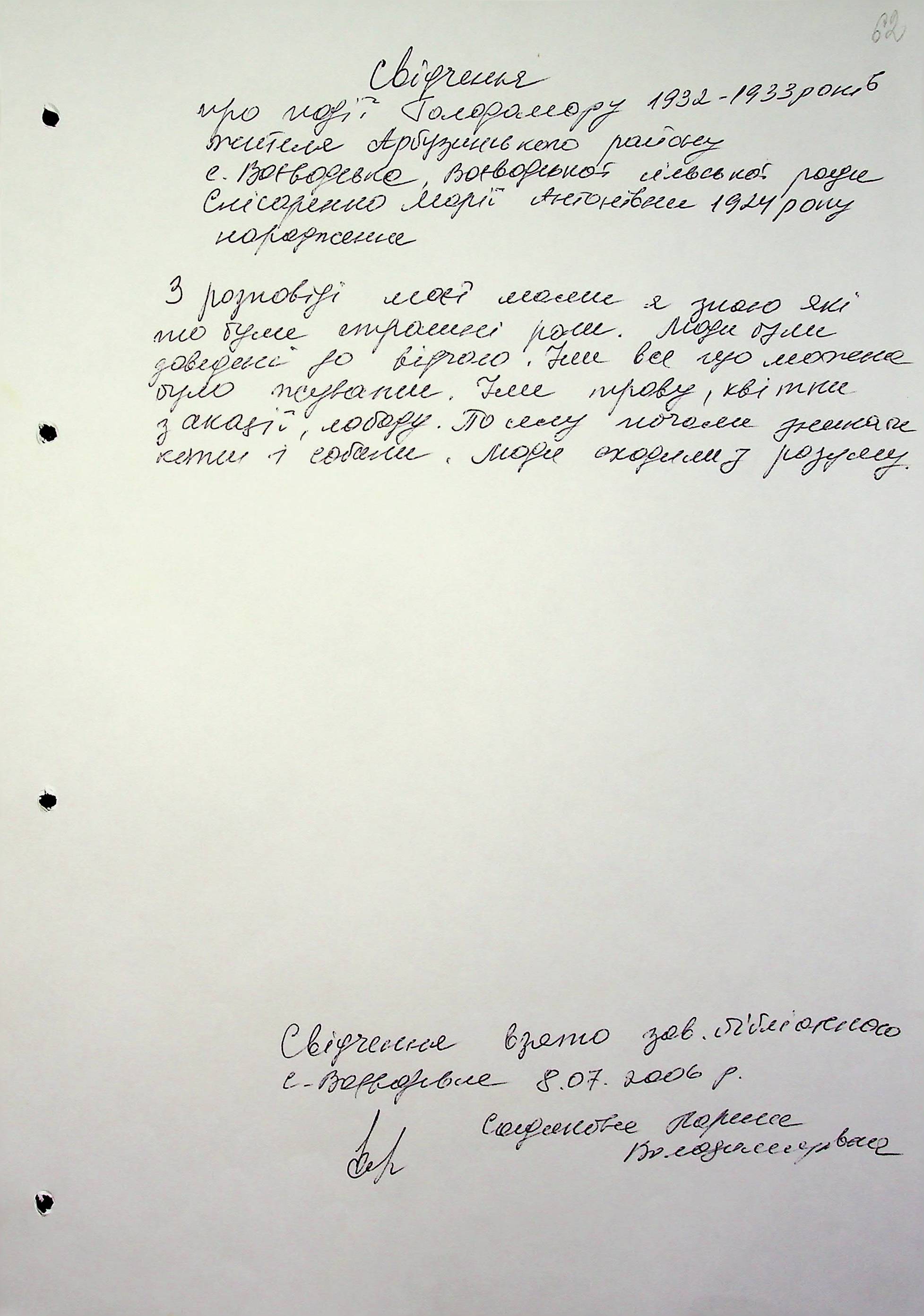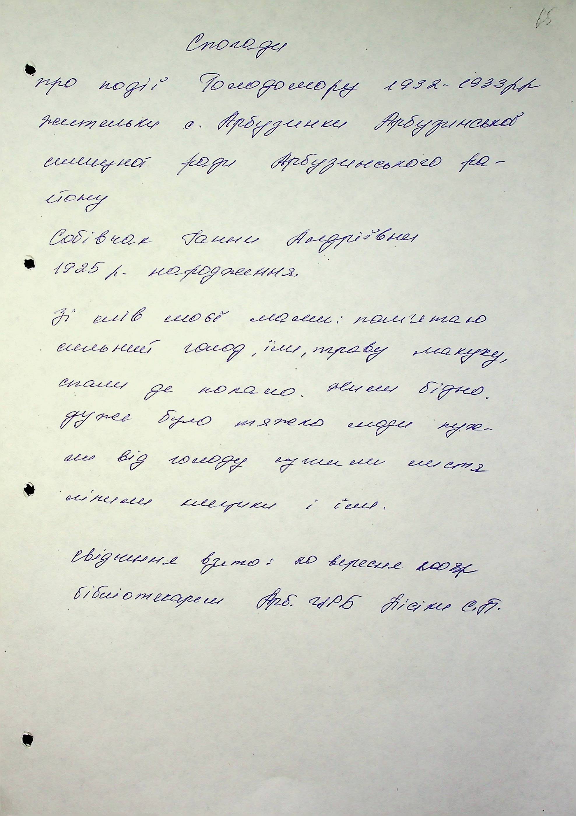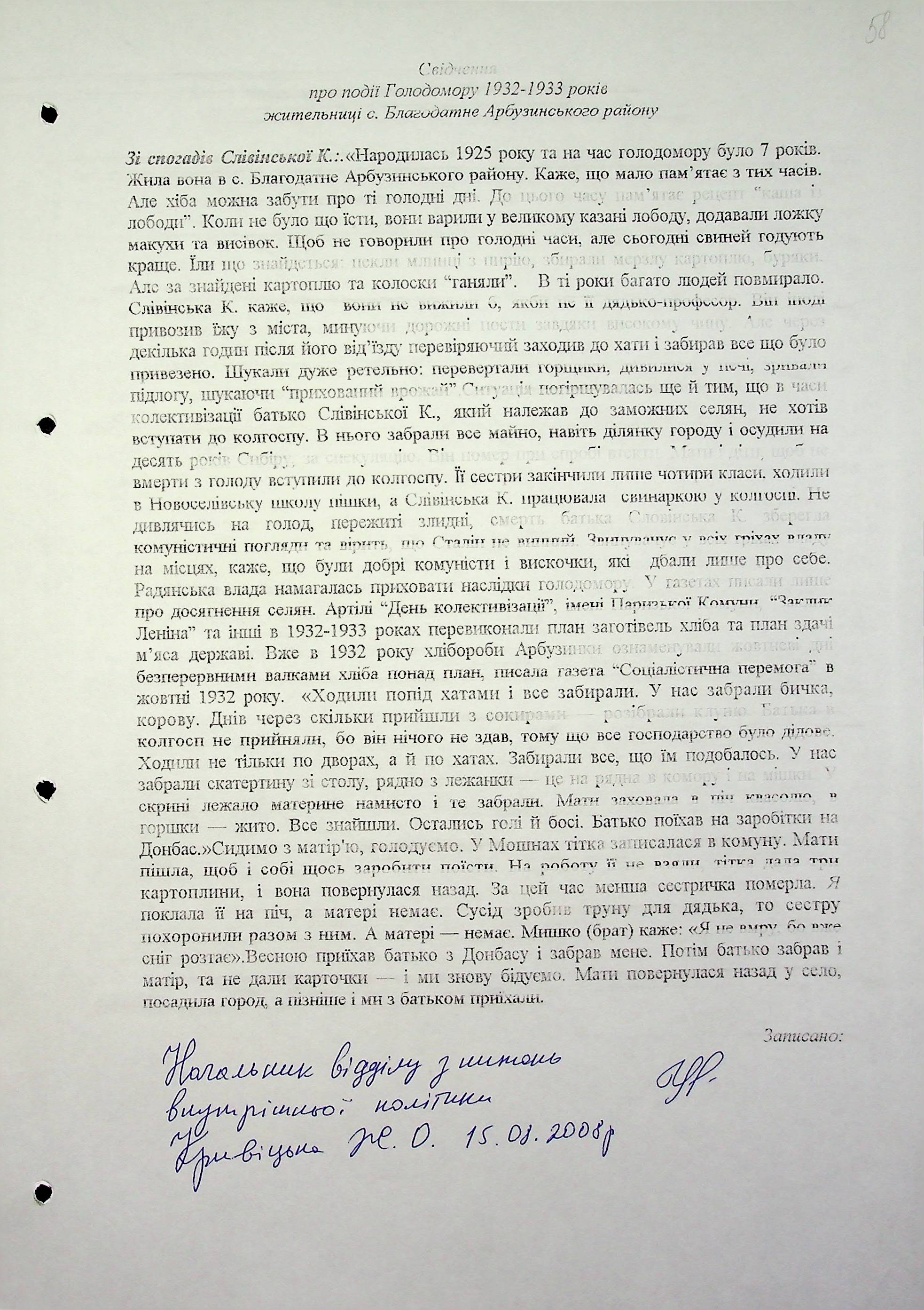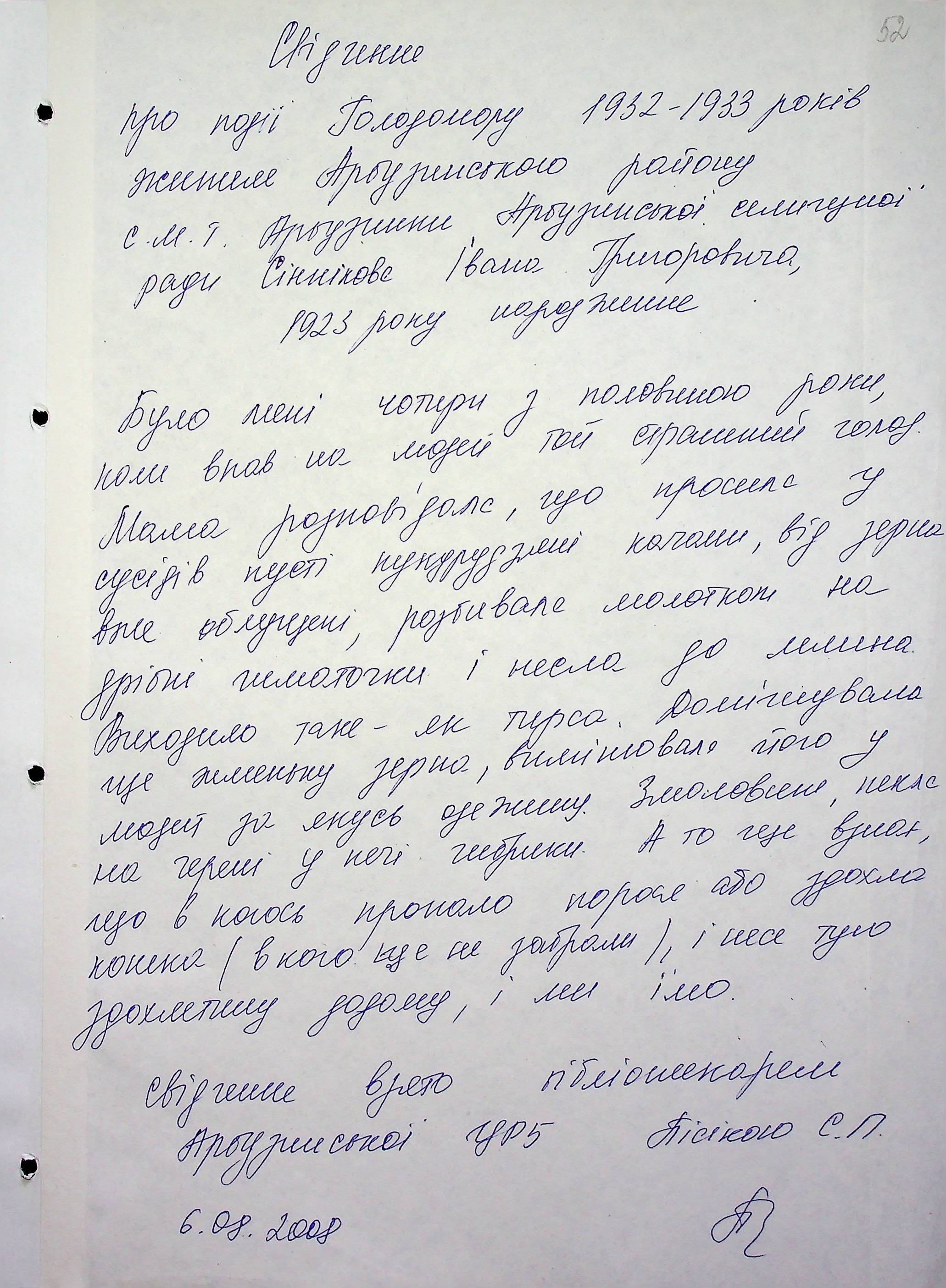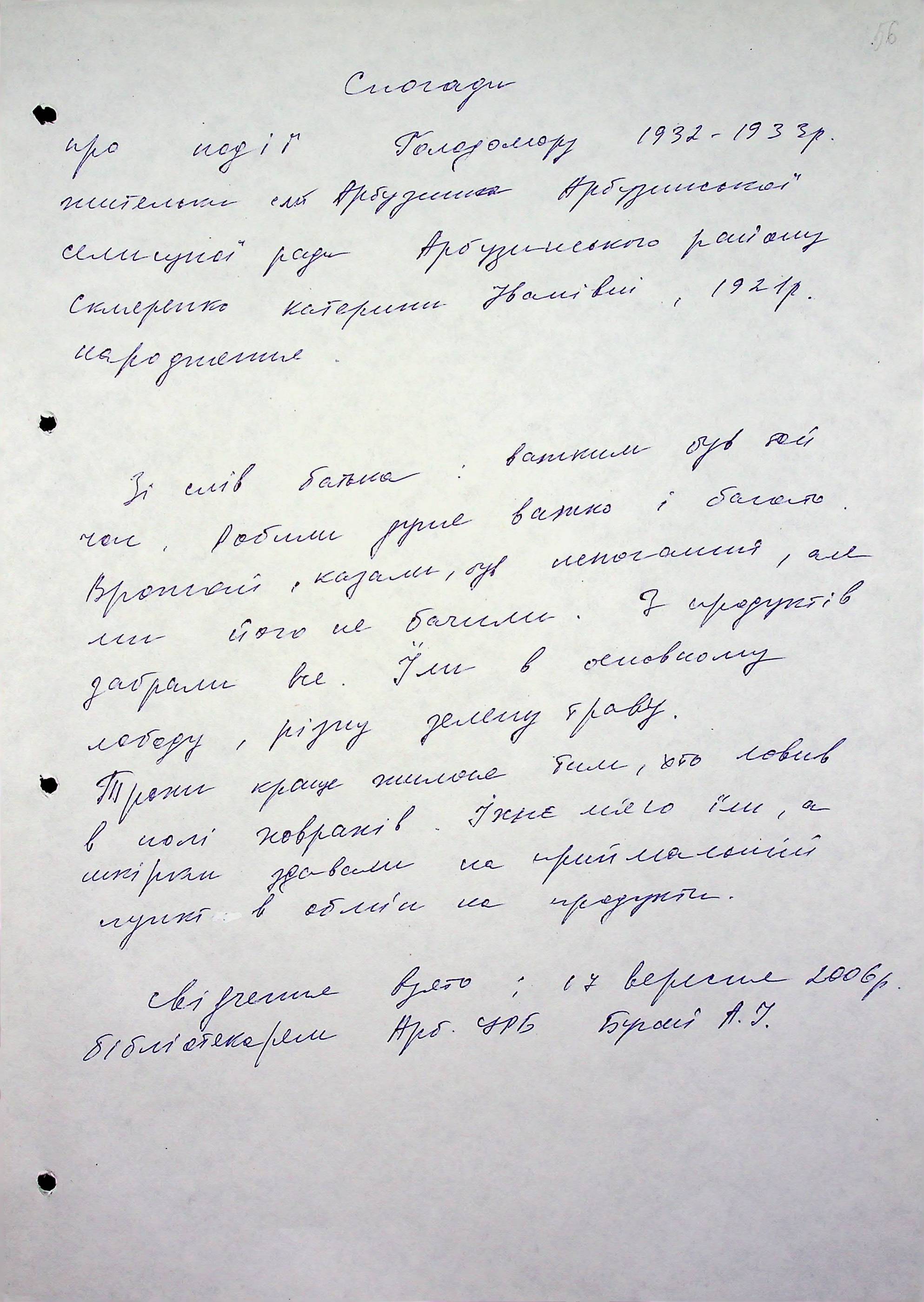 • • • • Справа № 6 “Свідчення очевидців Голодомору 1932-1933 років, які проживають в Арбузинському районі, з прізвищами на літери Р-Я (доповнення). Том 2”