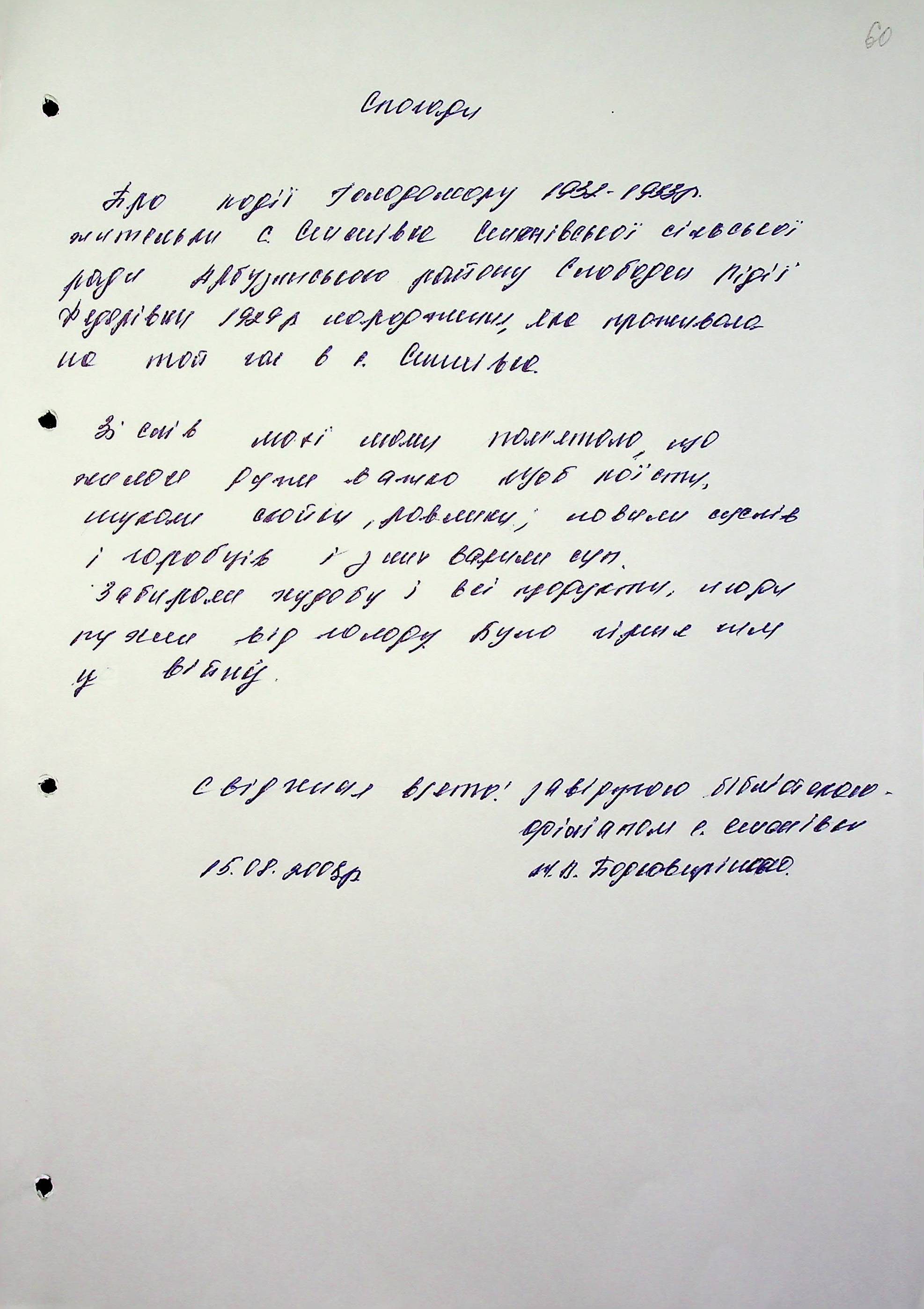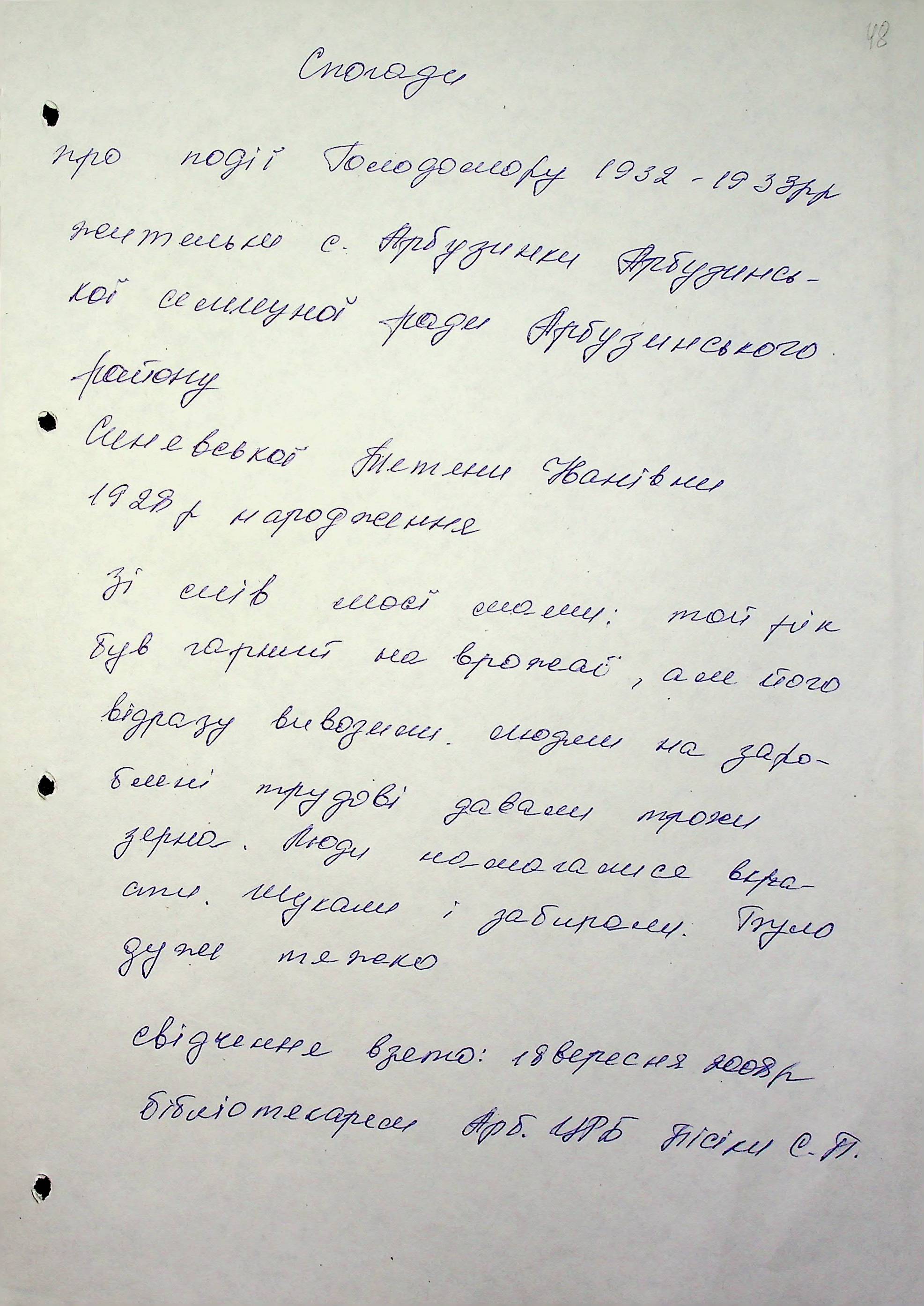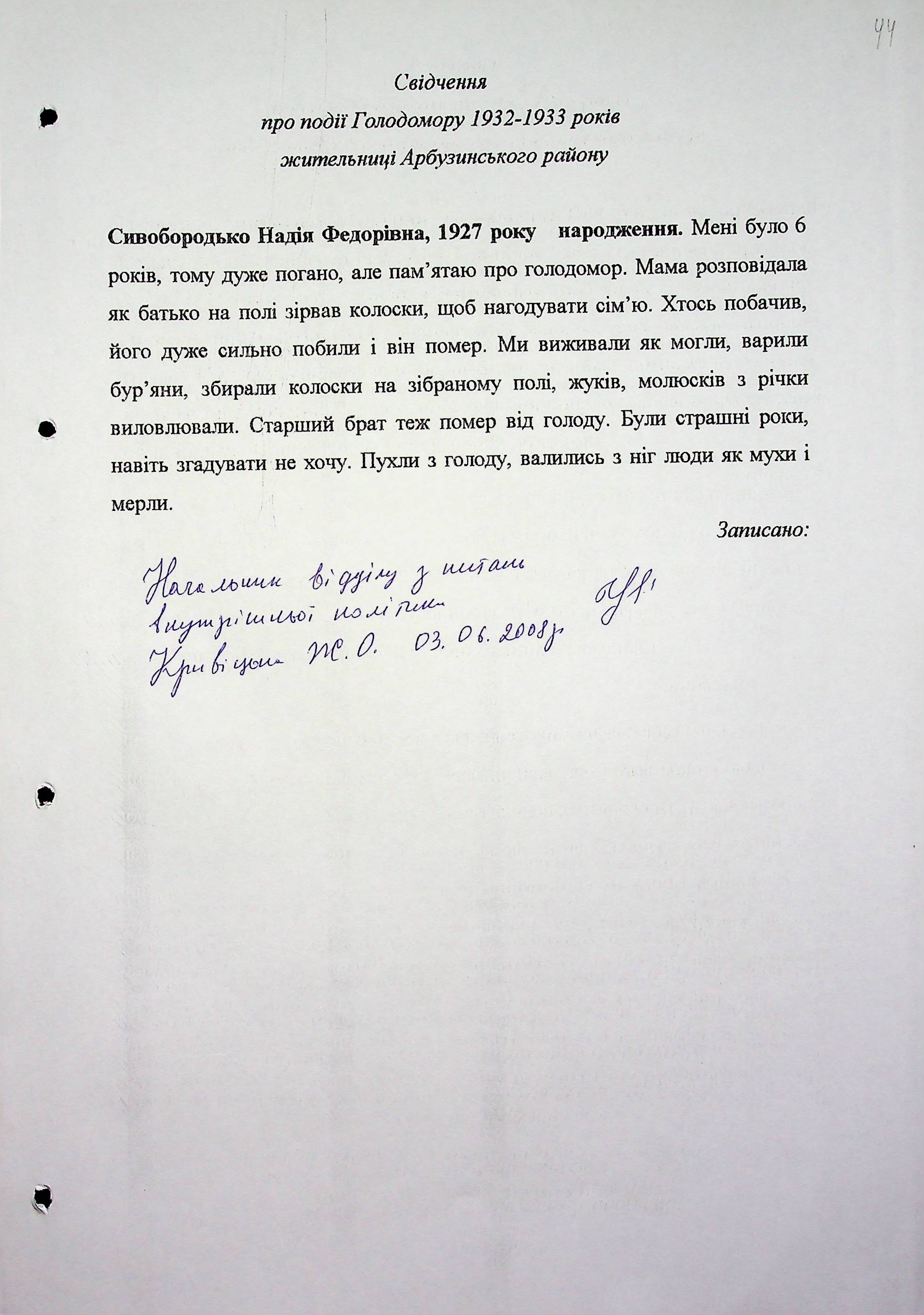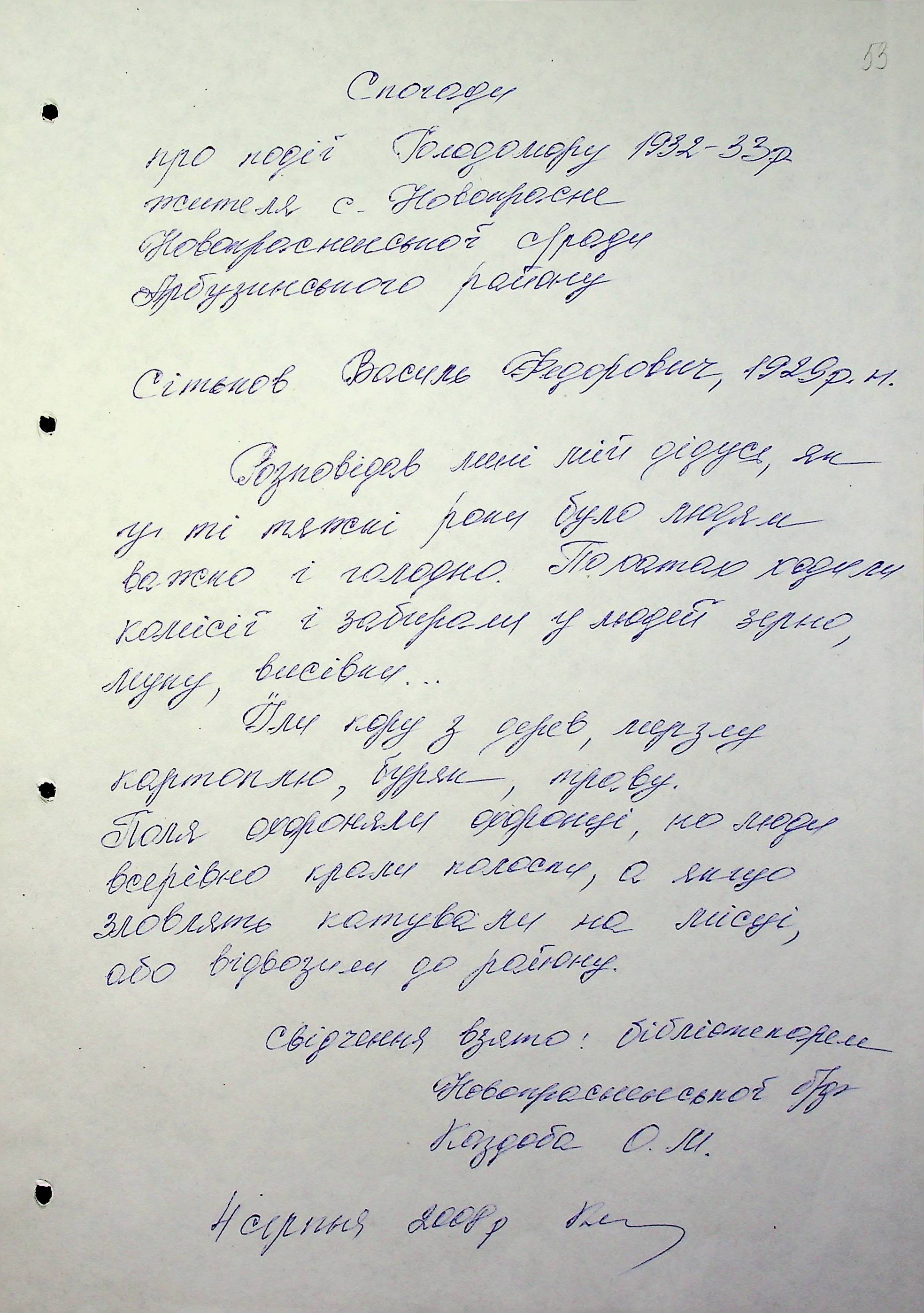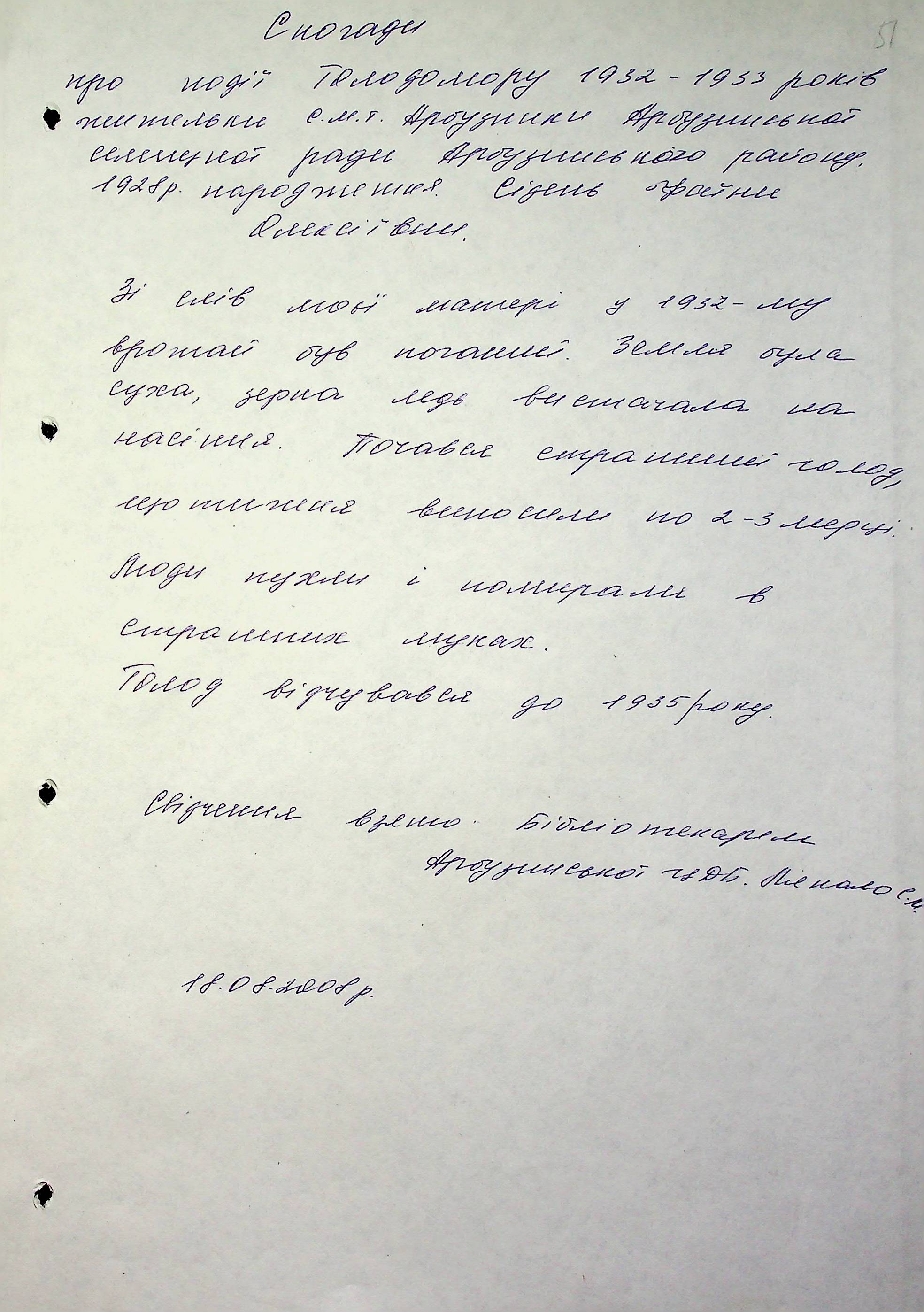 • • • • Справа № 6 “Свідчення очевидців Голодомору 1932-1933 років, які проживають в Арбузинському районі, з прізвищами на літери Р-Я (доповнення). Том 2”