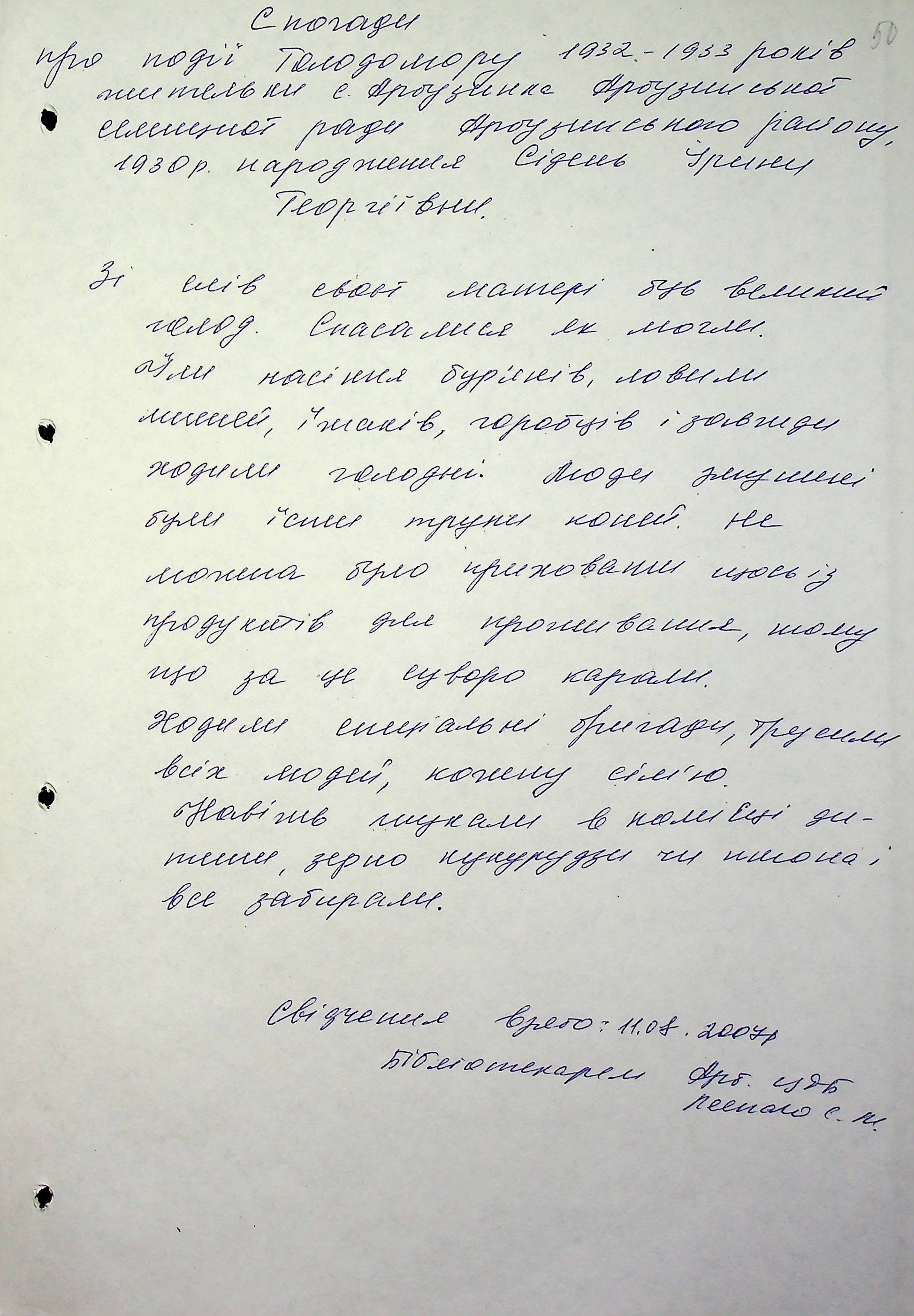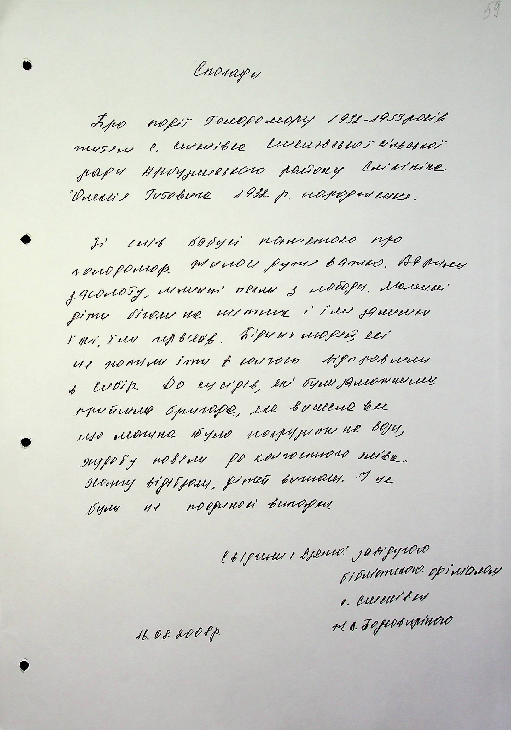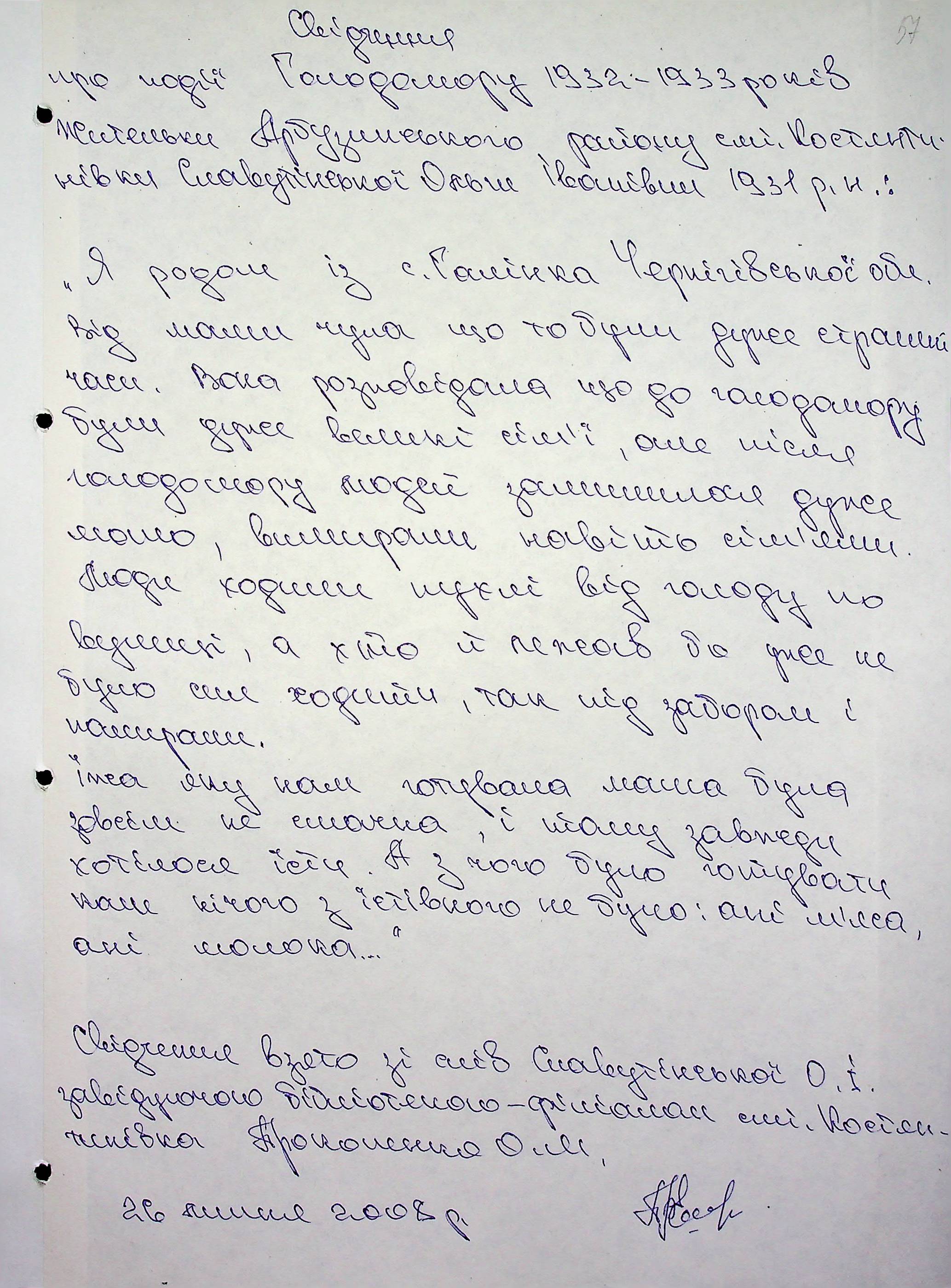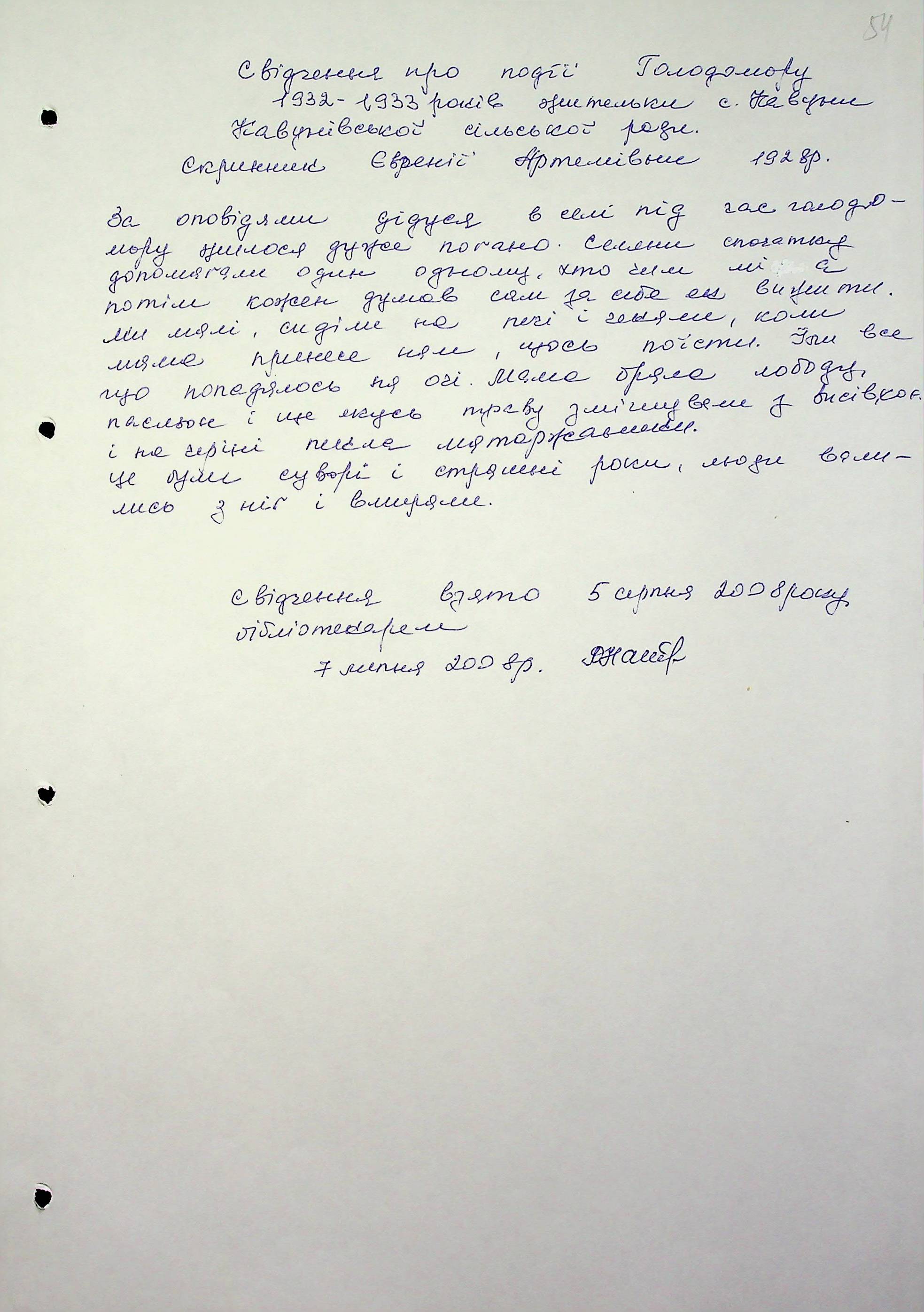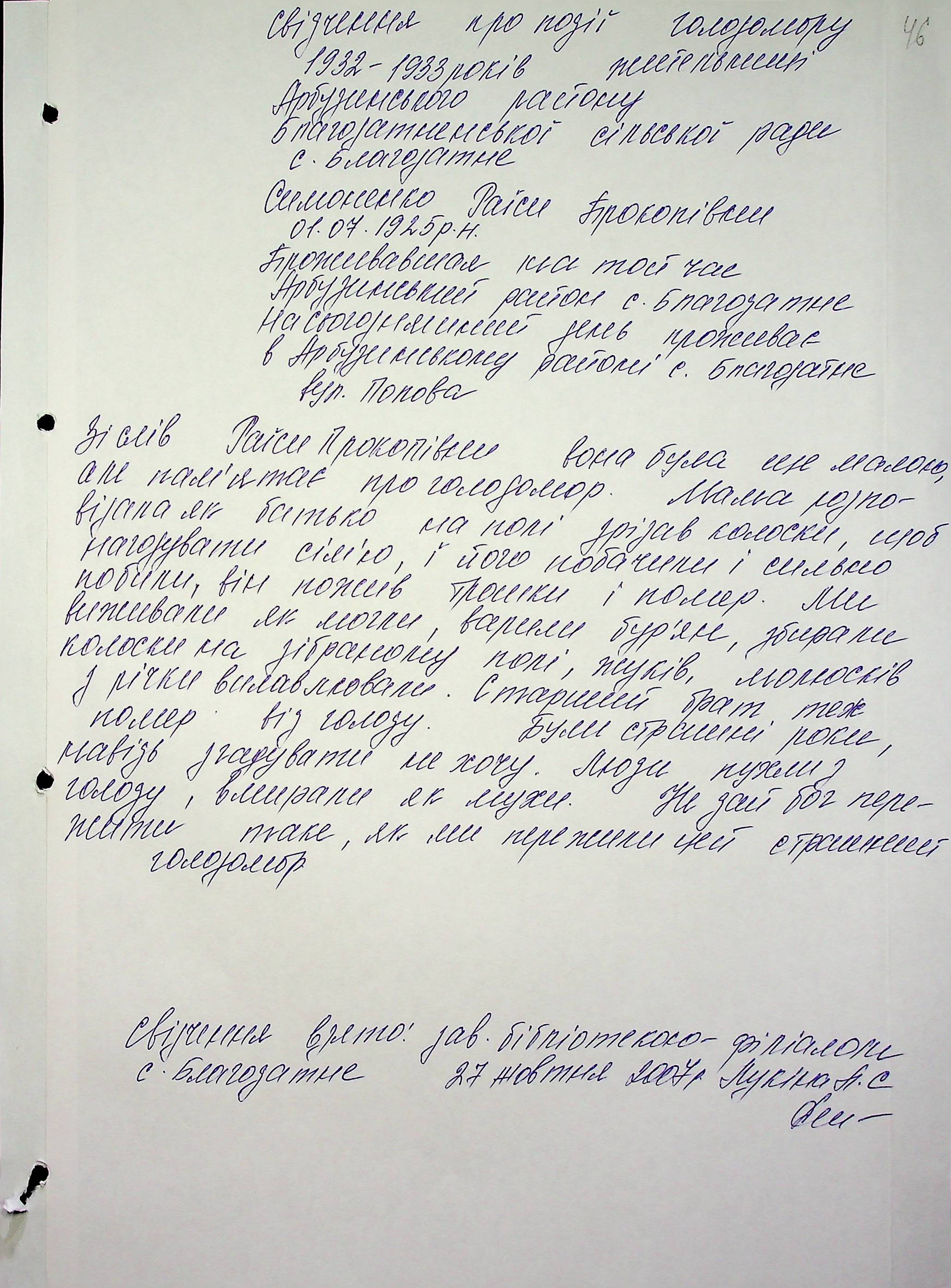 • • • • Справа № 6 “Свідчення очевидців Голодомору 1932-1933 років, які проживають в Арбузинському районі, з прізвищами на літери Р-Я (доповнення). Том 2”