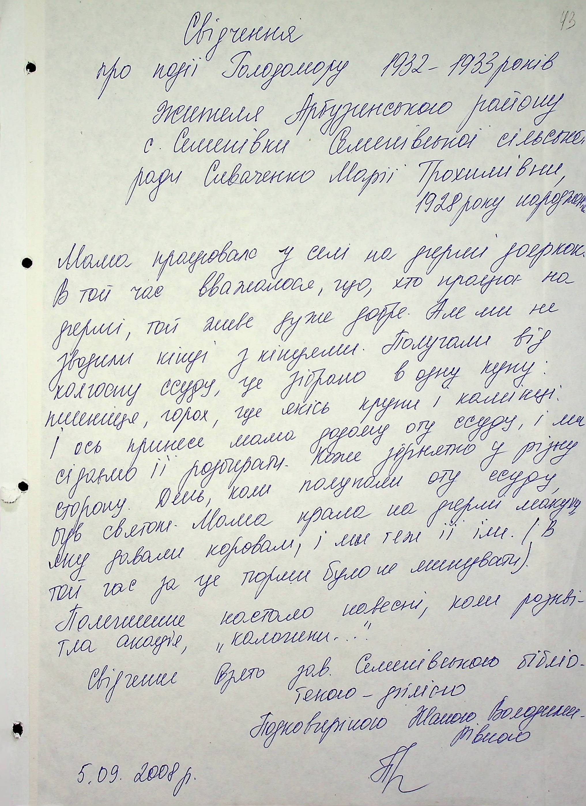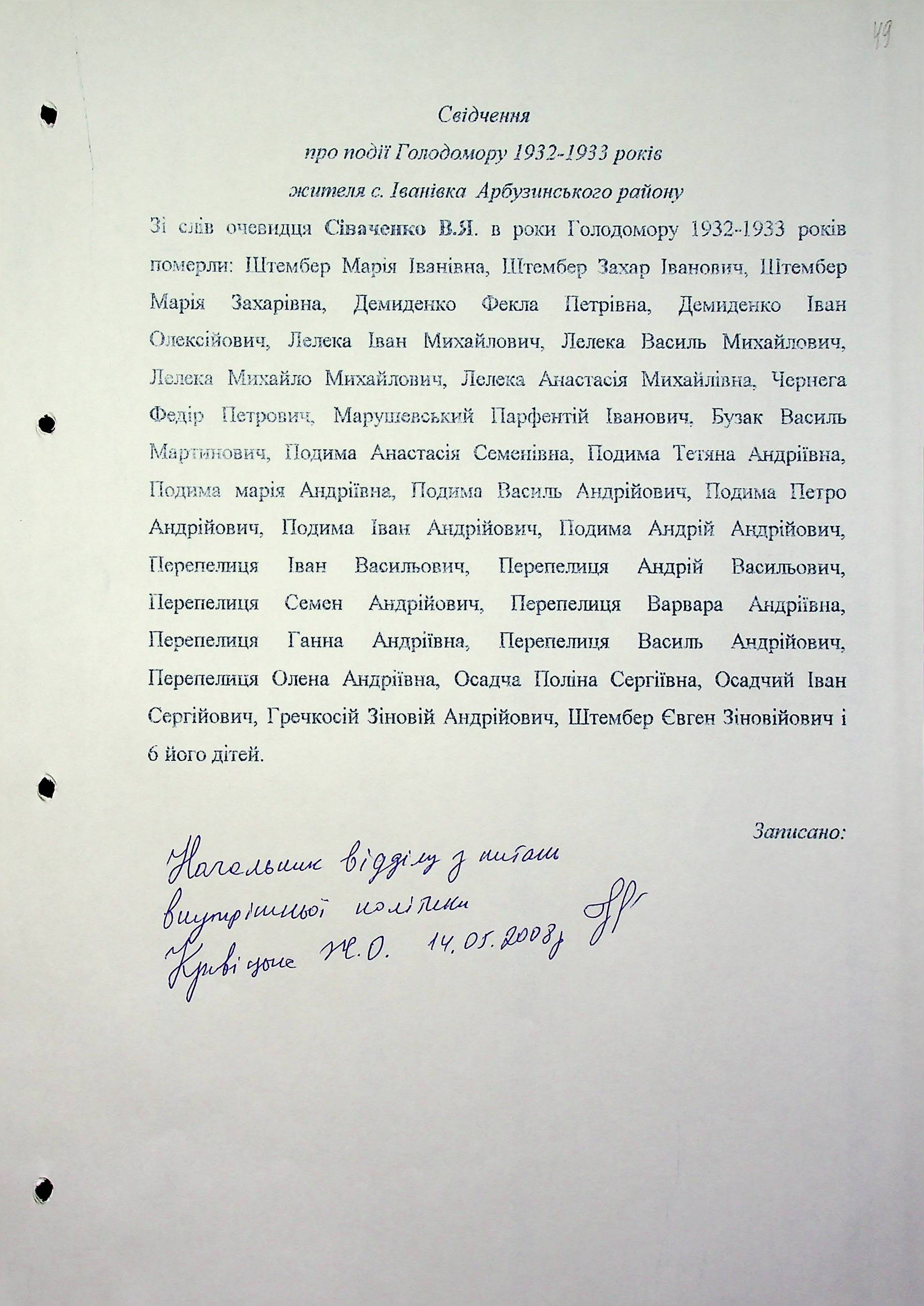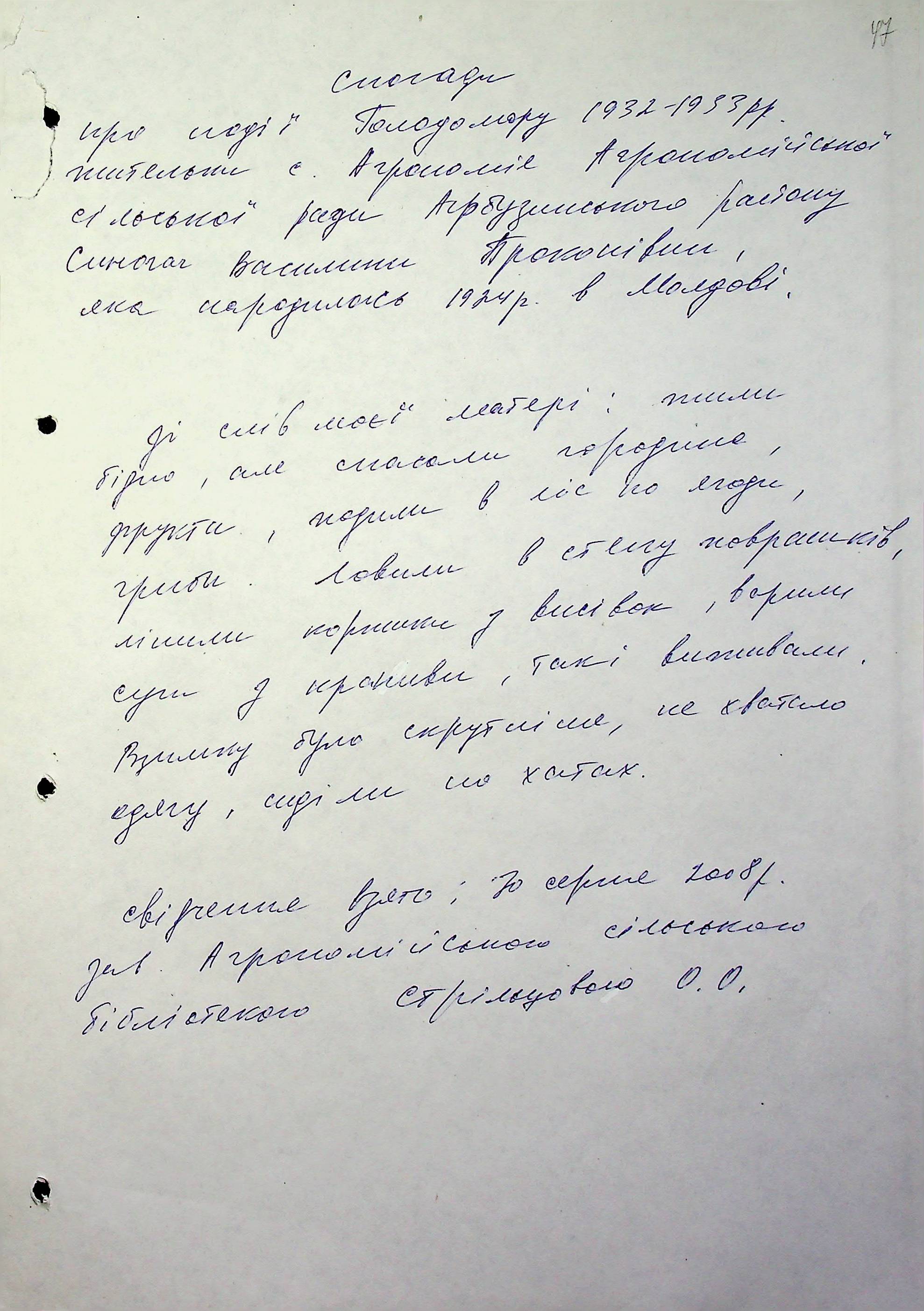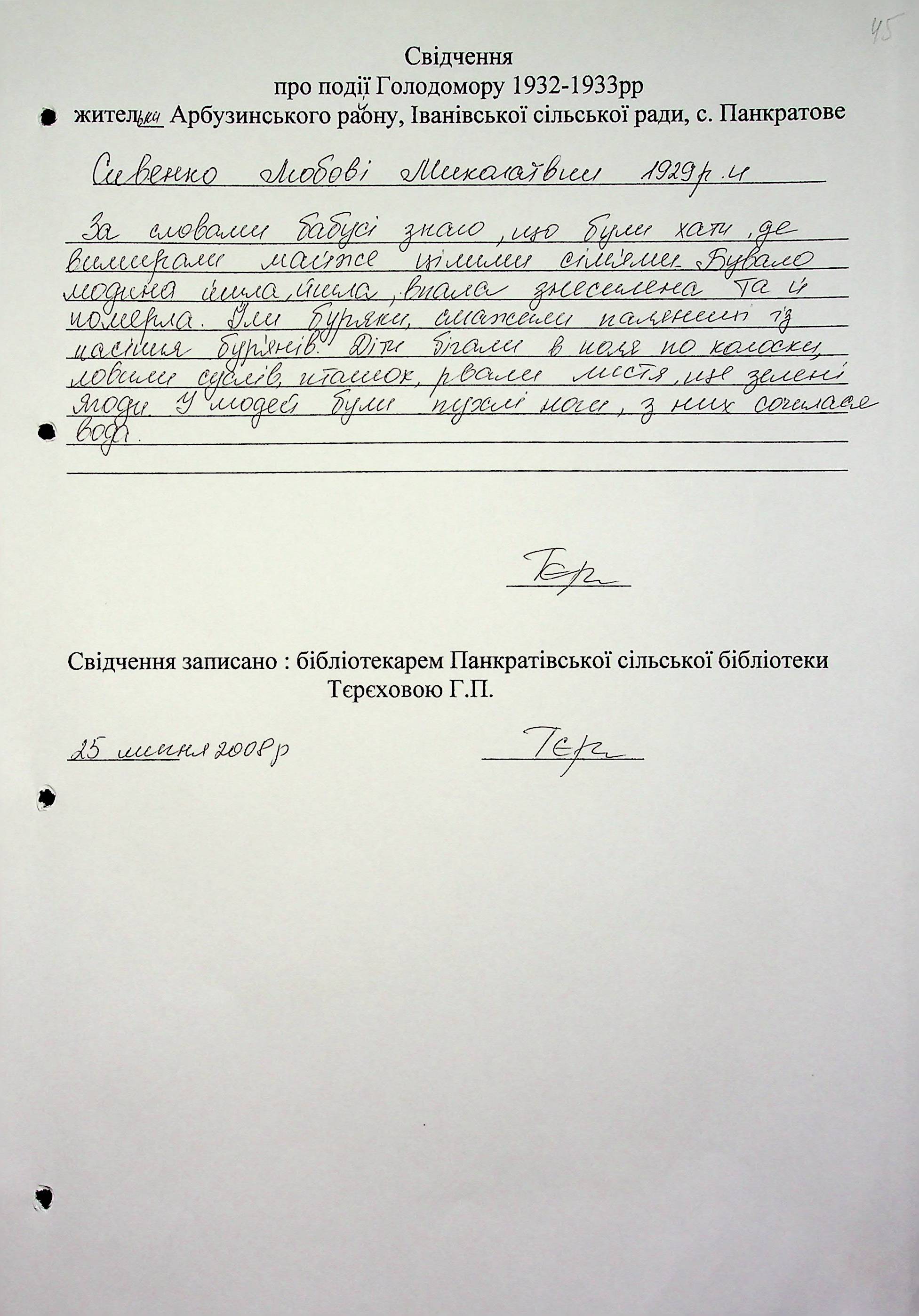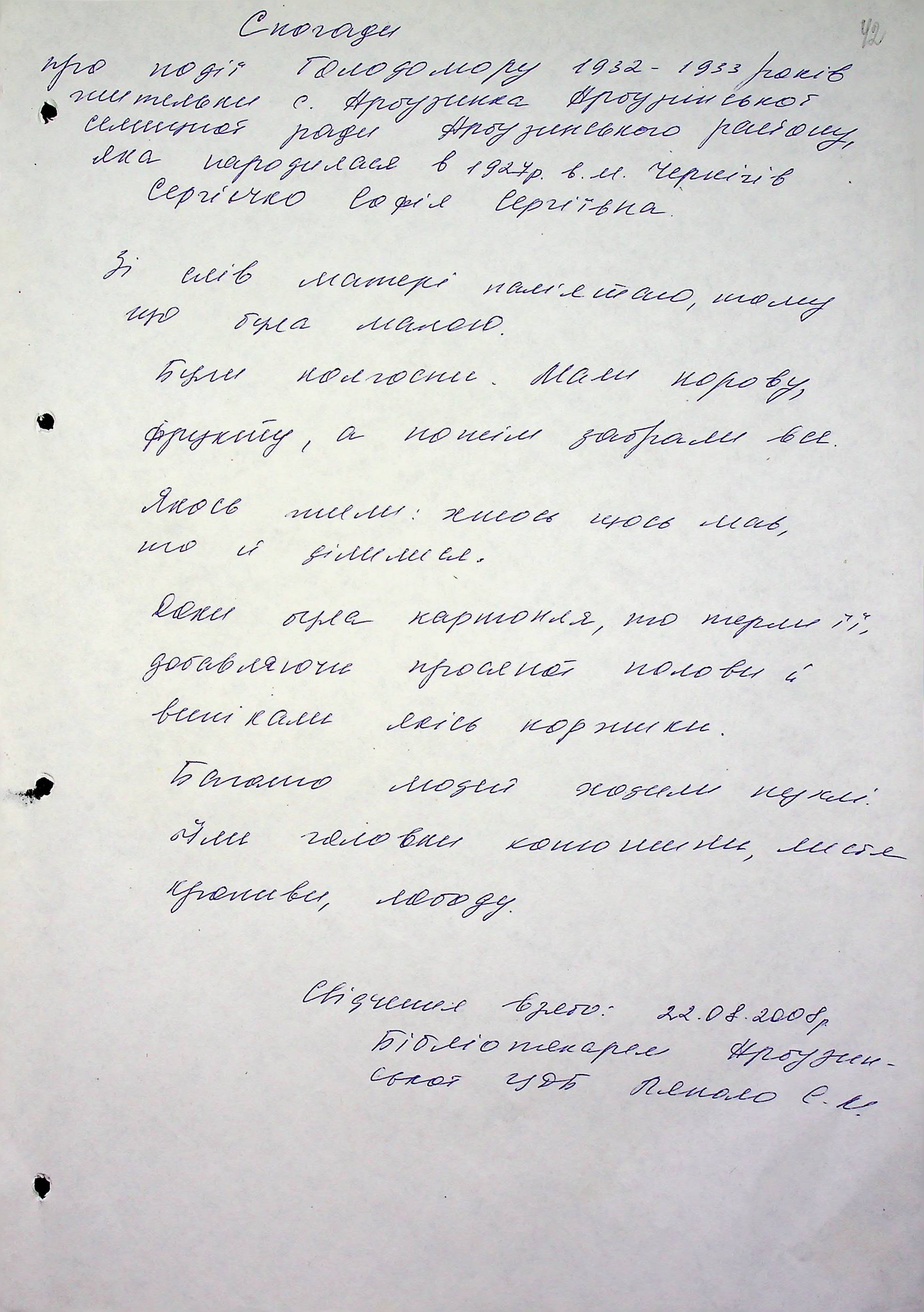 • • • • Справа № 6 “Свідчення очевидців Голодомору 1932-1933 років, які проживають в Арбузинському районі, з прізвищами на літери Р-Я (доповнення). Том 2”