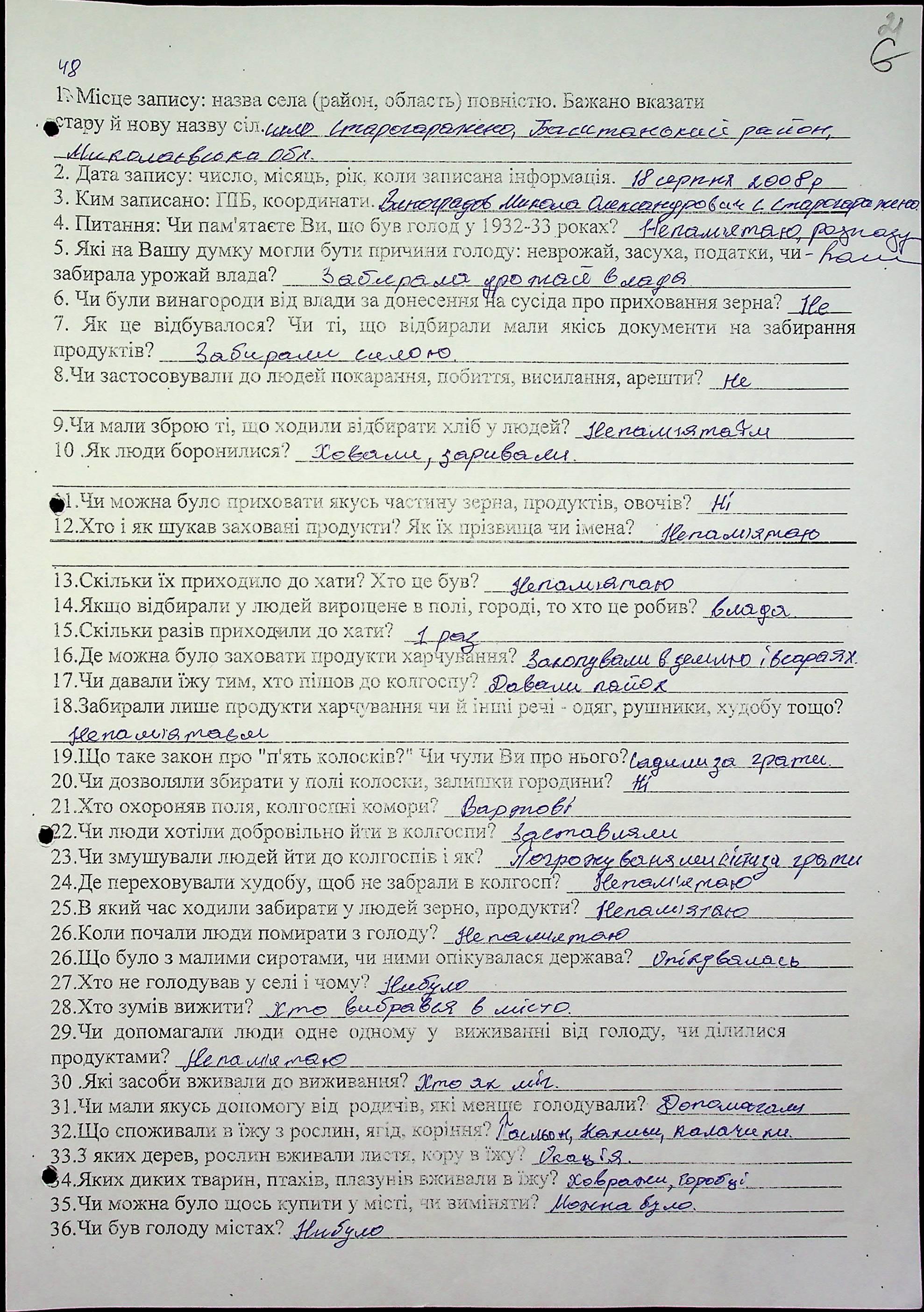 ◦ ◦ Фонд № 6146 “Колекція свідчень очевидців Голодомору 1932-1933 рр., нині проживаючих у Миколаївській області”
