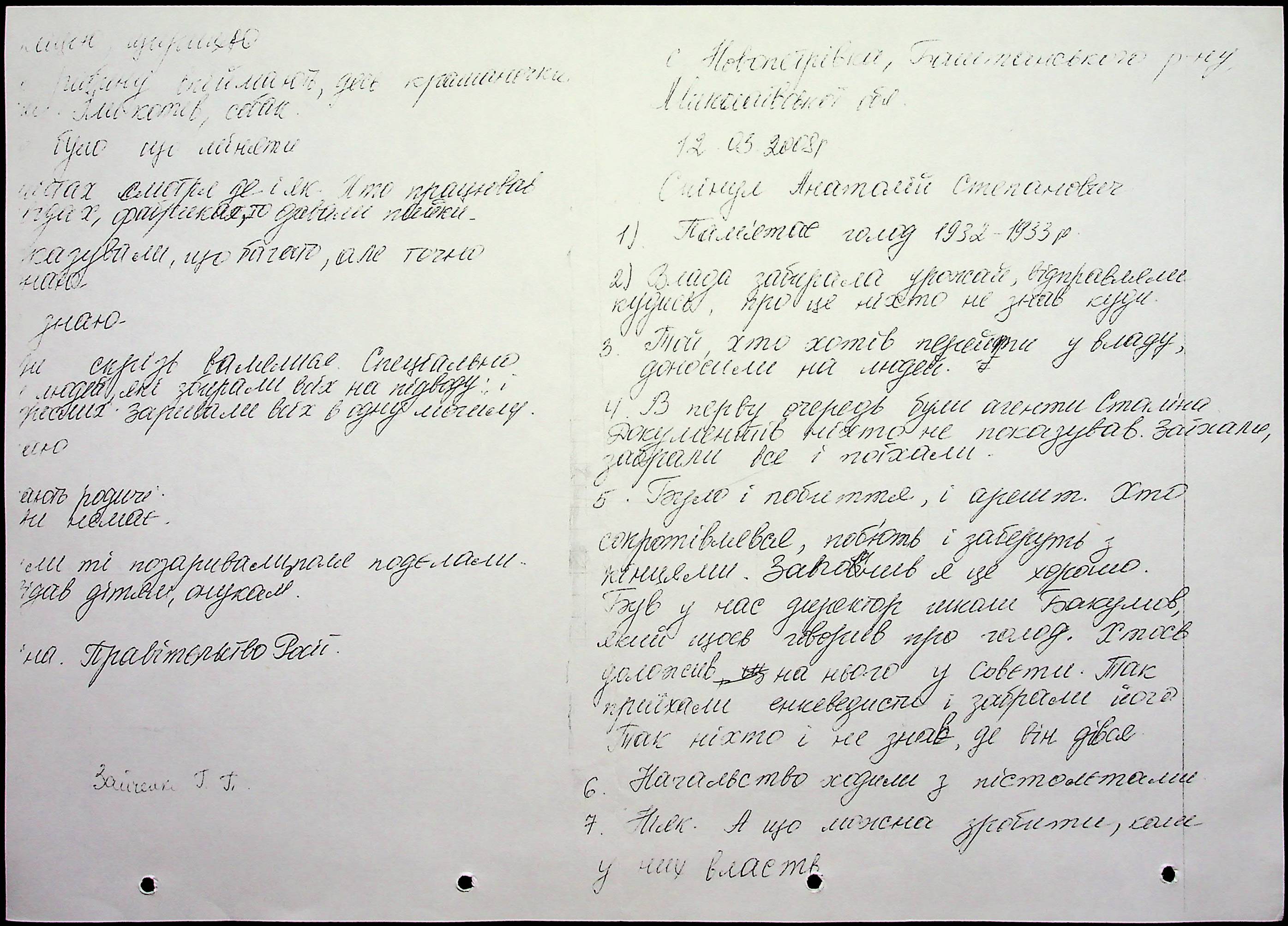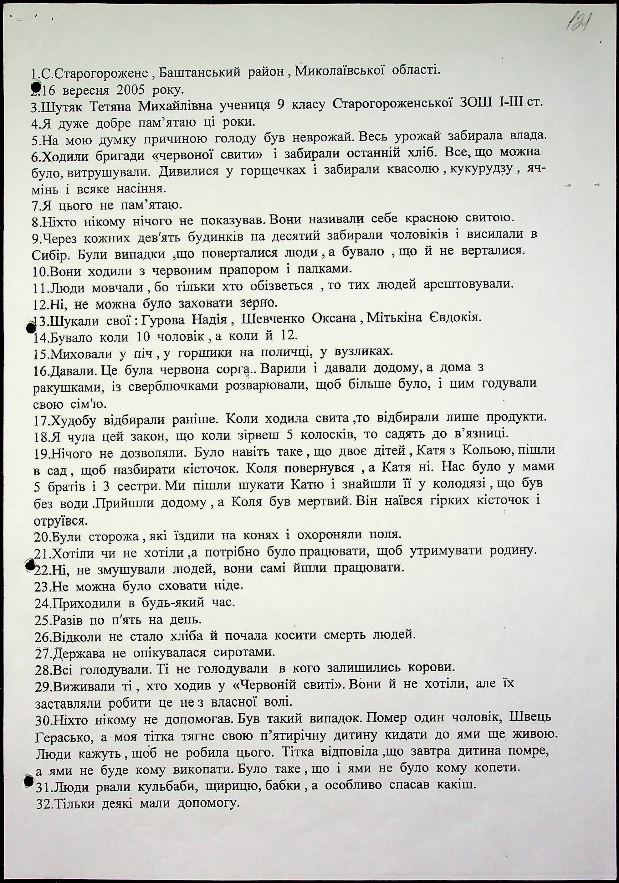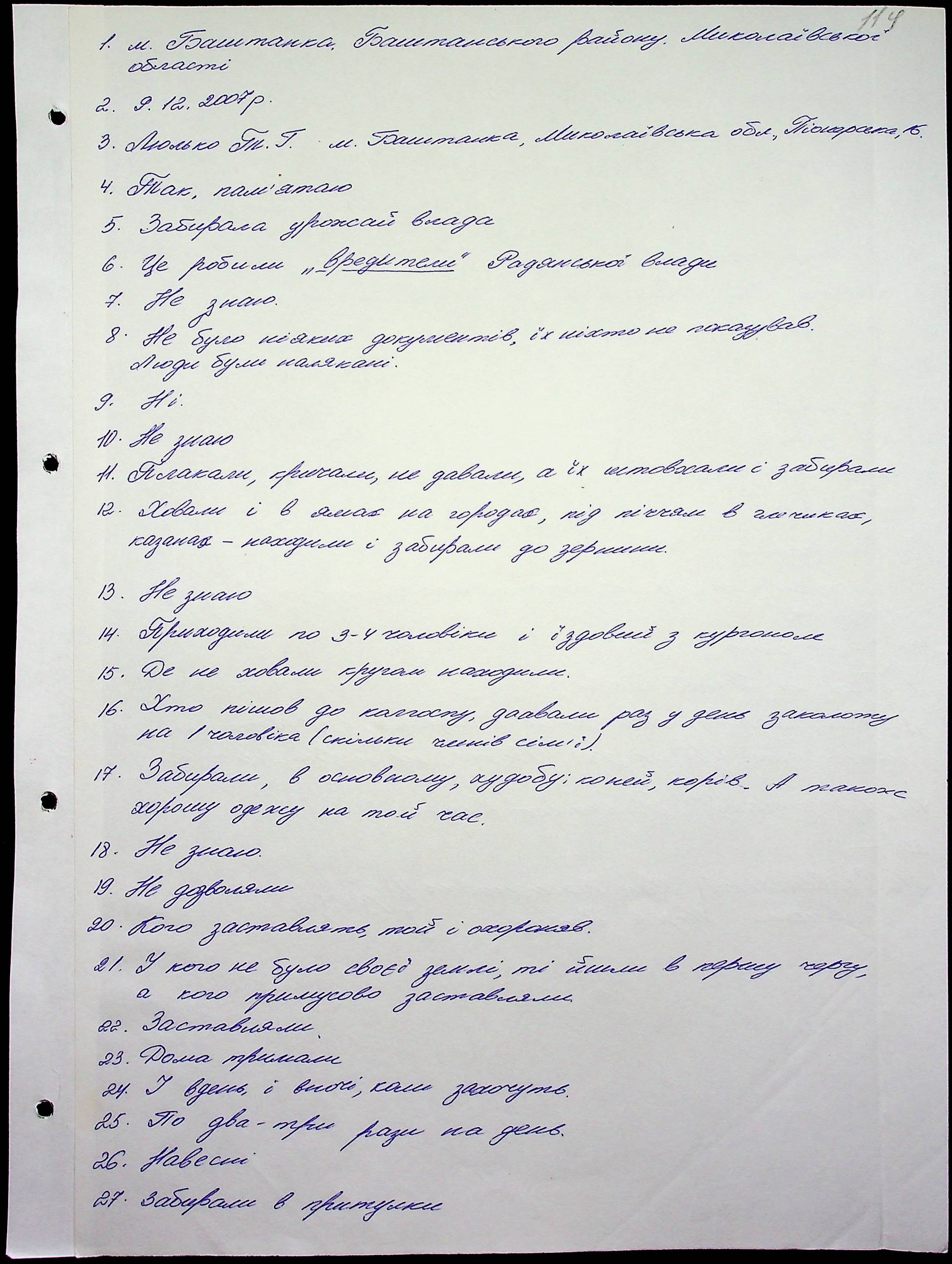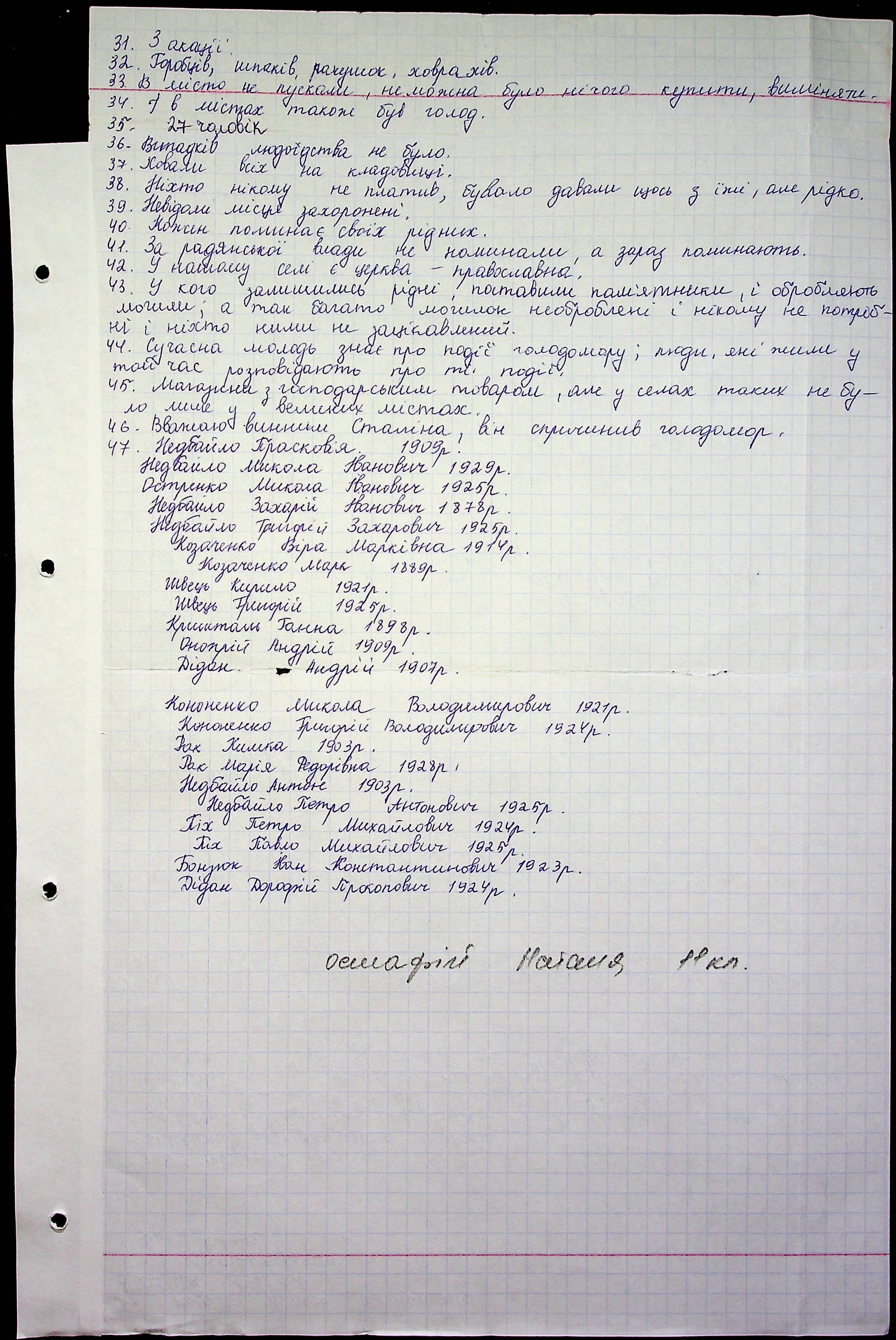 • • • • Справа № 10 “Свідчення очевидців Голодомору 1932-1933 років, які проживають у Баштанському районі, з прізвищами на літери П–Я”