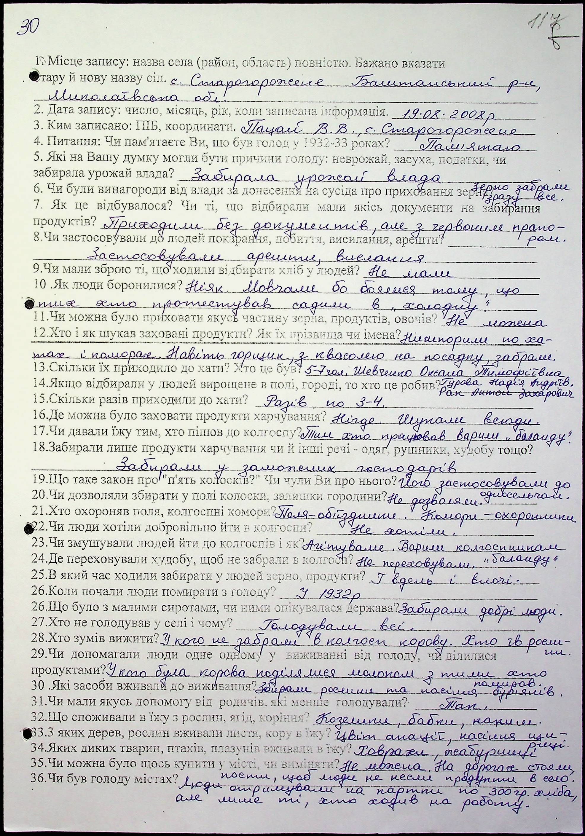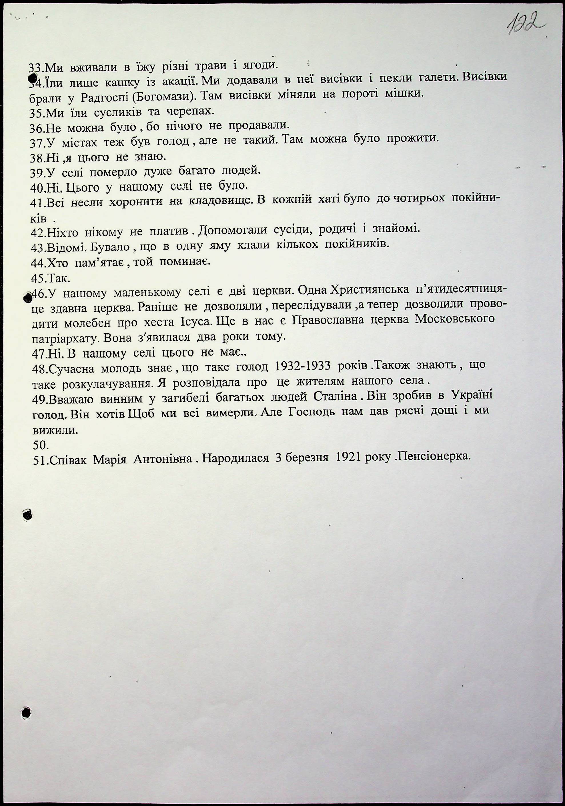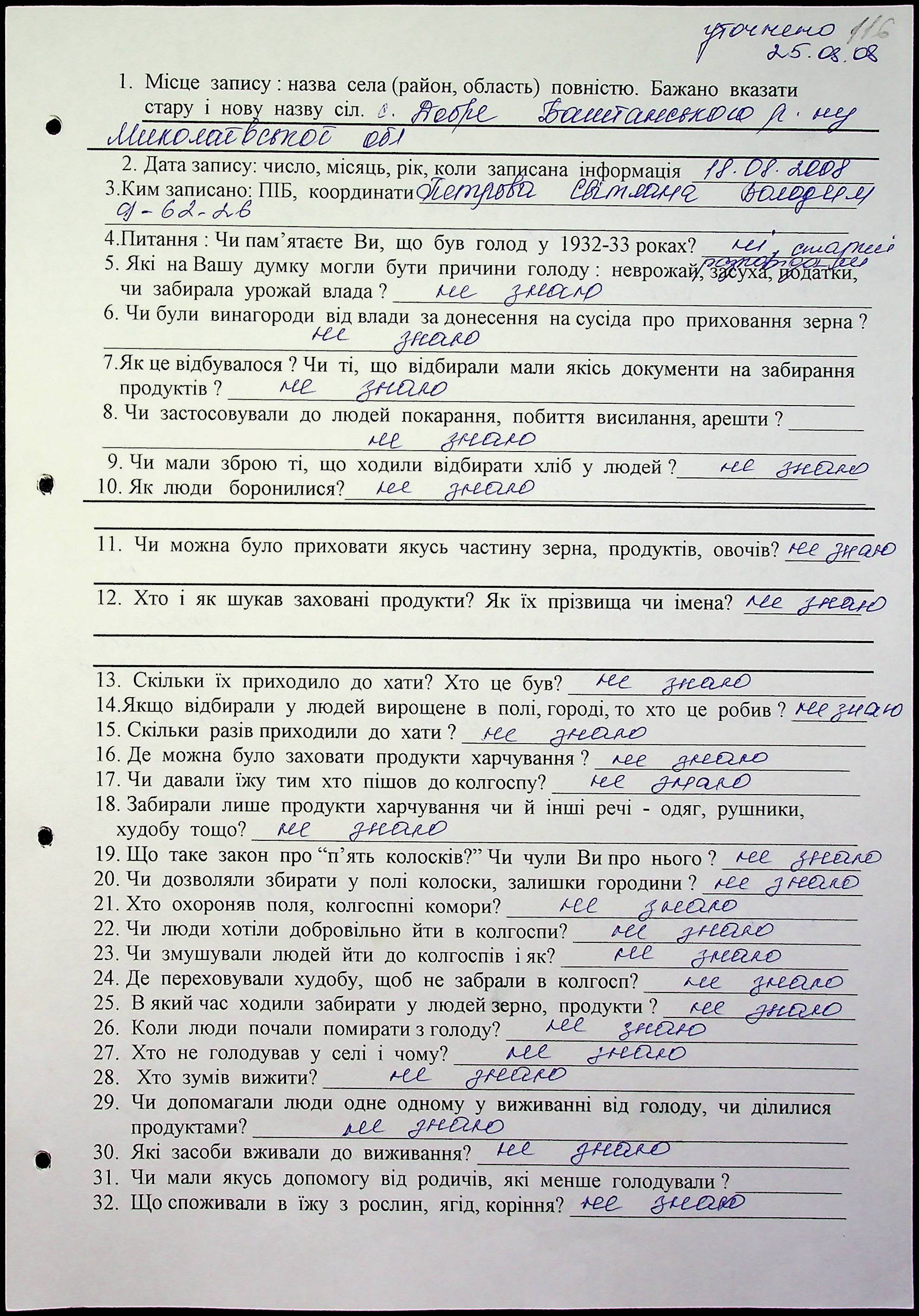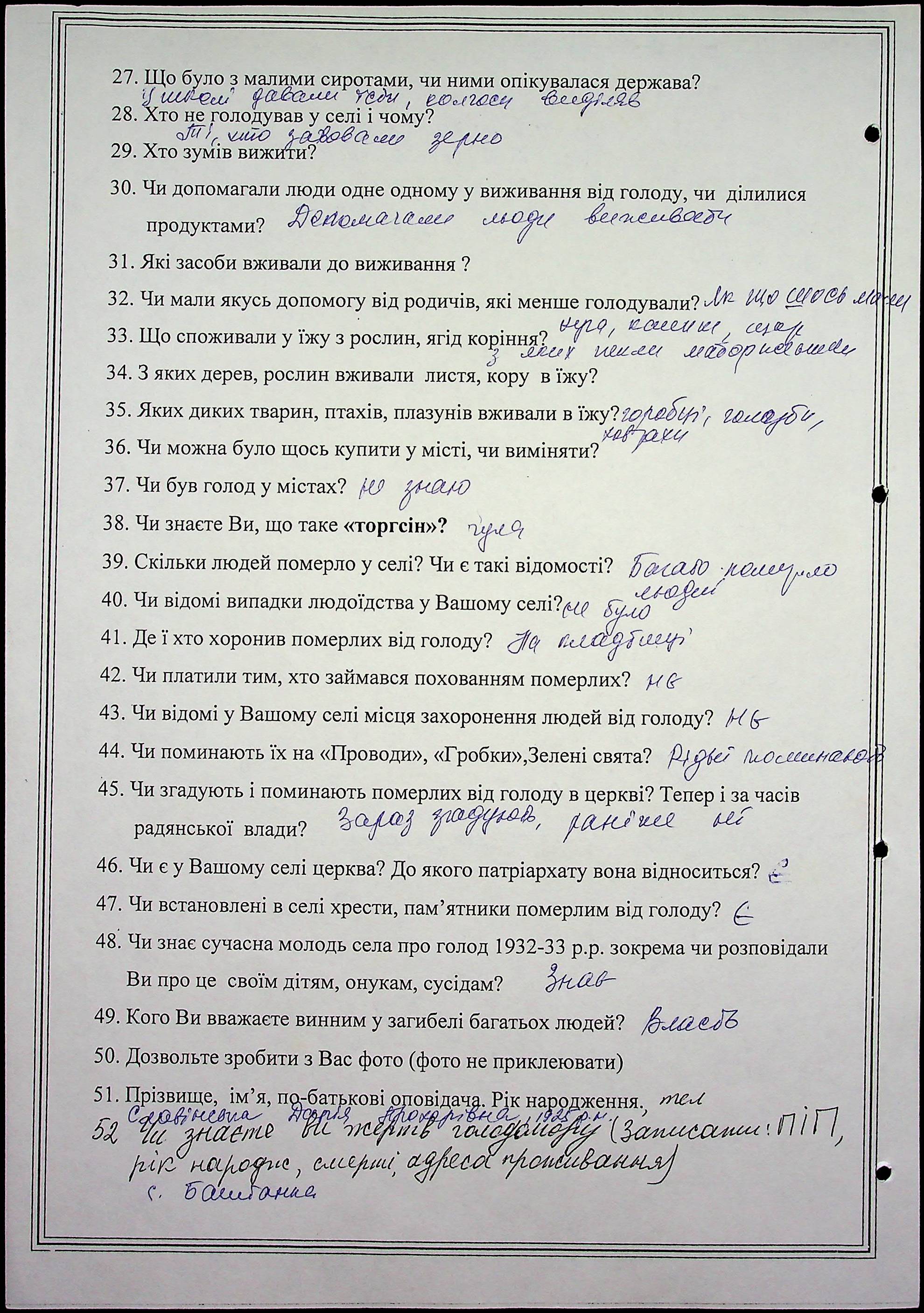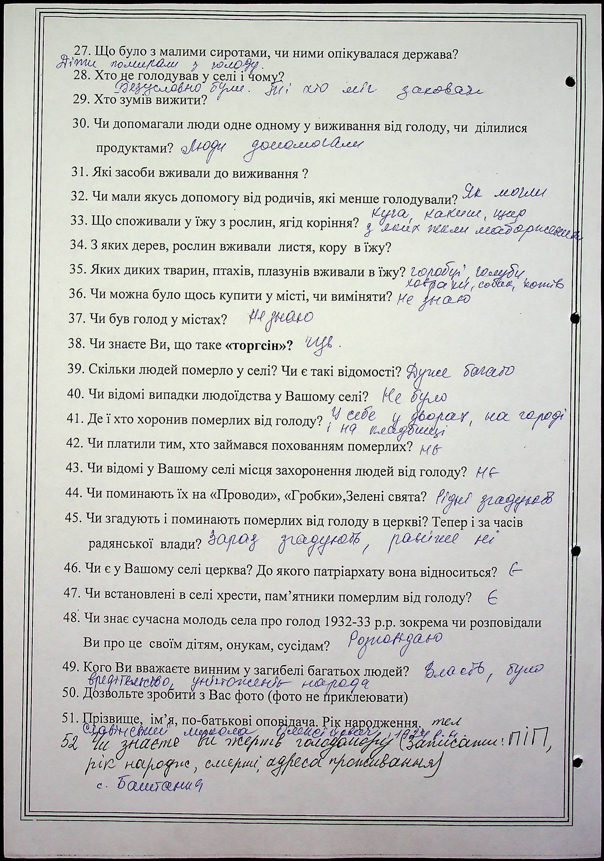 • • • • Справа № 10 “Свідчення очевидців Голодомору 1932-1933 років, які проживають у Баштанському районі, з прізвищами на літери П–Я”