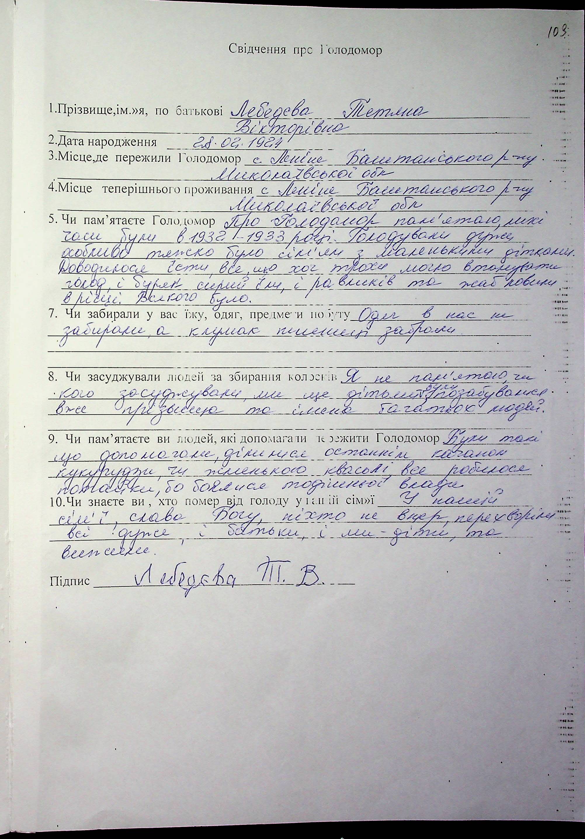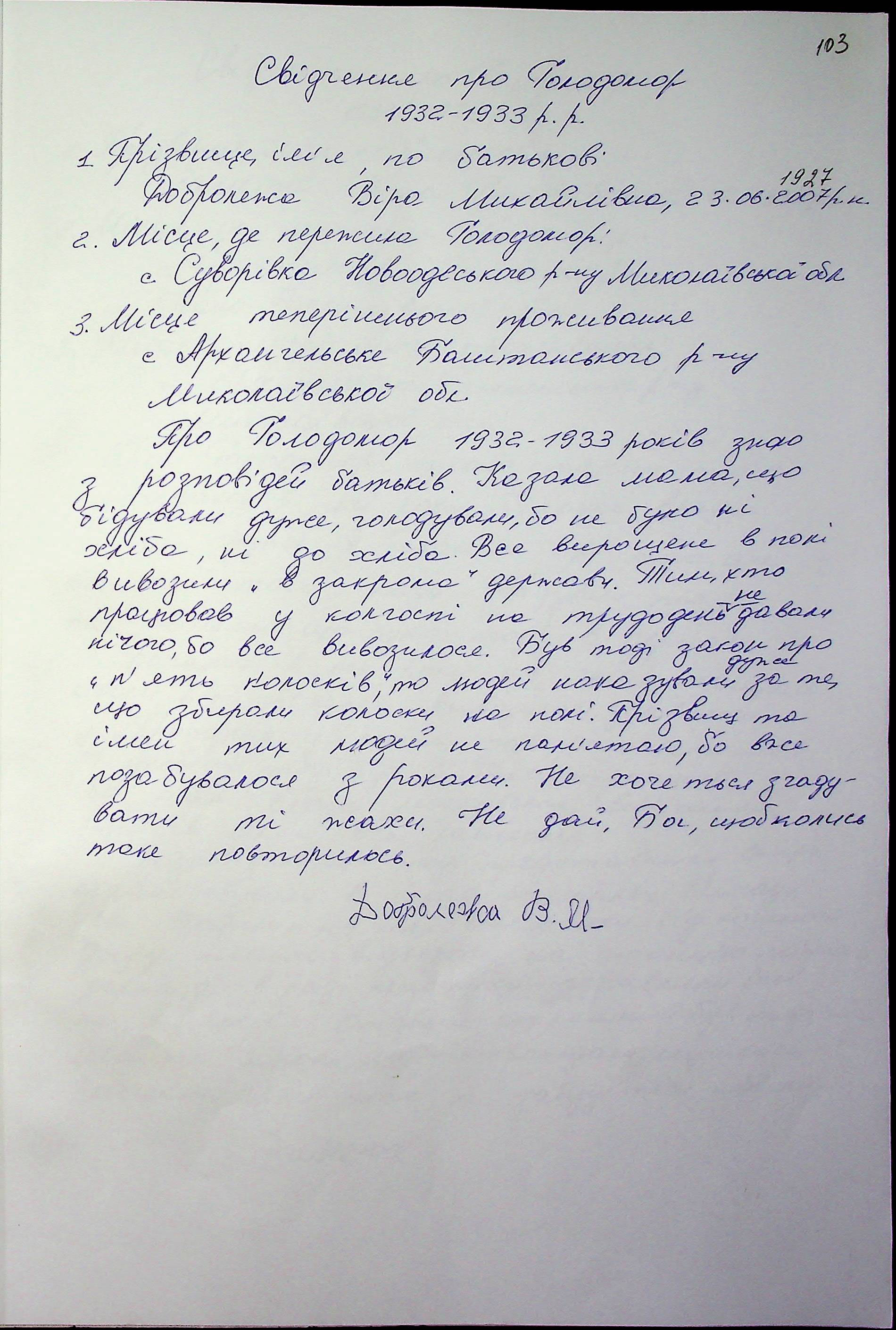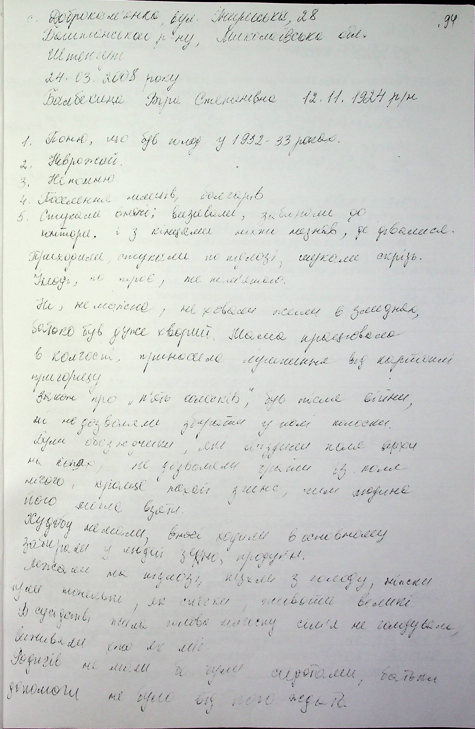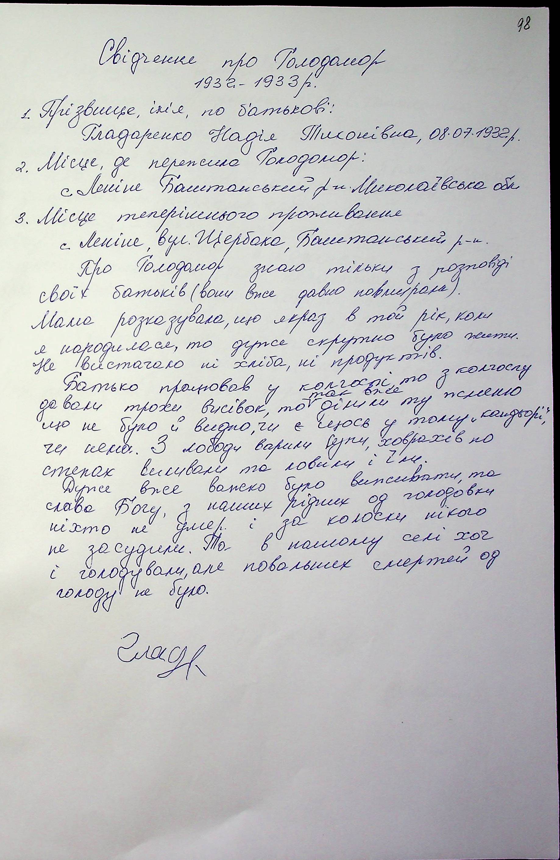• • • • Справа № 11 “Свідчення очевидців Голодомору 1932-1933 років, які проживають у Баштанському районі, з прізвищами на літери А–Я (доповнення)”