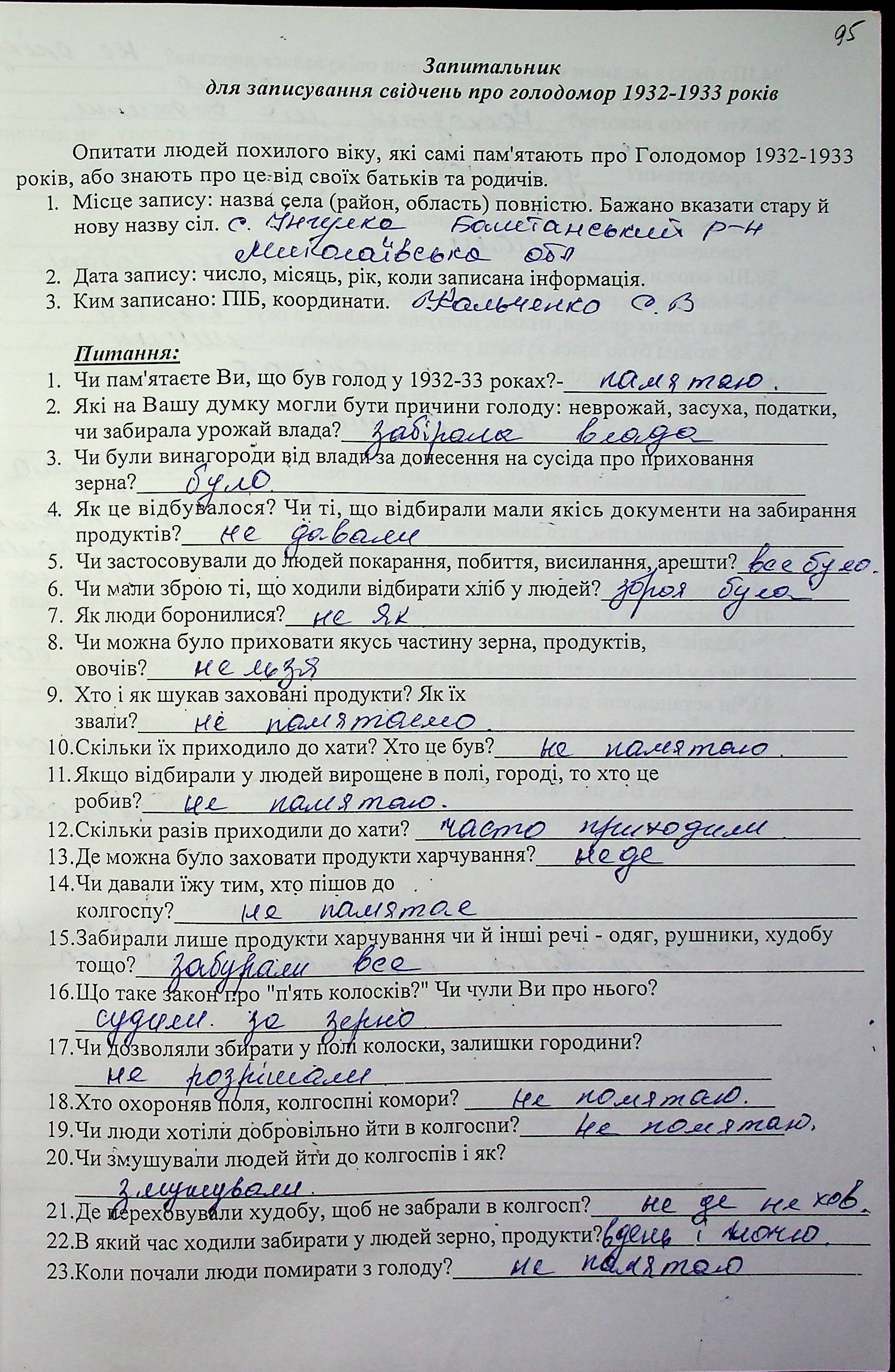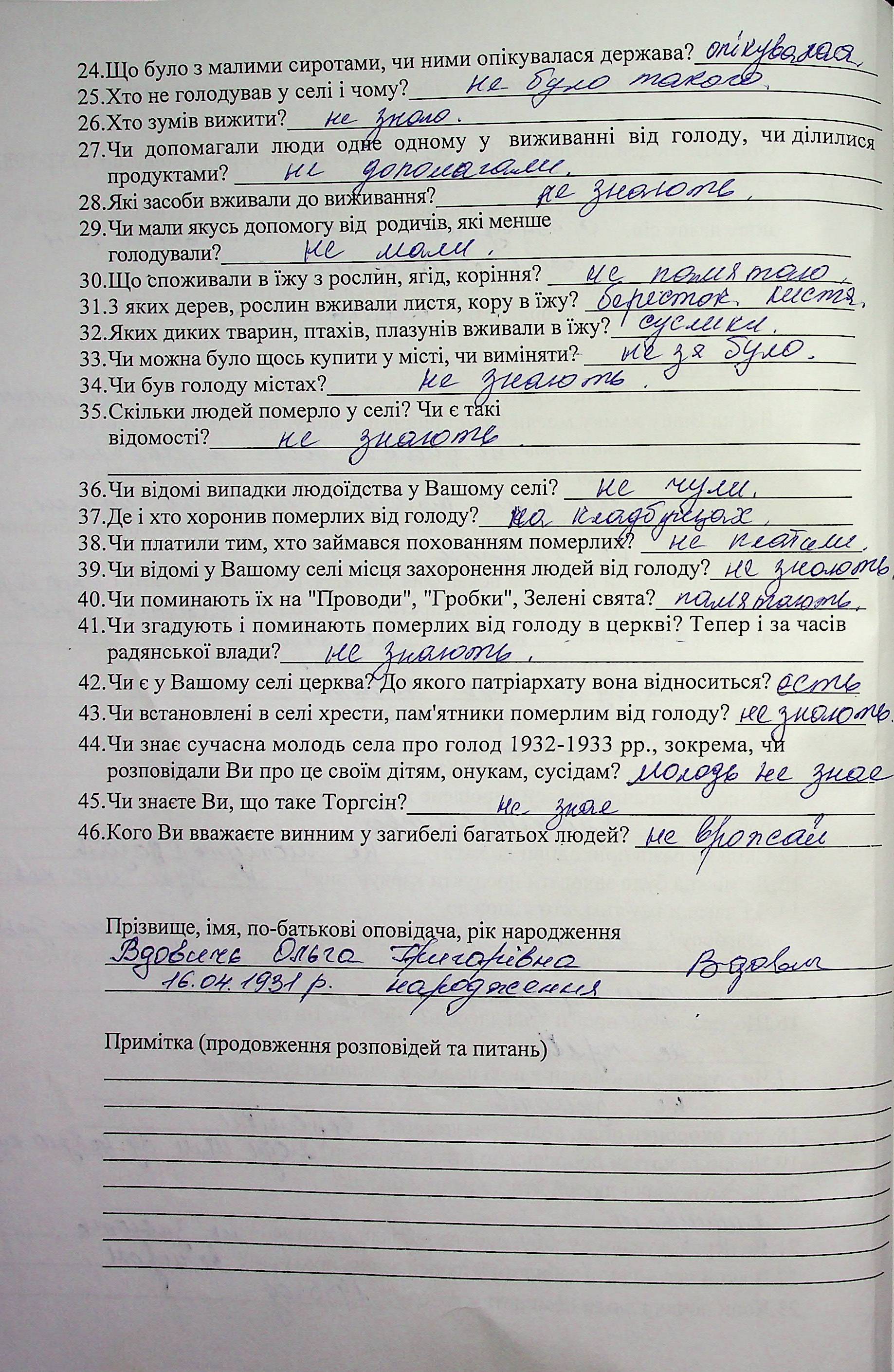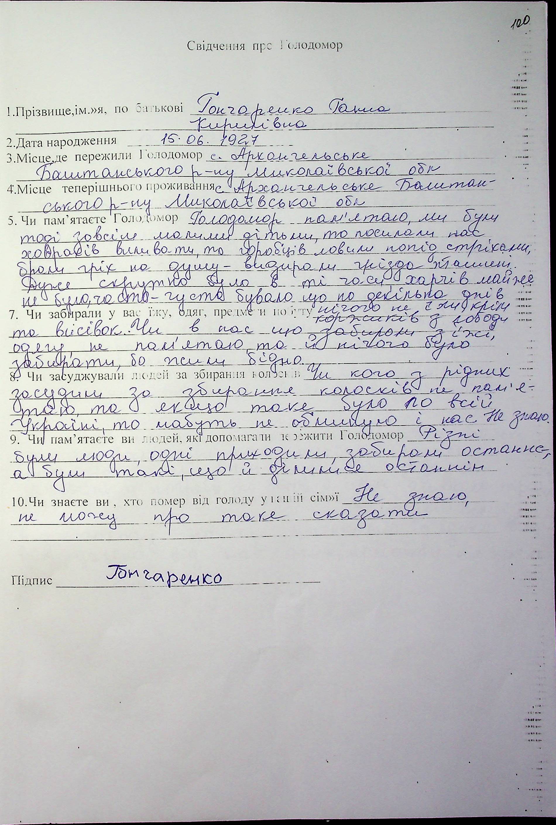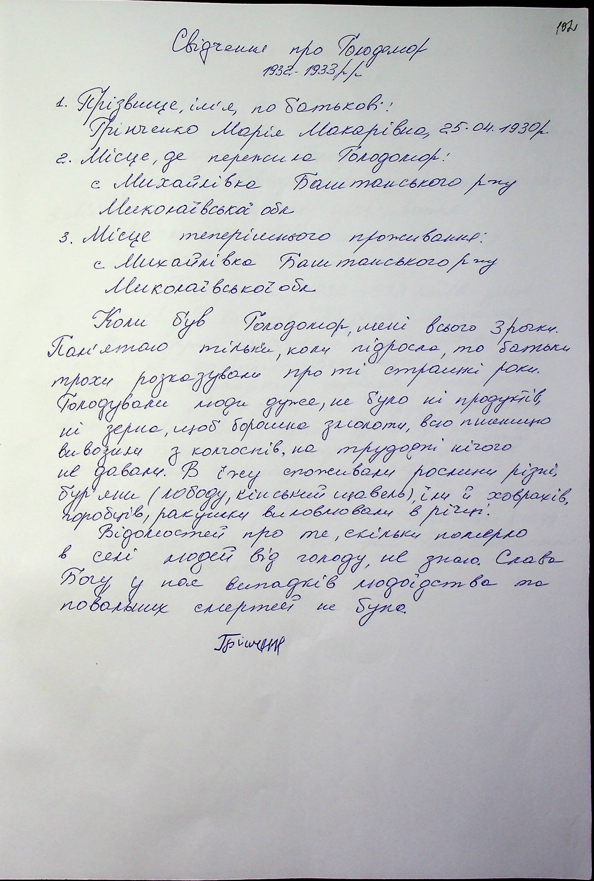 • • • • Справа № 11 “Свідчення очевидців Голодомору 1932-1933 років, які проживають у Баштанському районі, з прізвищами на літери А–Я (доповнення)”