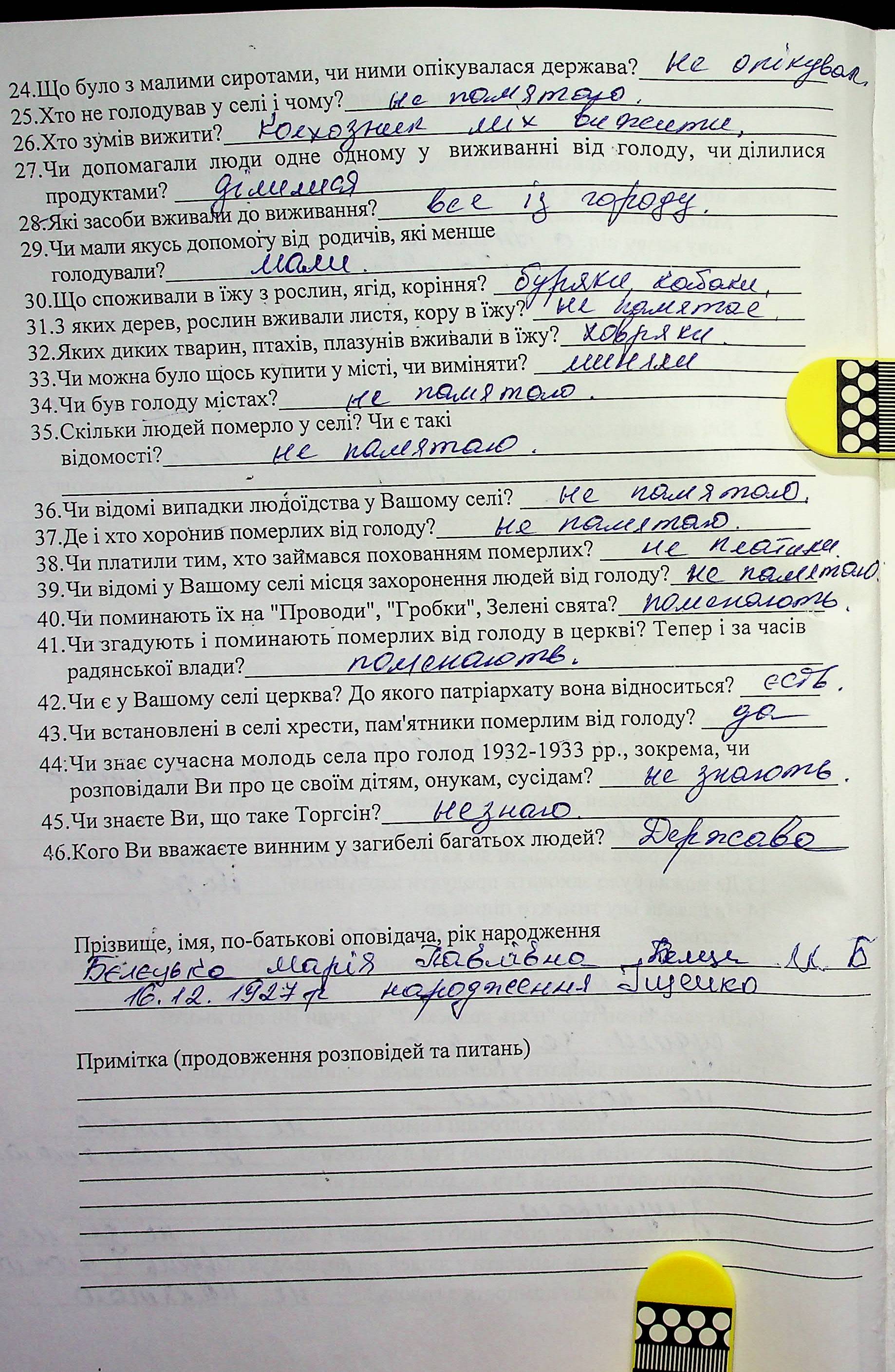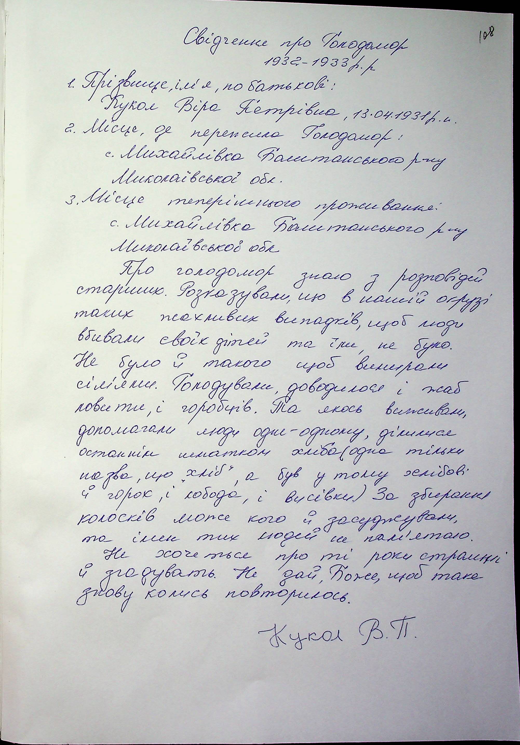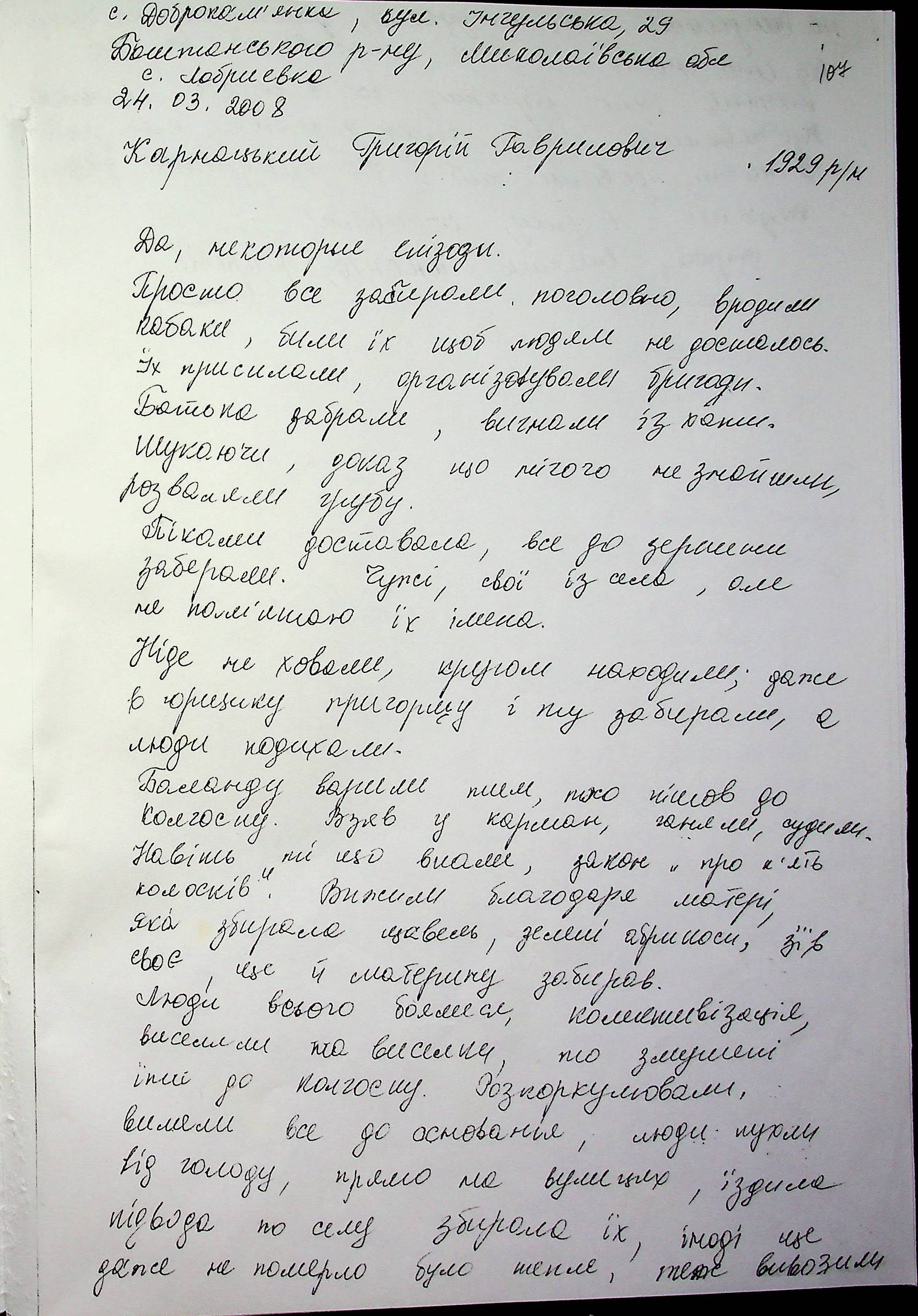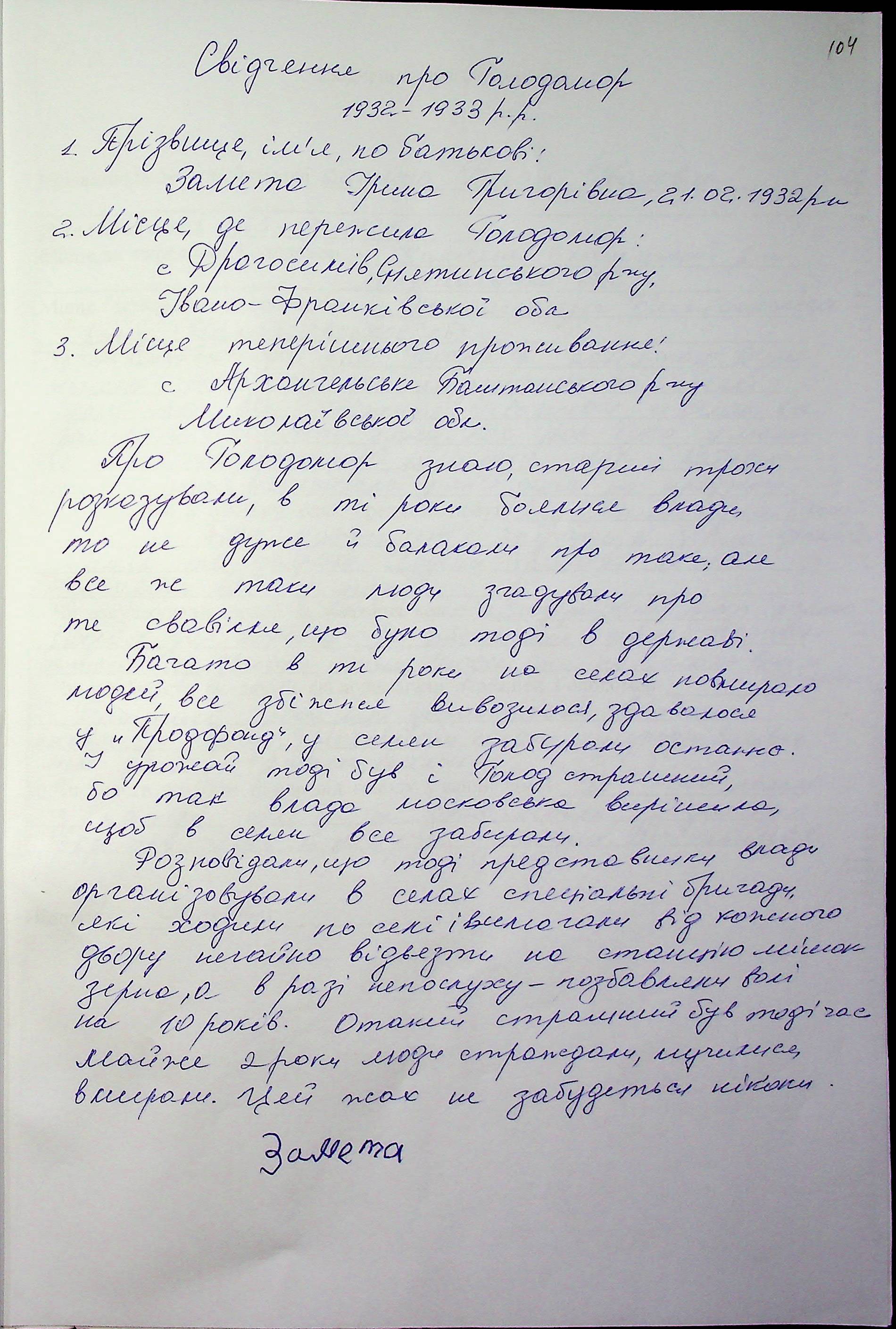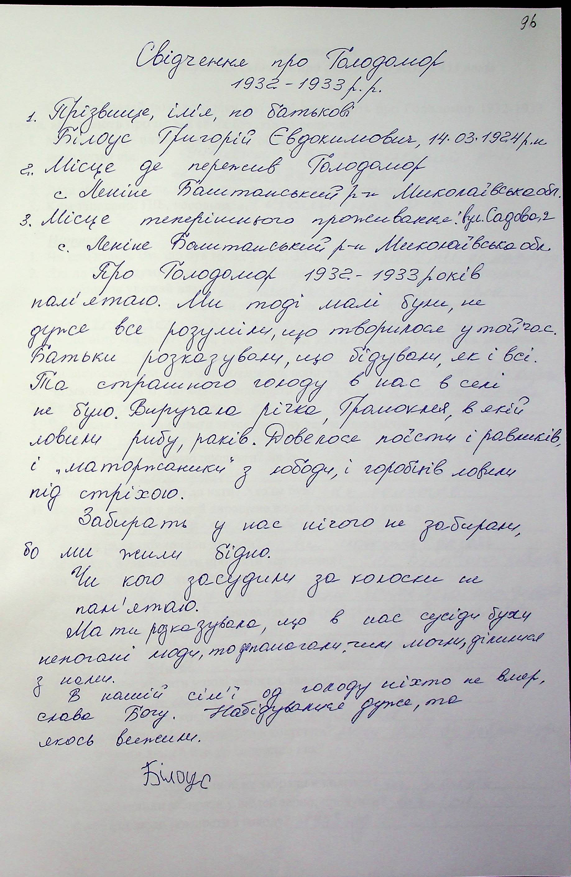 • • • • Справа № 11 “Свідчення очевидців Голодомору 1932-1933 років, які проживають у Баштанському районі, з прізвищами на літери А–Я (доповнення)”