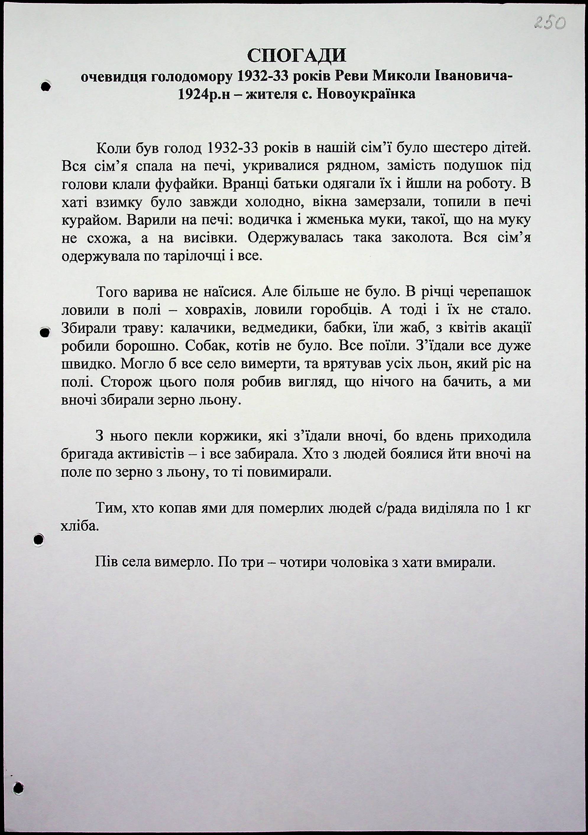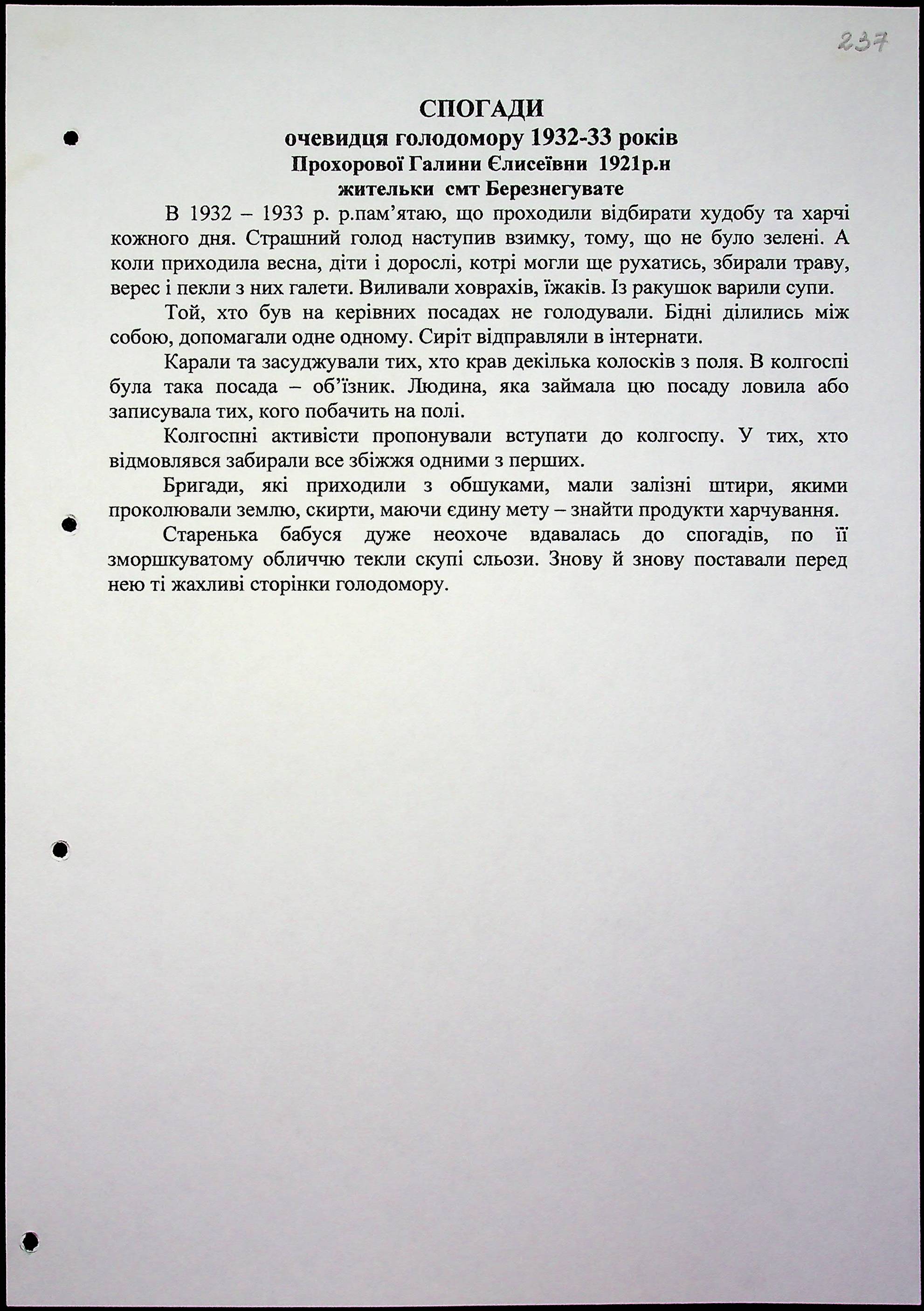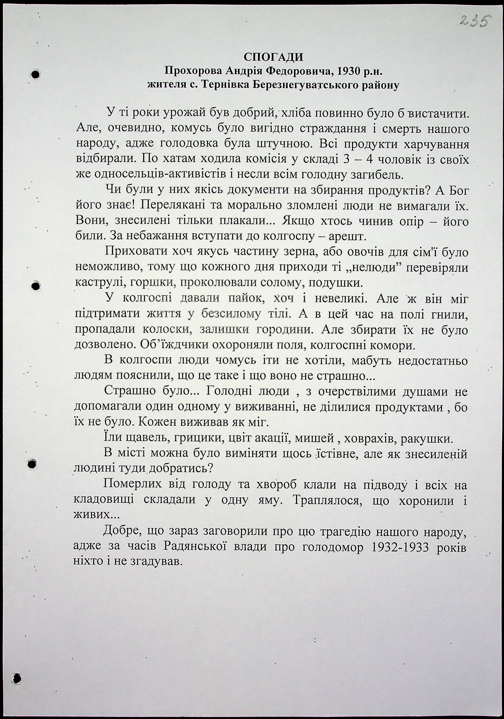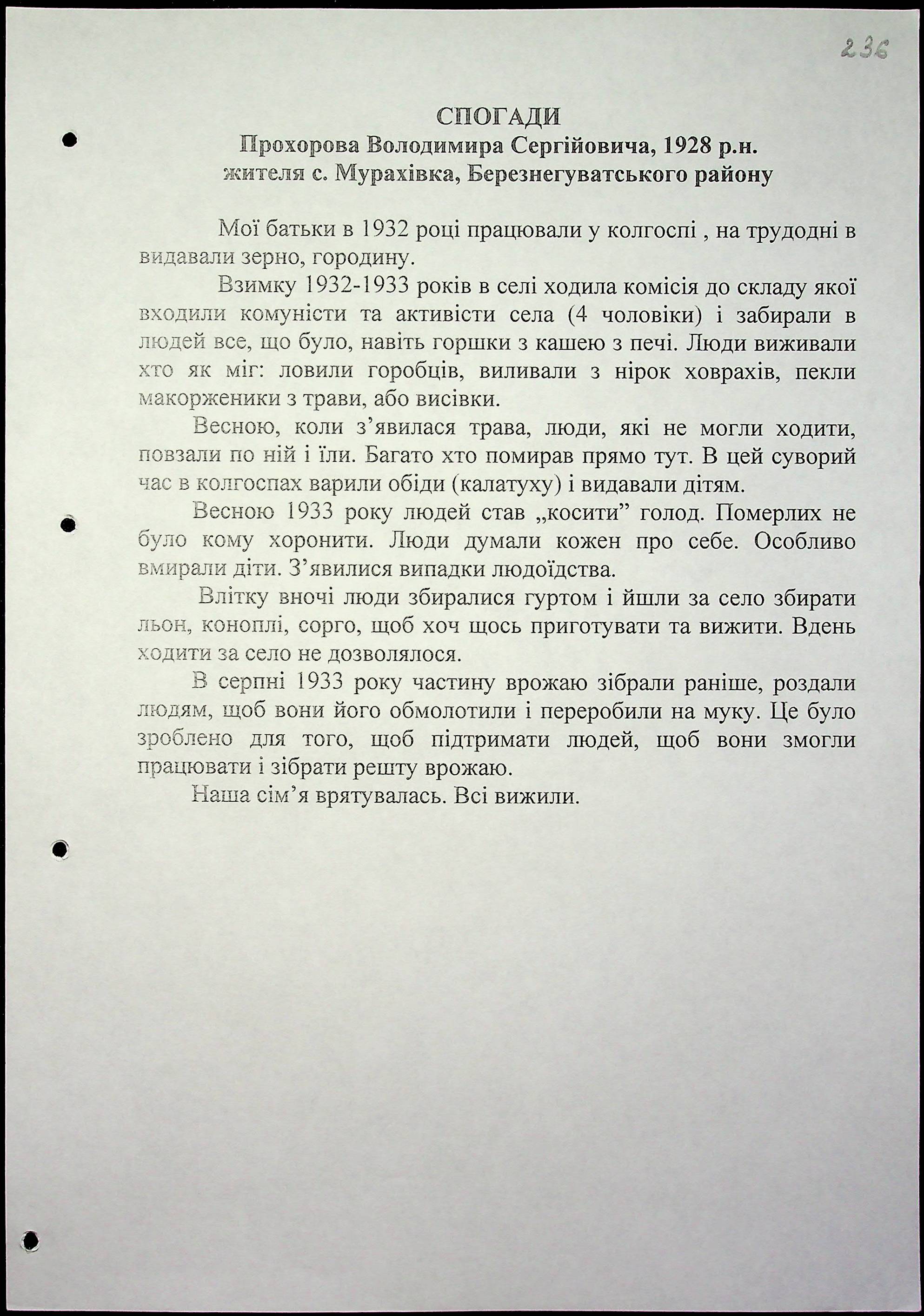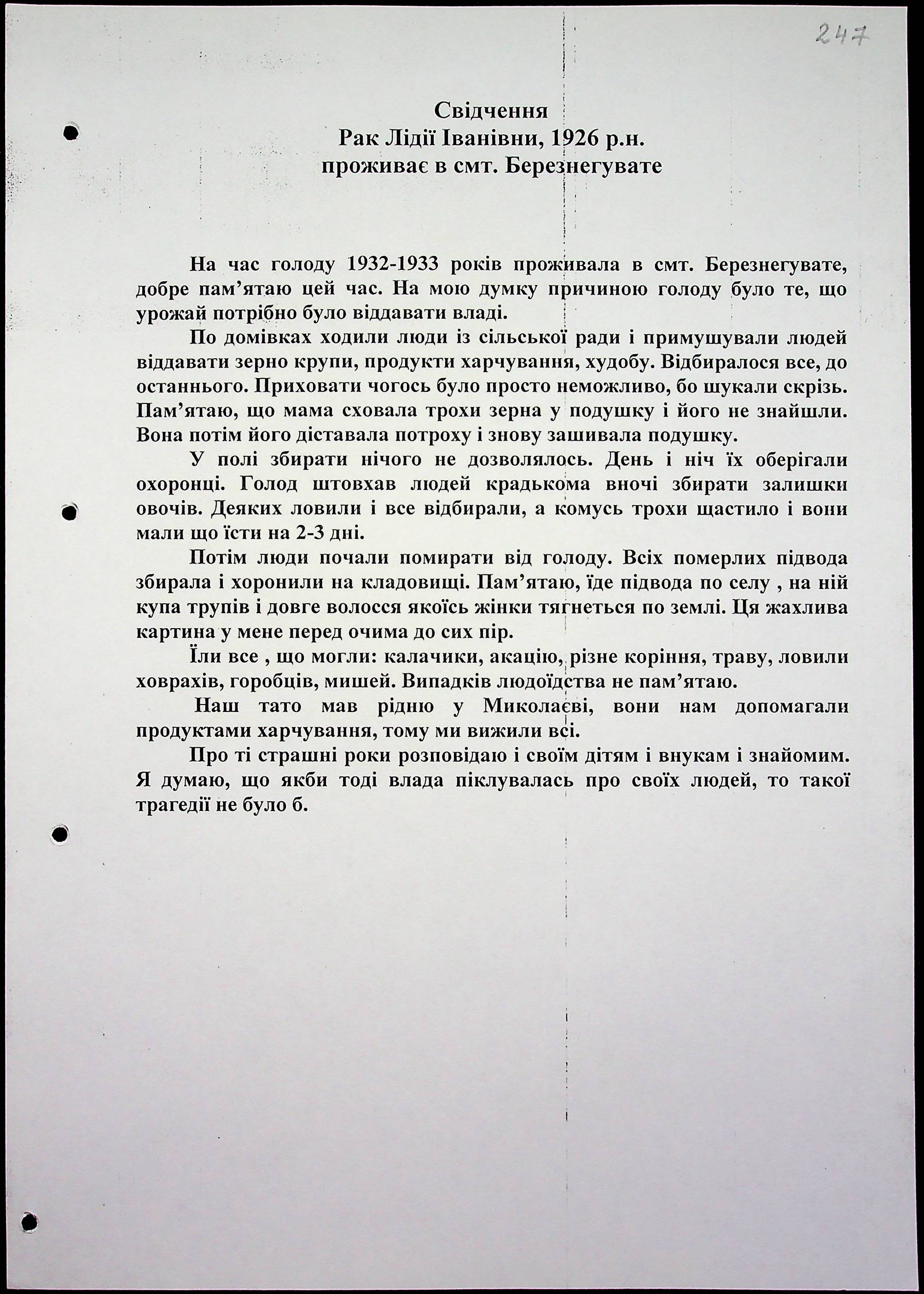 • • • • Справа № 15 “Свідчення очевидців Голодомору 1932-1933 років, які проживають у Березнегуватському районі, з прізвищами на літери Л–Р”