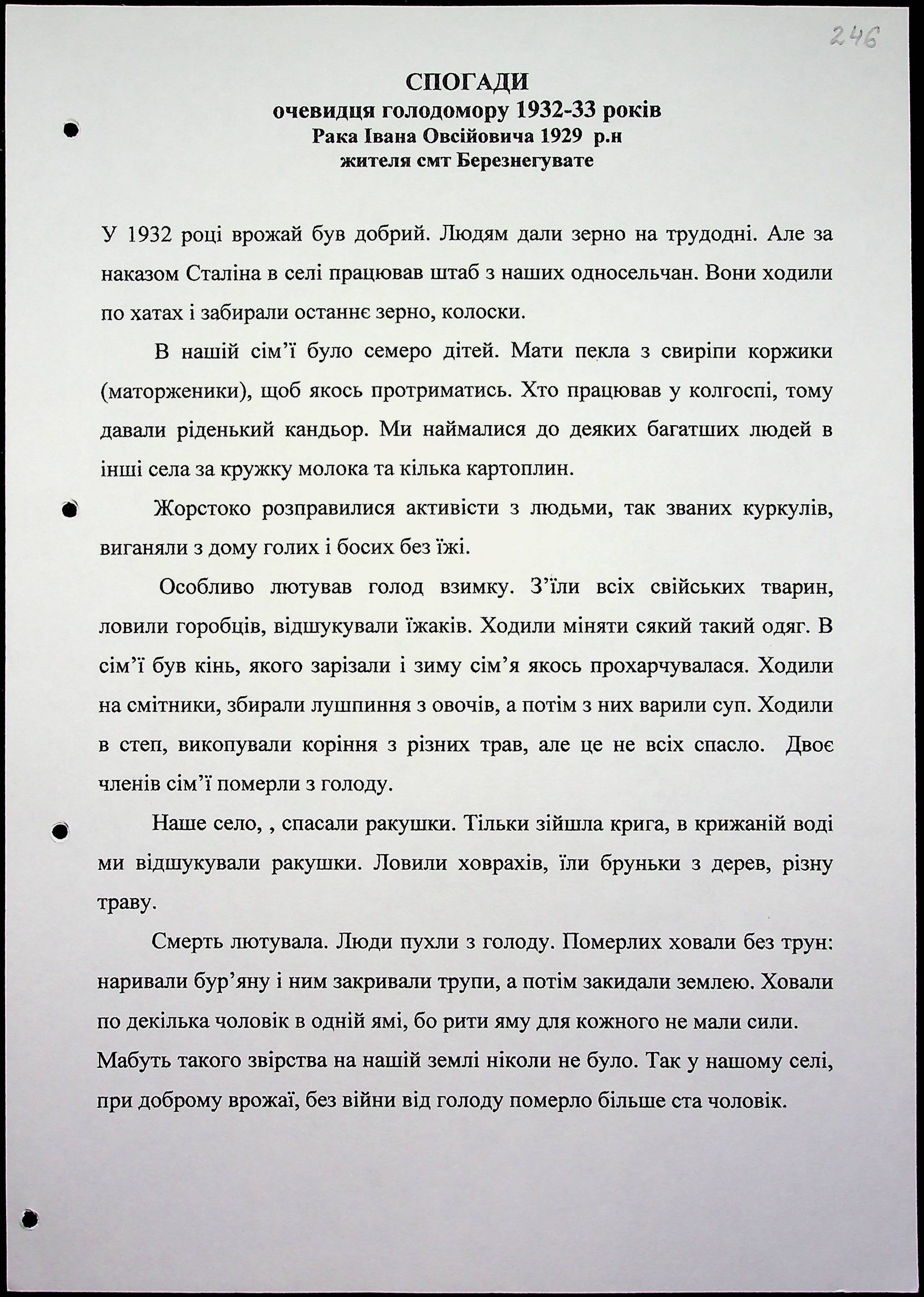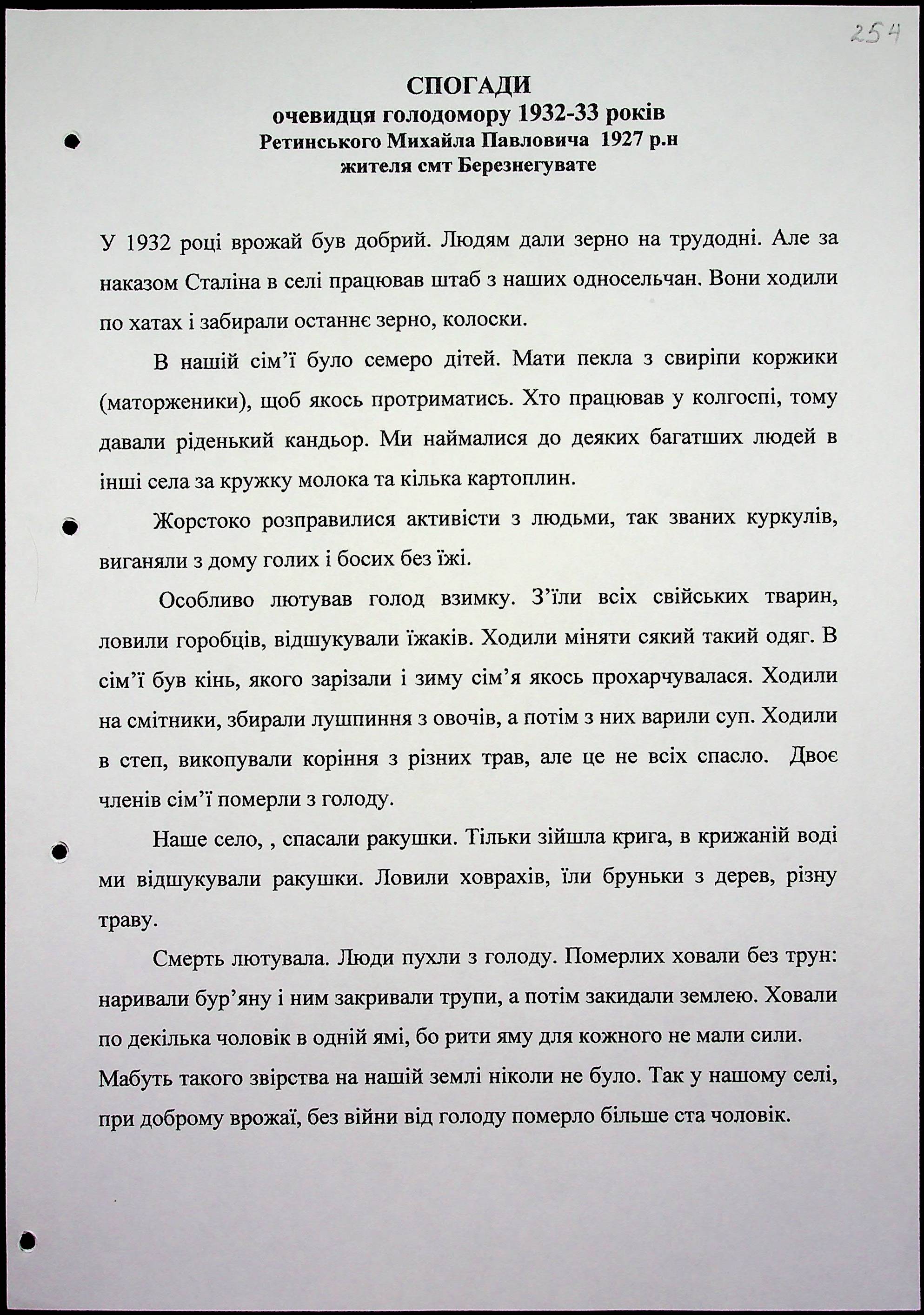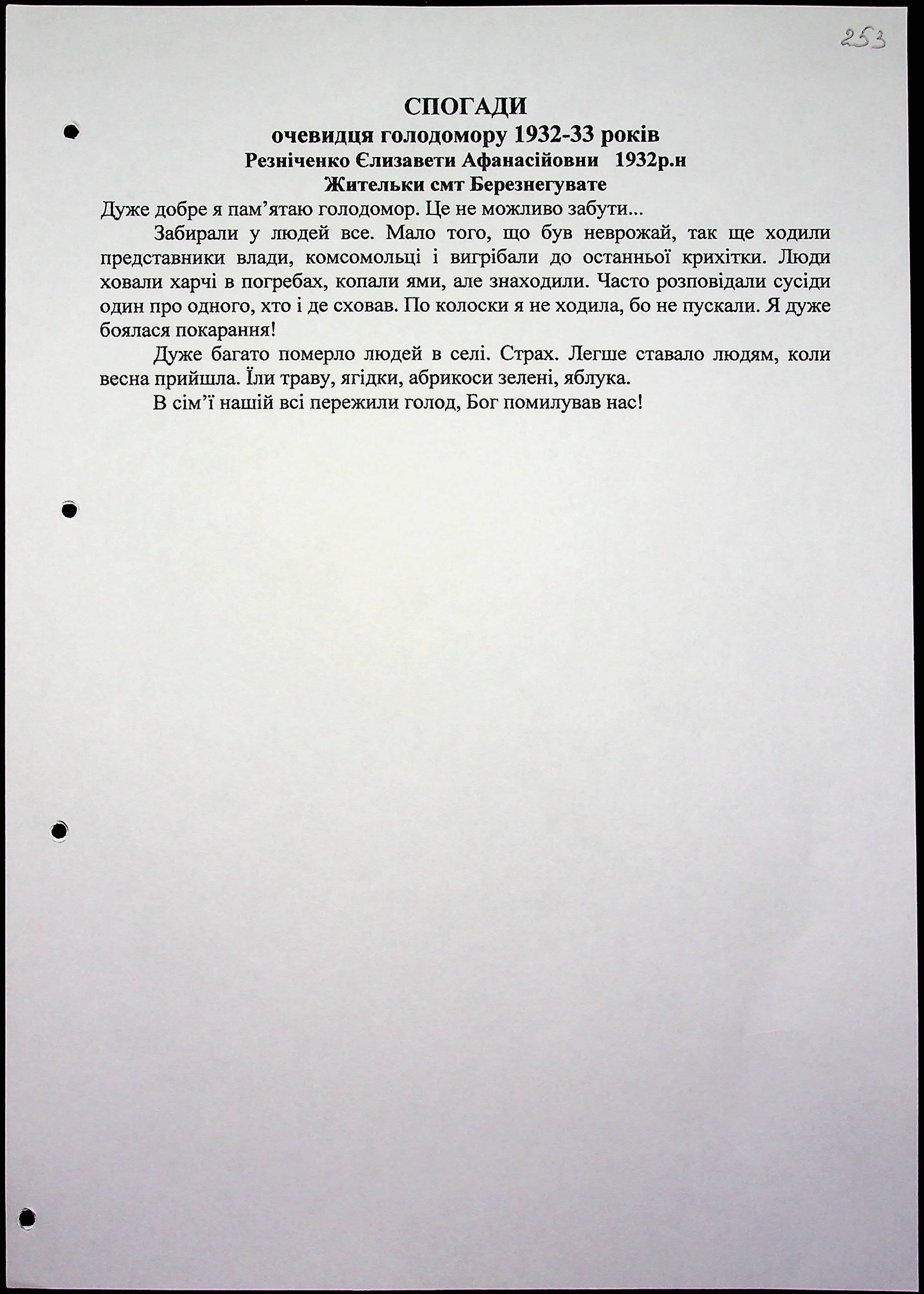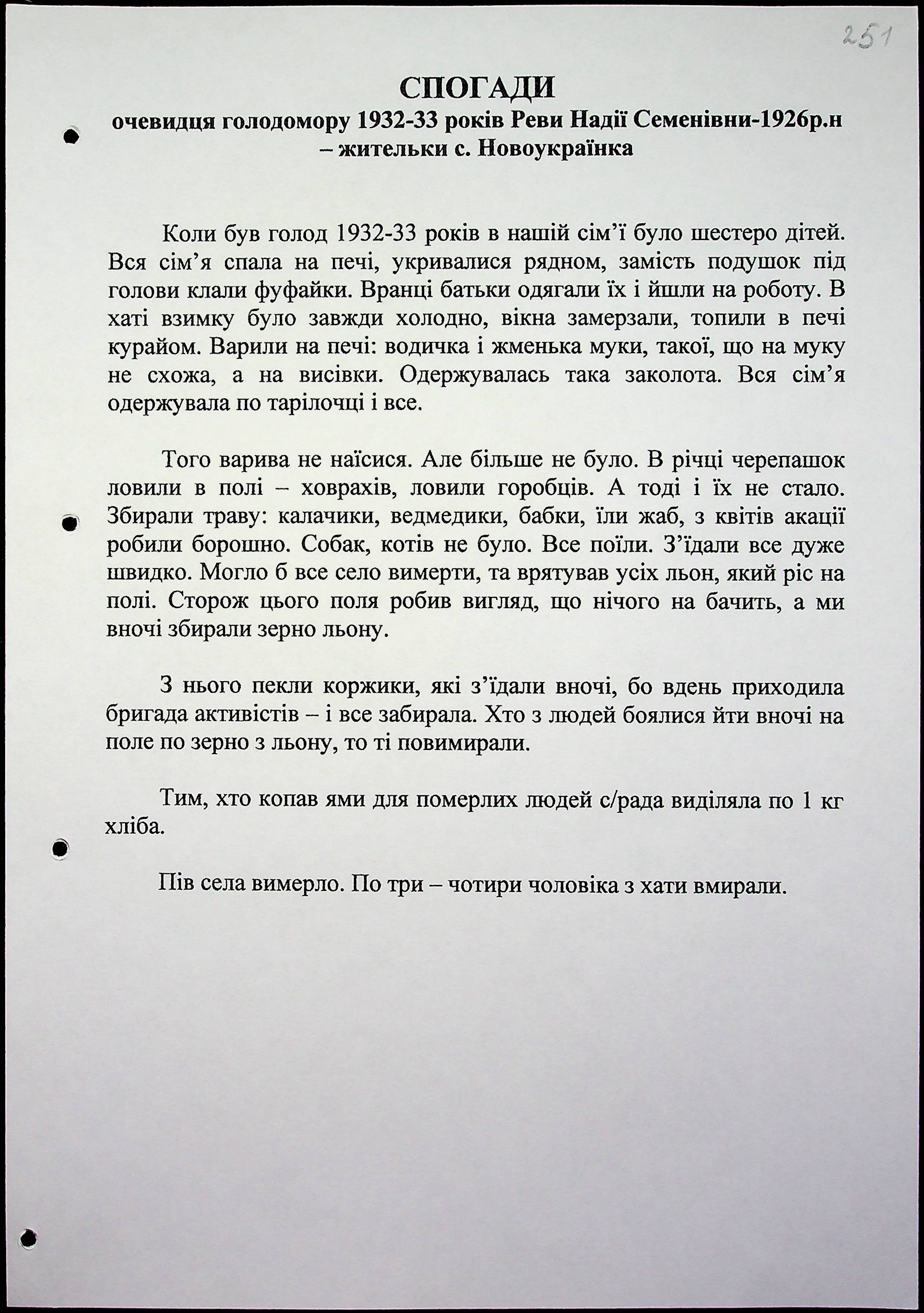 • • • • Справа № 15 “Свідчення очевидців Голодомору 1932-1933 років, які проживають у Березнегуватському районі, з прізвищами на літери Л–Р”