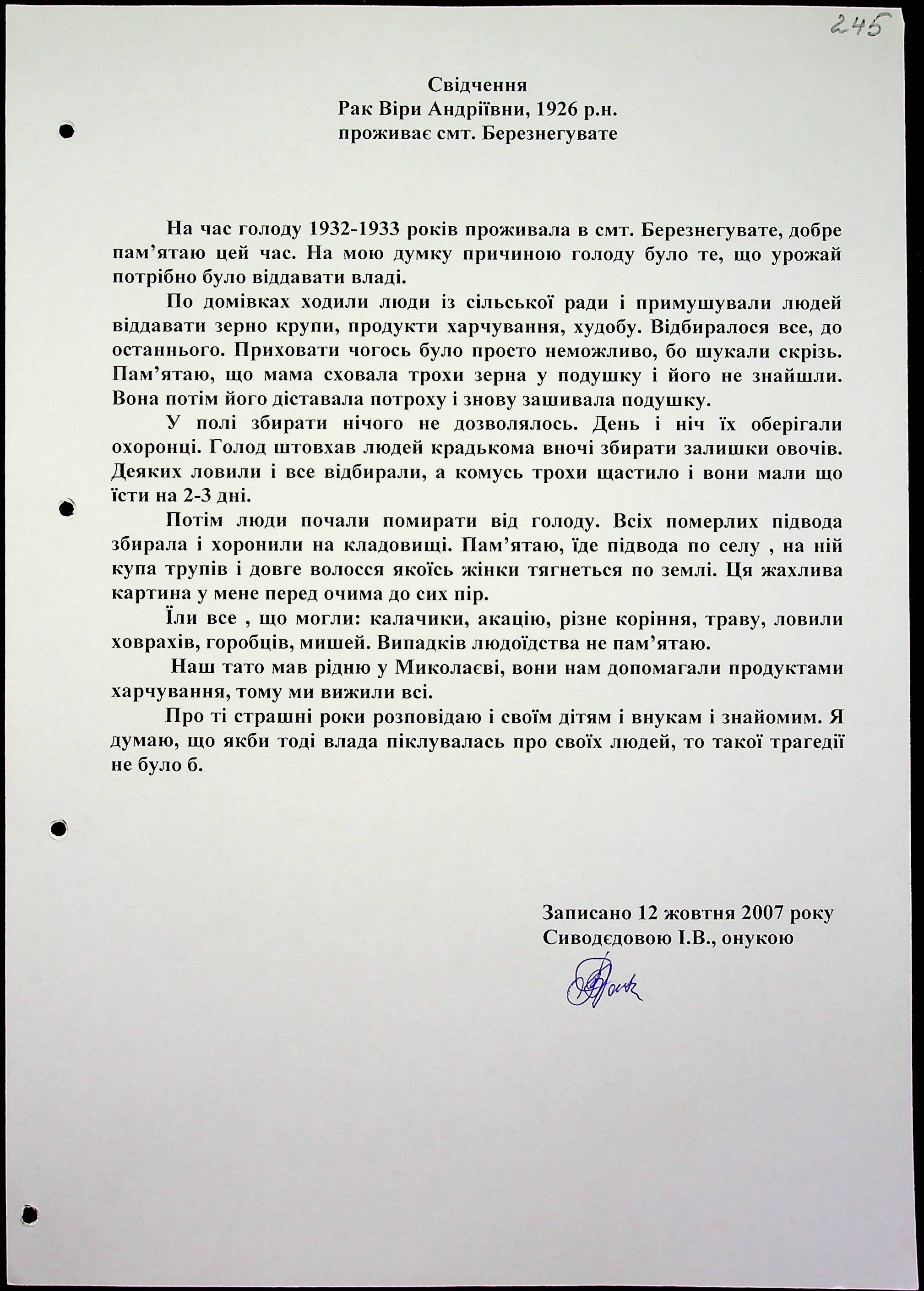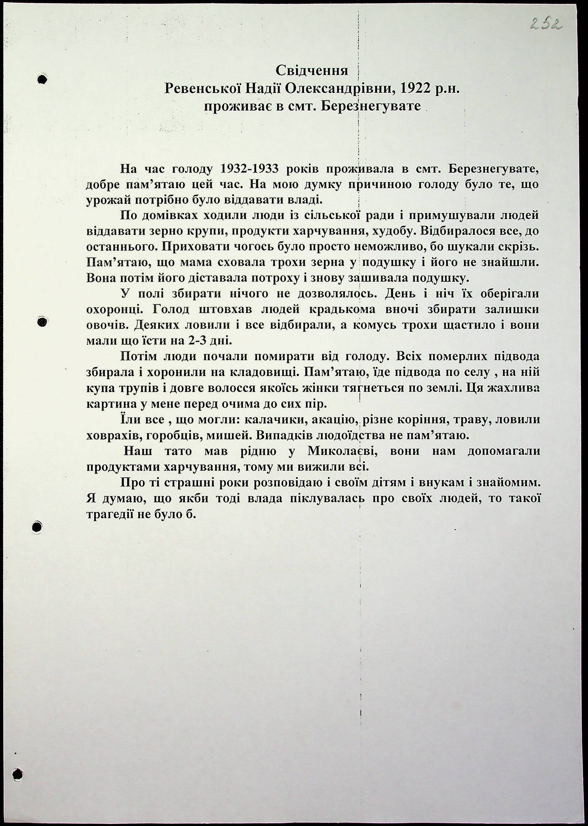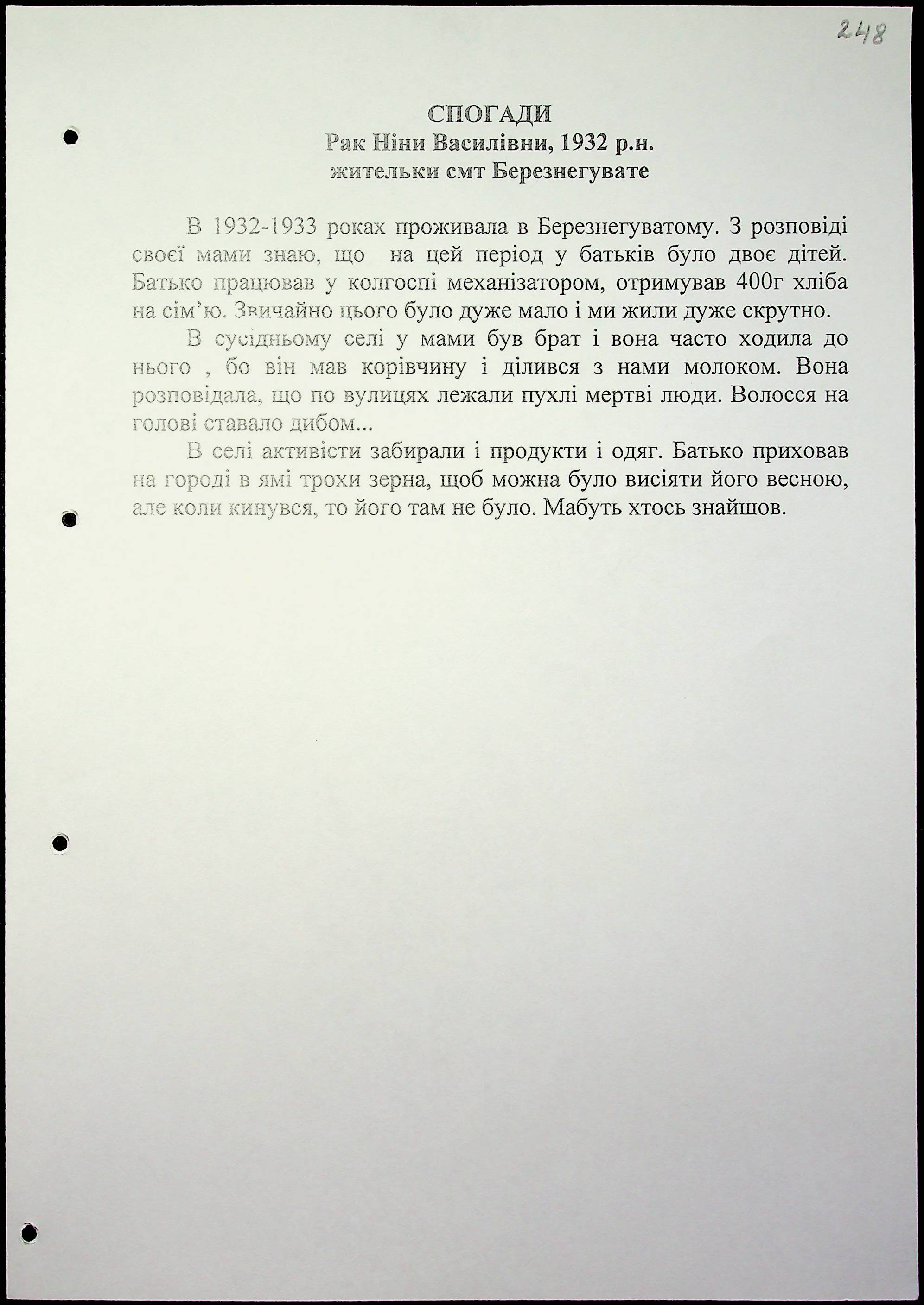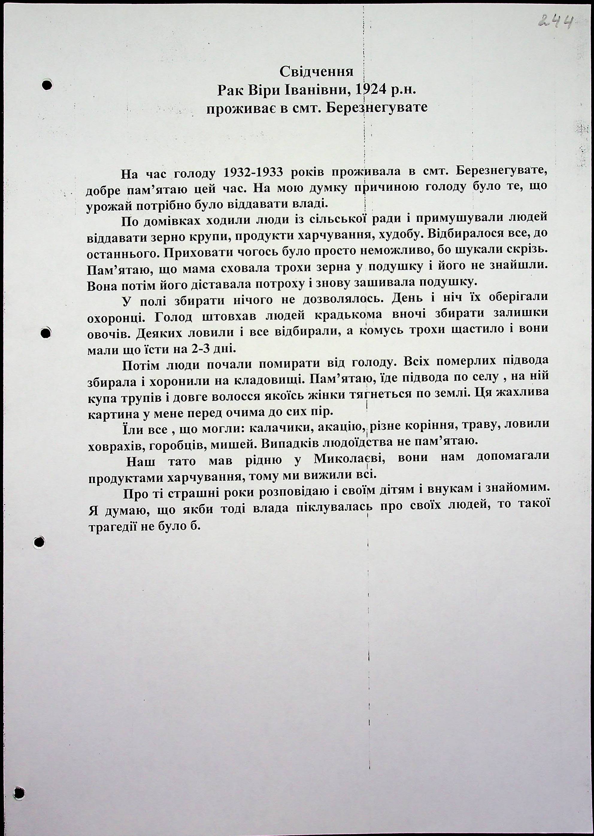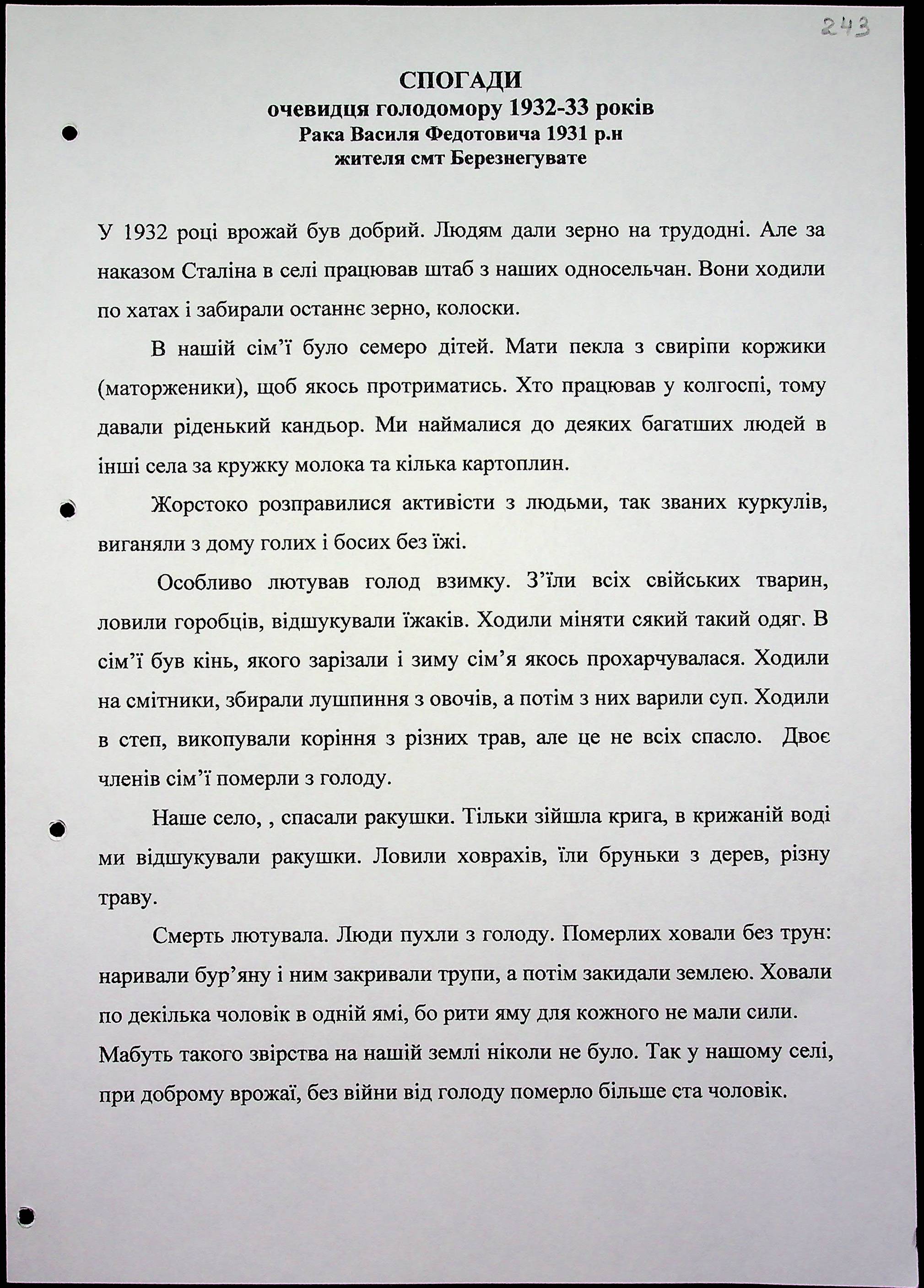 • • • • Справа № 15 “Свідчення очевидців Голодомору 1932-1933 років, які проживають у Березнегуватському районі, з прізвищами на літери Л–Р”