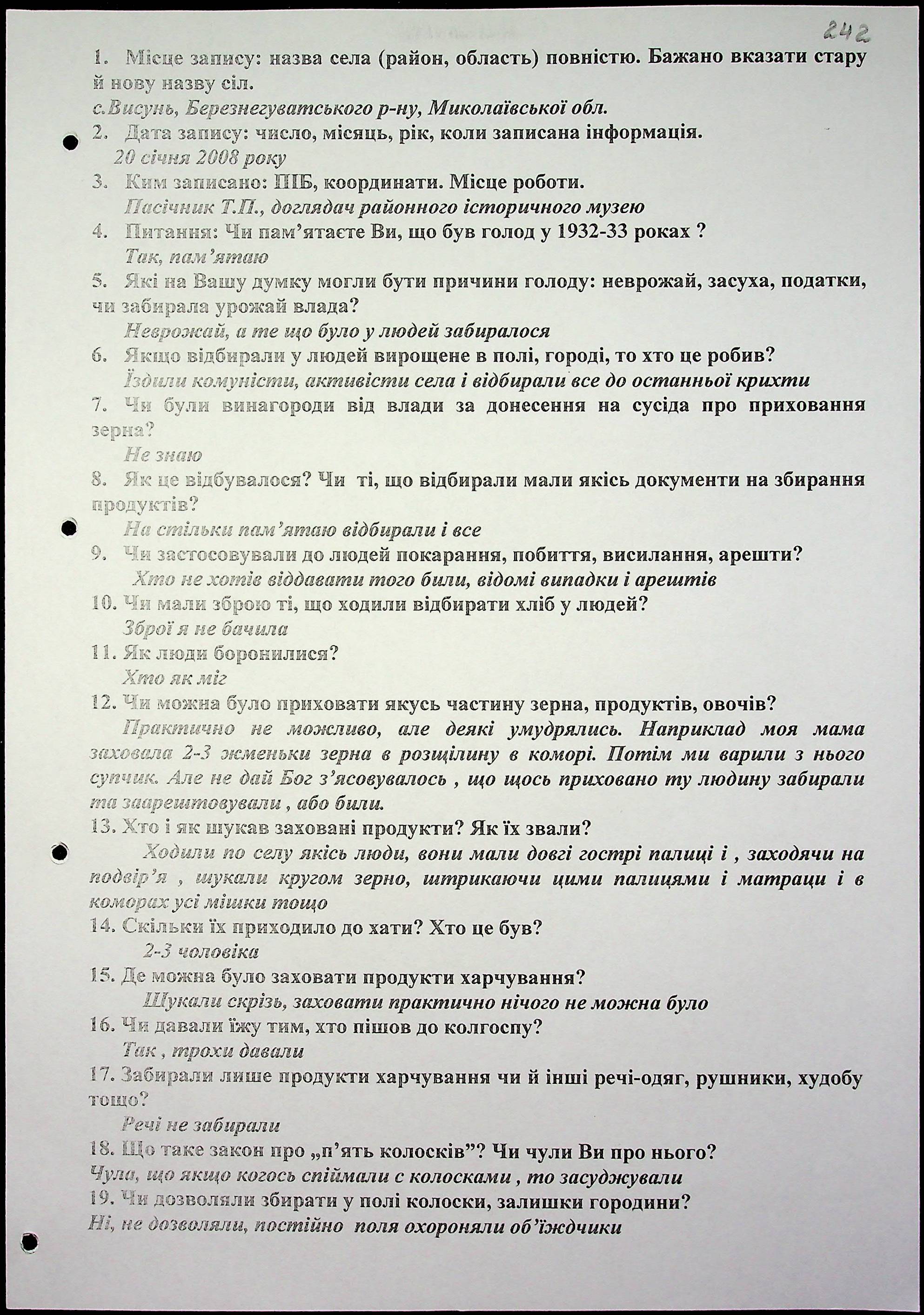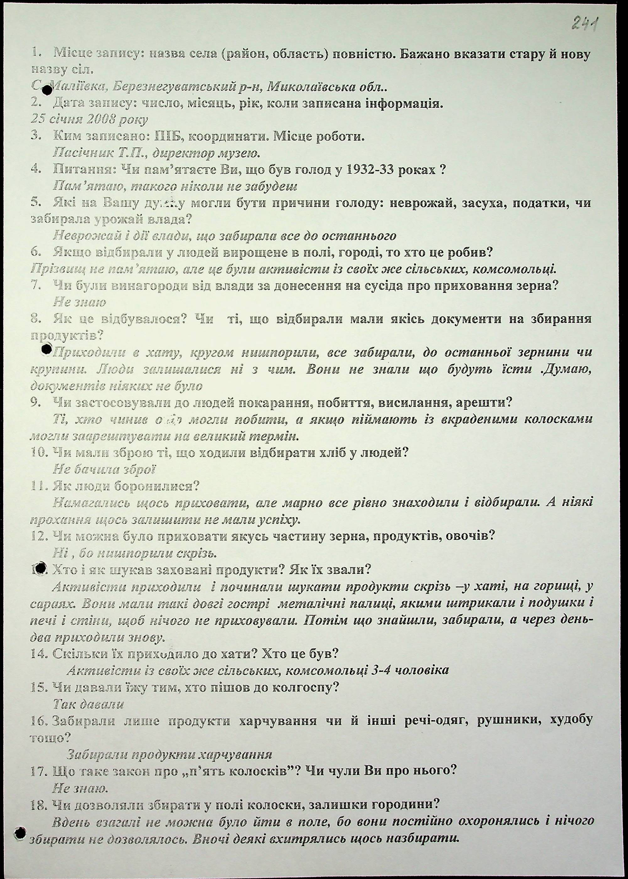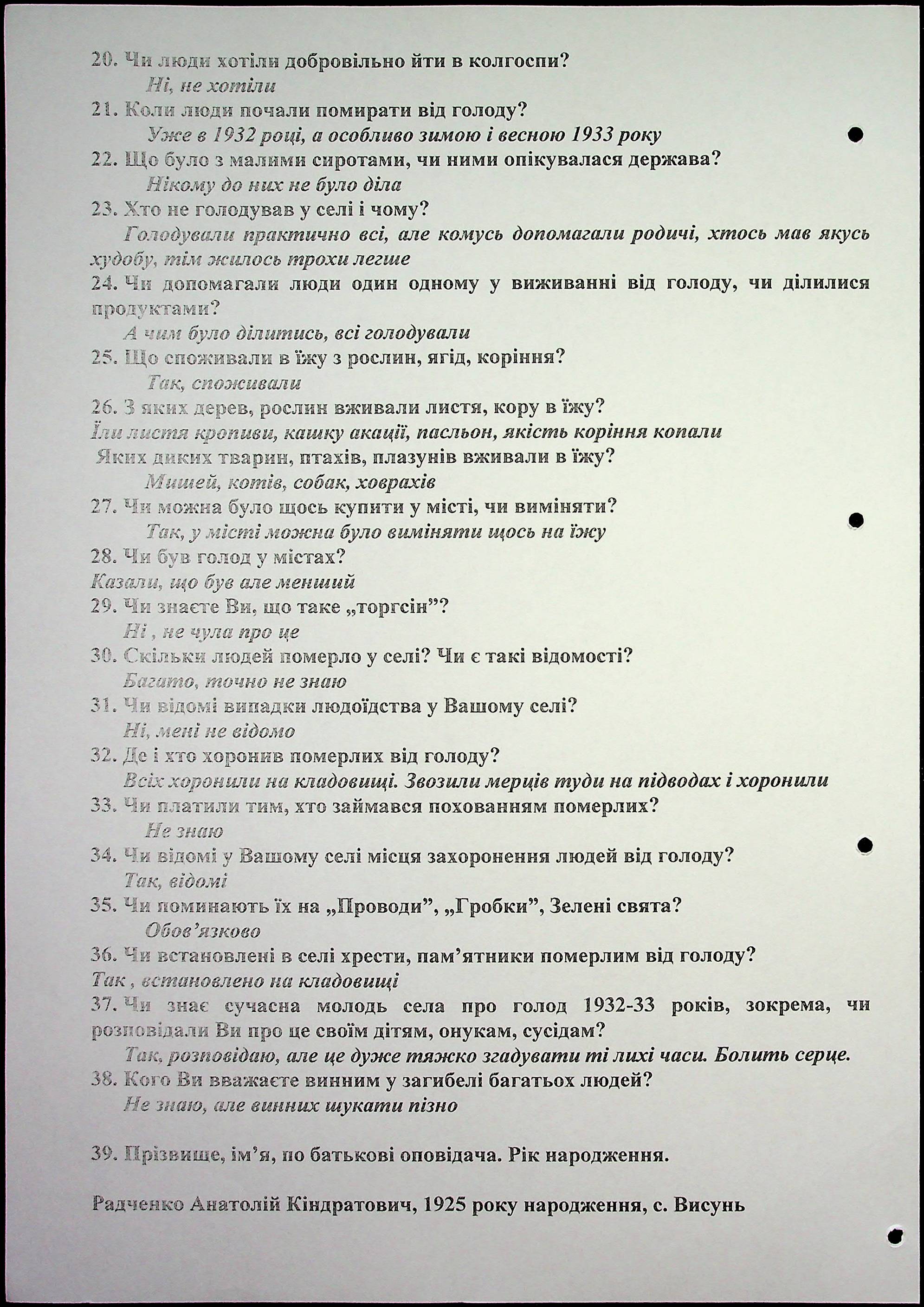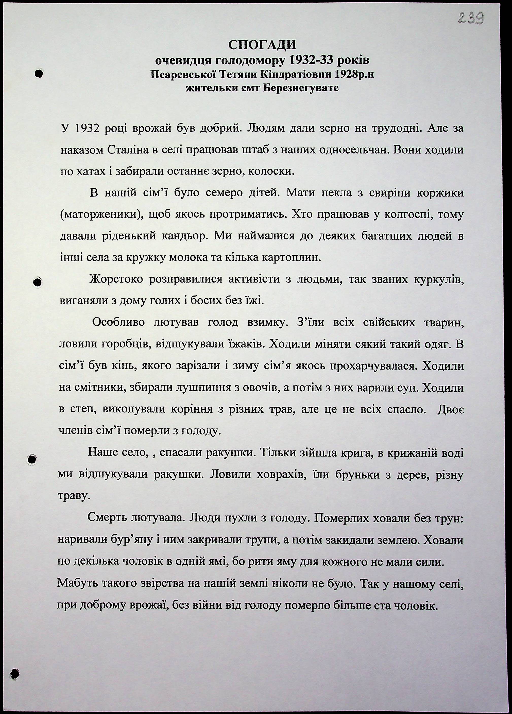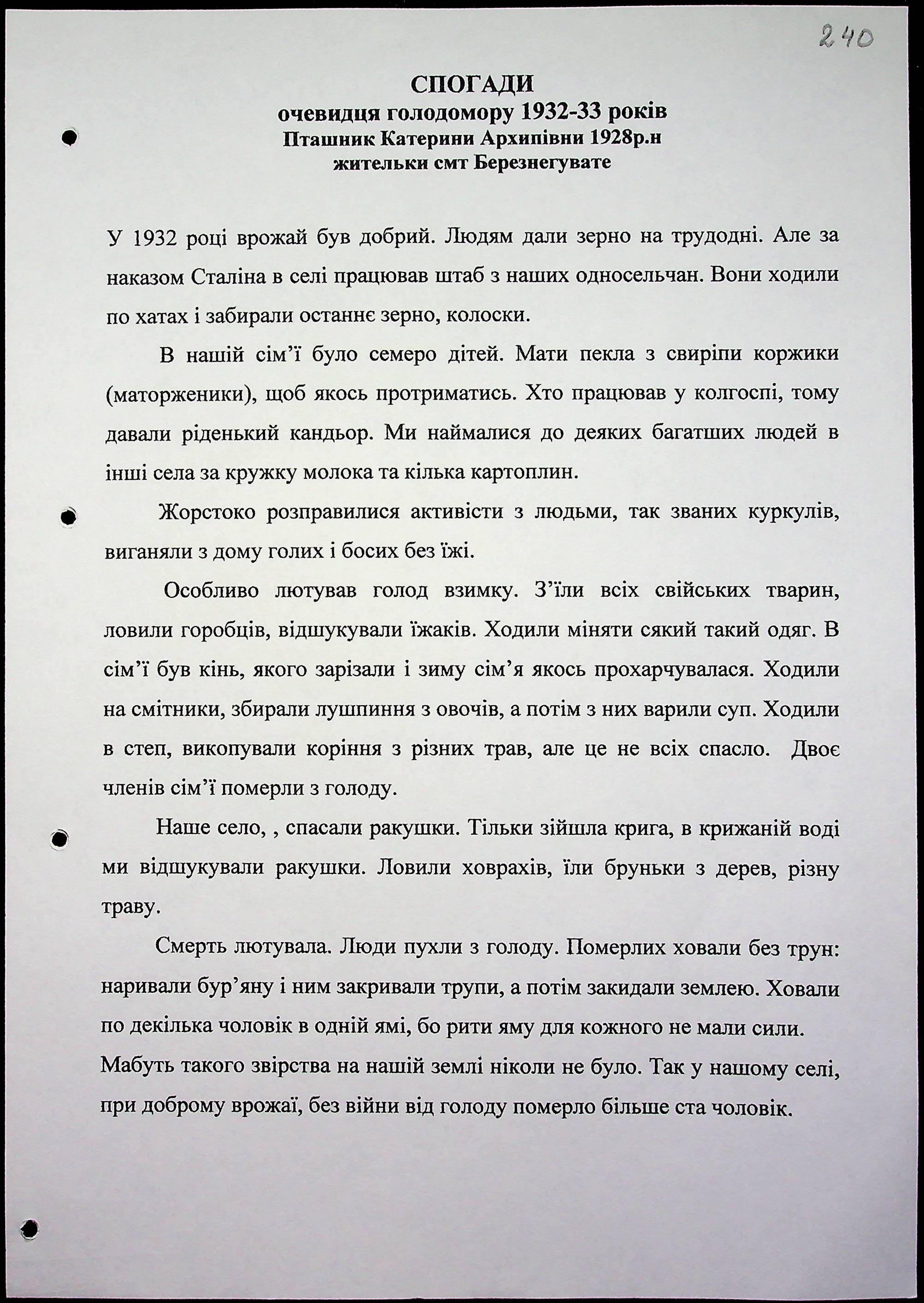 • • • • Справа № 15 “Свідчення очевидців Голодомору 1932-1933 років, які проживають у Березнегуватському районі, з прізвищами на літери Л–Р”