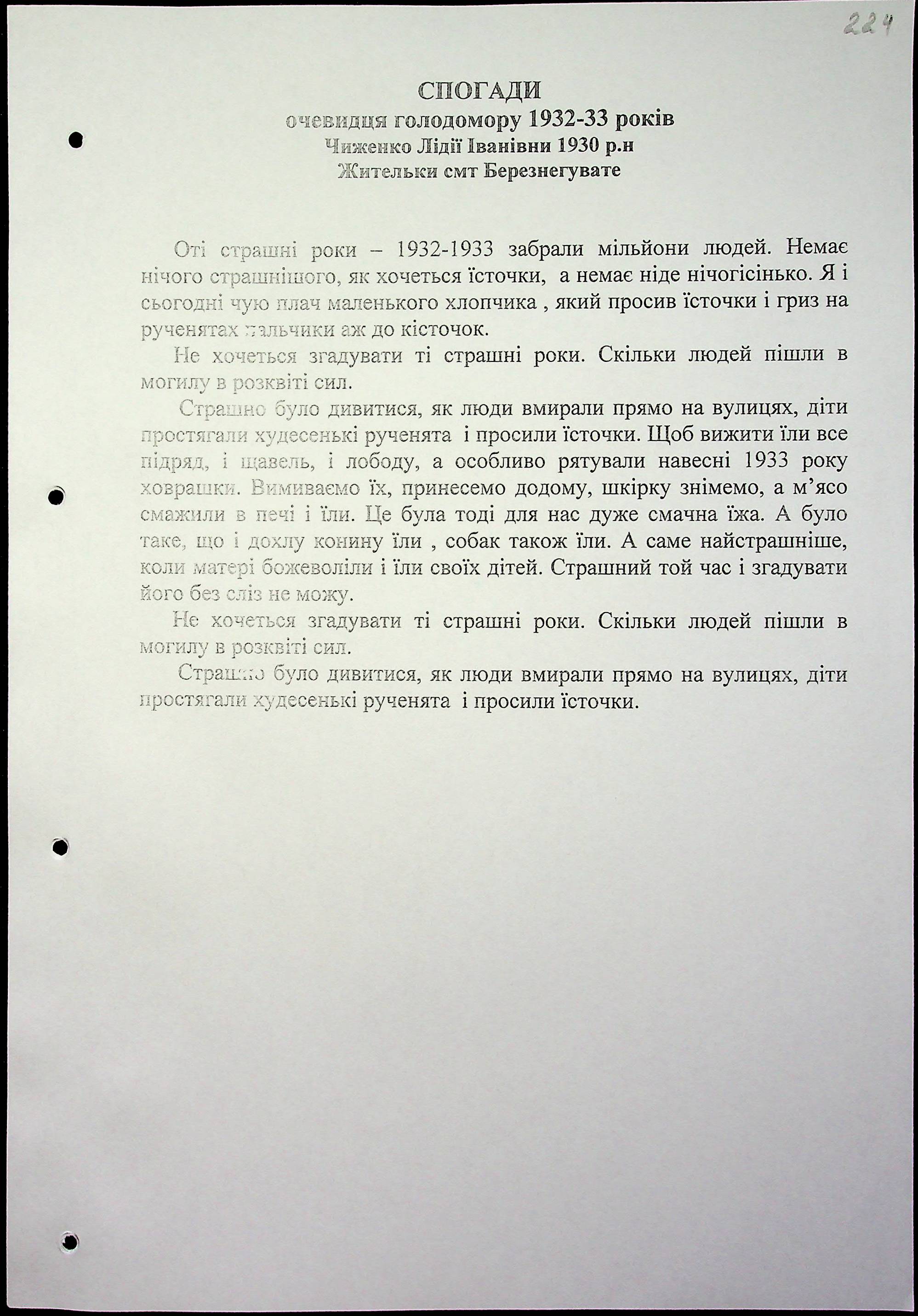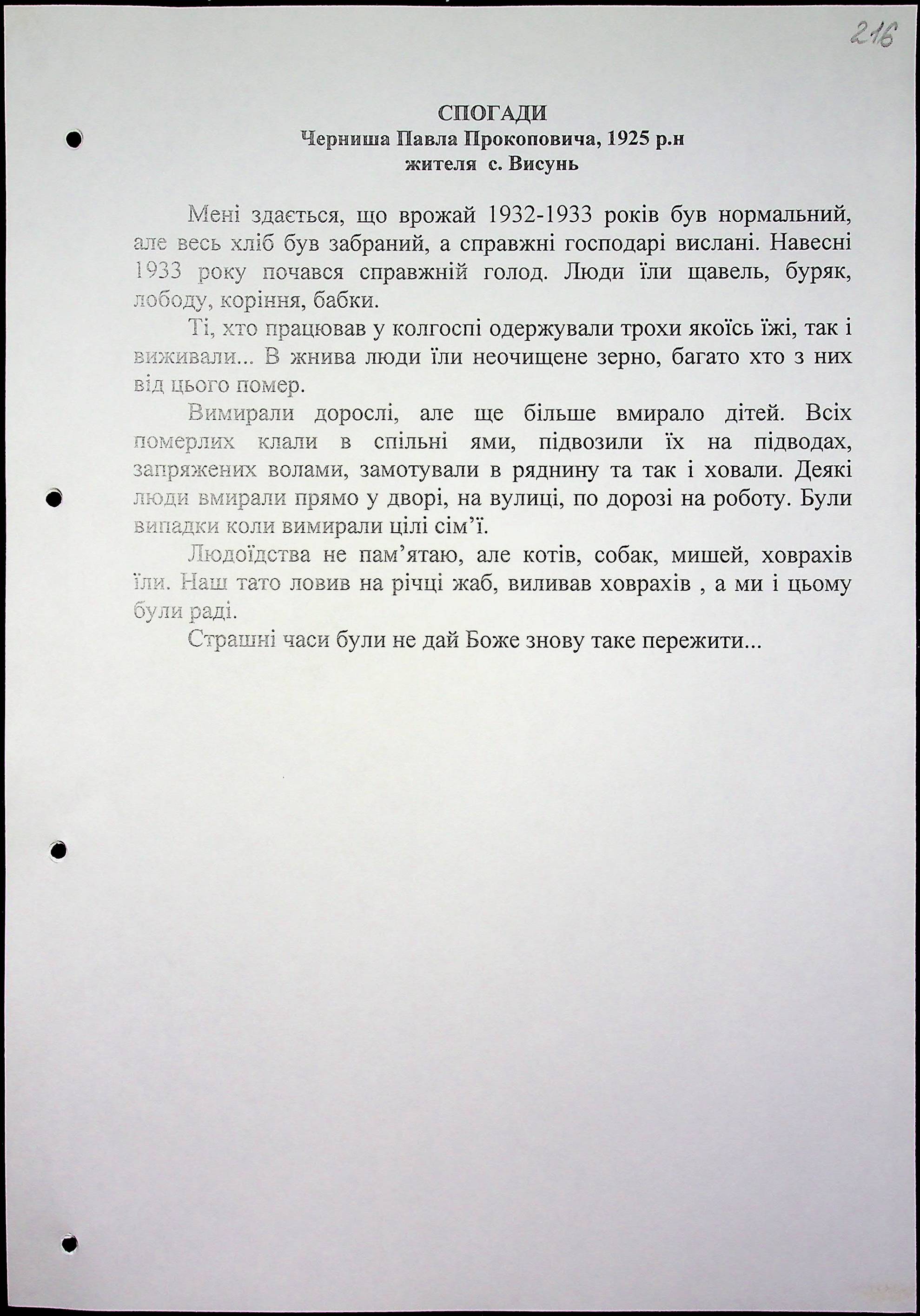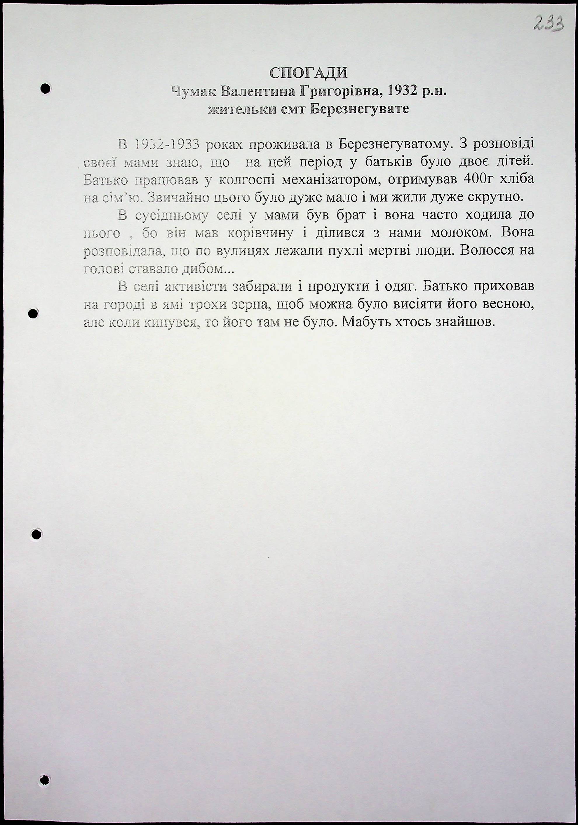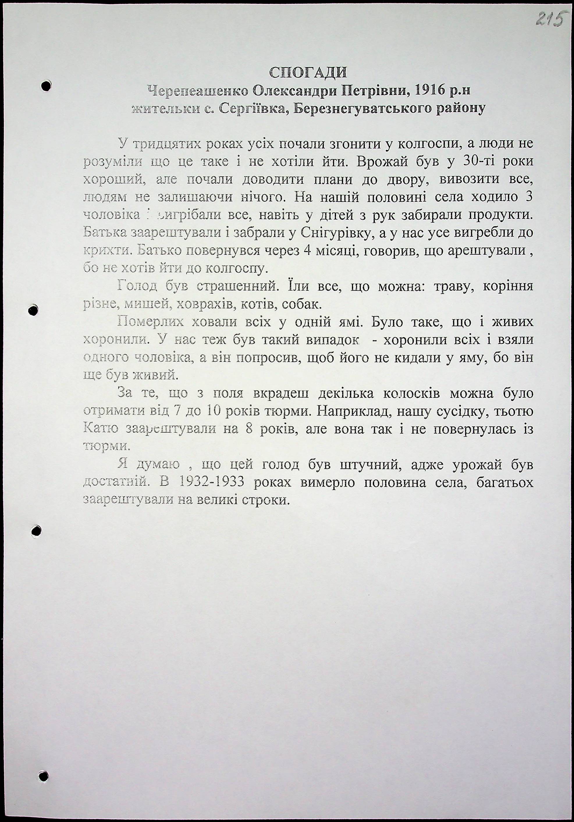 • • • • Справа № 16 “Свідчення очевидців Голодомору 1932-1933 років, які проживають у Березнегуватському районі, з прізвищами на літери С–Я”