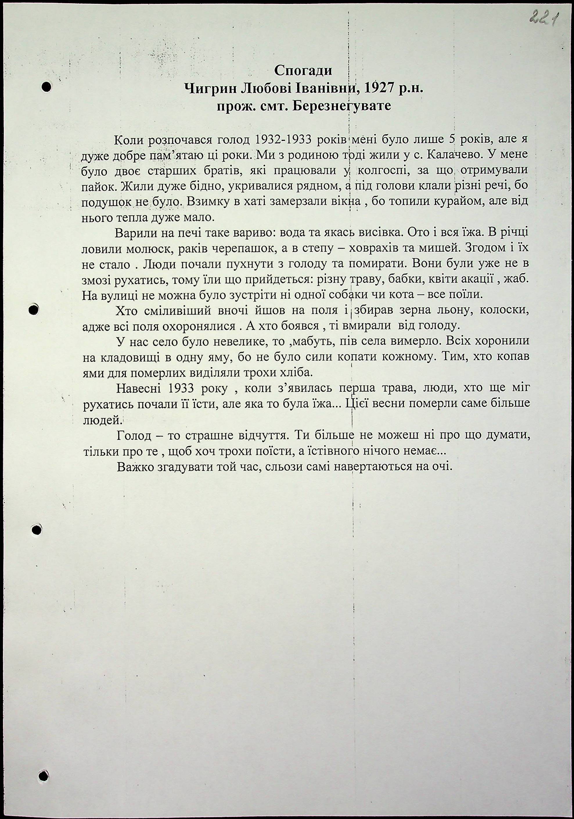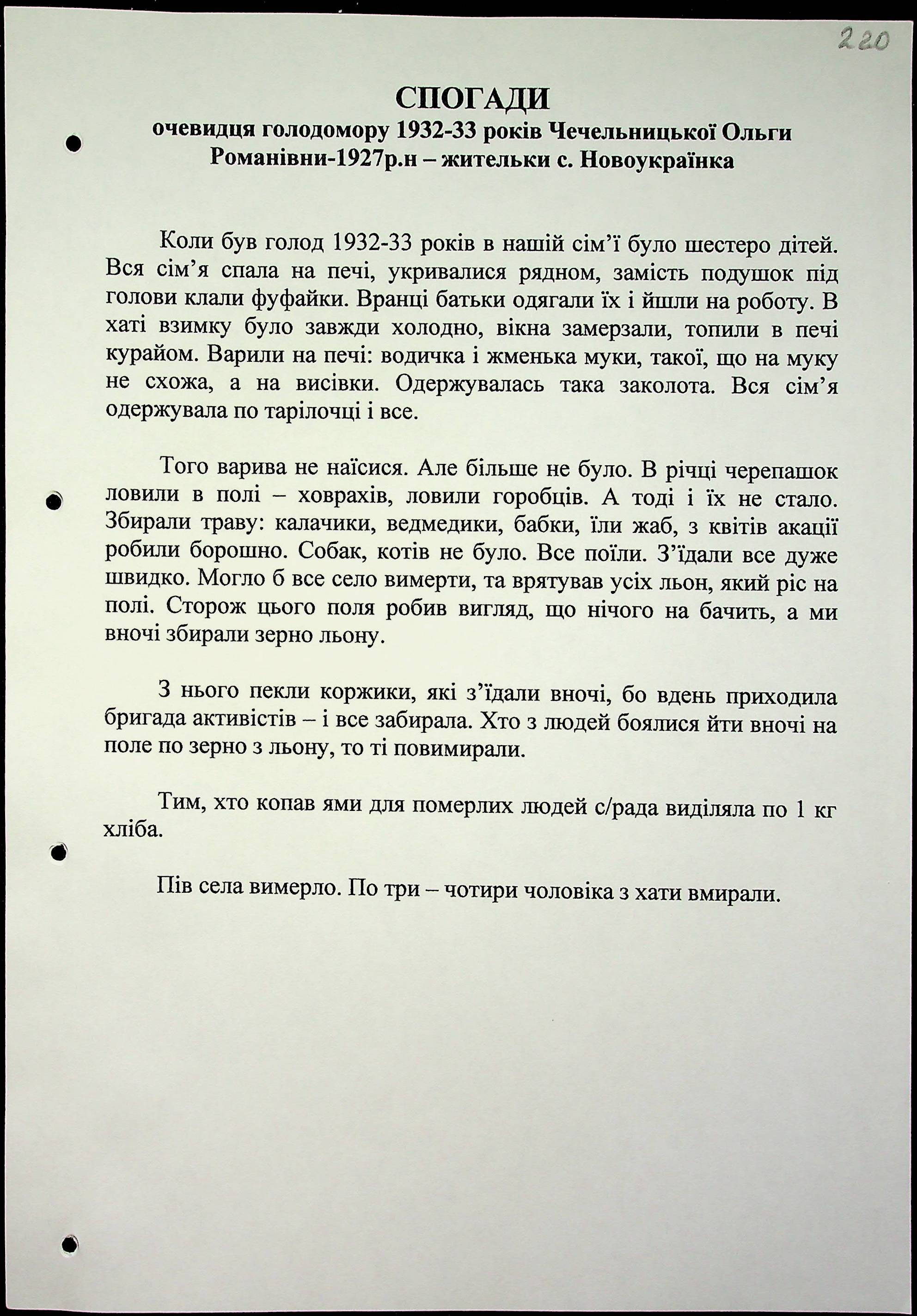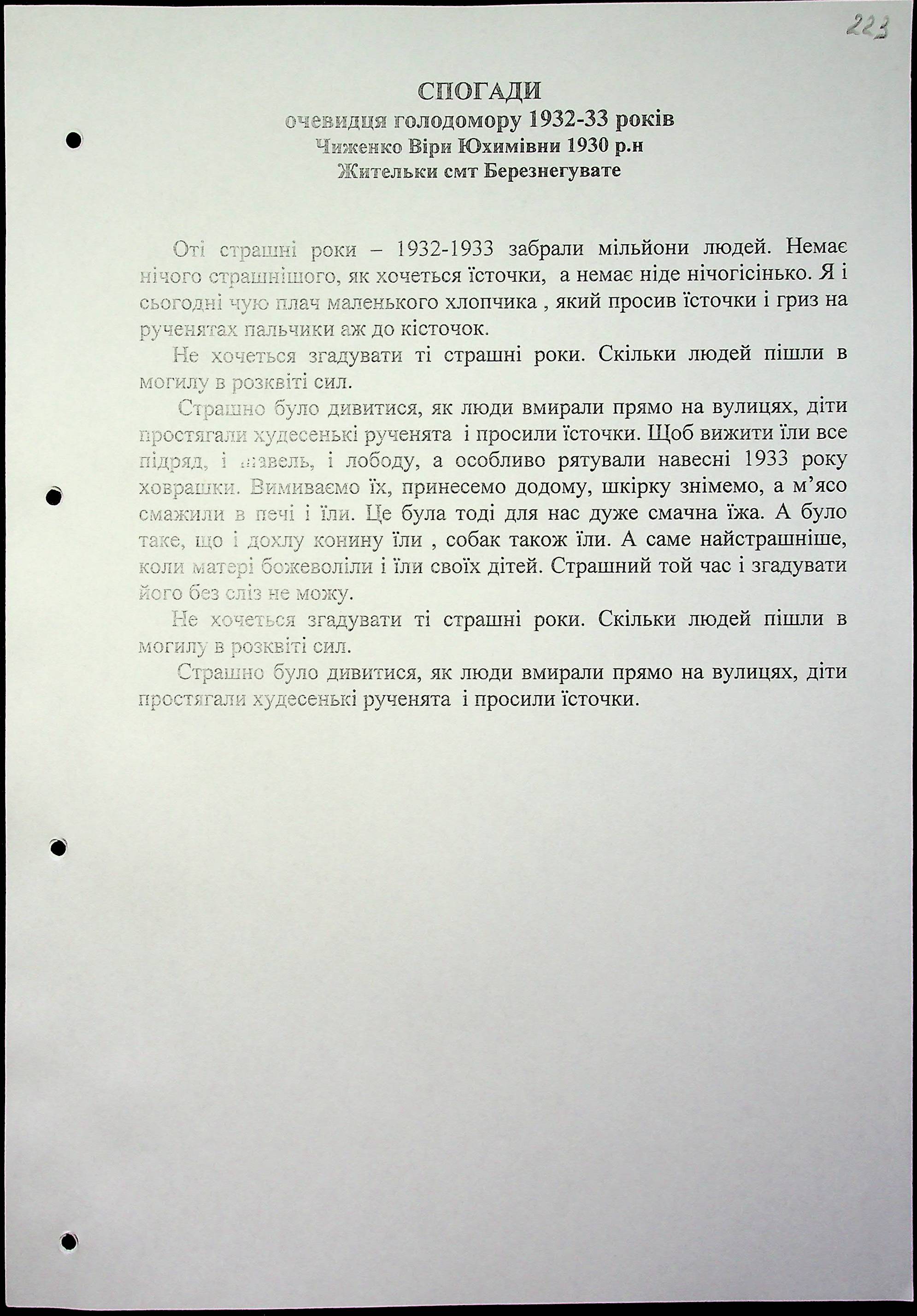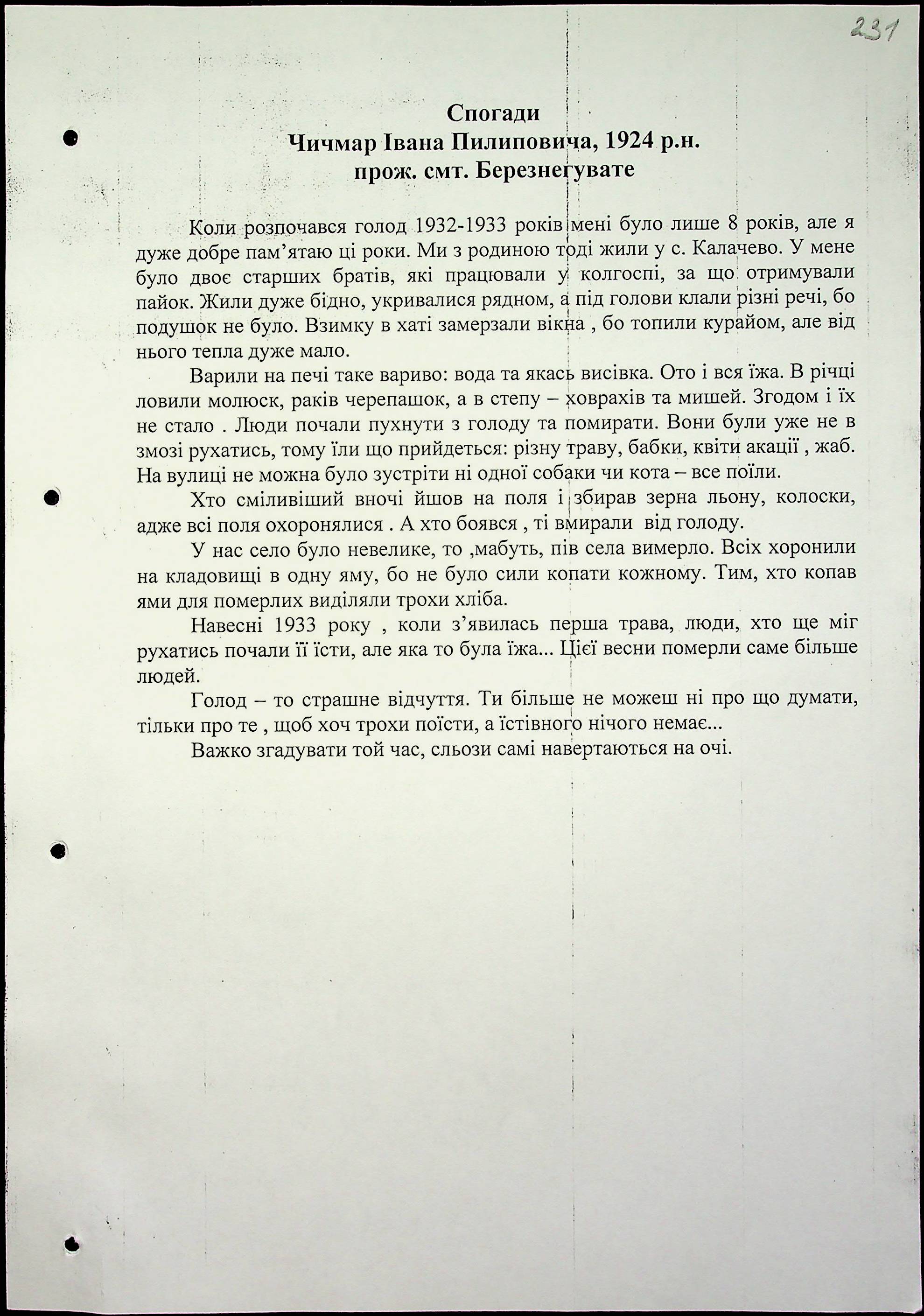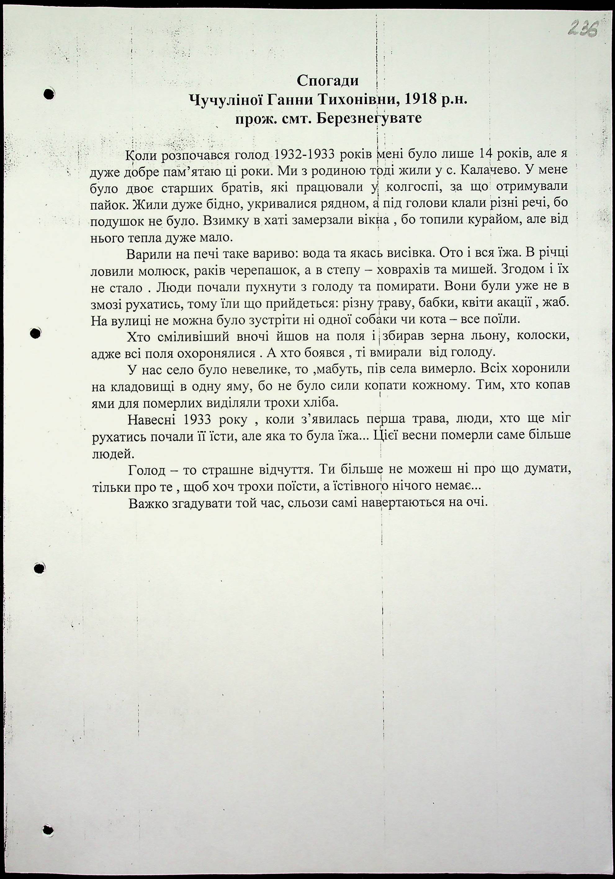 • • • • Справа № 16 “Свідчення очевидців Голодомору 1932-1933 років, які проживають у Березнегуватському районі, з прізвищами на літери С–Я”