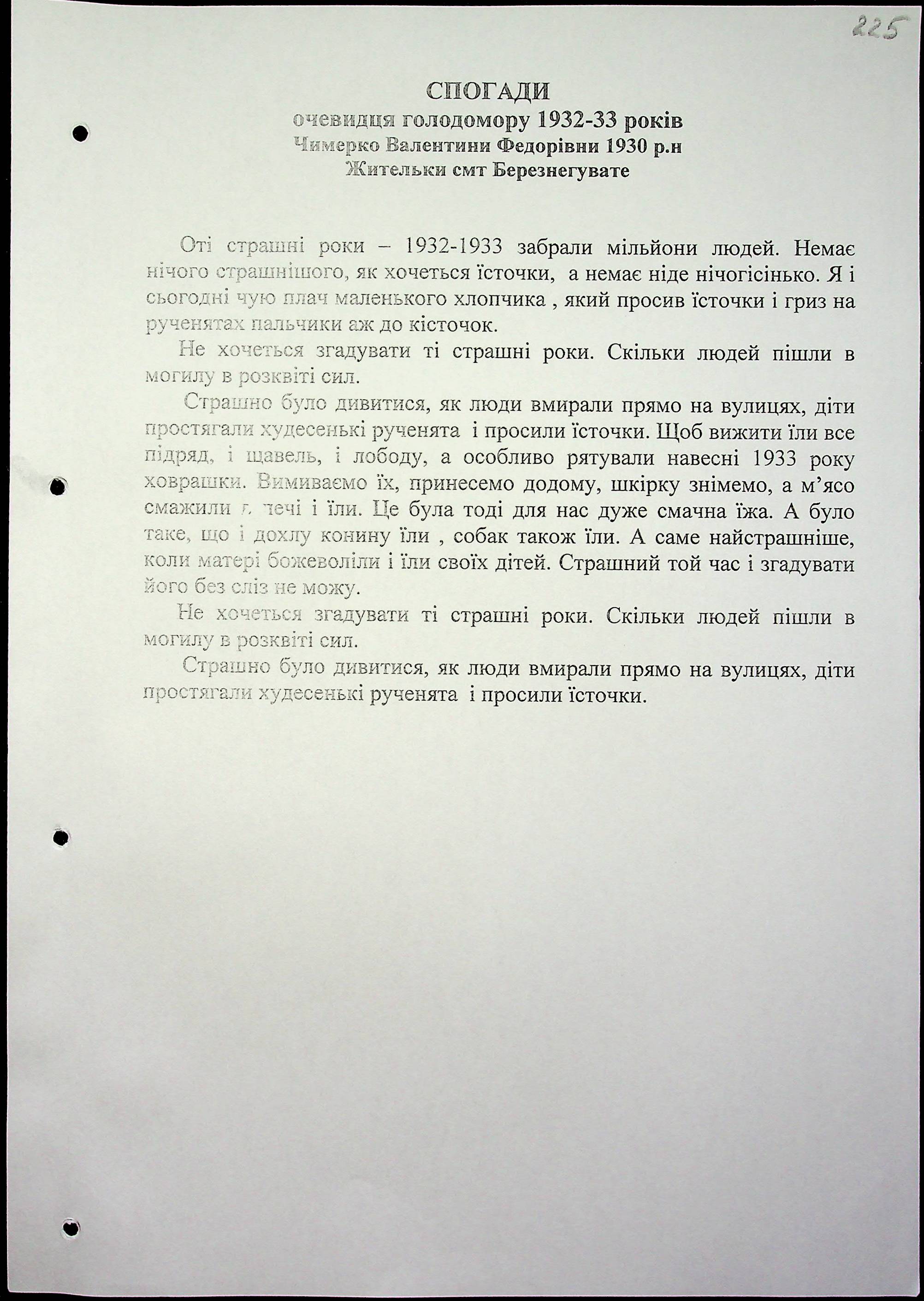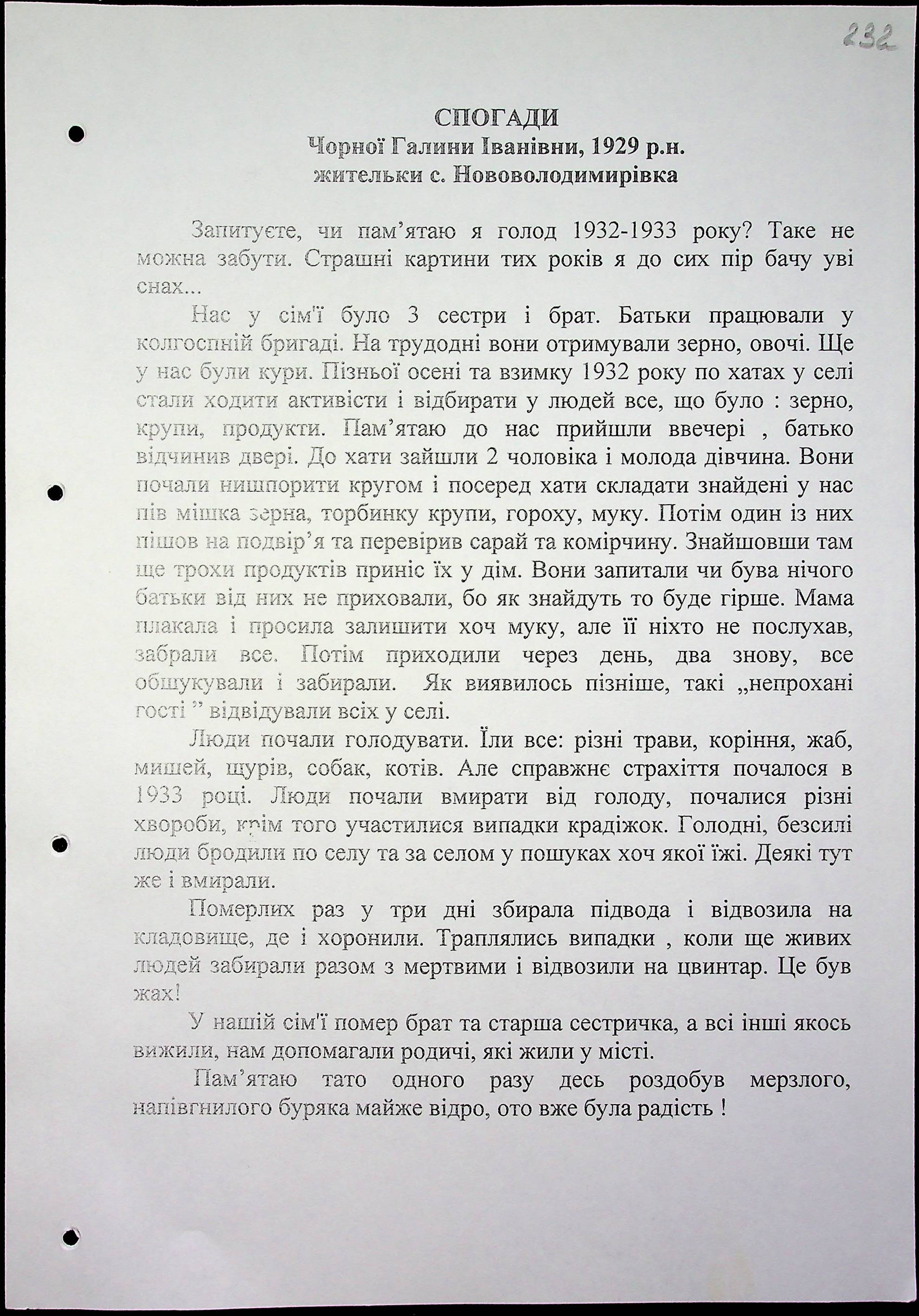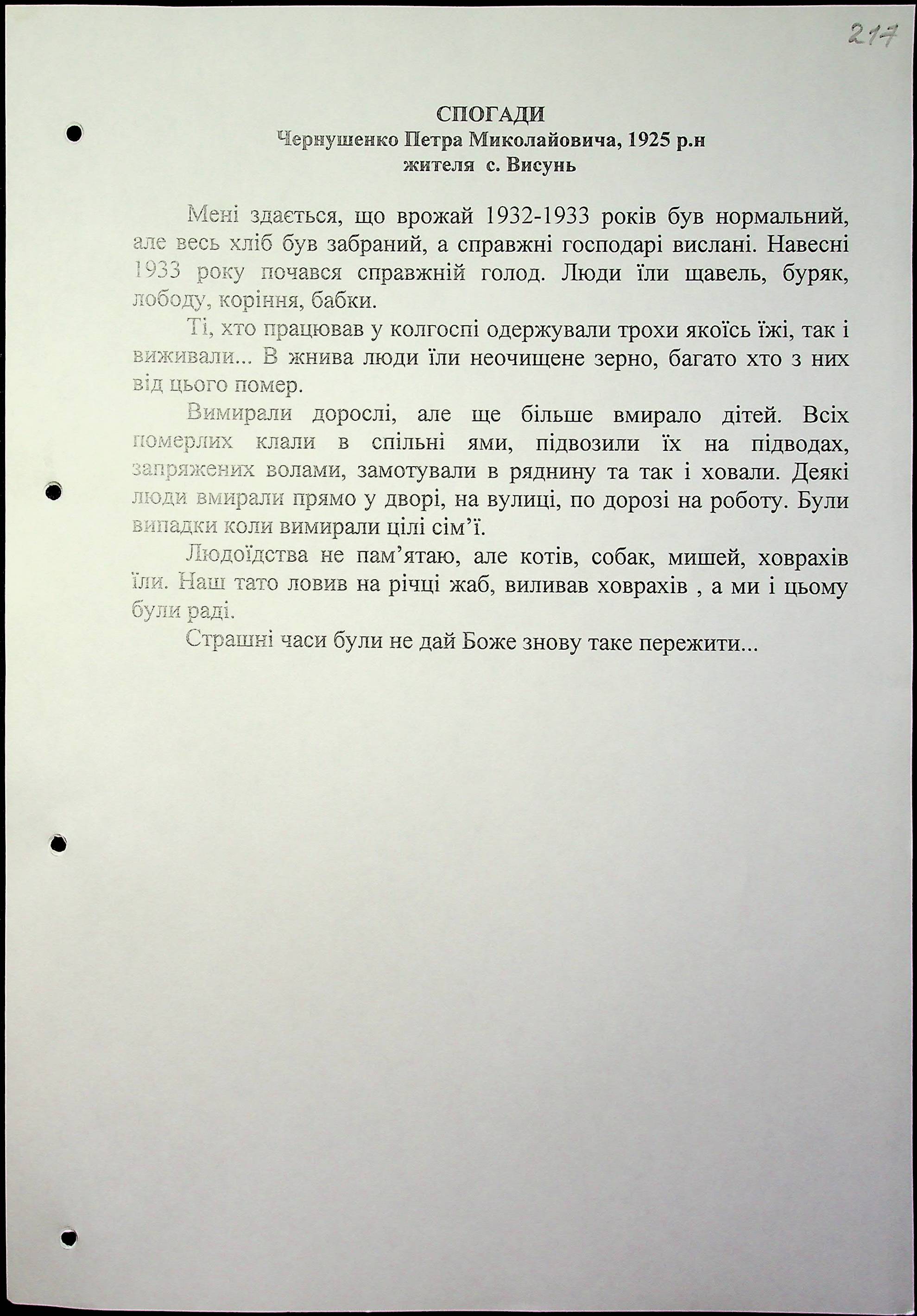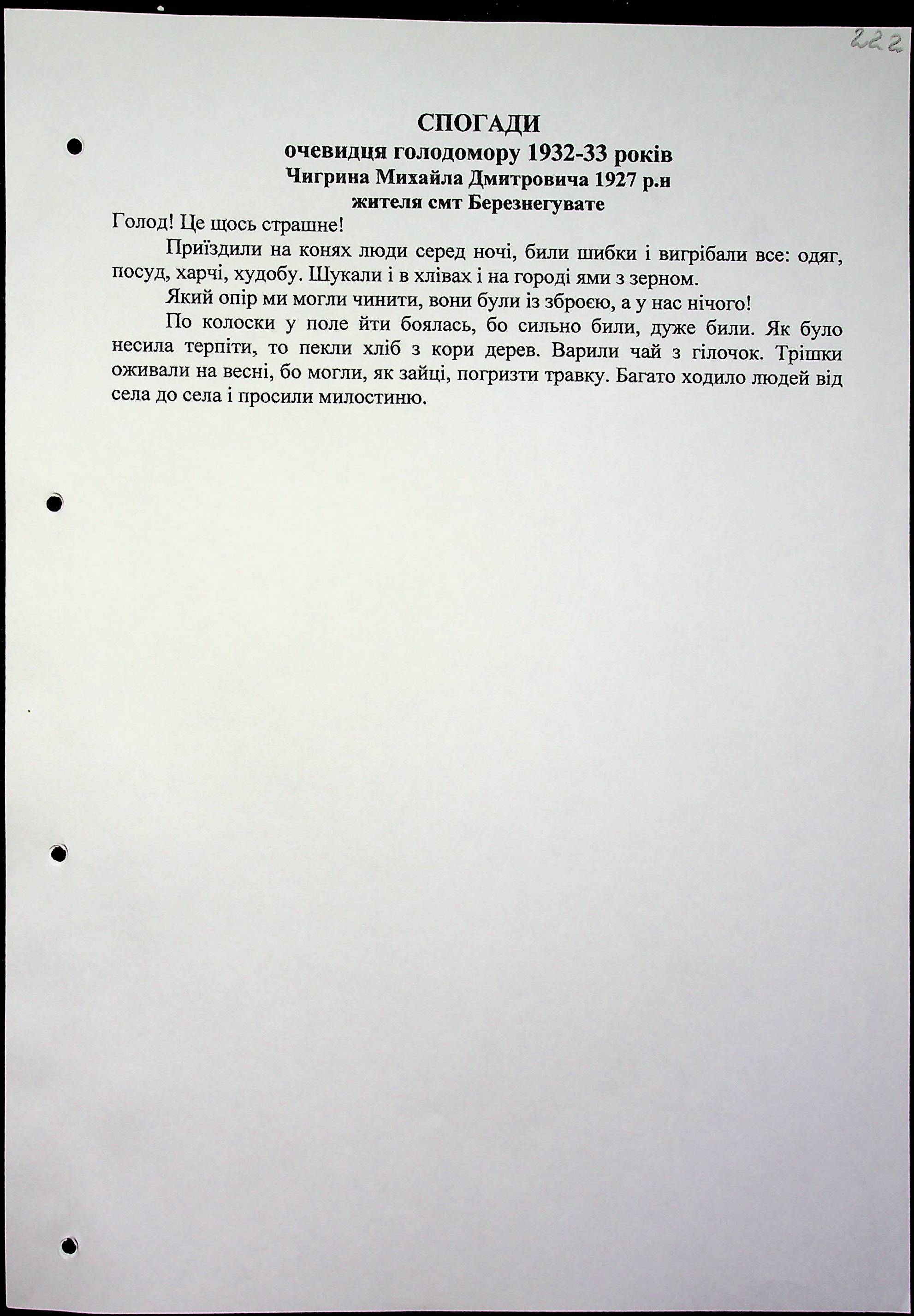 • • • • Справа № 16 “Свідчення очевидців Голодомору 1932-1933 років, які проживають у Березнегуватському районі, з прізвищами на літери С–Я”