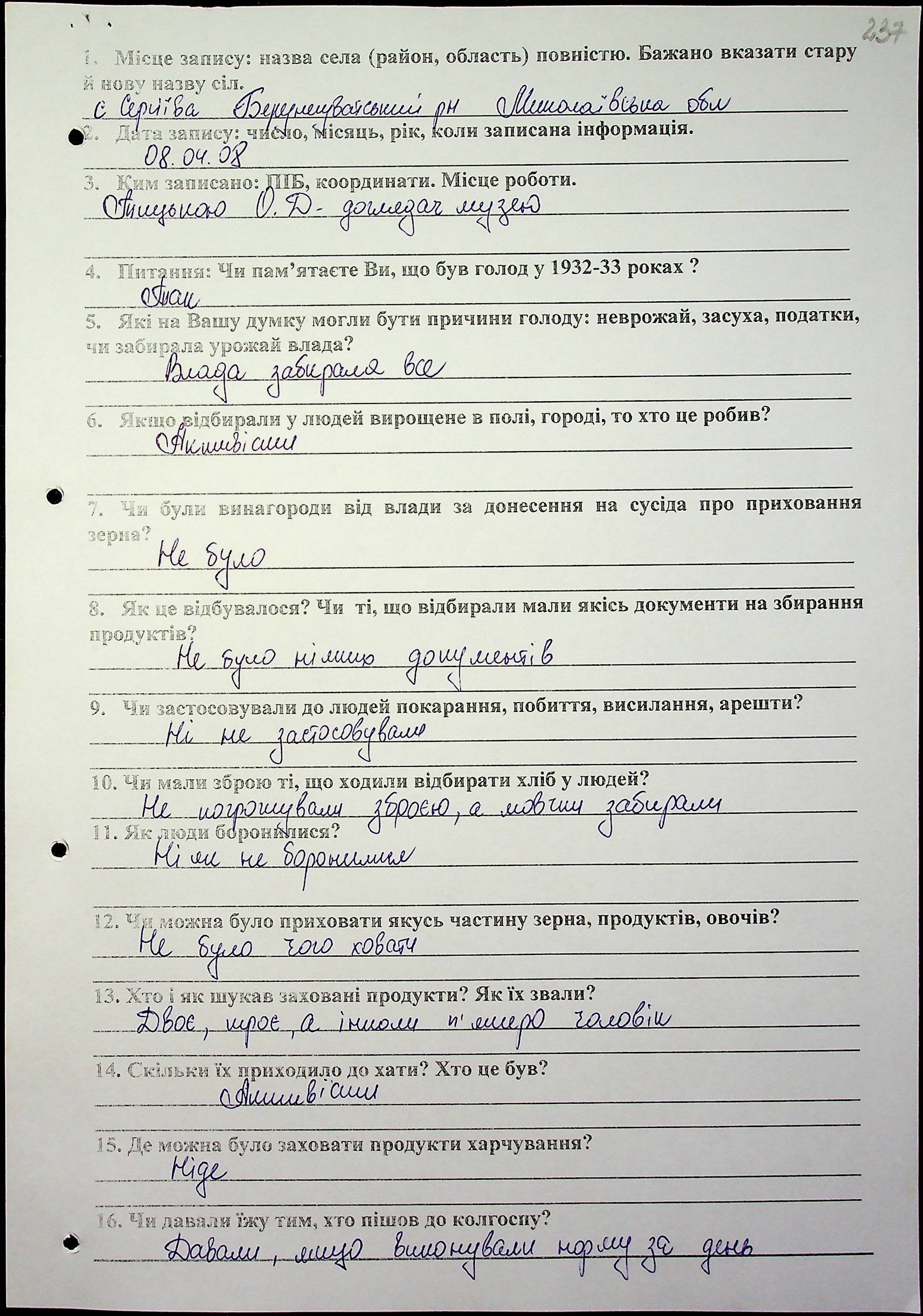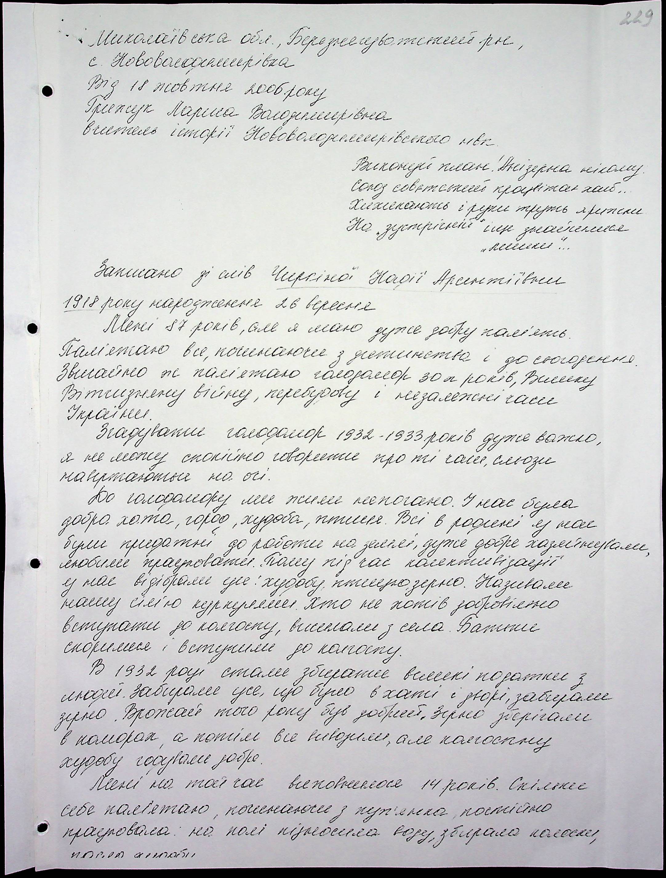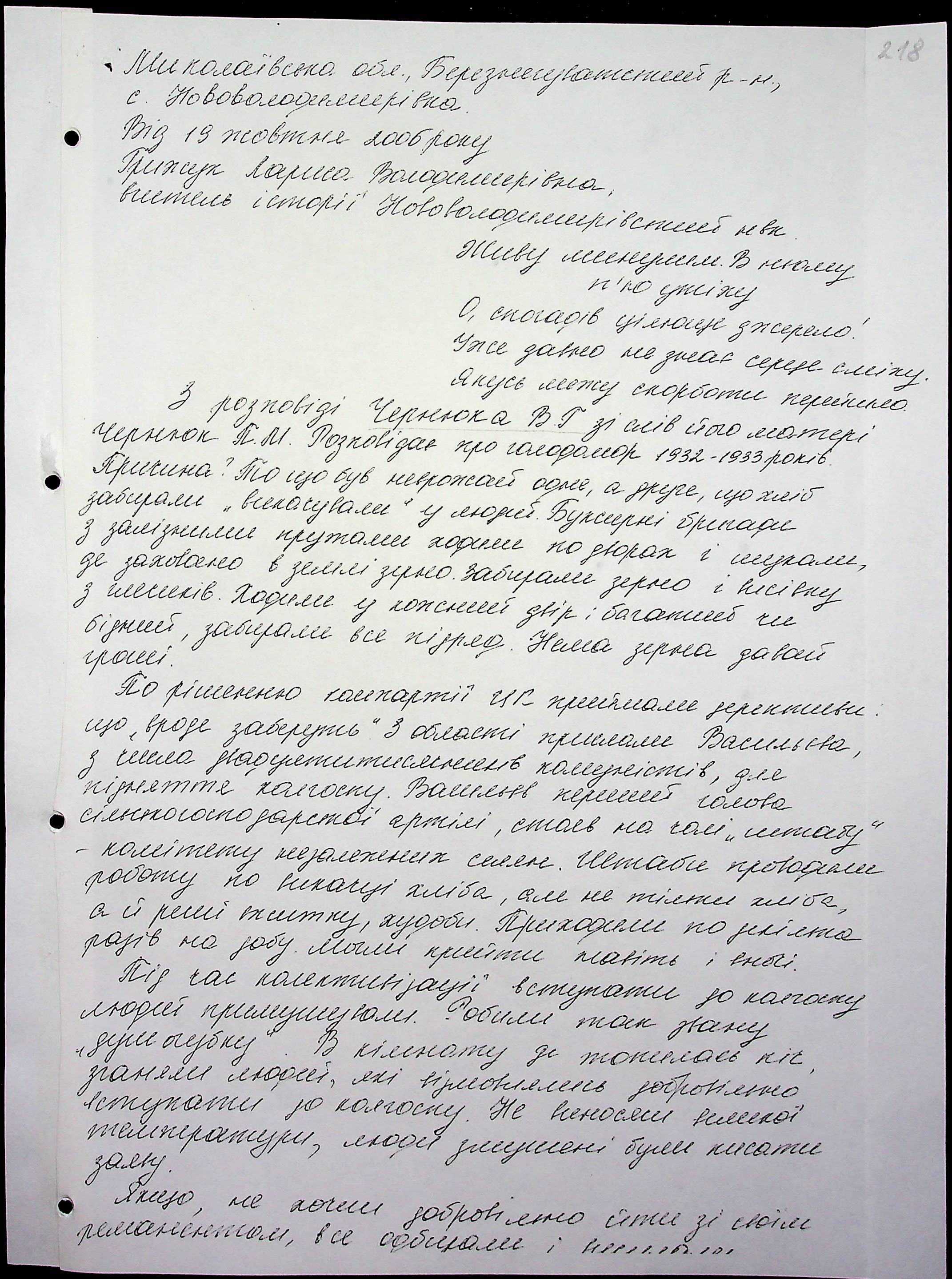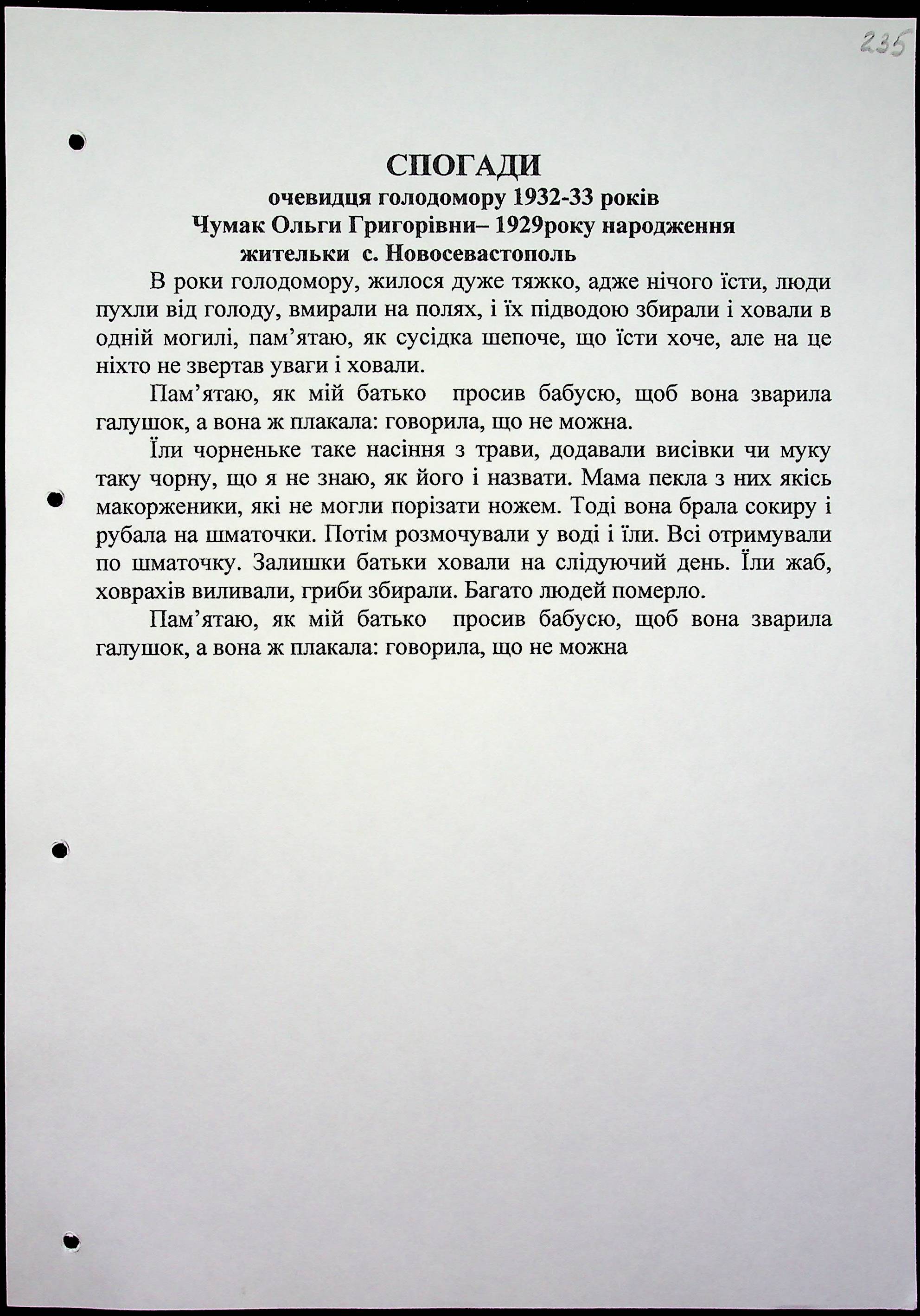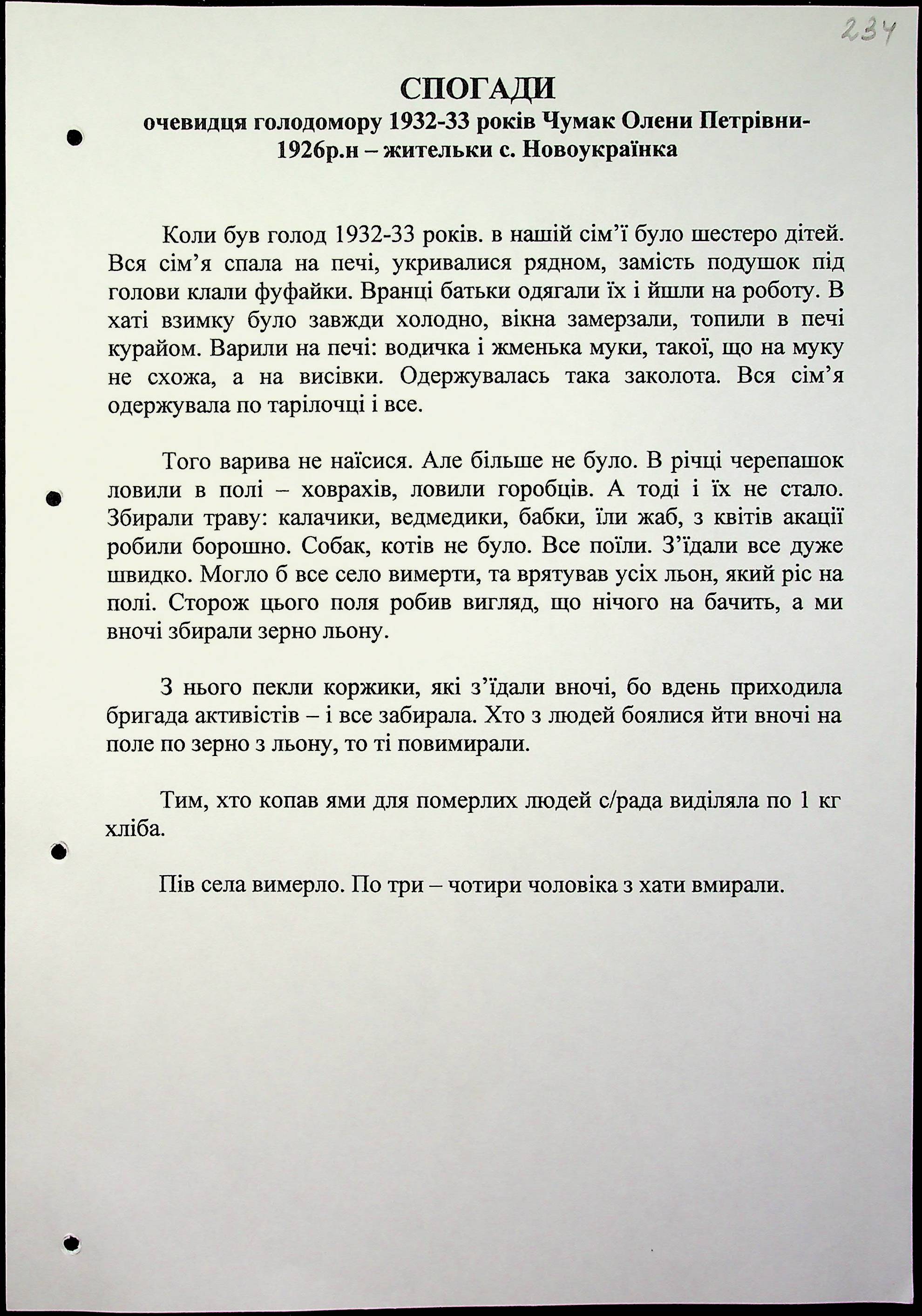 • • • • Справа № 16 “Свідчення очевидців Голодомору 1932-1933 років, які проживають у Березнегуватському районі, з прізвищами на літери С–Я”