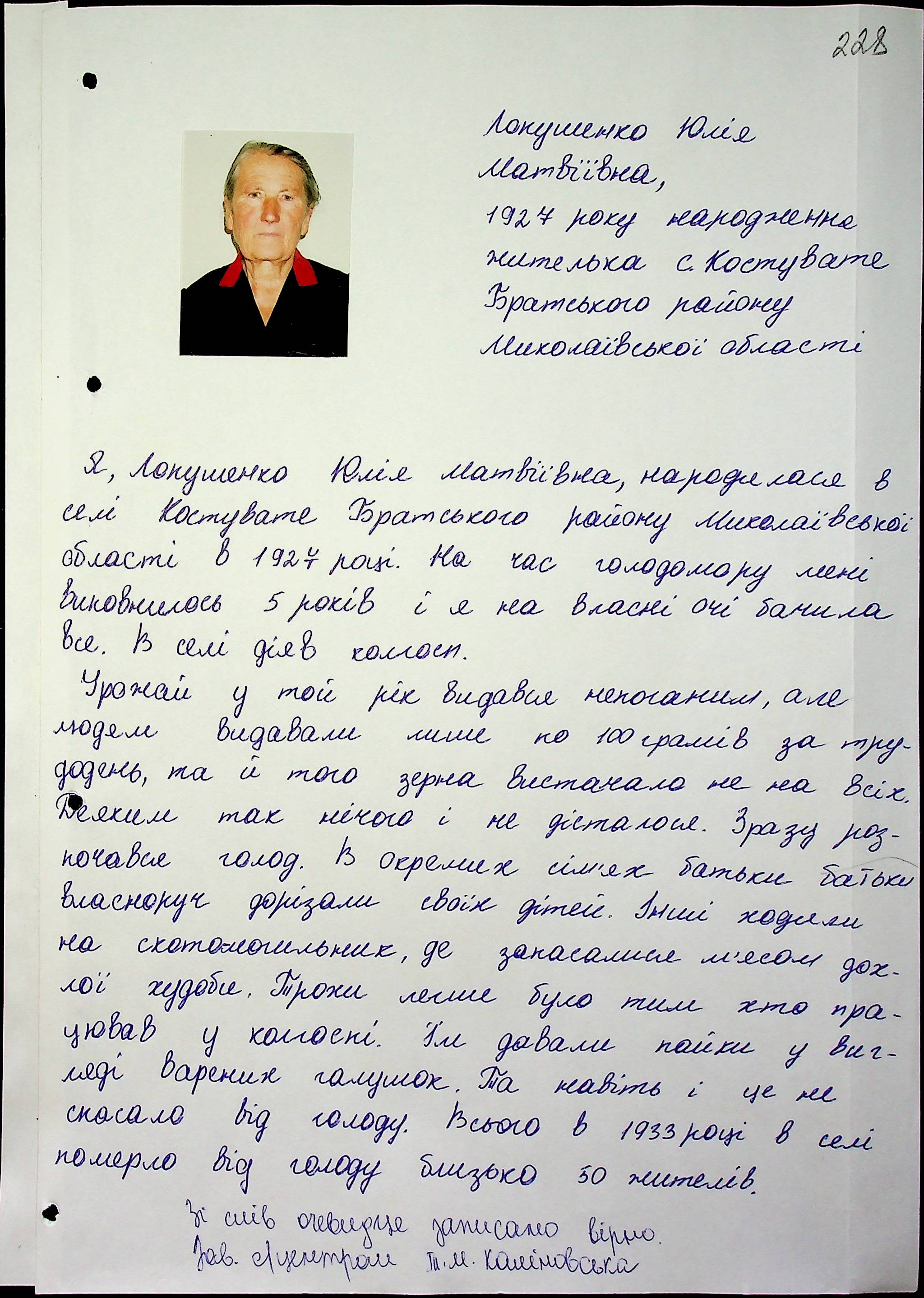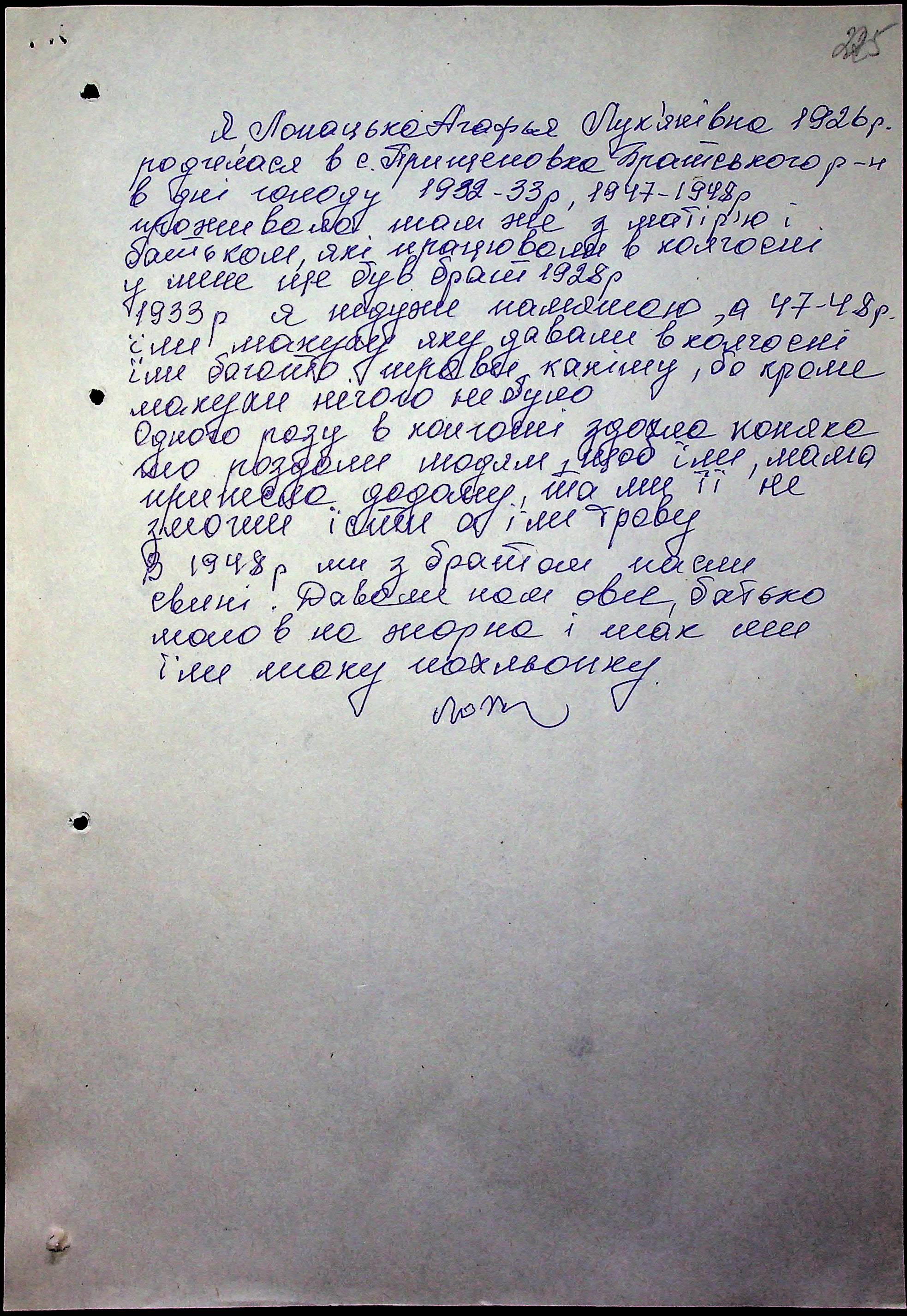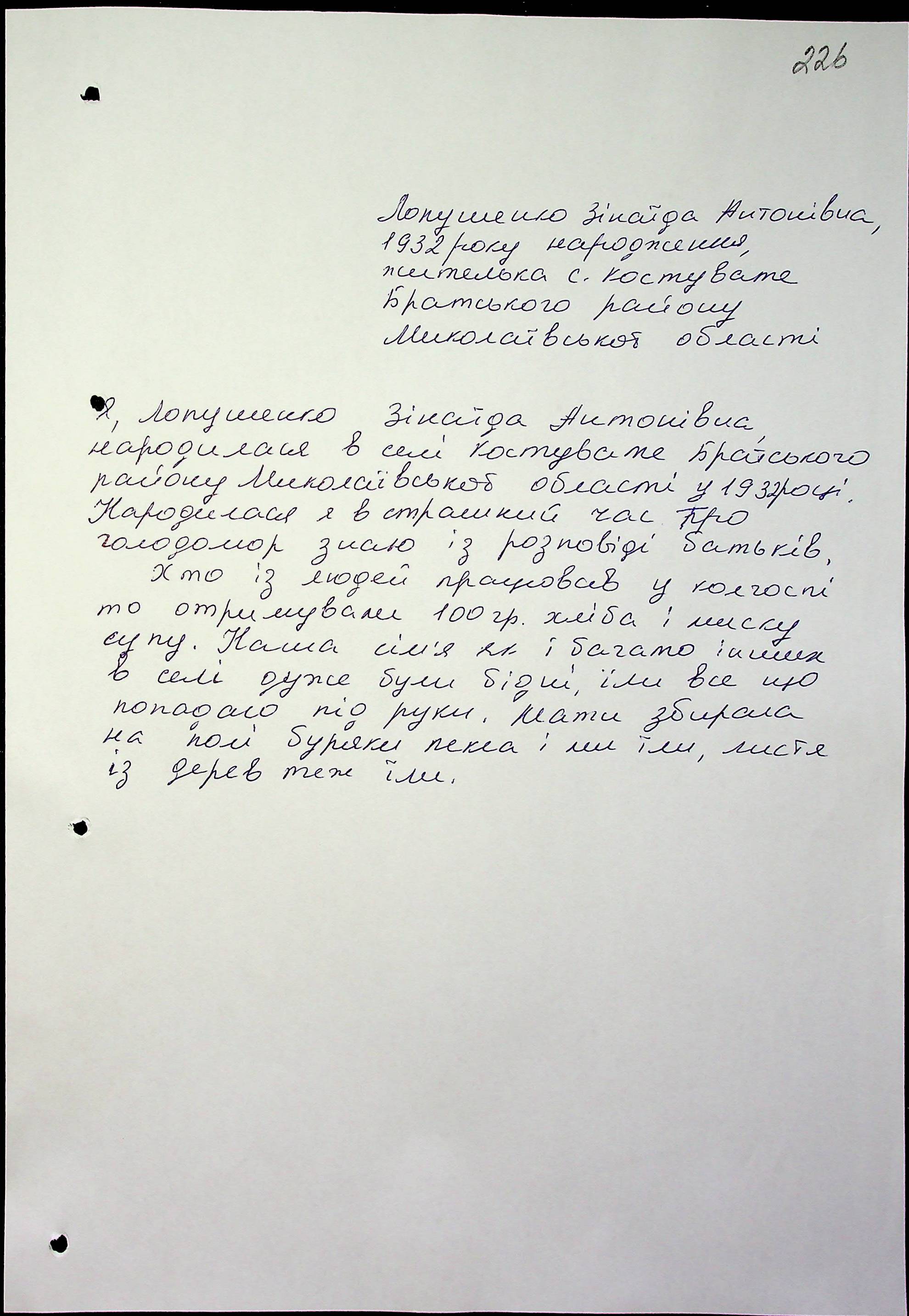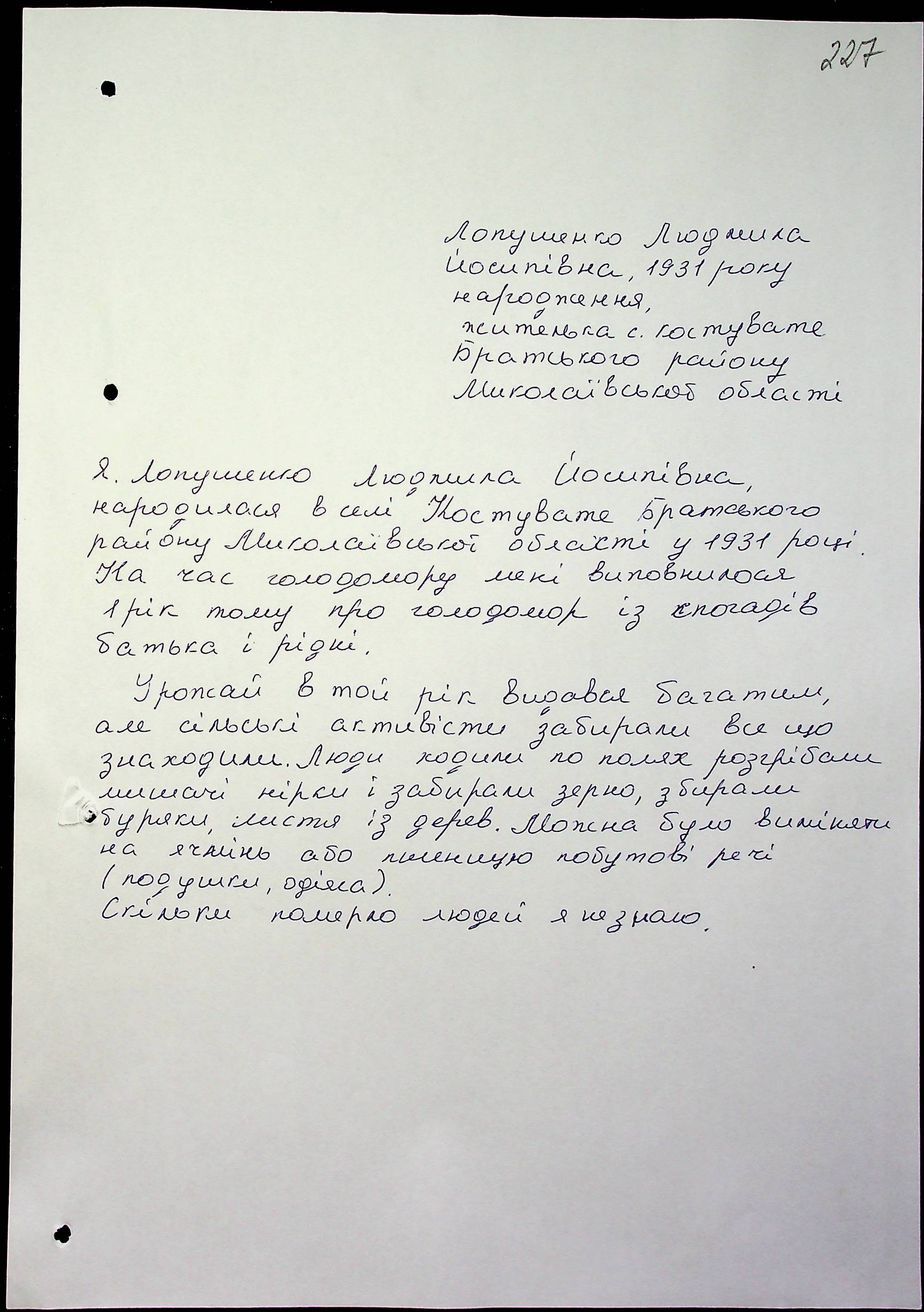 • • • • Справа № 17 “Свідчення очевидців Голодомору 1932-1933 років, які проживають у Братському районі, з прізвищами на літери А–Л”