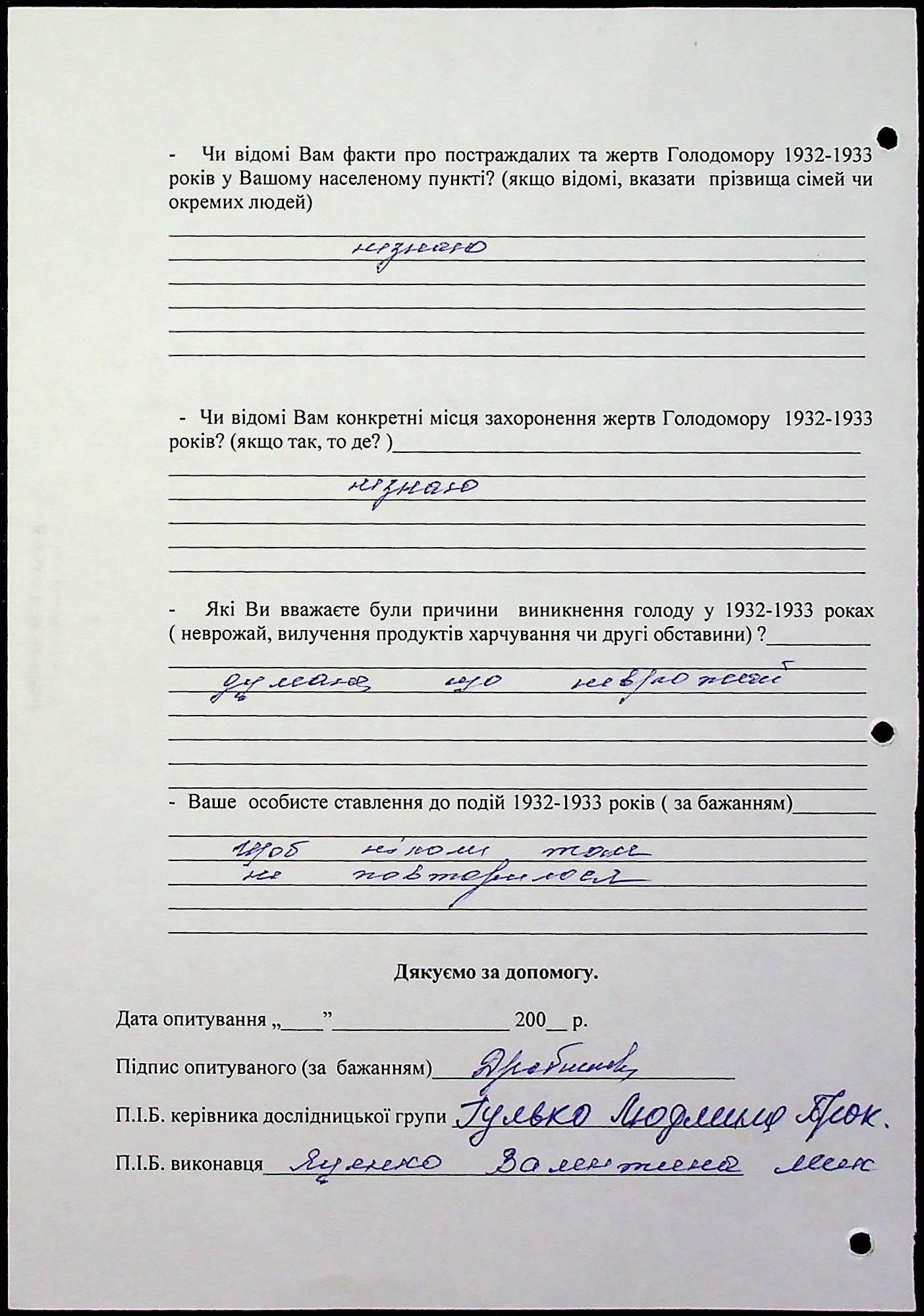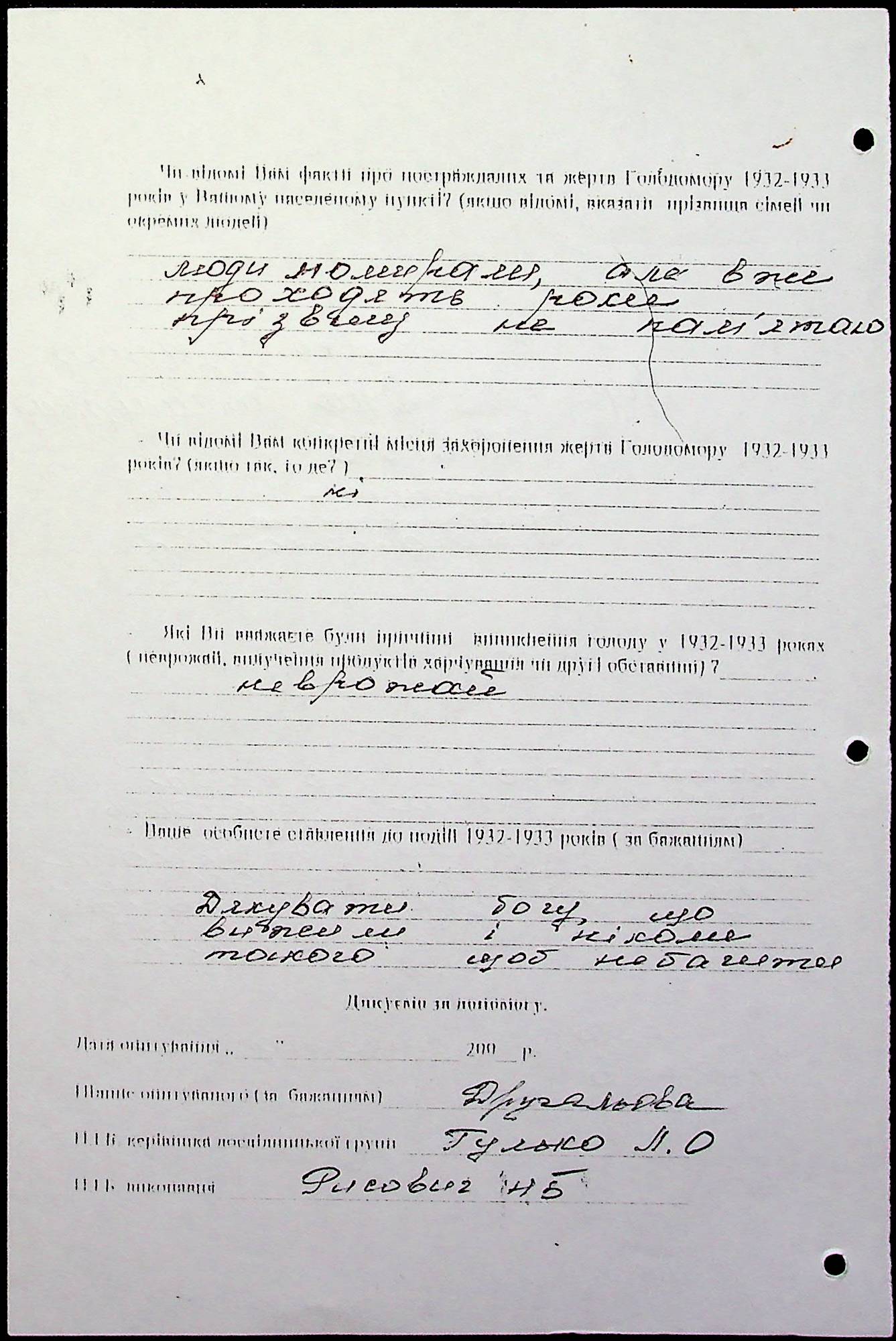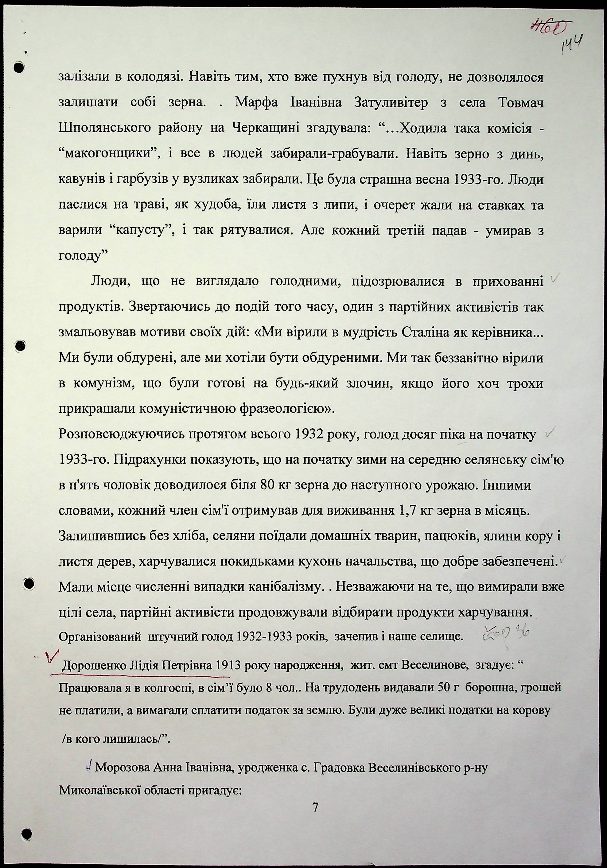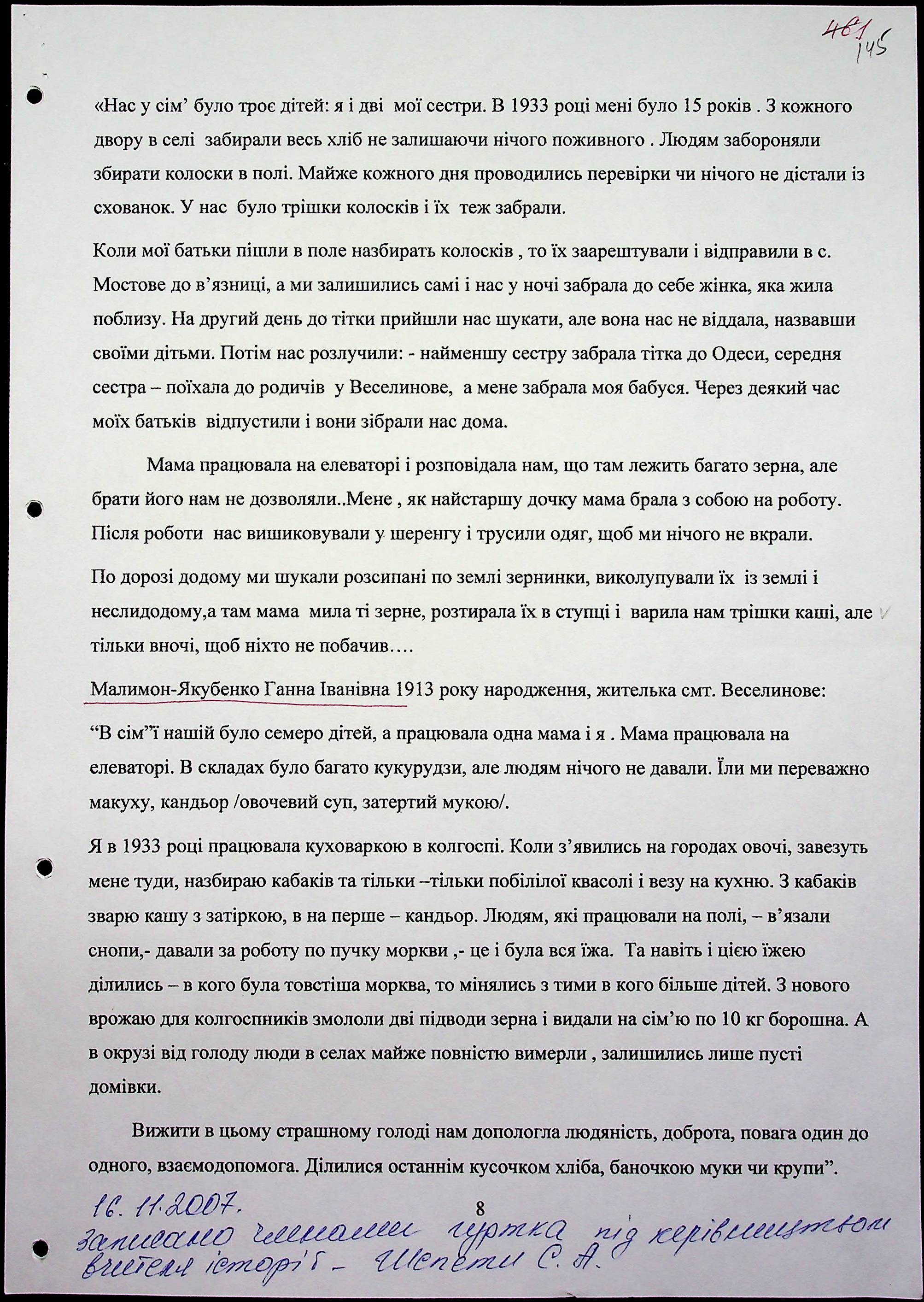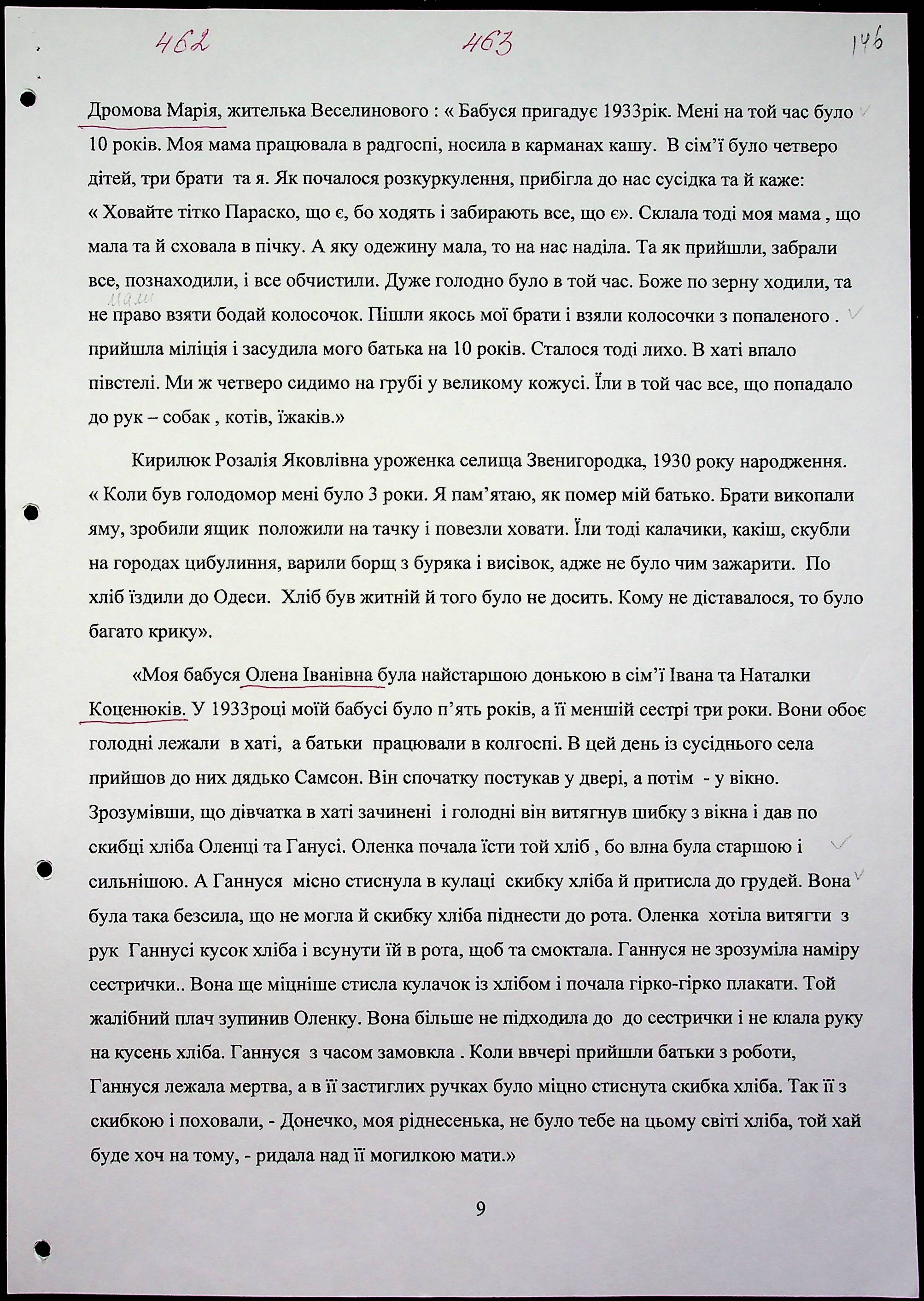 • • • • Справа № 20 “Свідчення очевидців Голодомору 1932-1933 років, які проживають у Веселинівському районі, з прізвищами на літери А–К”