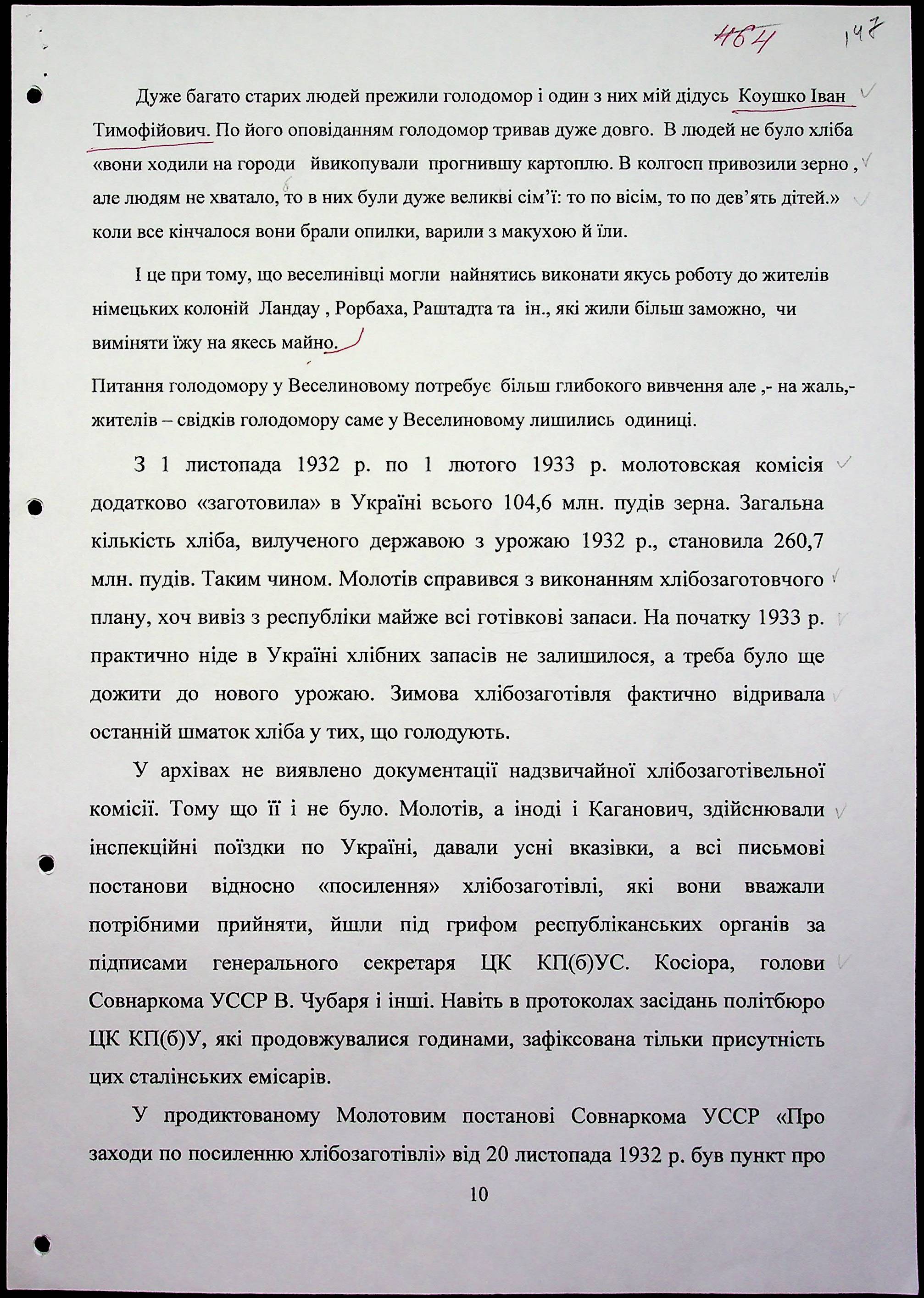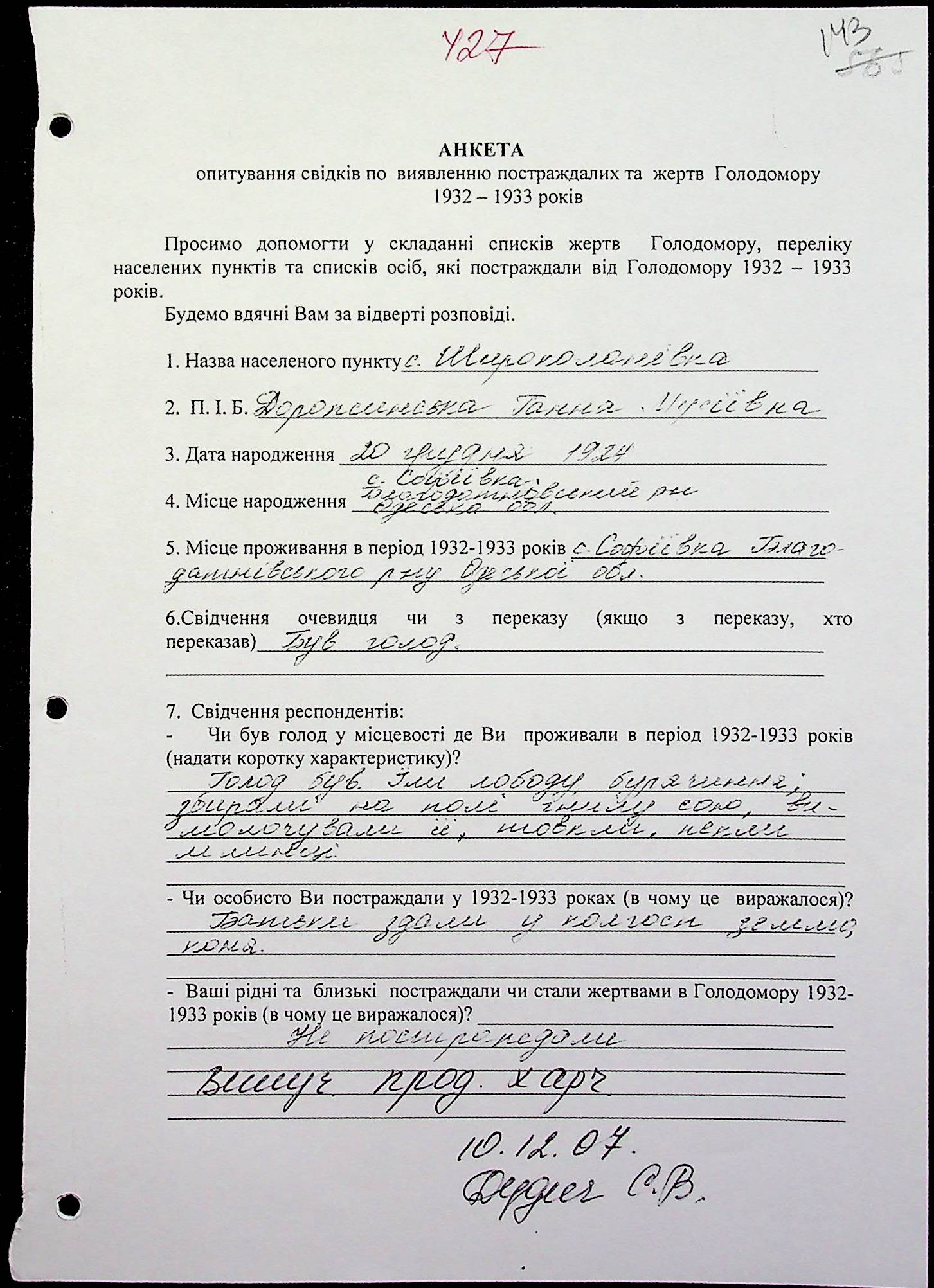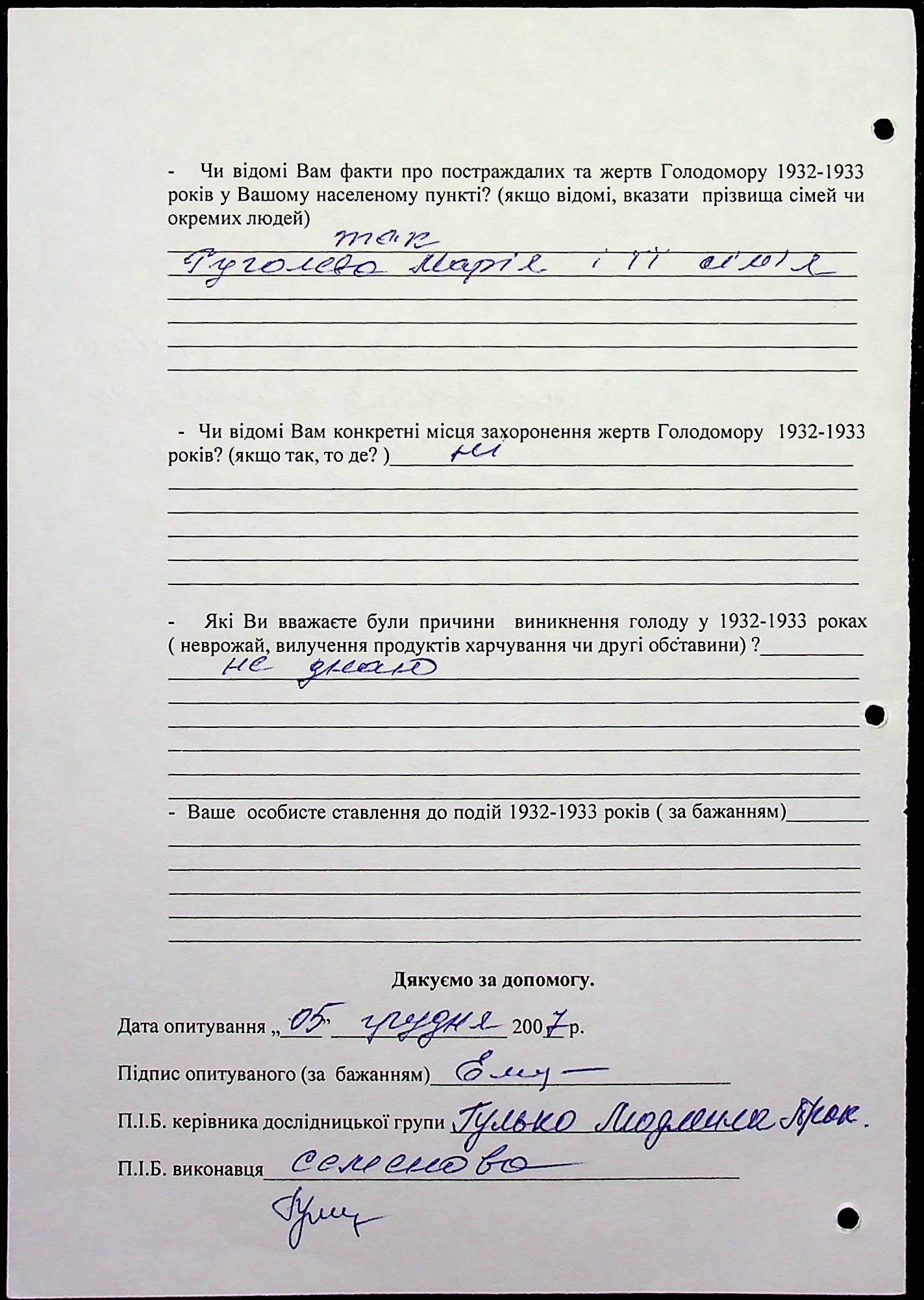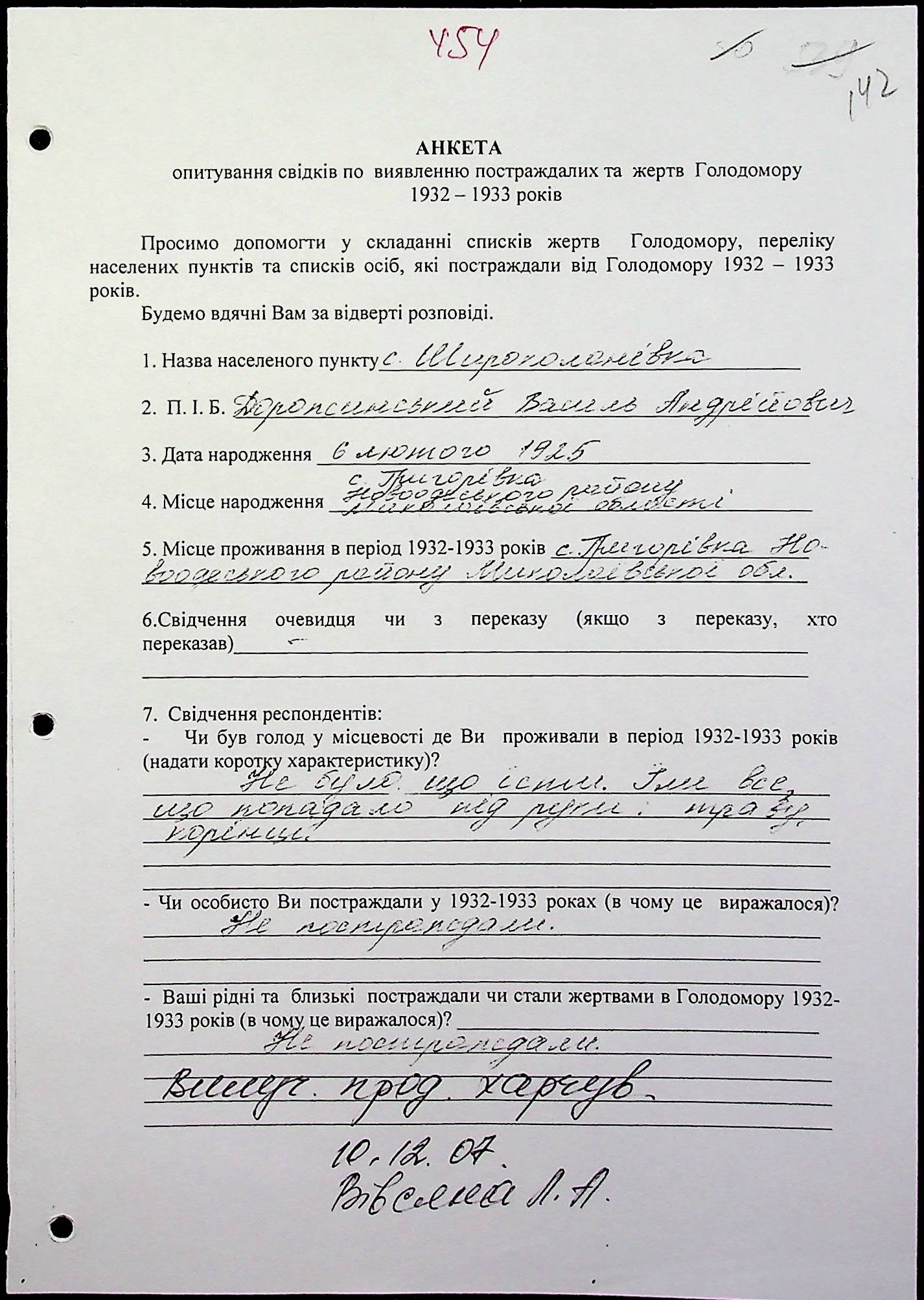• • • • Справа № 20 “Свідчення очевидців Голодомору 1932-1933 років, які проживають у Веселинівському районі, з прізвищами на літери А–К”