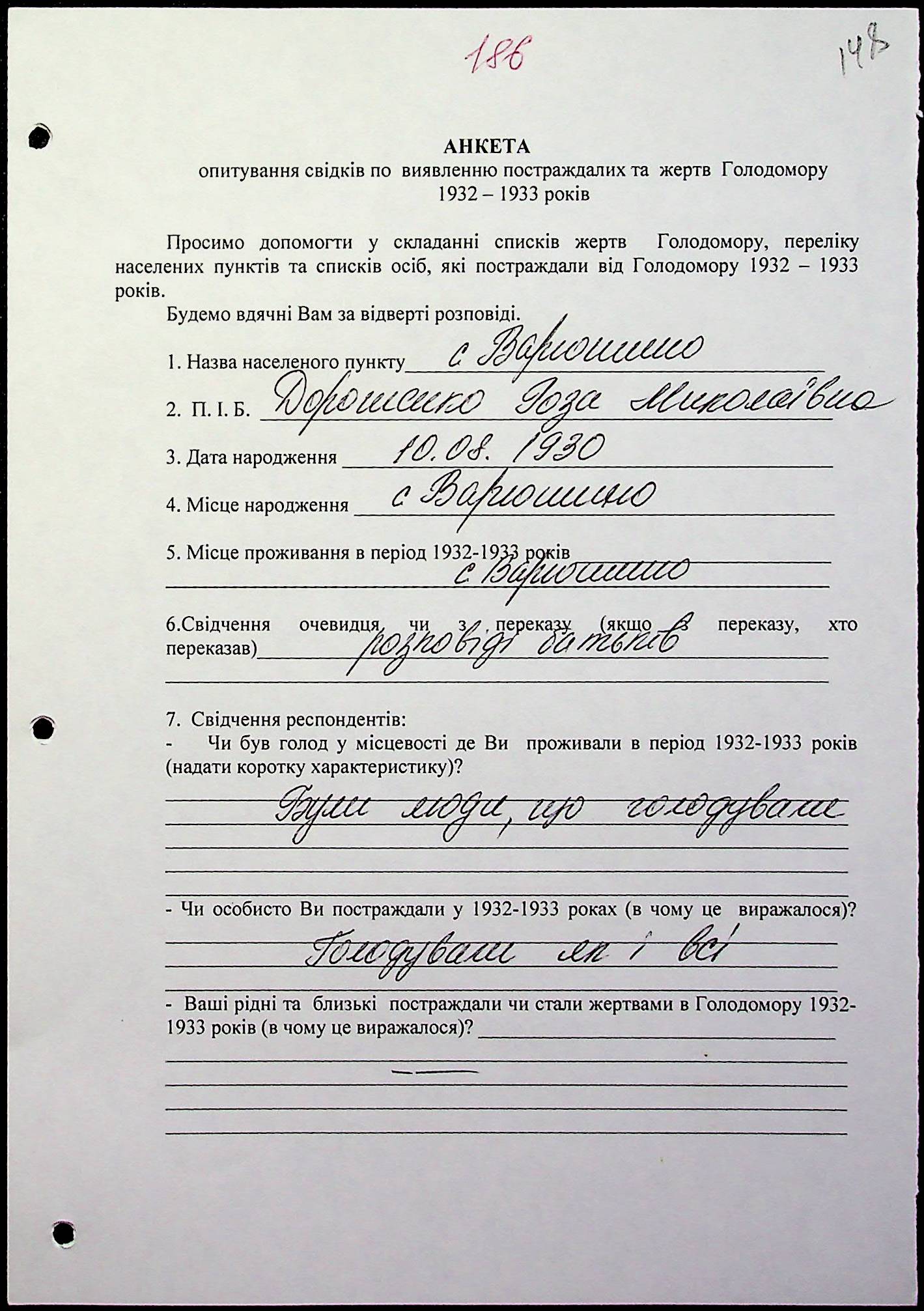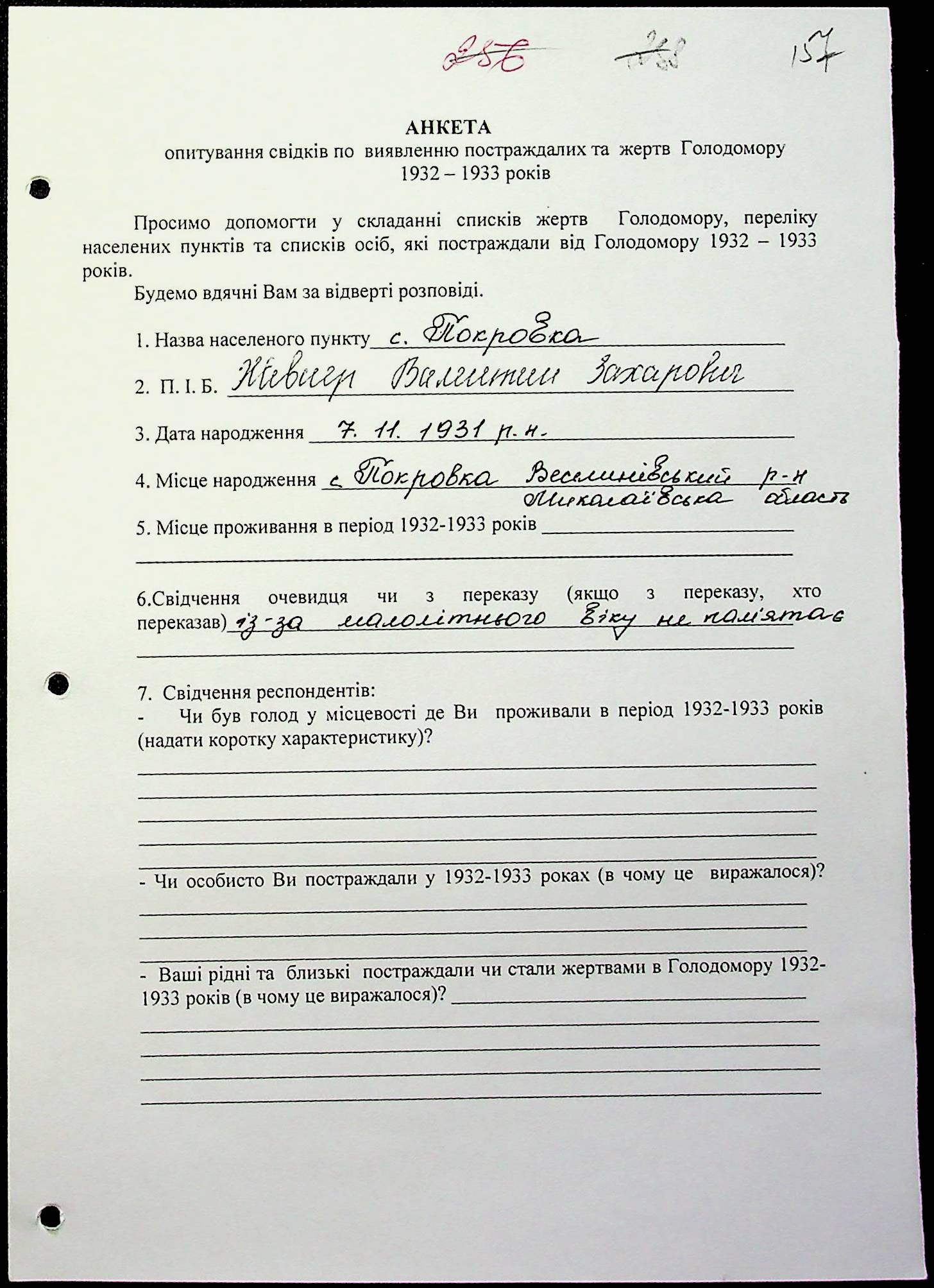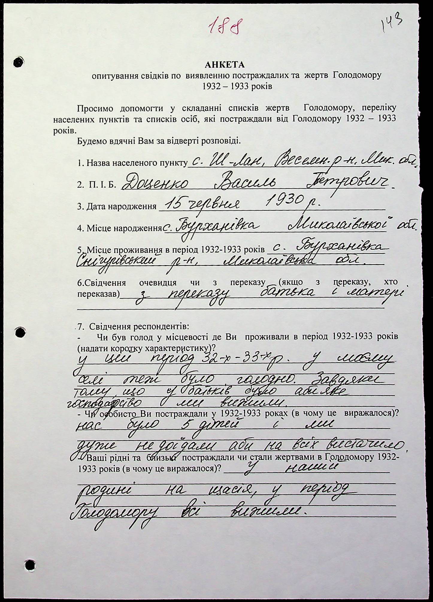 ◦ ◦ Фонд № 6146 “Колекція свідчень очевидців Голодомору 1932-1933 рр., нині проживаючих у Миколаївській області”