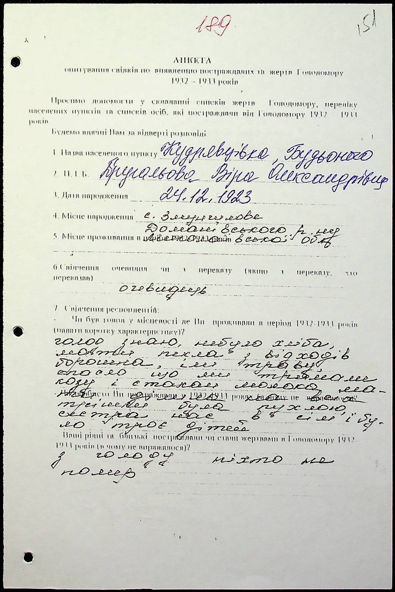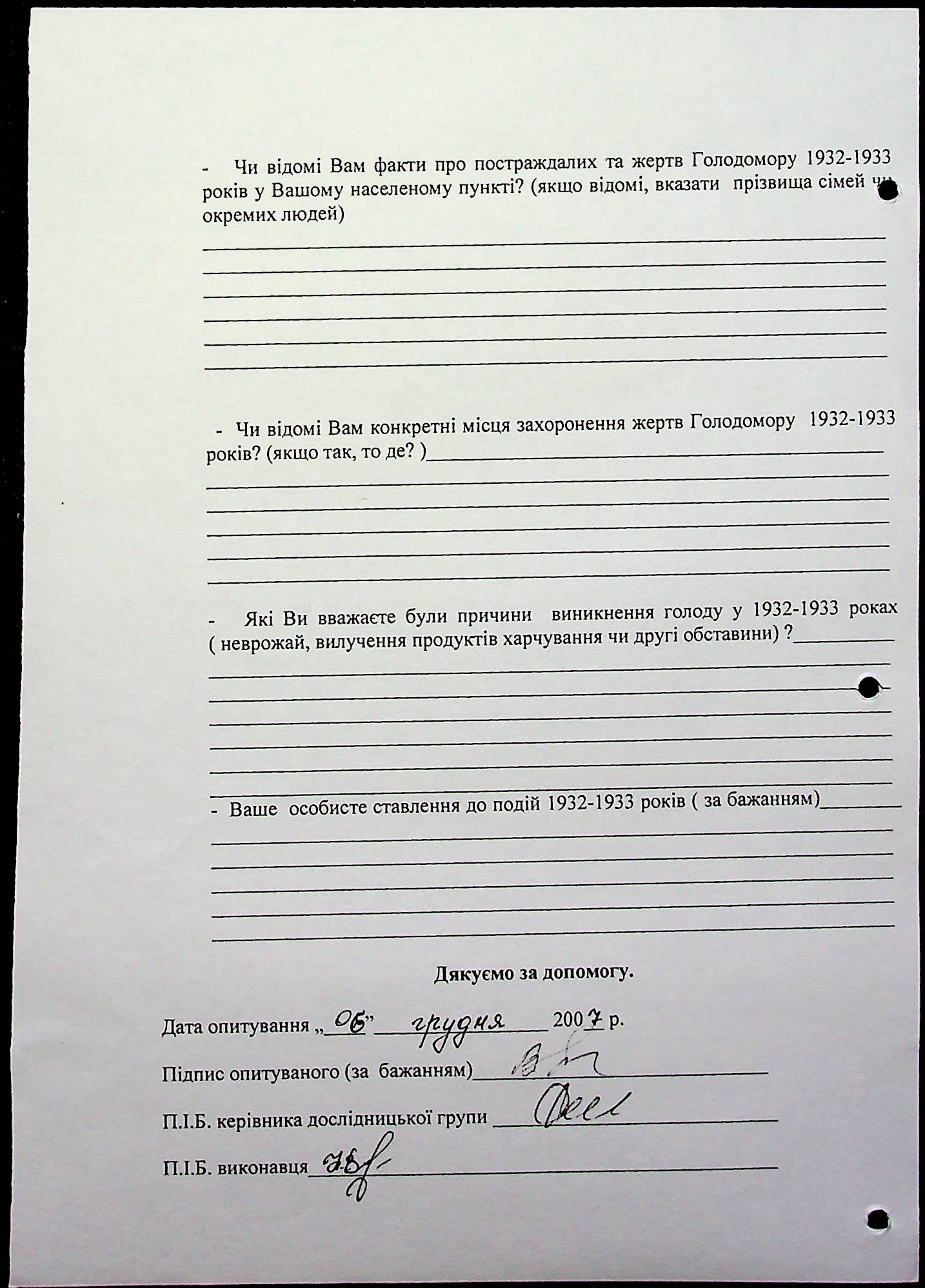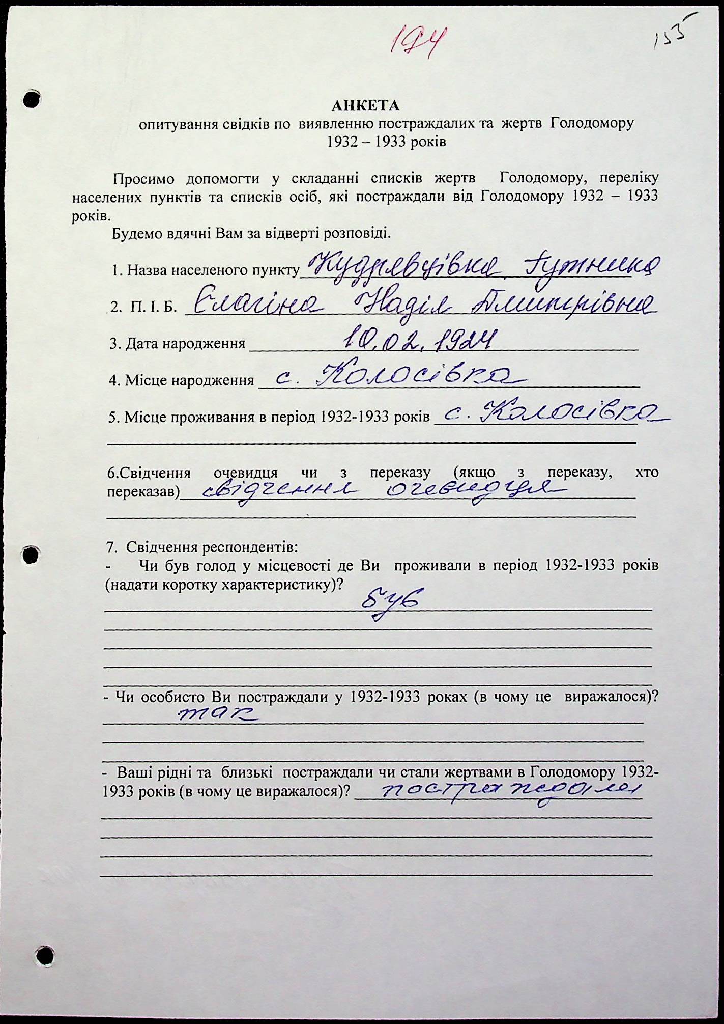 ◦ ◦ Фонд № 6146 “Колекція свідчень очевидців Голодомору 1932-1933 рр., нині проживаючих у Миколаївській області”