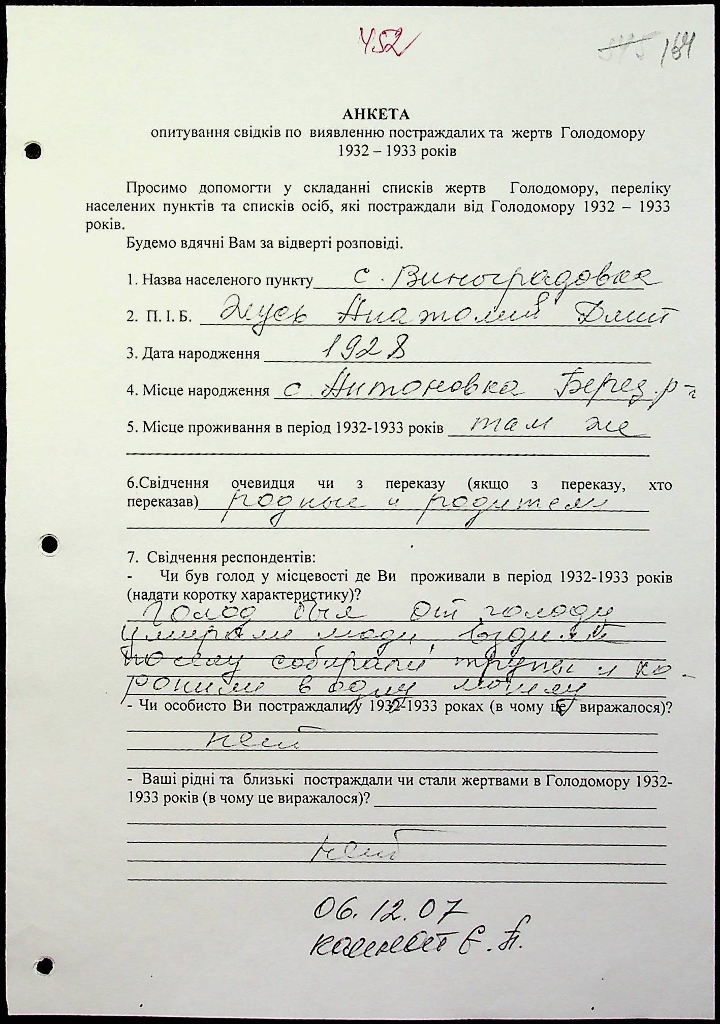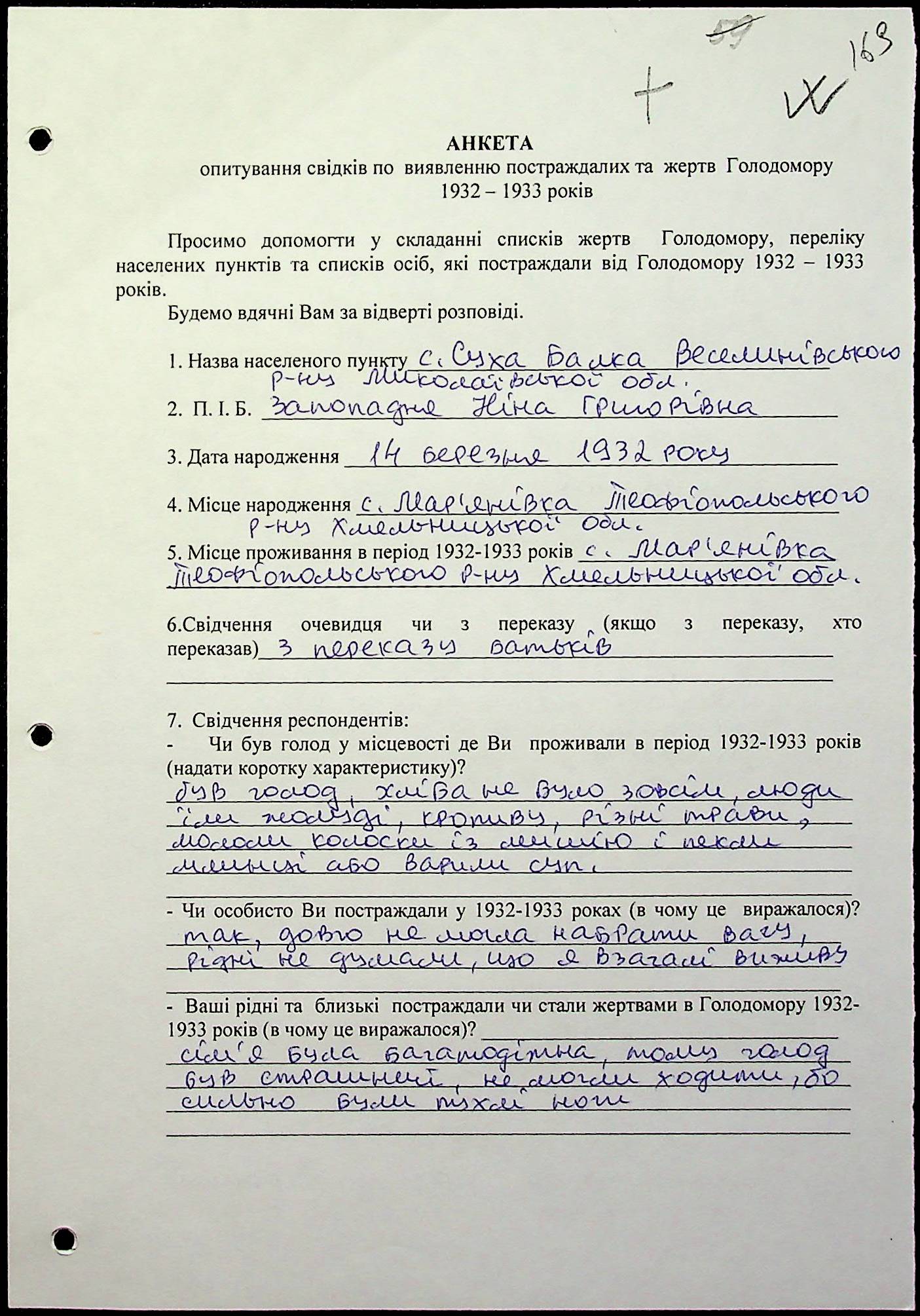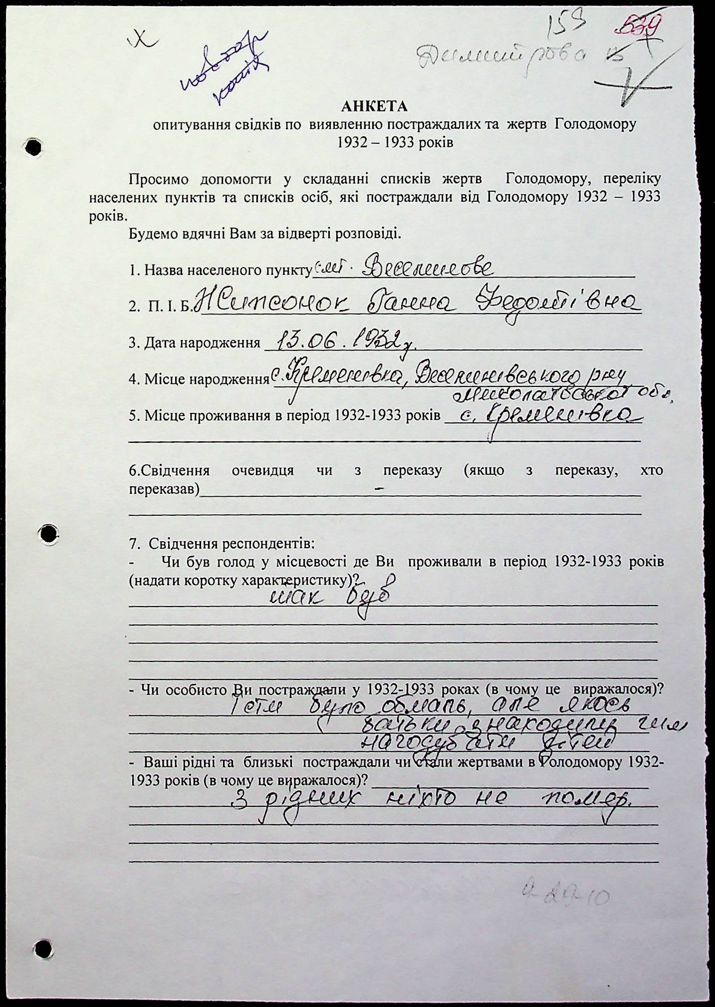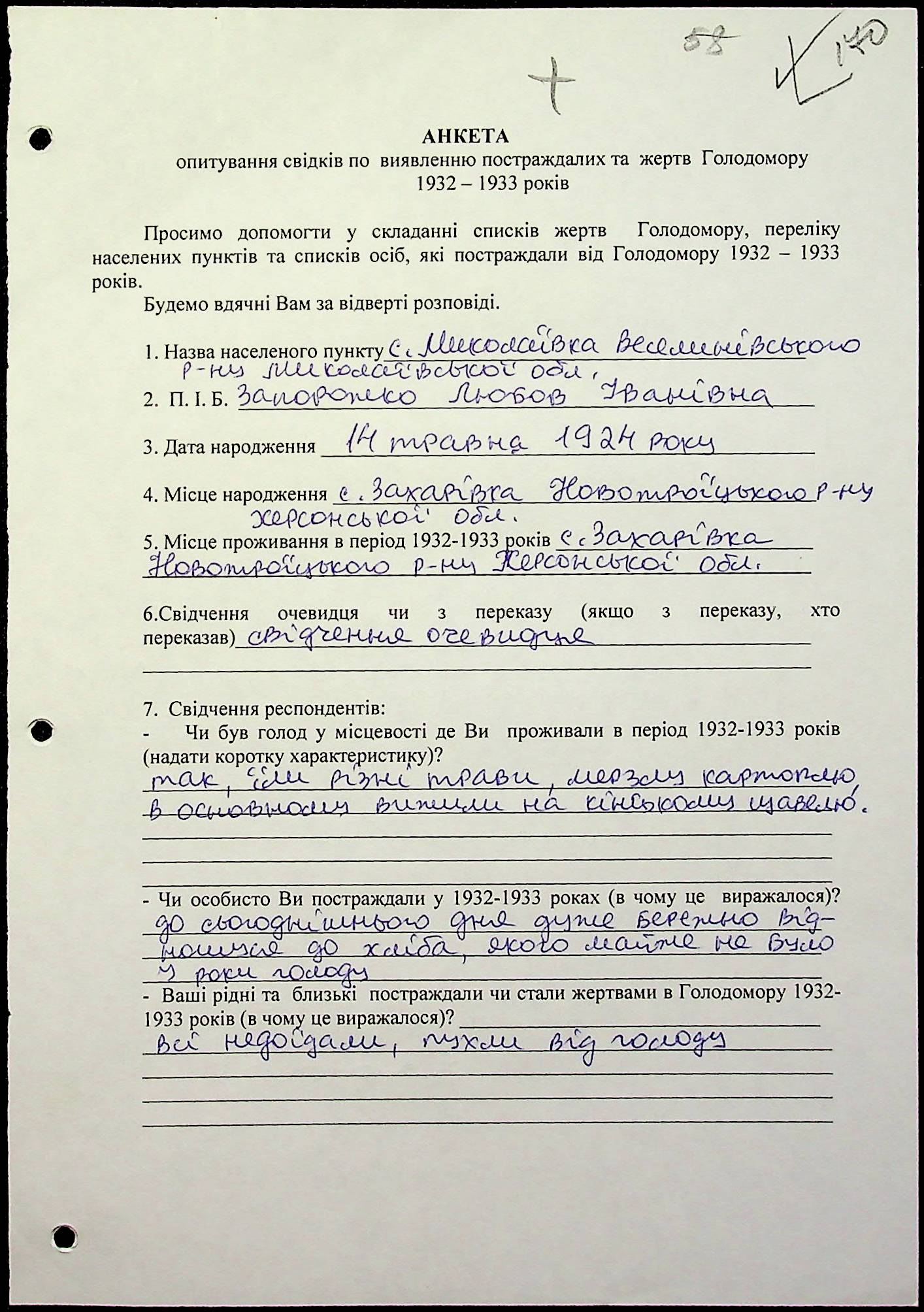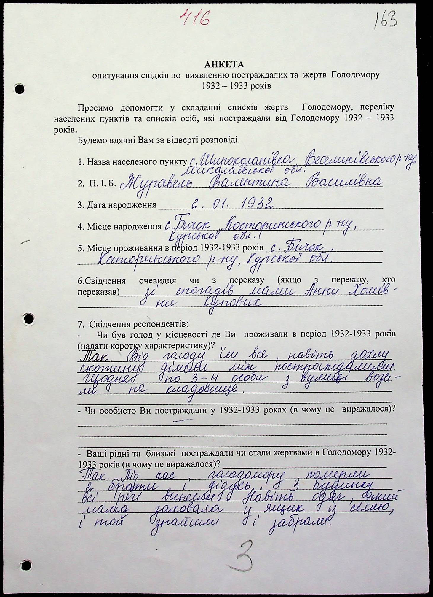 ◦ ◦ Фонд № 6146 “Колекція свідчень очевидців Голодомору 1932-1933 рр., нині проживаючих у Миколаївській області”