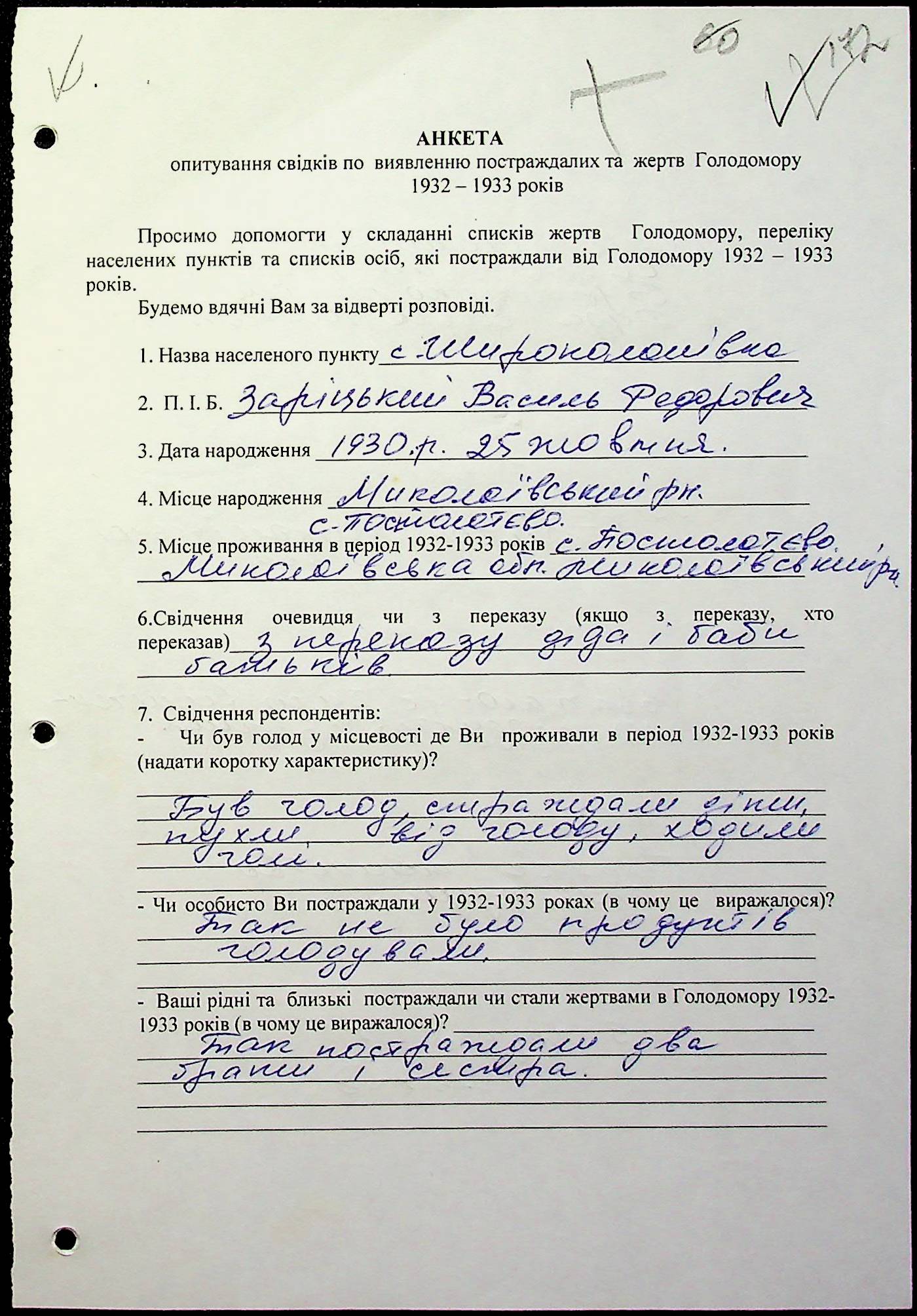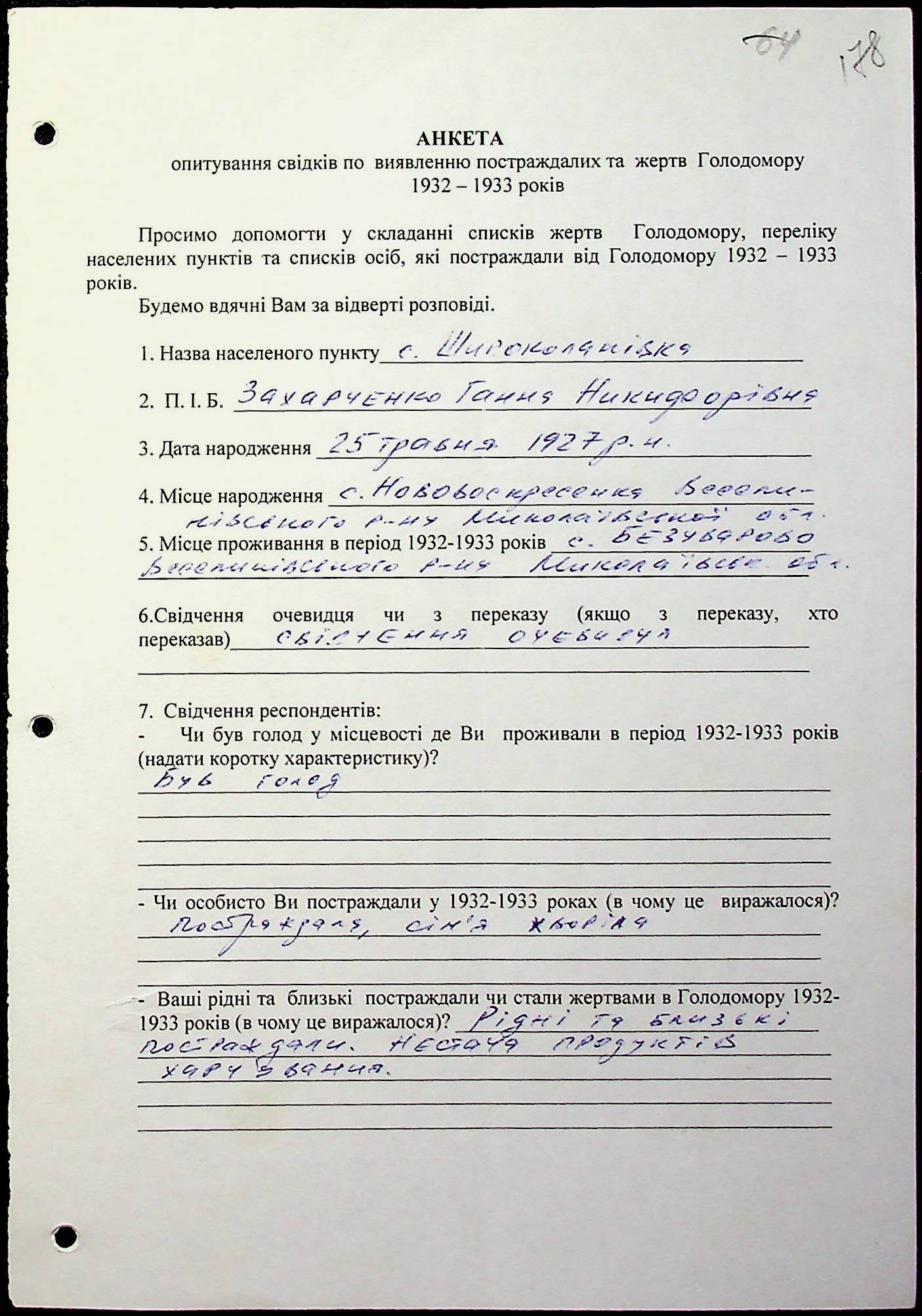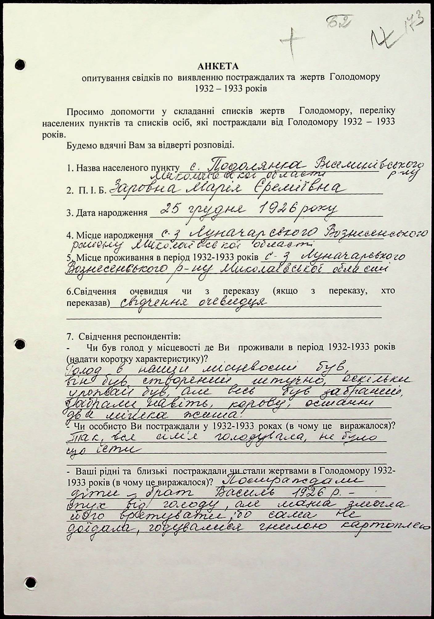 ◦ ◦ Фонд № 6146 “Колекція свідчень очевидців Голодомору 1932-1933 рр., нині проживаючих у Миколаївській області”
