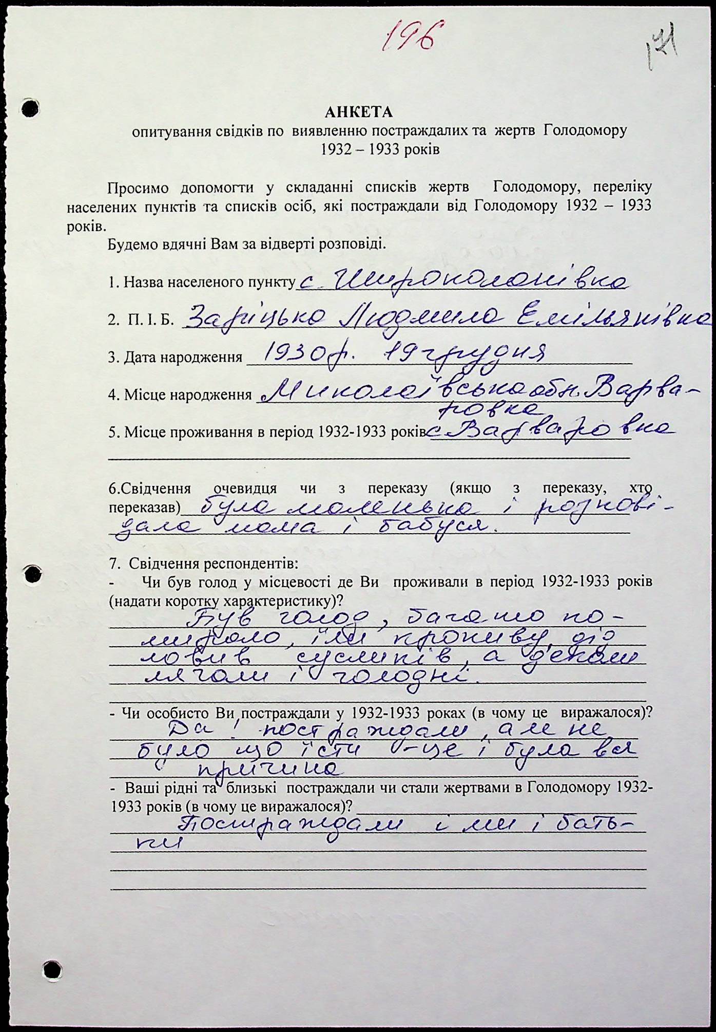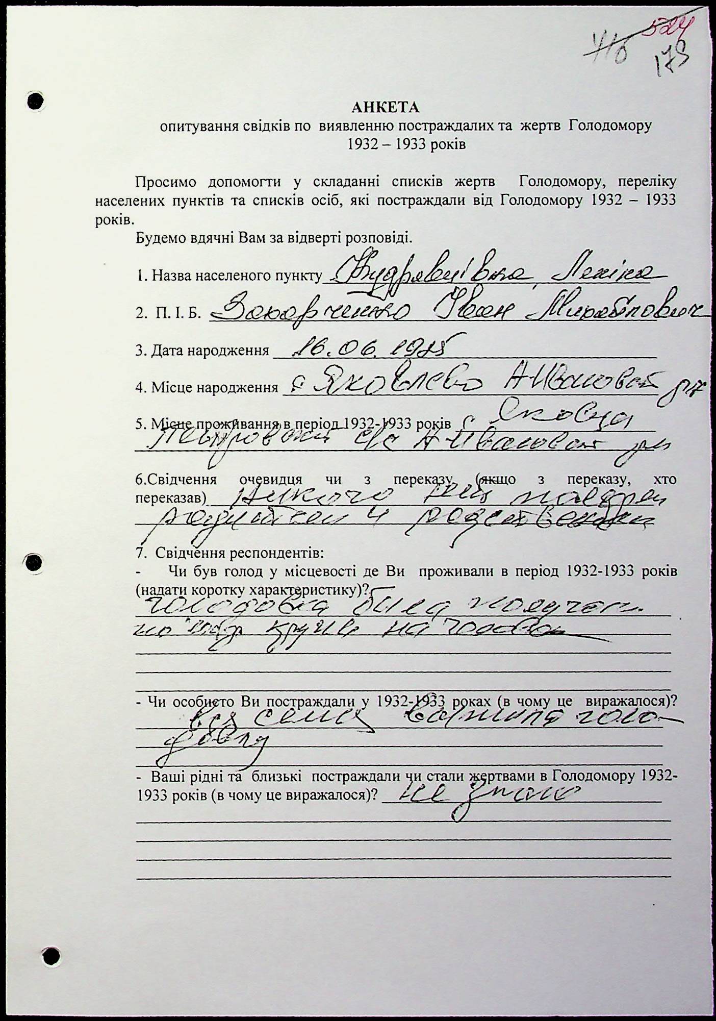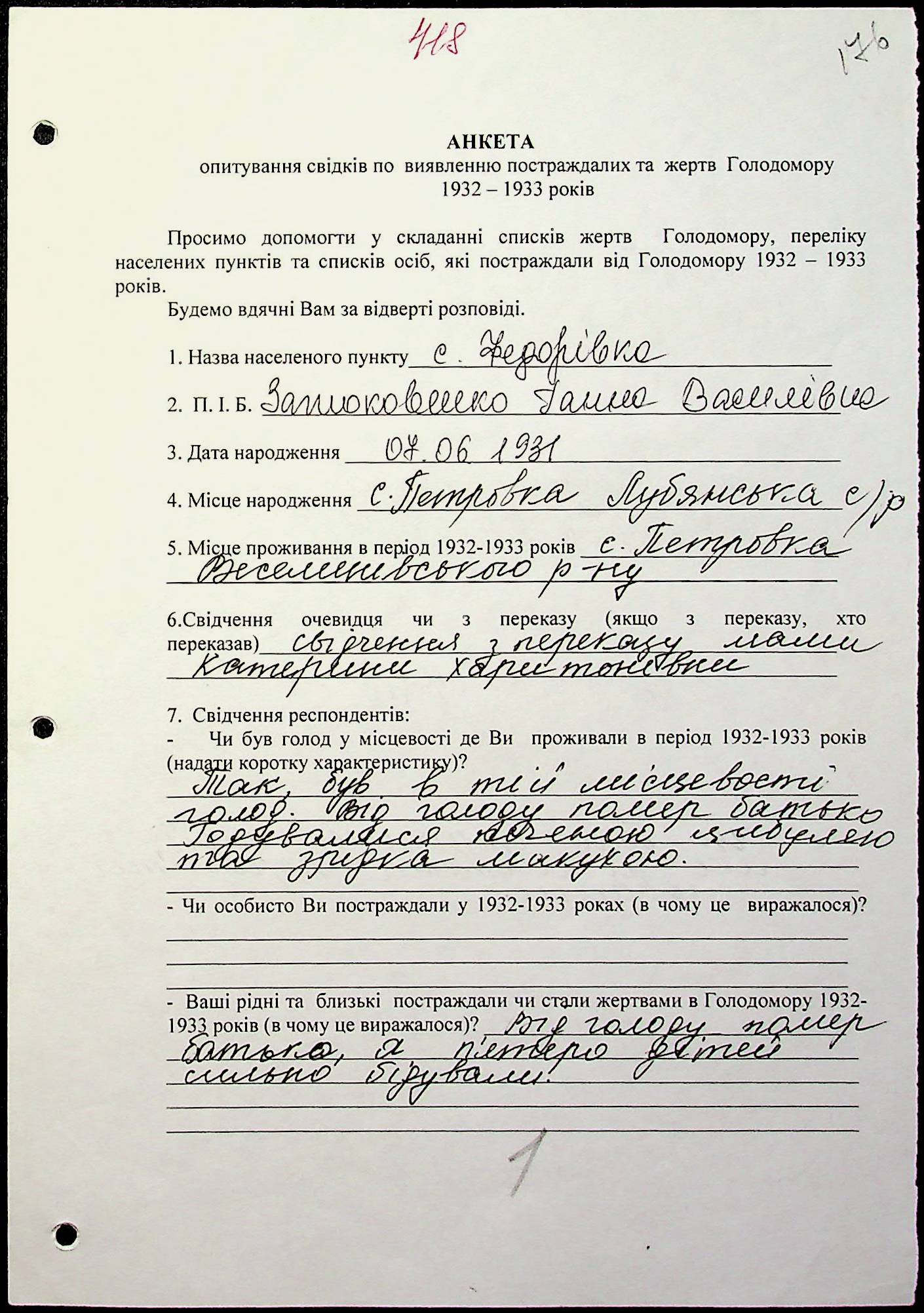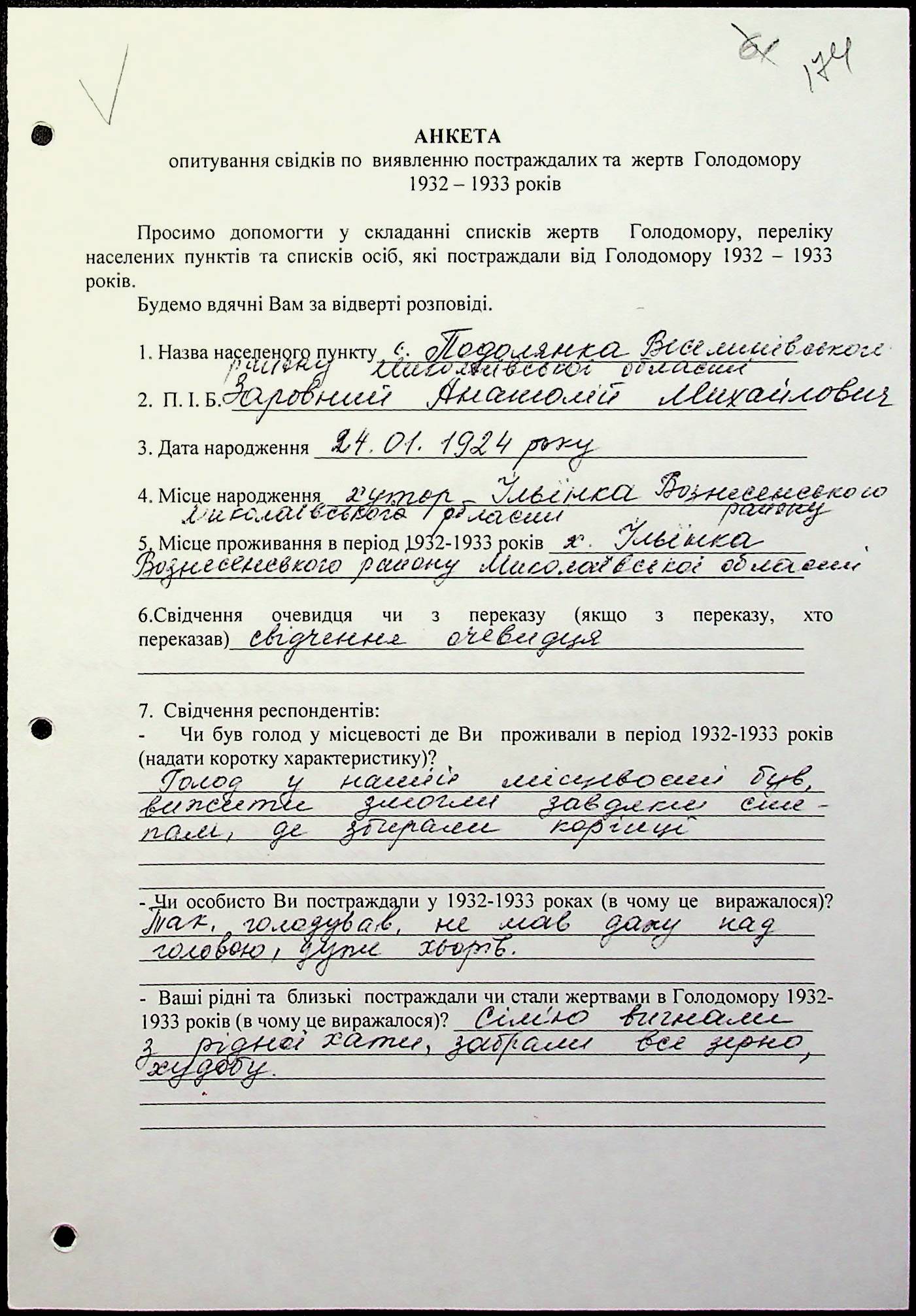 ◦ ◦ Фонд № 6146 “Колекція свідчень очевидців Голодомору 1932-1933 рр., нині проживаючих у Миколаївській області”