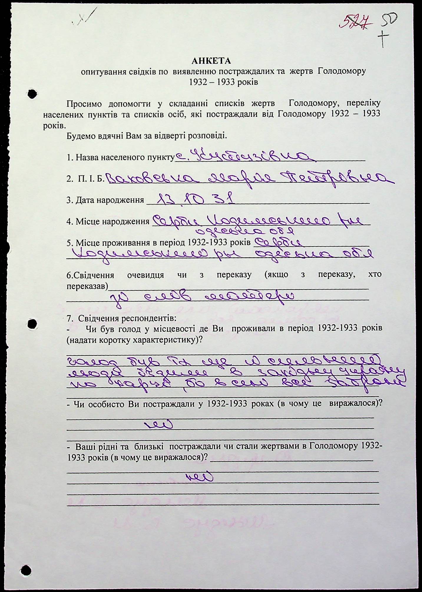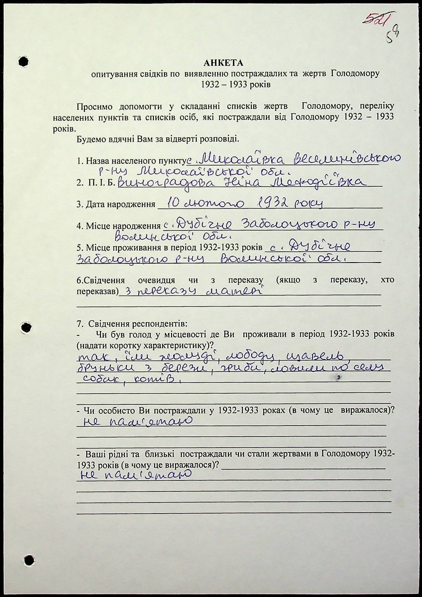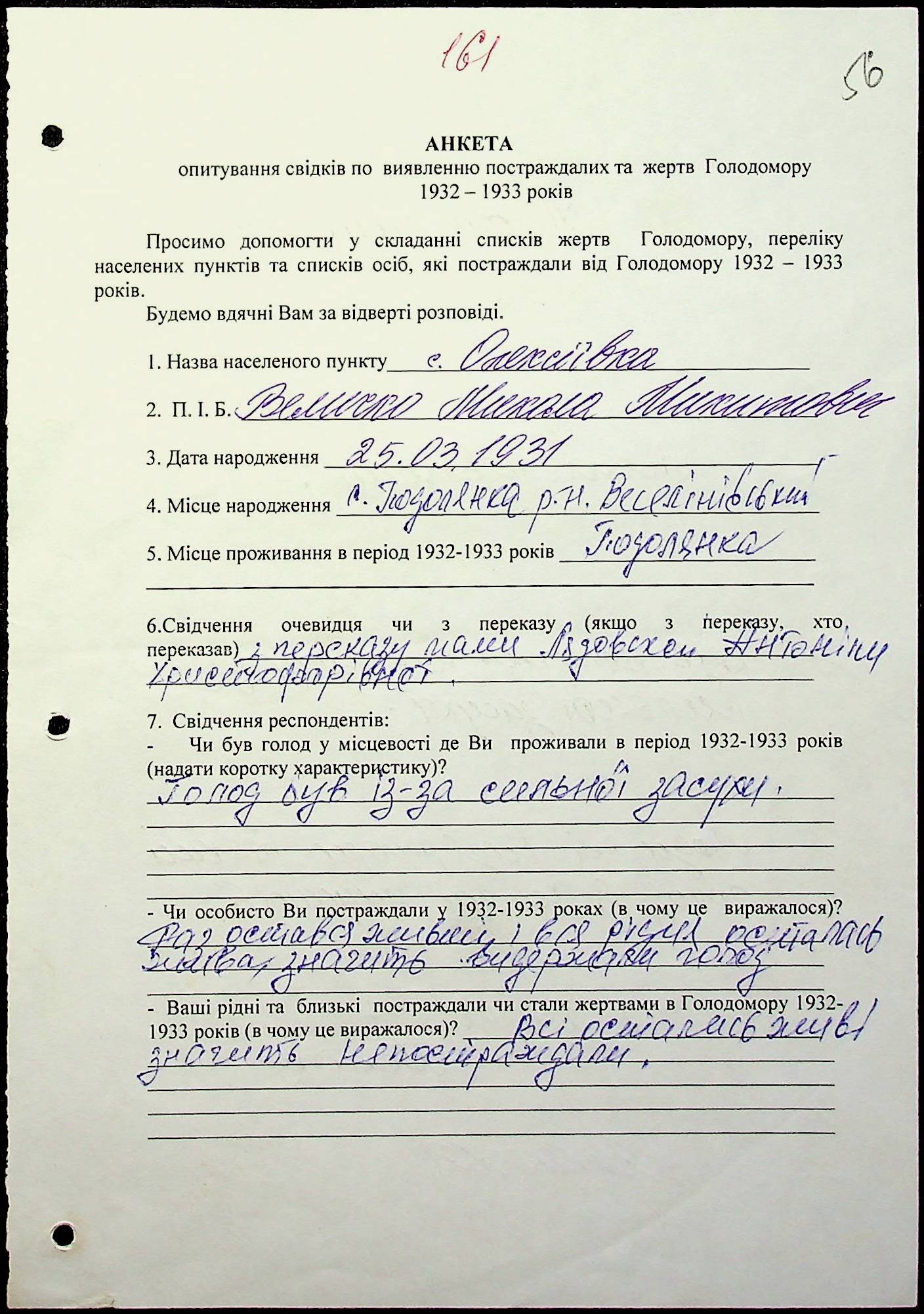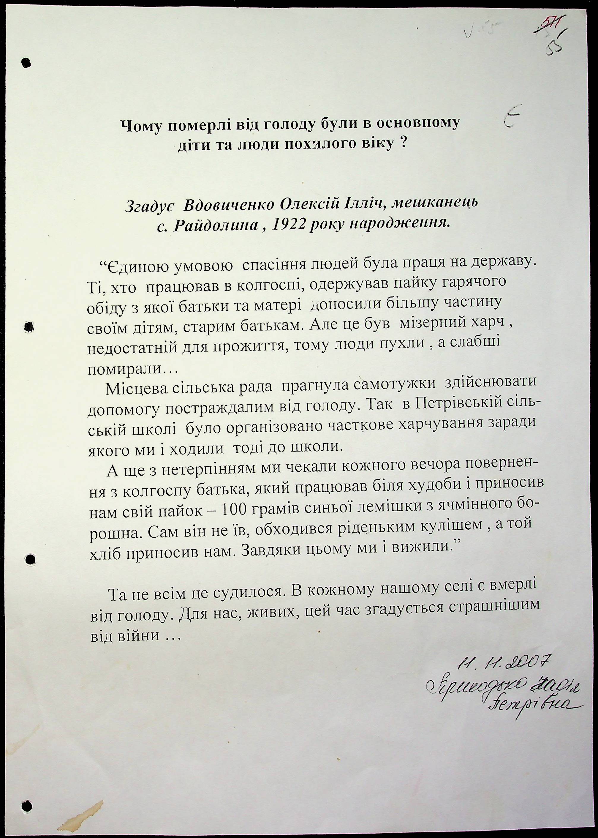 ◦ ◦ Фонд № 6146 “Колекція свідчень очевидців Голодомору 1932-1933 рр., нині проживаючих у Миколаївській області”