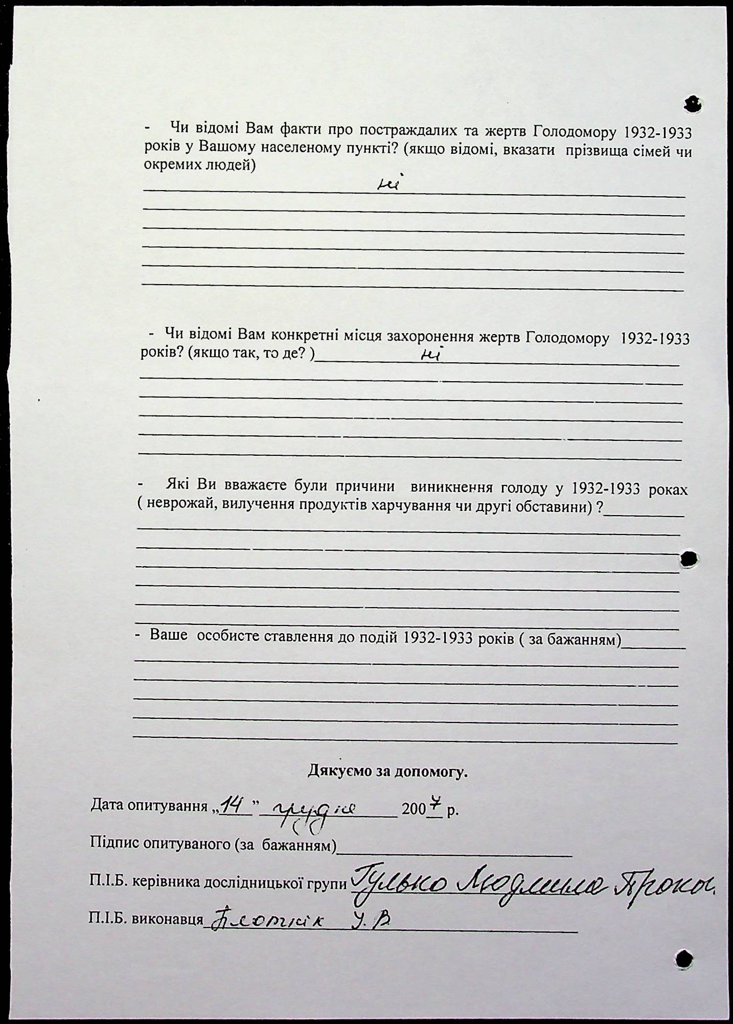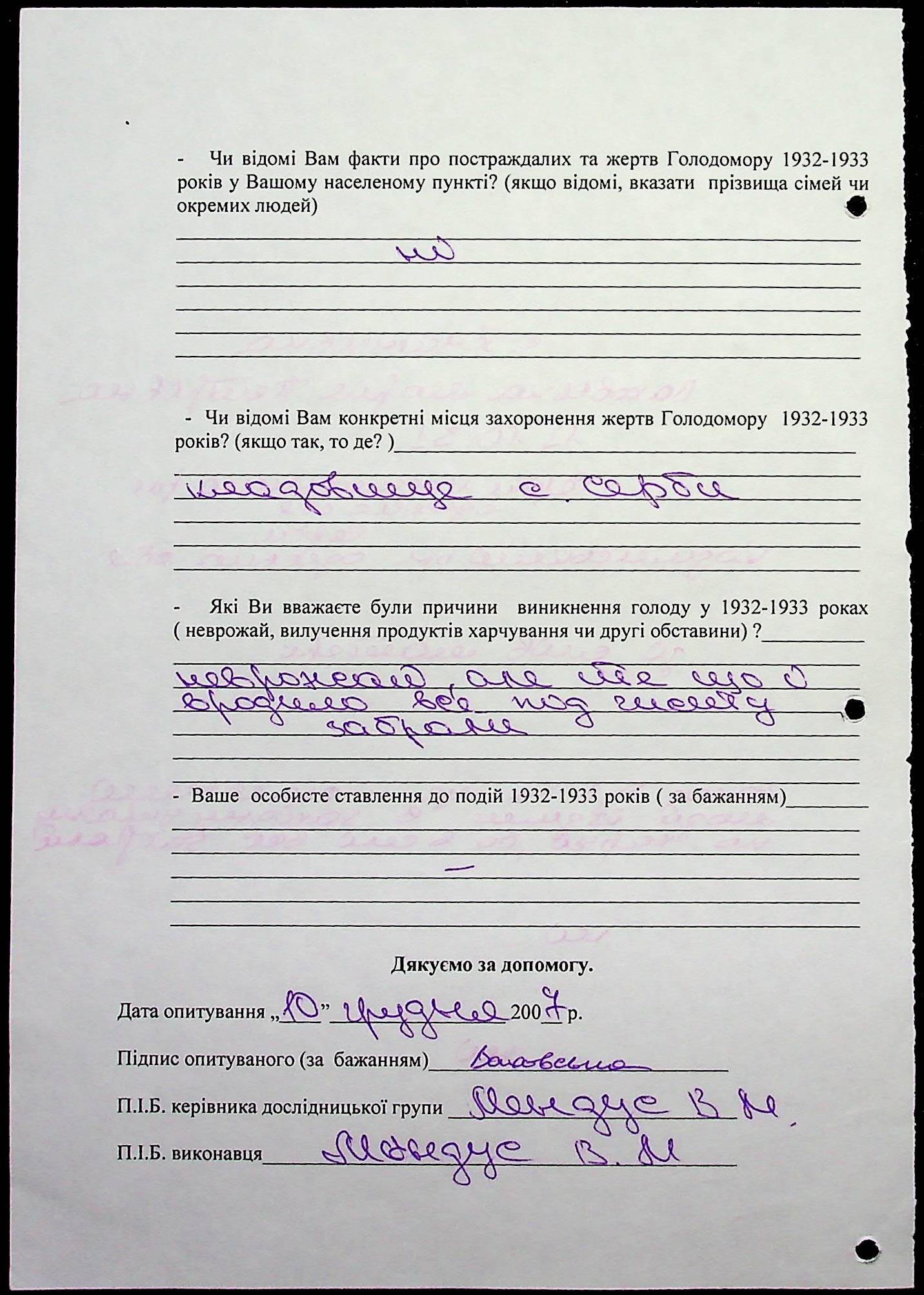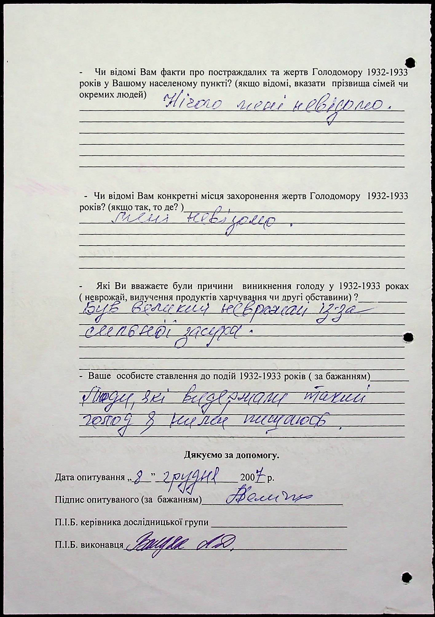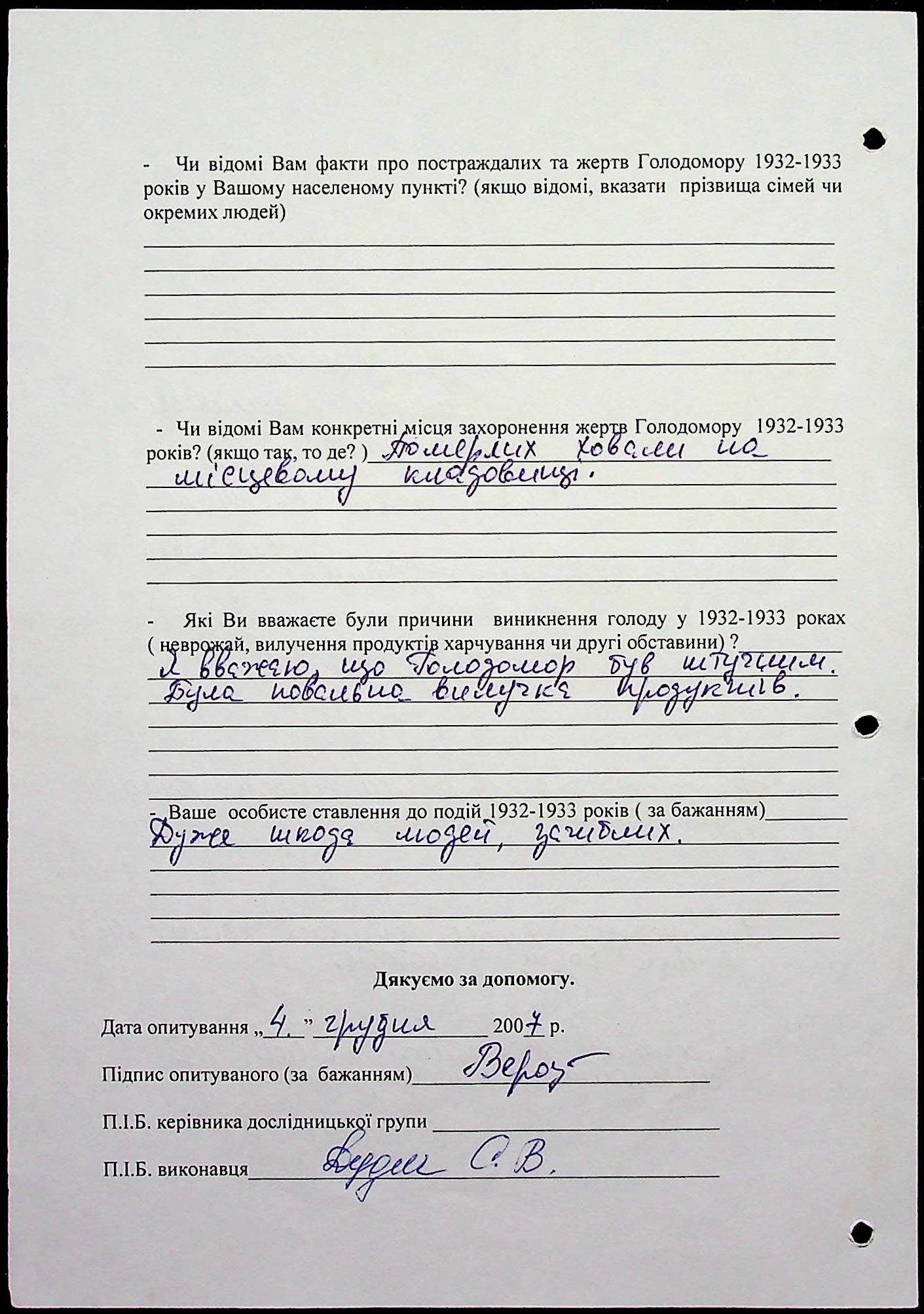 • • • • Справа № 20 “Свідчення очевидців Голодомору 1932-1933 років, які проживають у Веселинівському районі, з прізвищами на літери А–К”