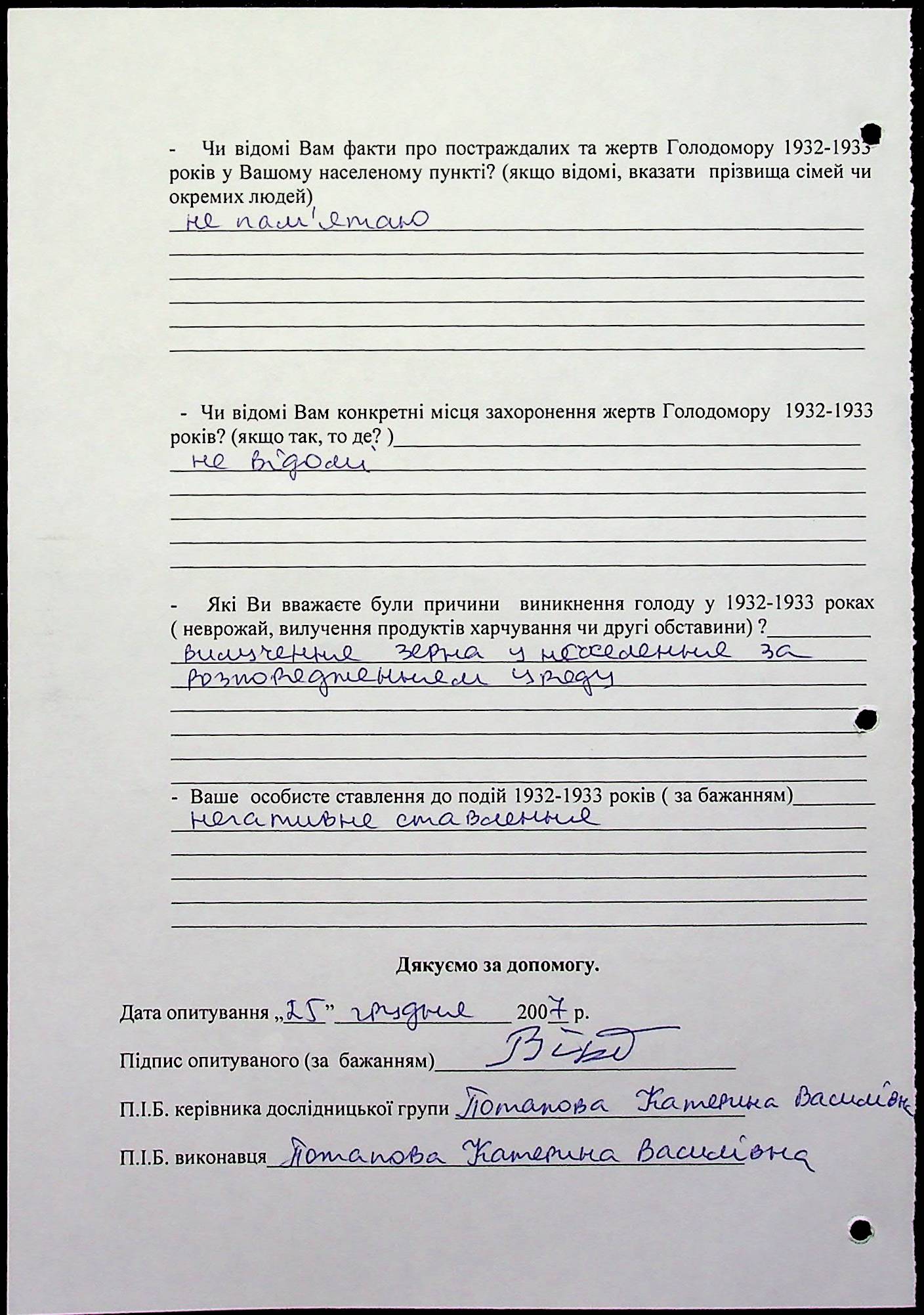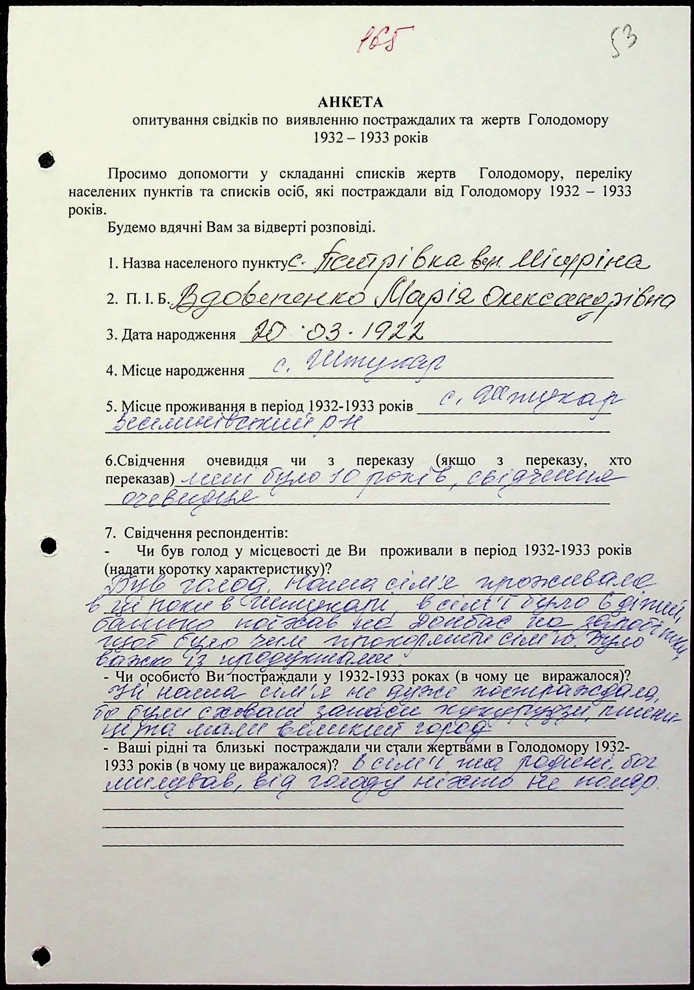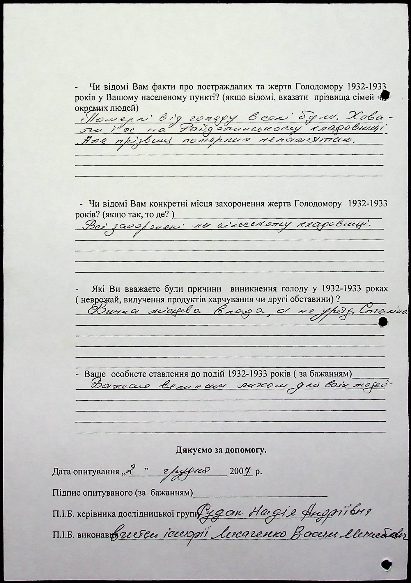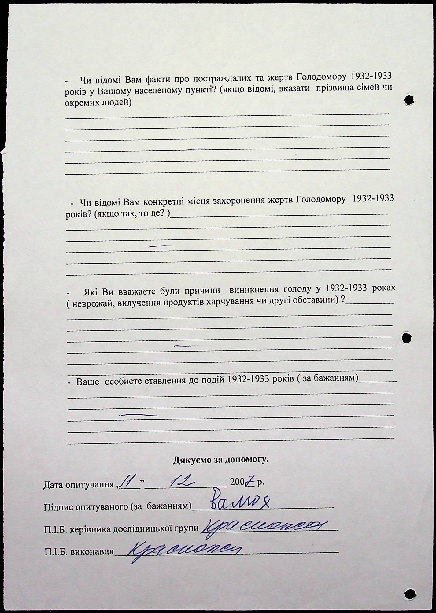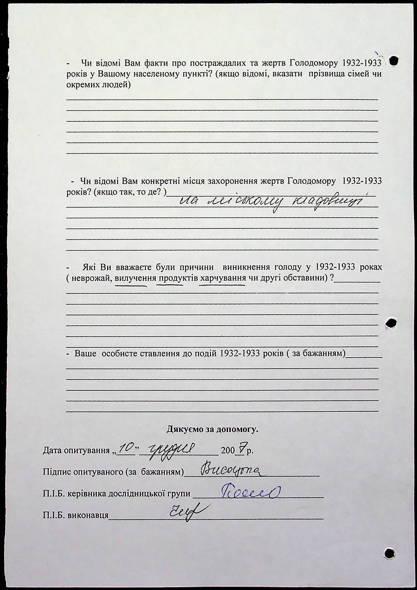• • • • Справа № 20 “Свідчення очевидців Голодомору 1932-1933 років, які проживають у Веселинівському районі, з прізвищами на літери А–К”