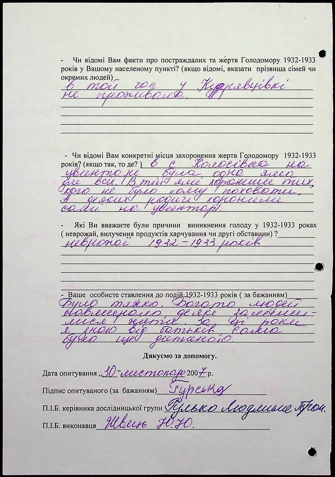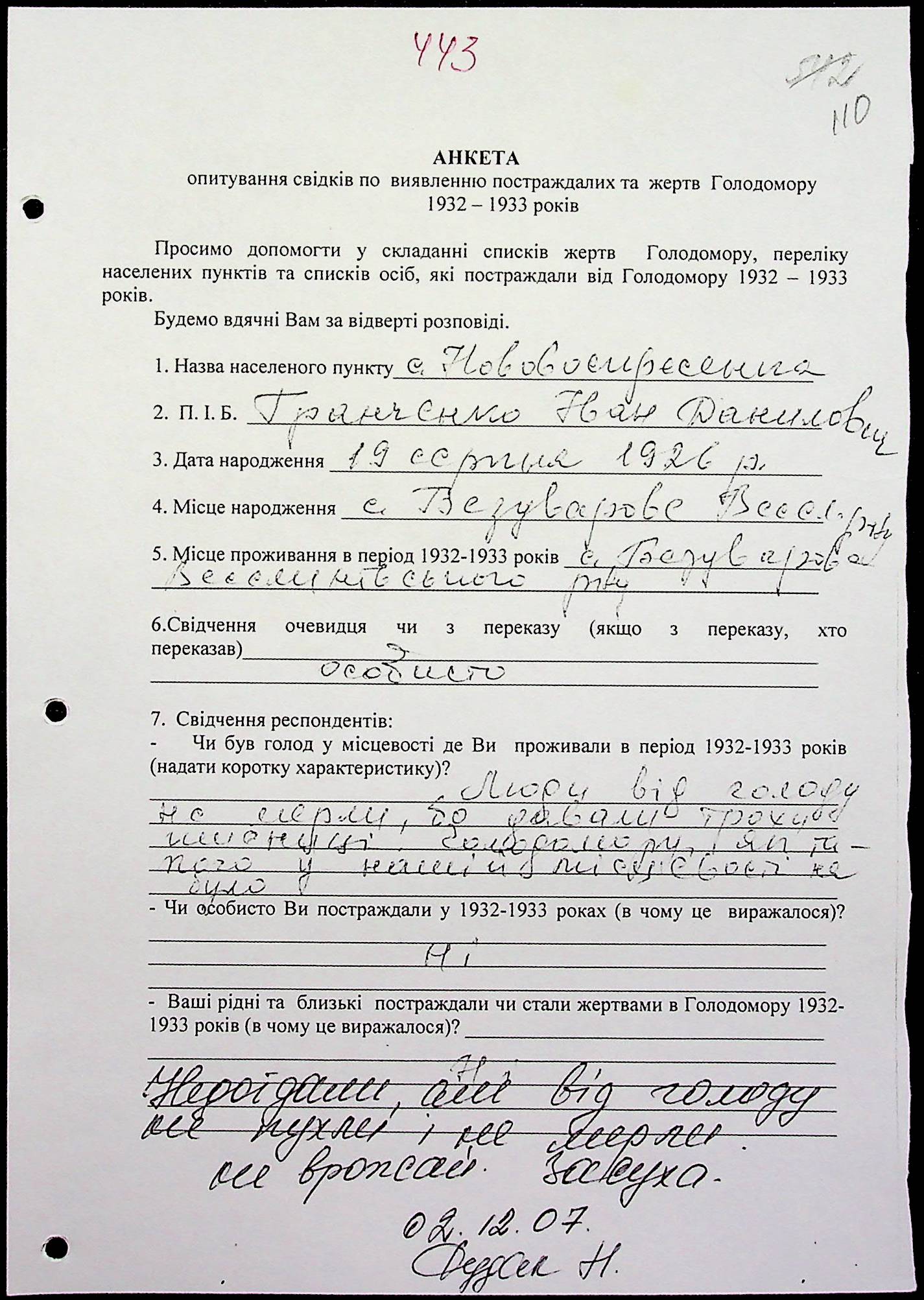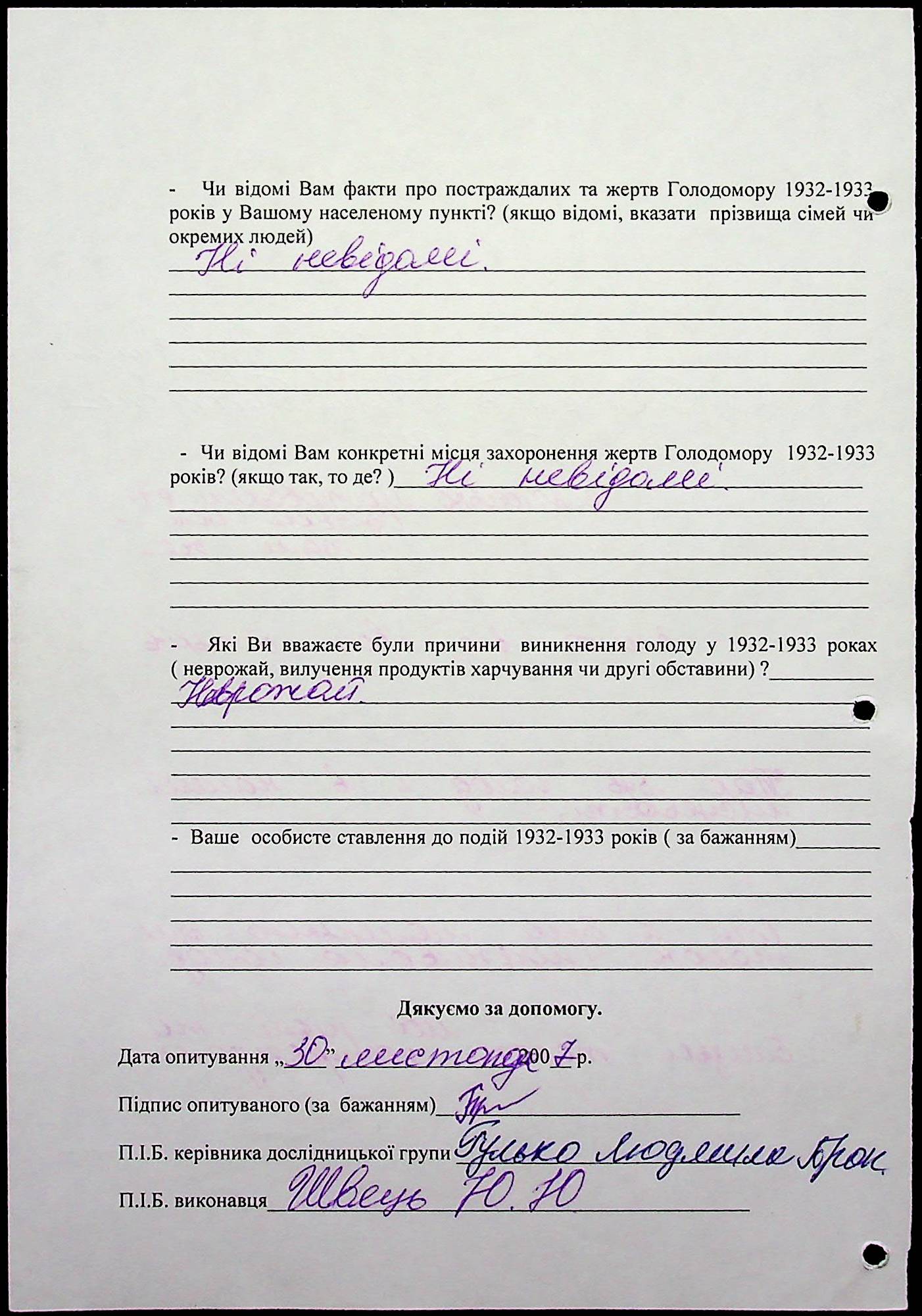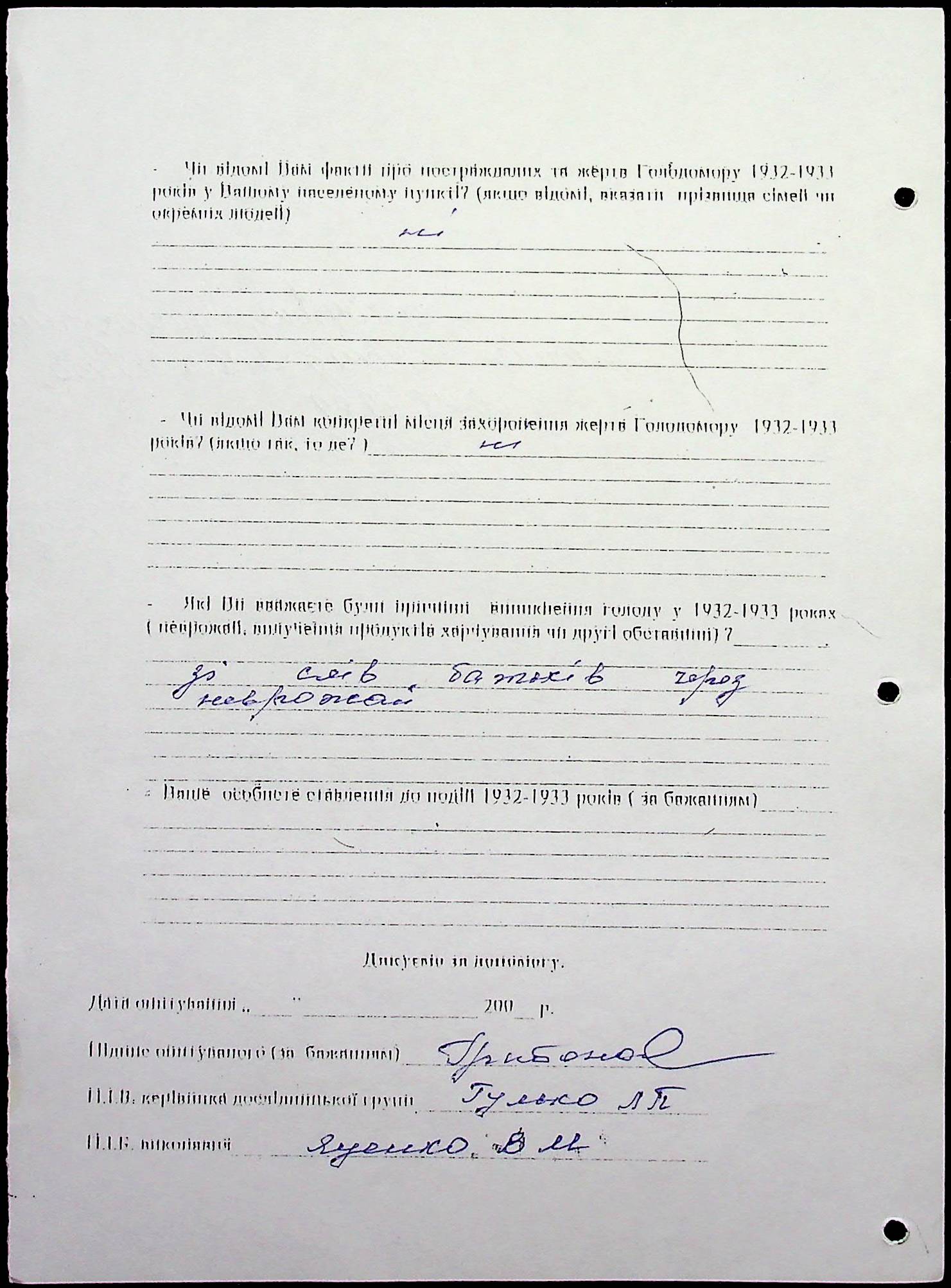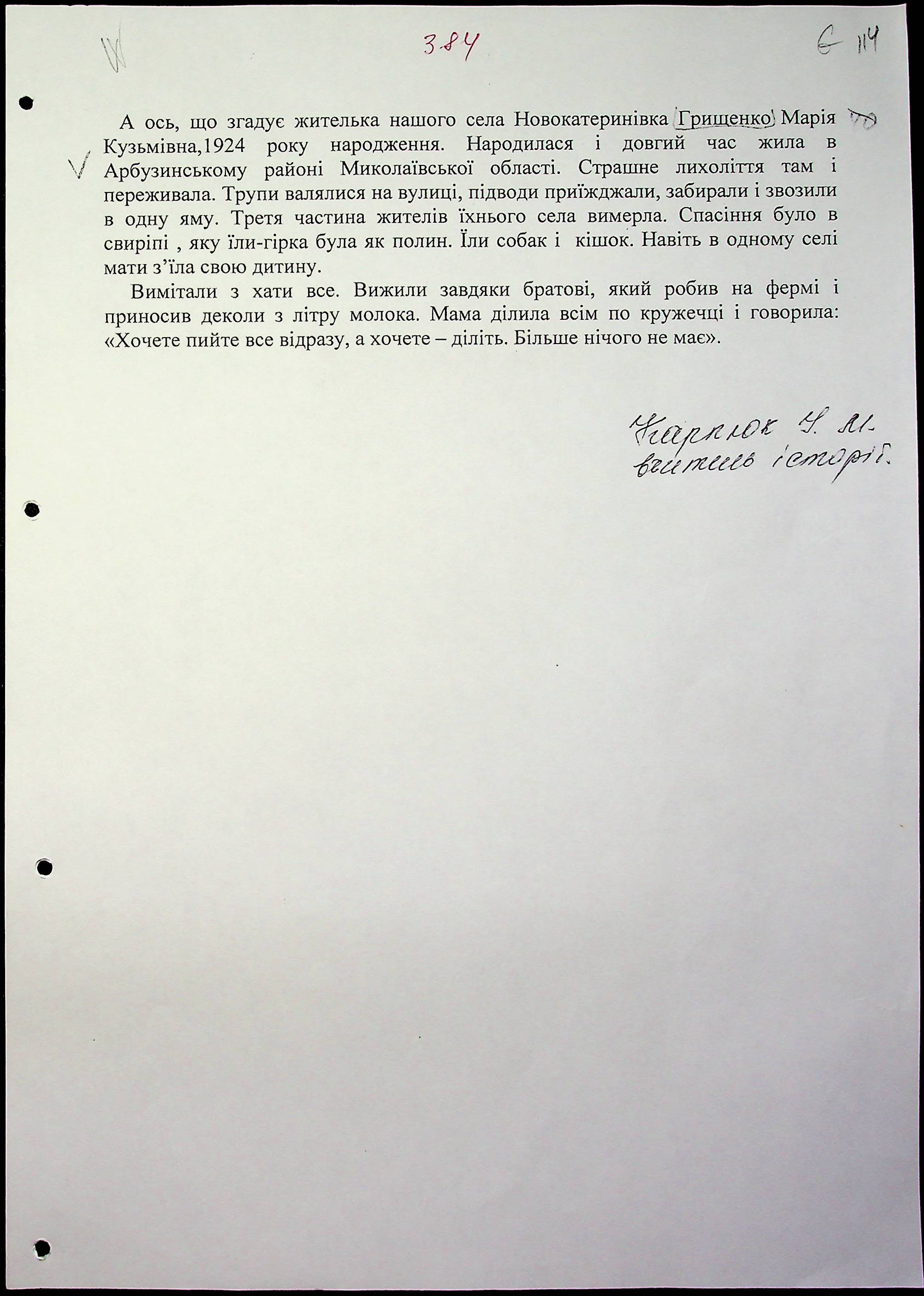 • • • • Справа № 20 “Свідчення очевидців Голодомору 1932-1933 років, які проживають у Веселинівському районі, з прізвищами на літери А–К”