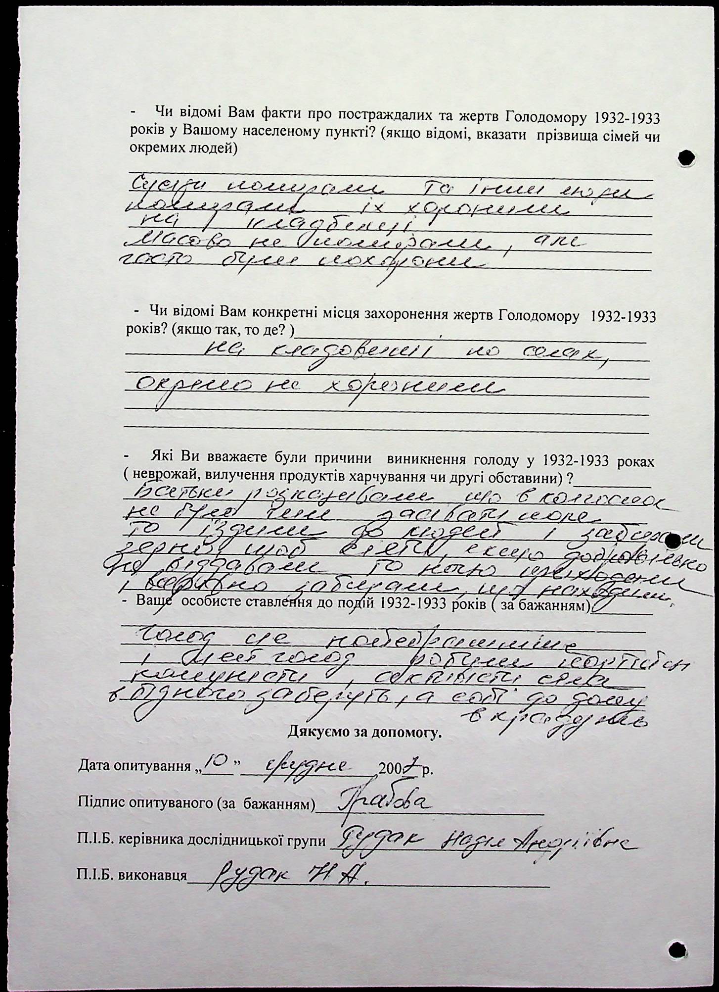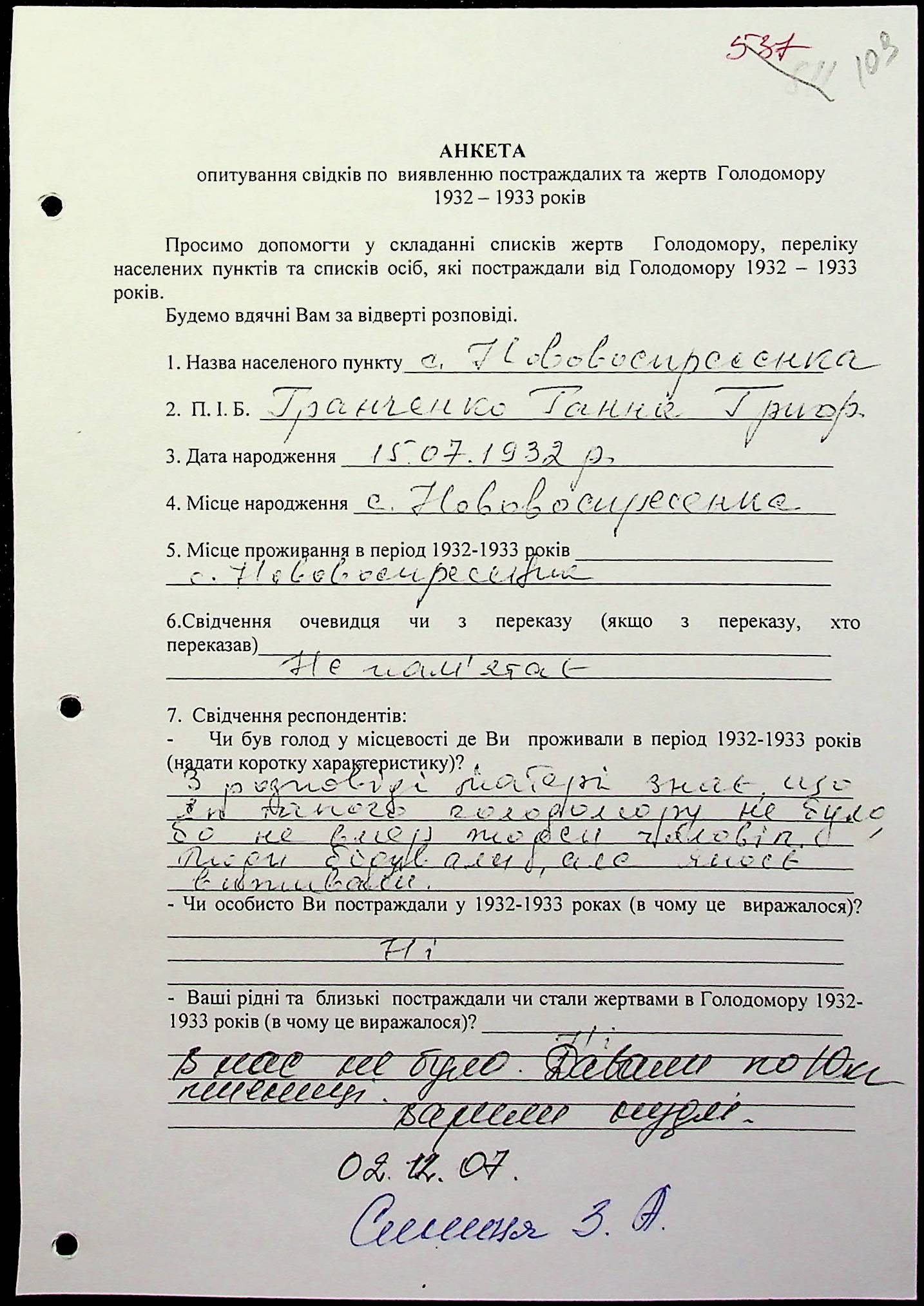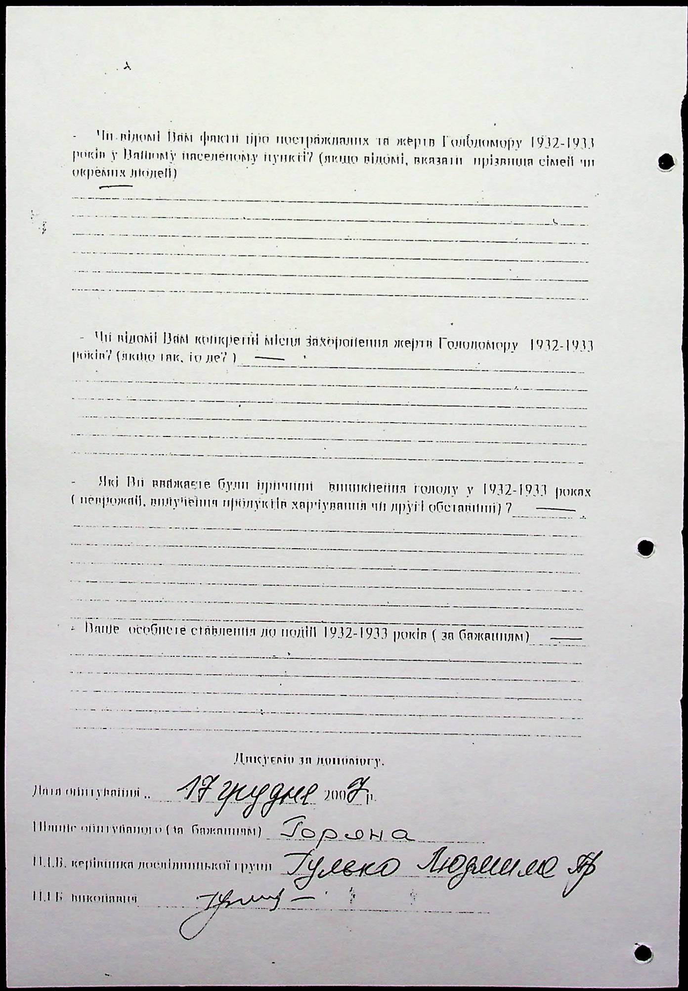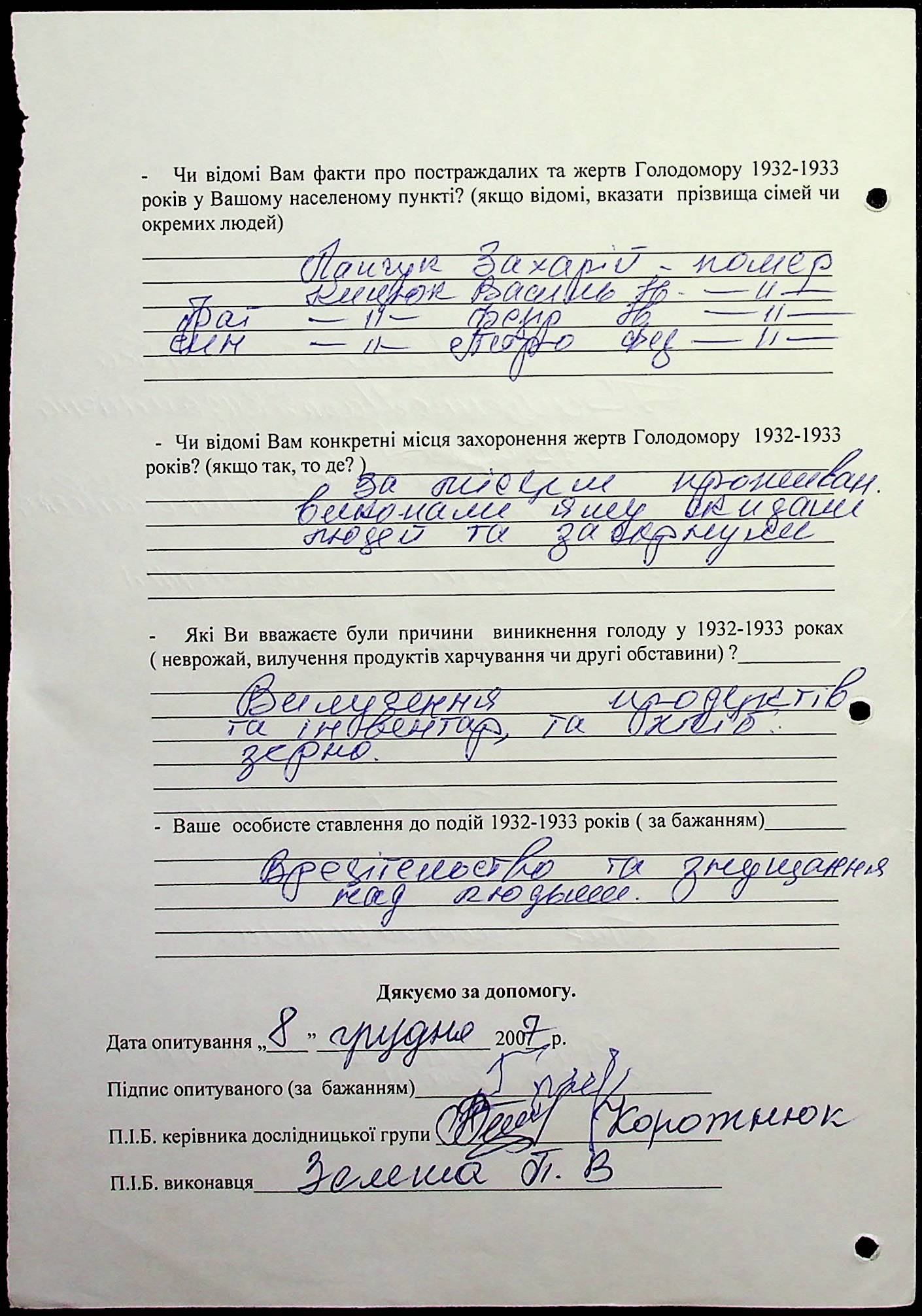 • • • • Справа № 20 “Свідчення очевидців Голодомору 1932-1933 років, які проживають у Веселинівському районі, з прізвищами на літери А–К”