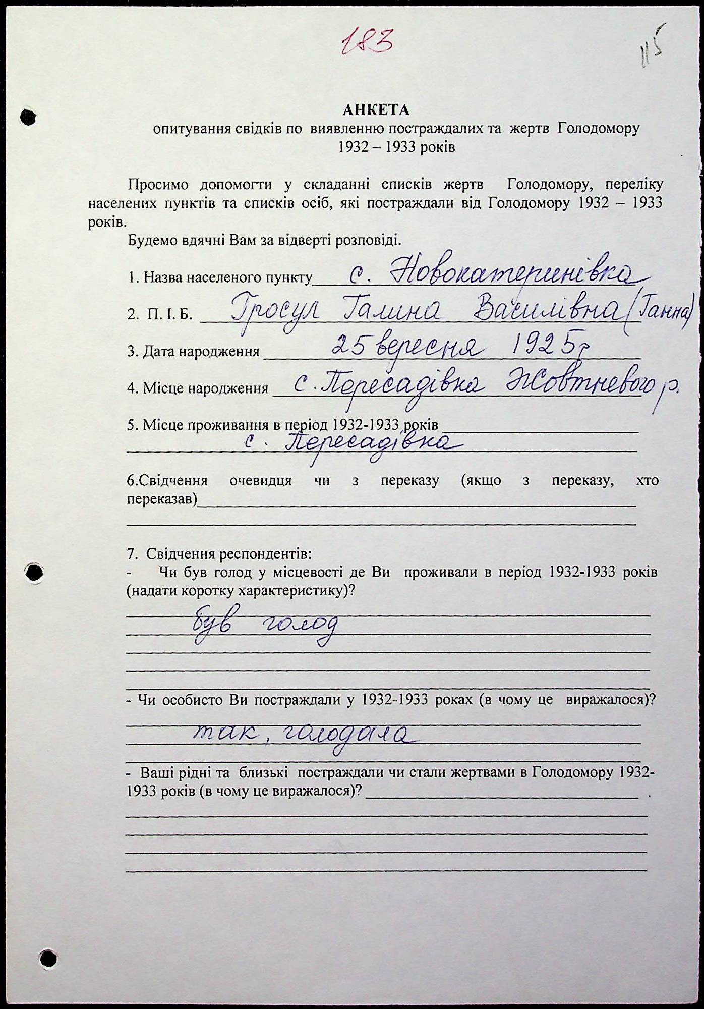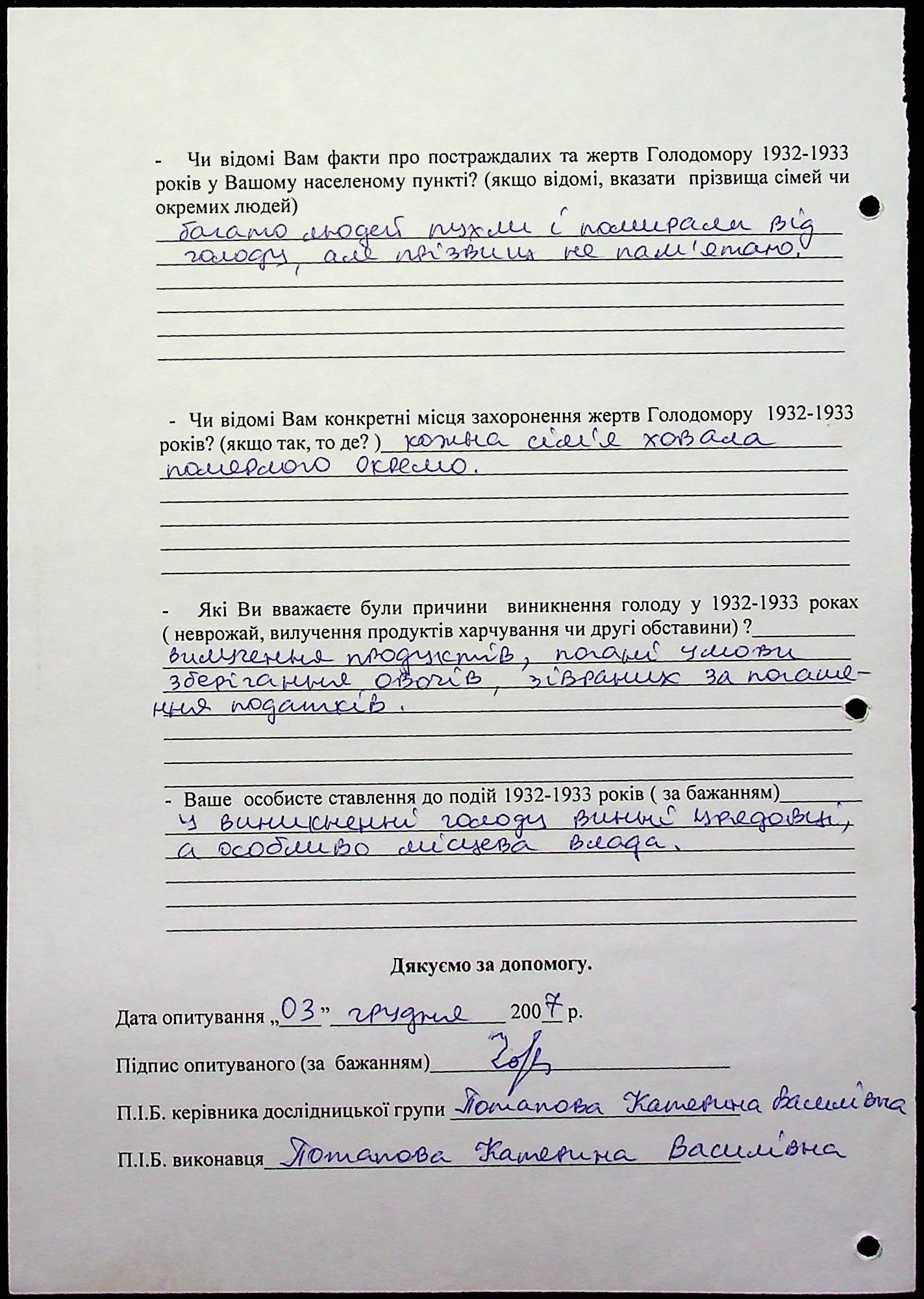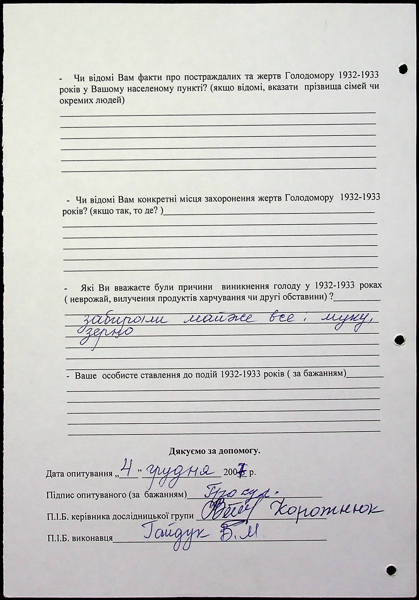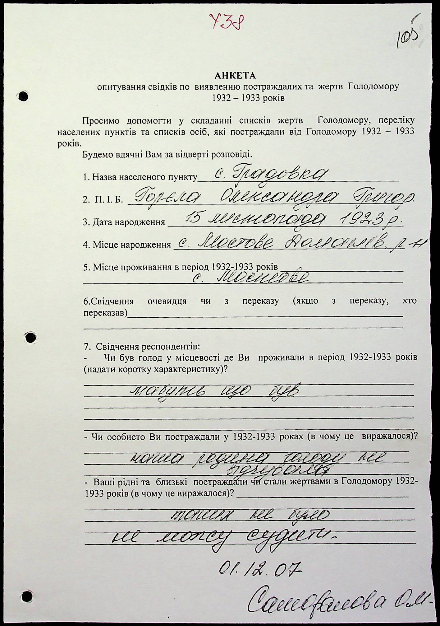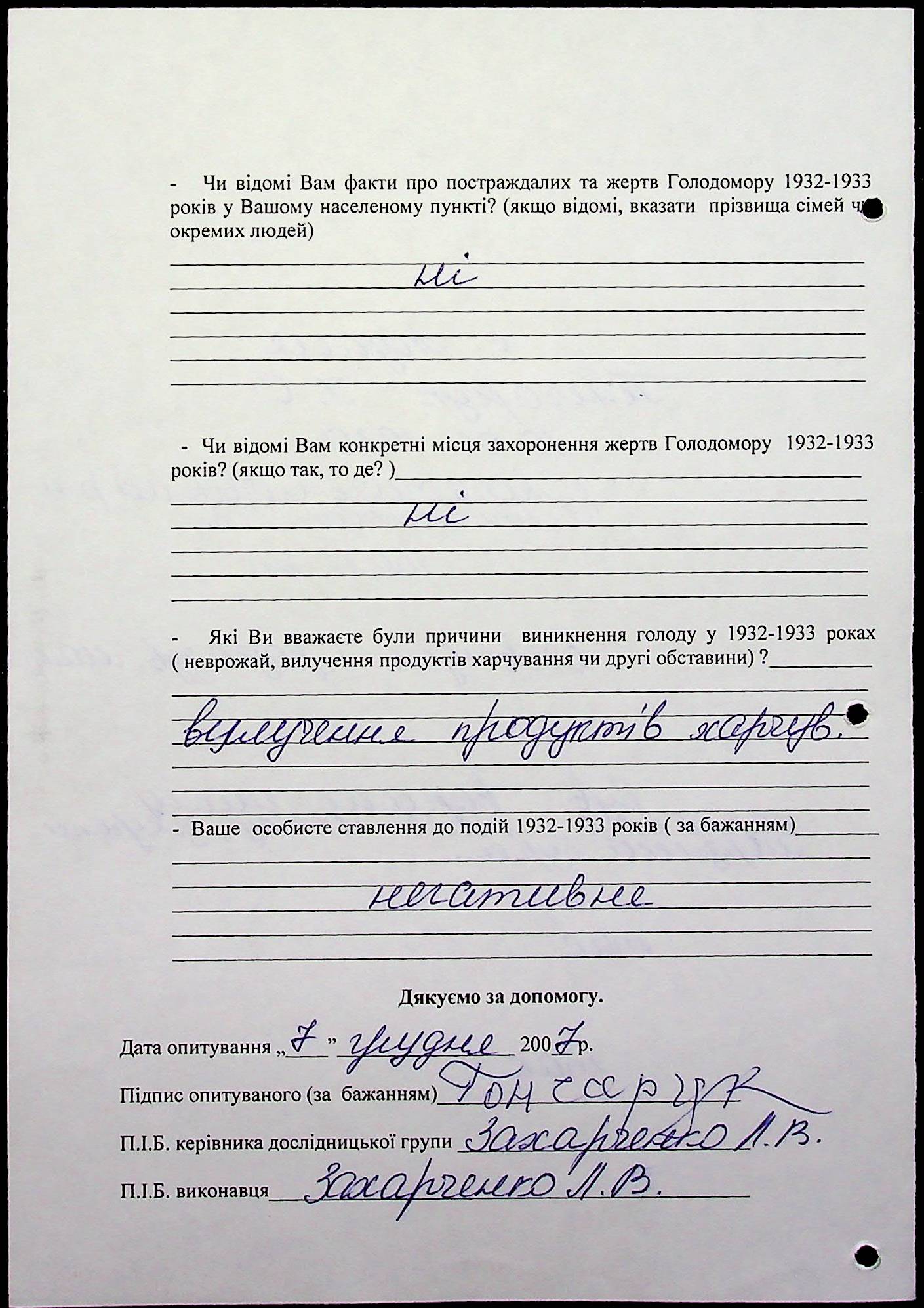 • • • • Справа № 20 “Свідчення очевидців Голодомору 1932-1933 років, які проживають у Веселинівському районі, з прізвищами на літери А–К”