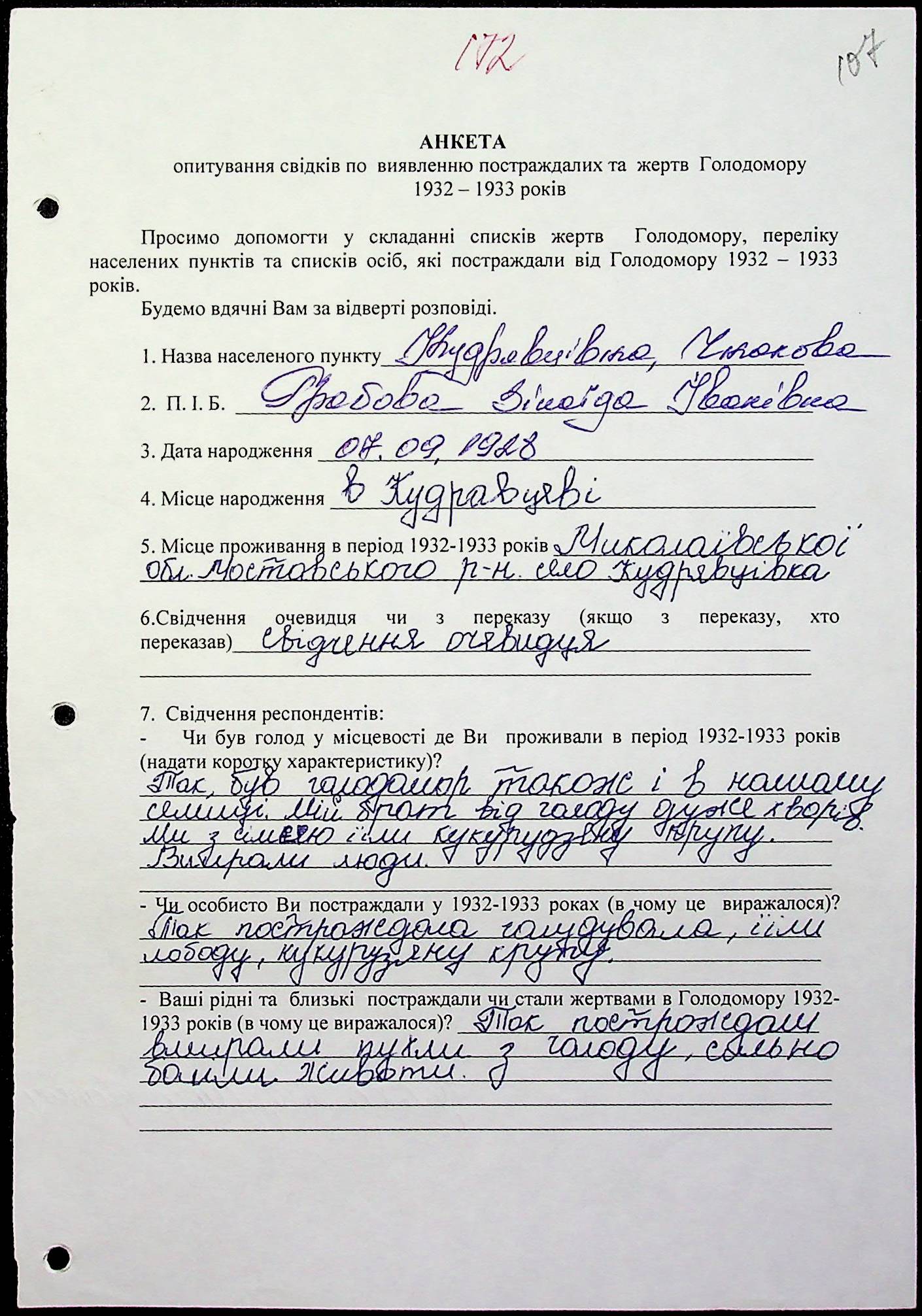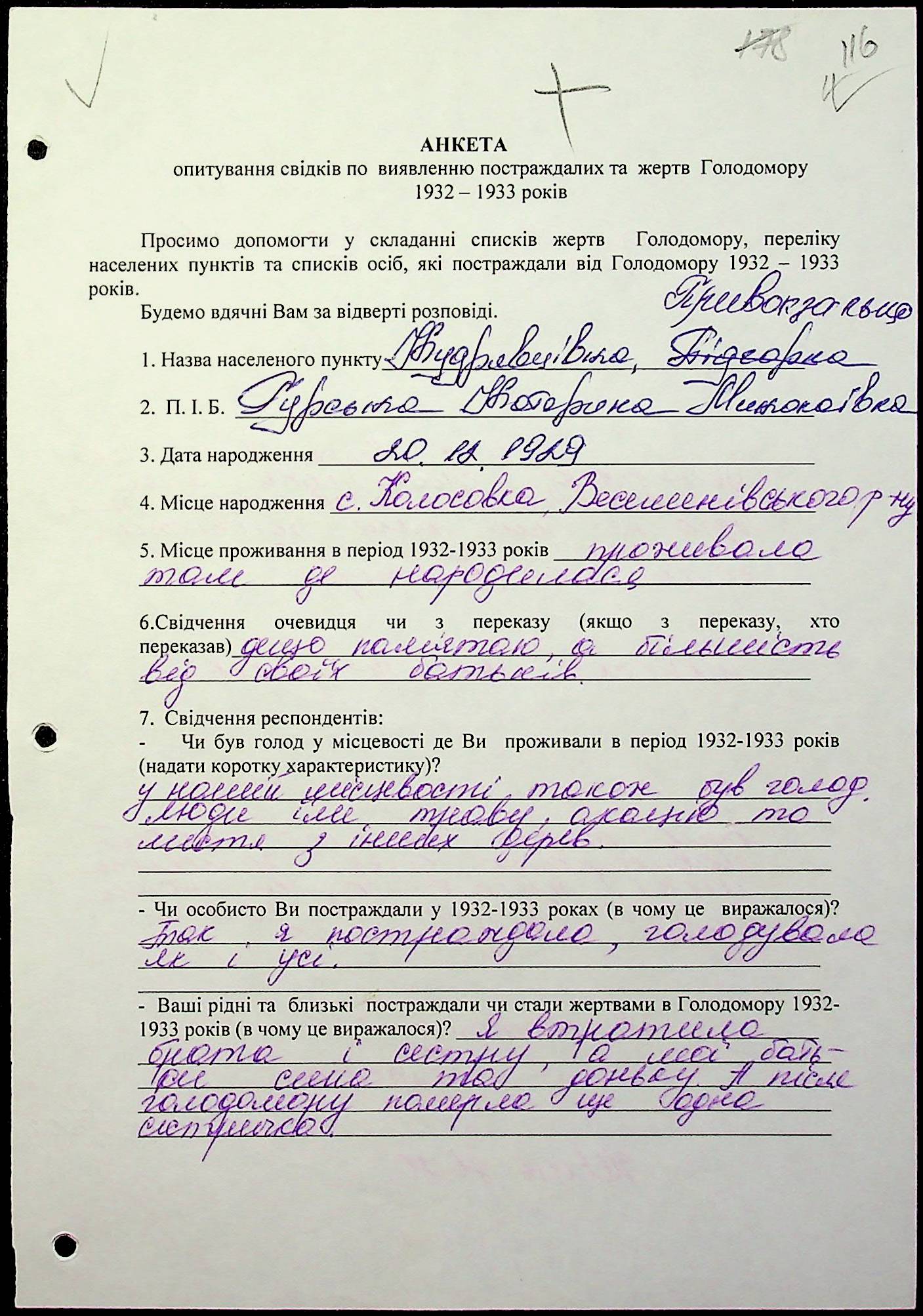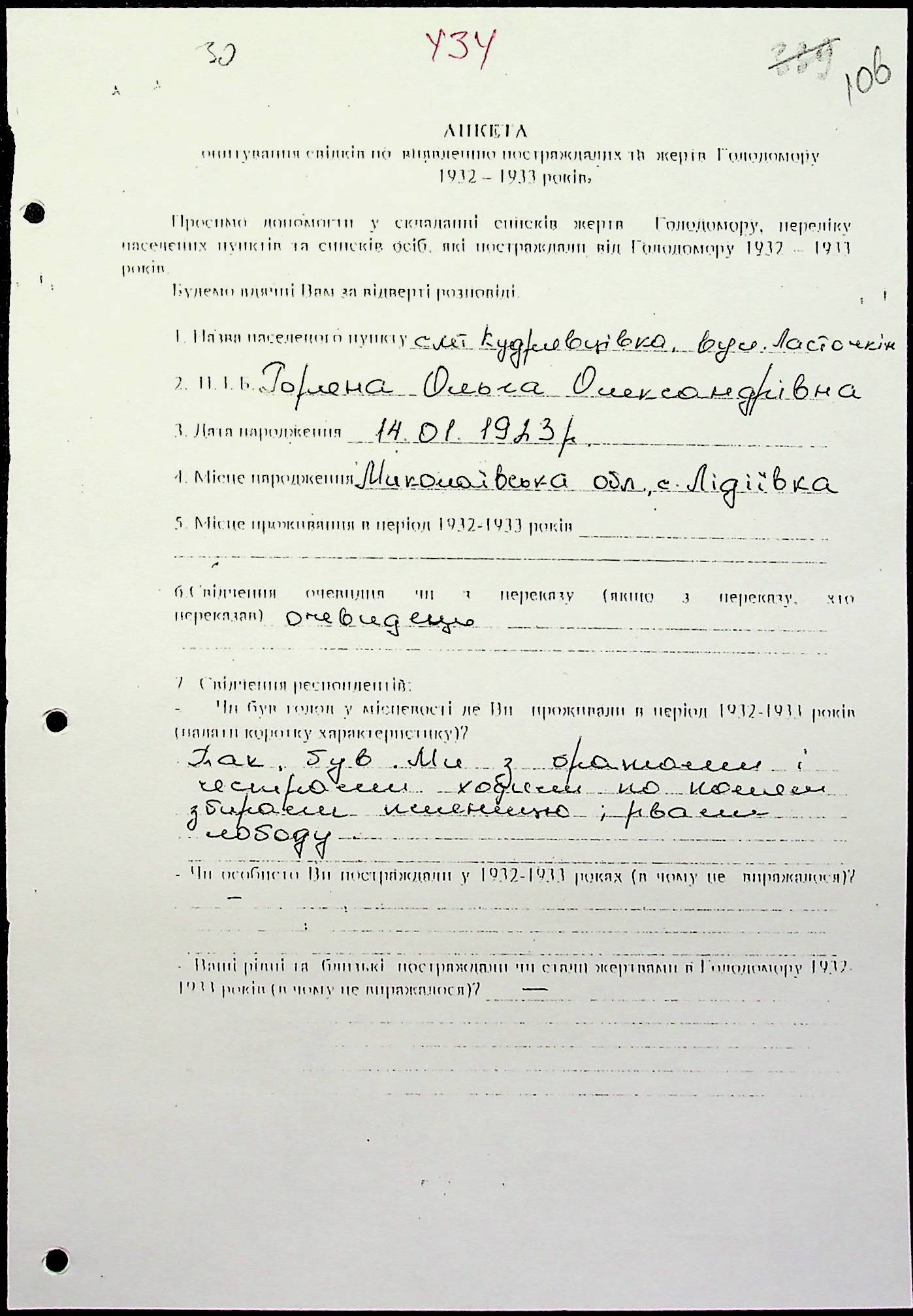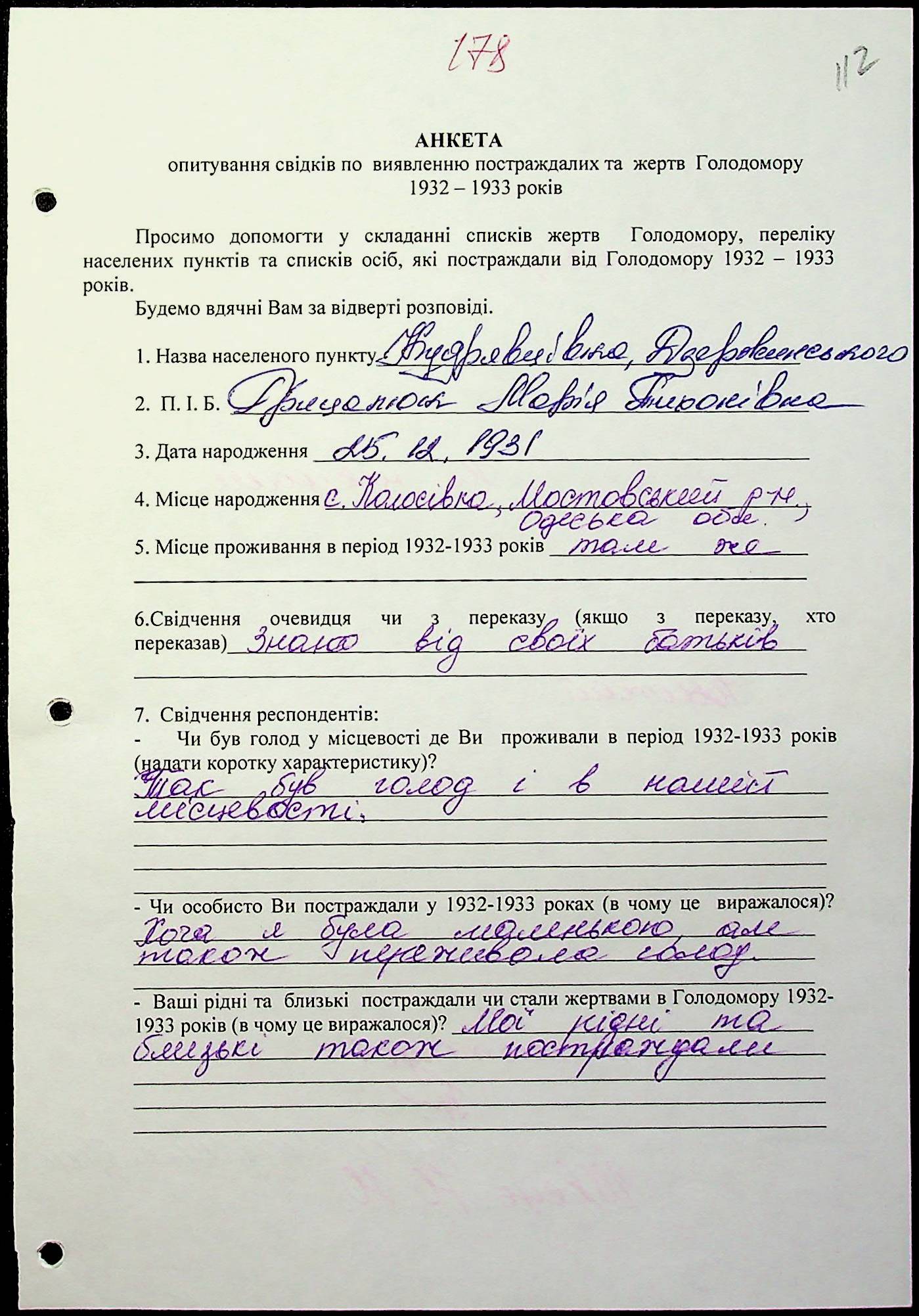 ◦ ◦ Фонд № 6146 “Колекція свідчень очевидців Голодомору 1932-1933 рр., нині проживаючих у Миколаївській області”