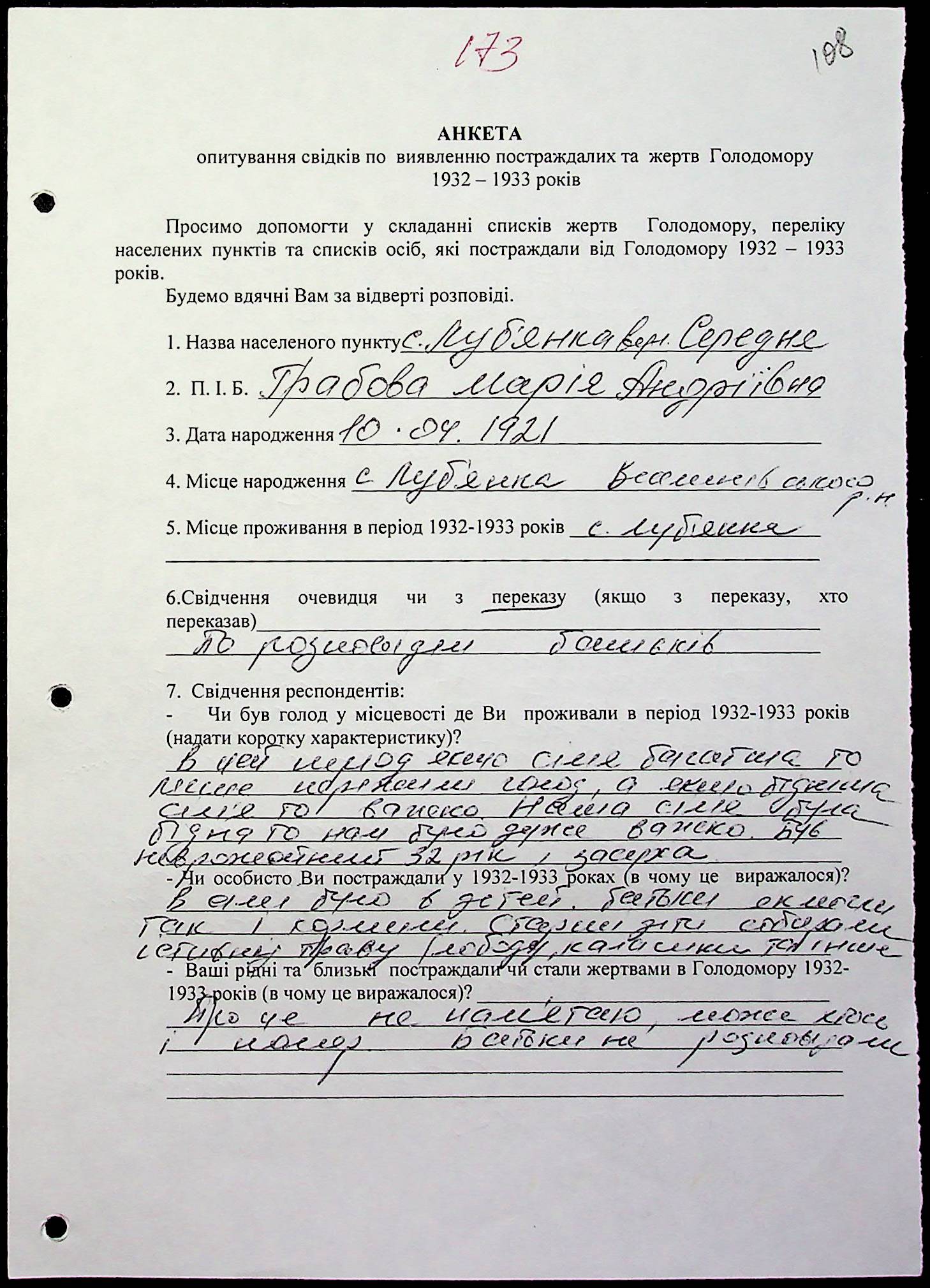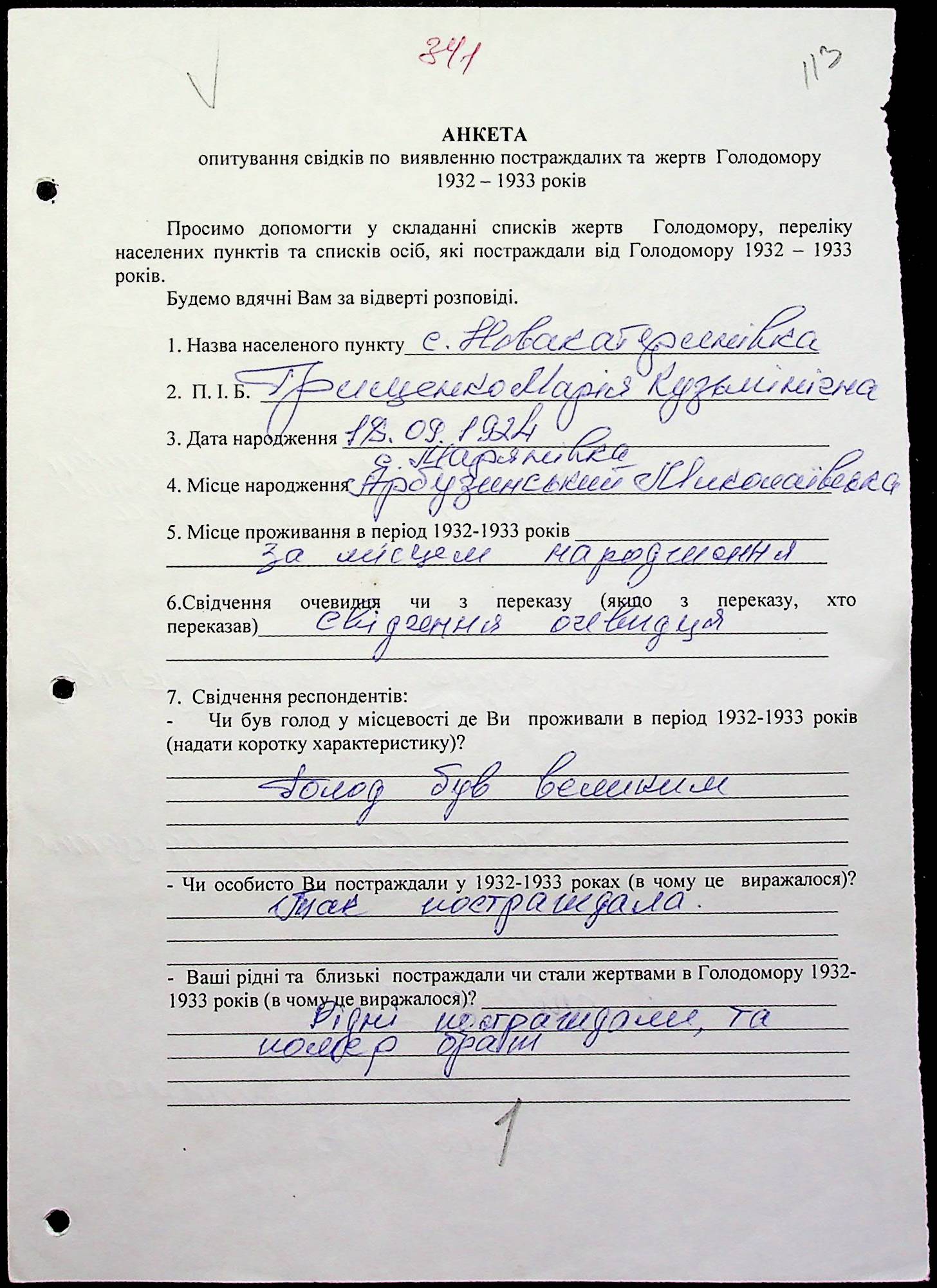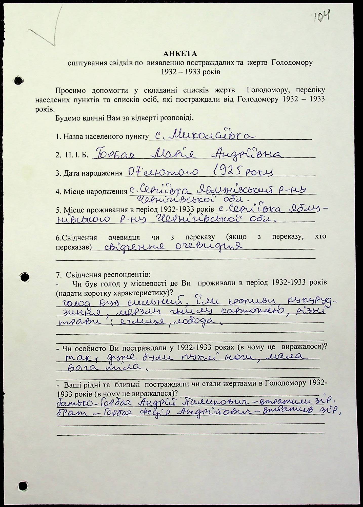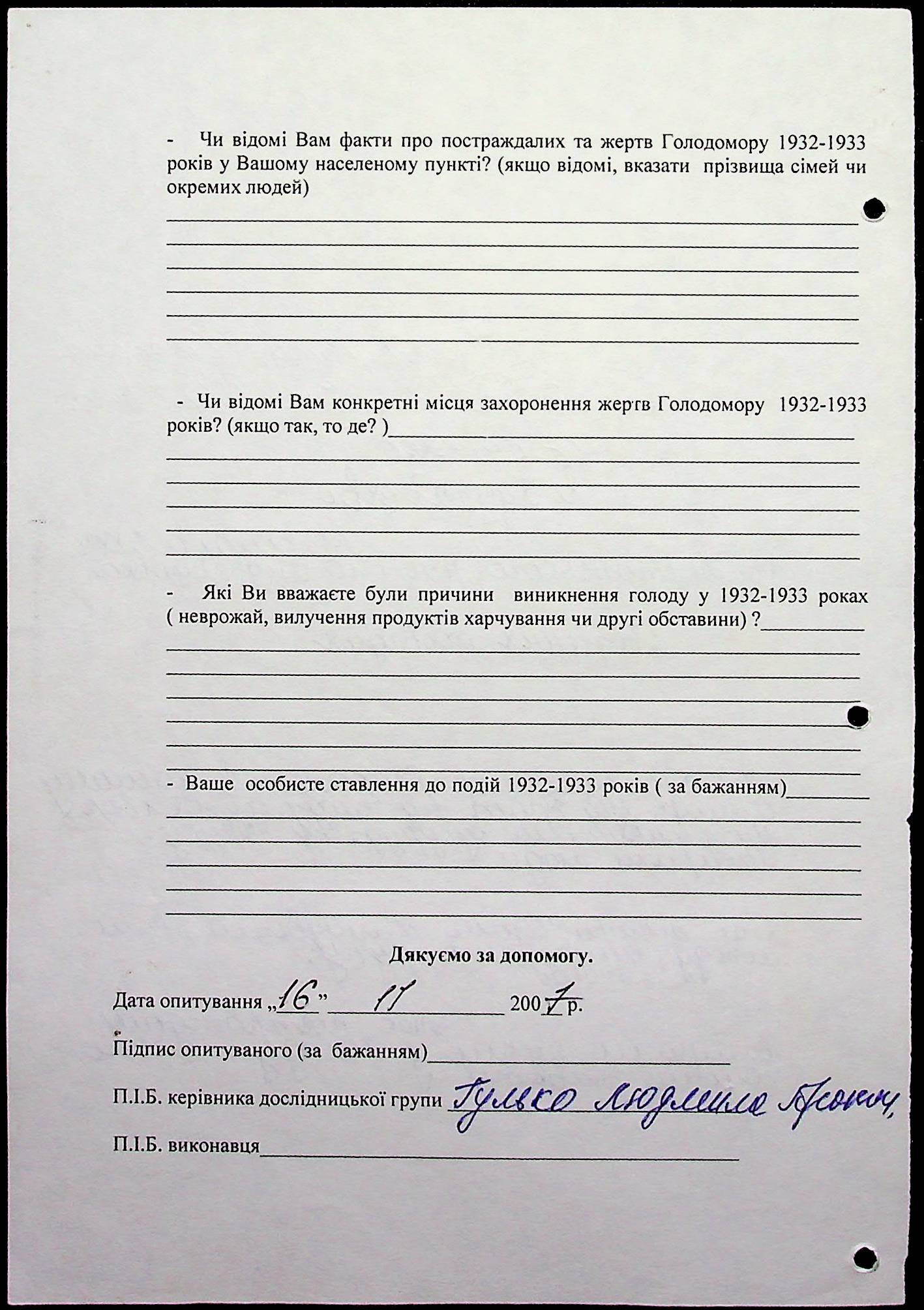 ◦ ◦ Фонд № 6146 “Колекція свідчень очевидців Голодомору 1932-1933 рр., нині проживаючих у Миколаївській області”