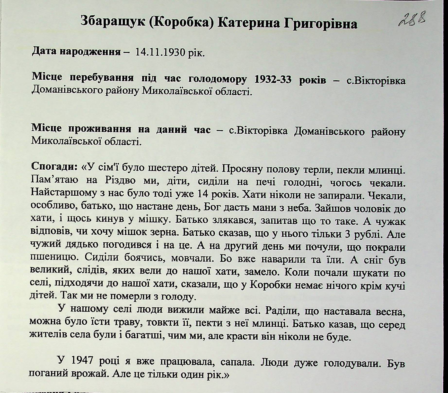 ◦ ◦ Фонд № 6146 “Колекція свідчень очевидців Голодомору 1932-1933 рр., нині проживаючих у Миколаївській області”