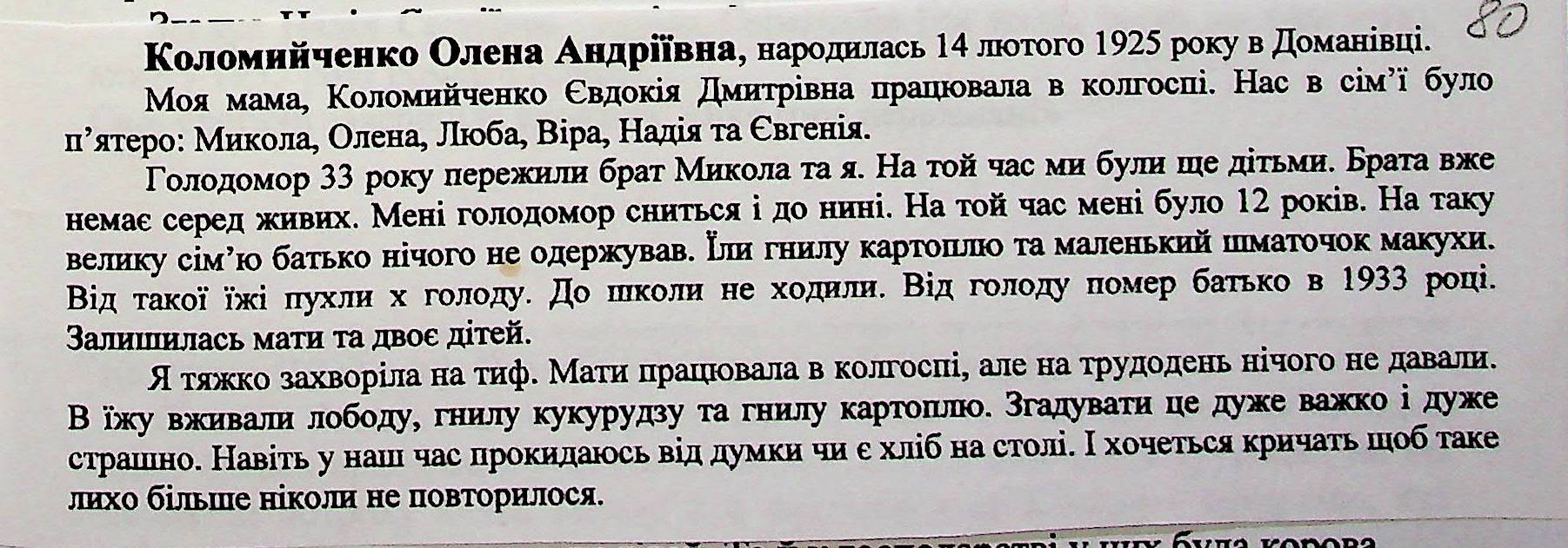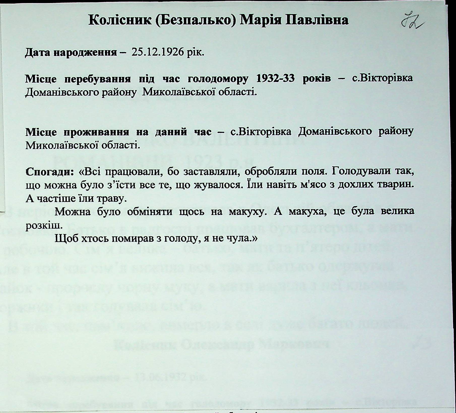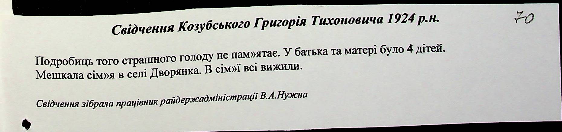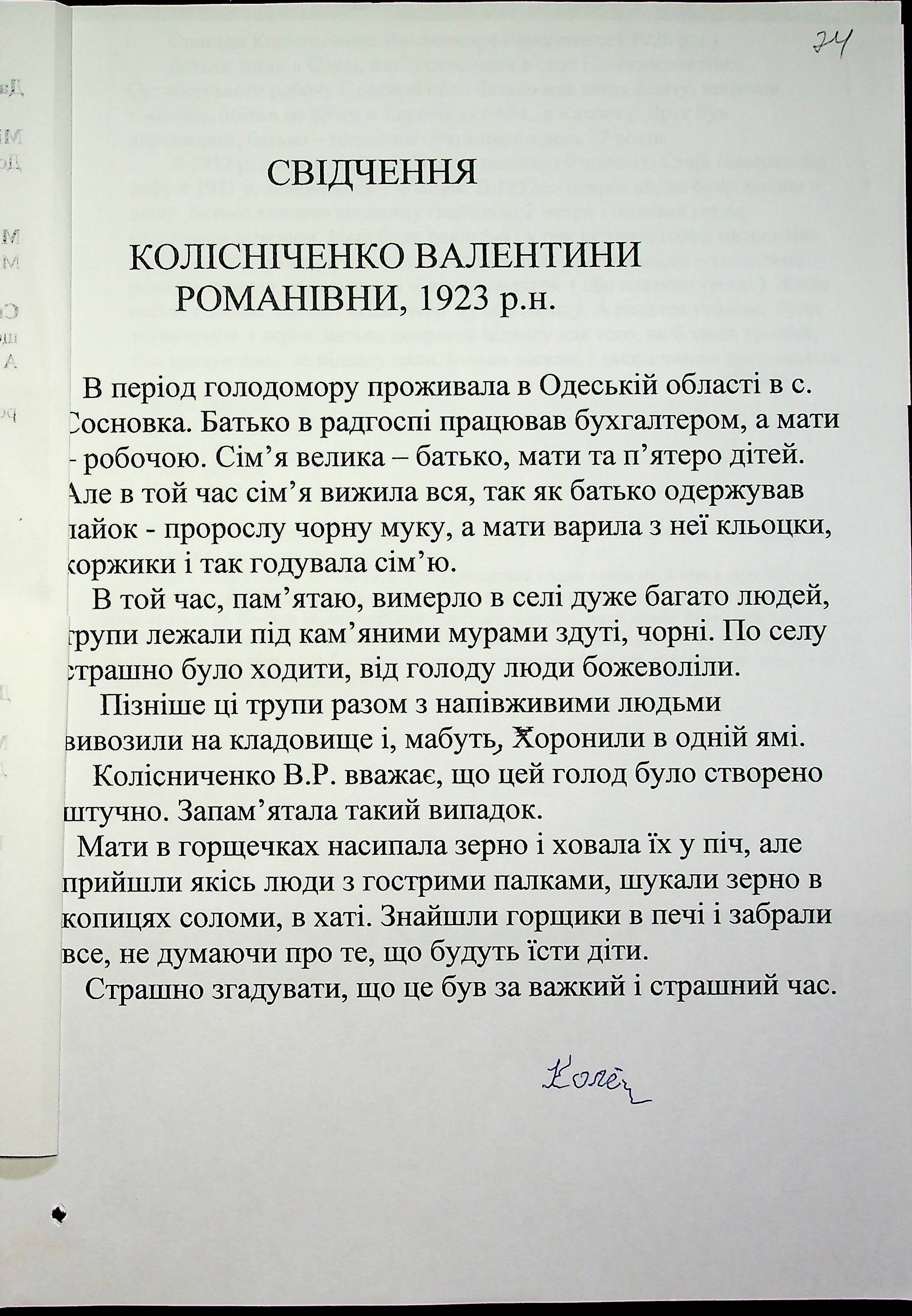 • • • • Справа № 27 “Свідчення очевидців Голодомору 1932-1933 років, які проживають у Доманівському районі, з прізвищами на літери К–Н”