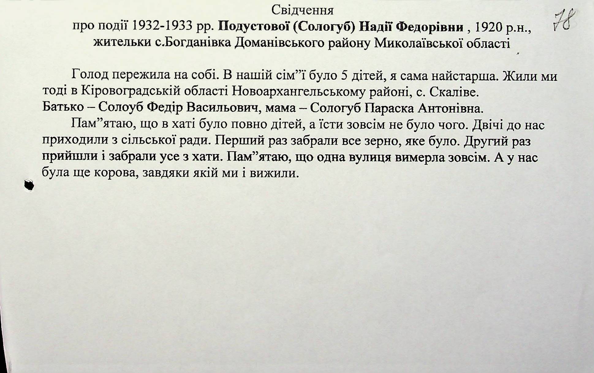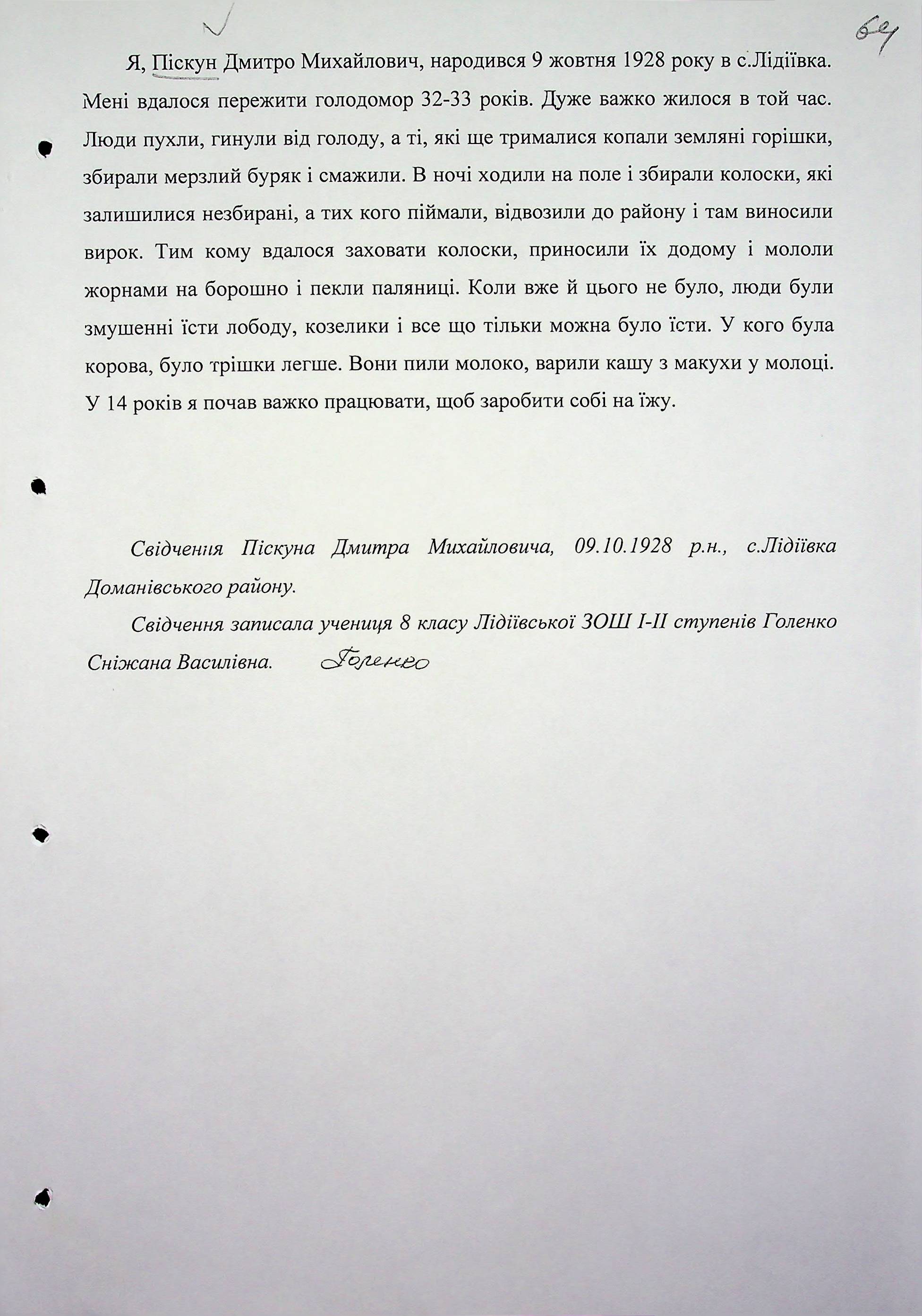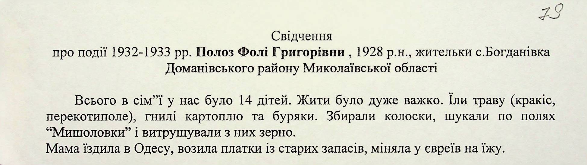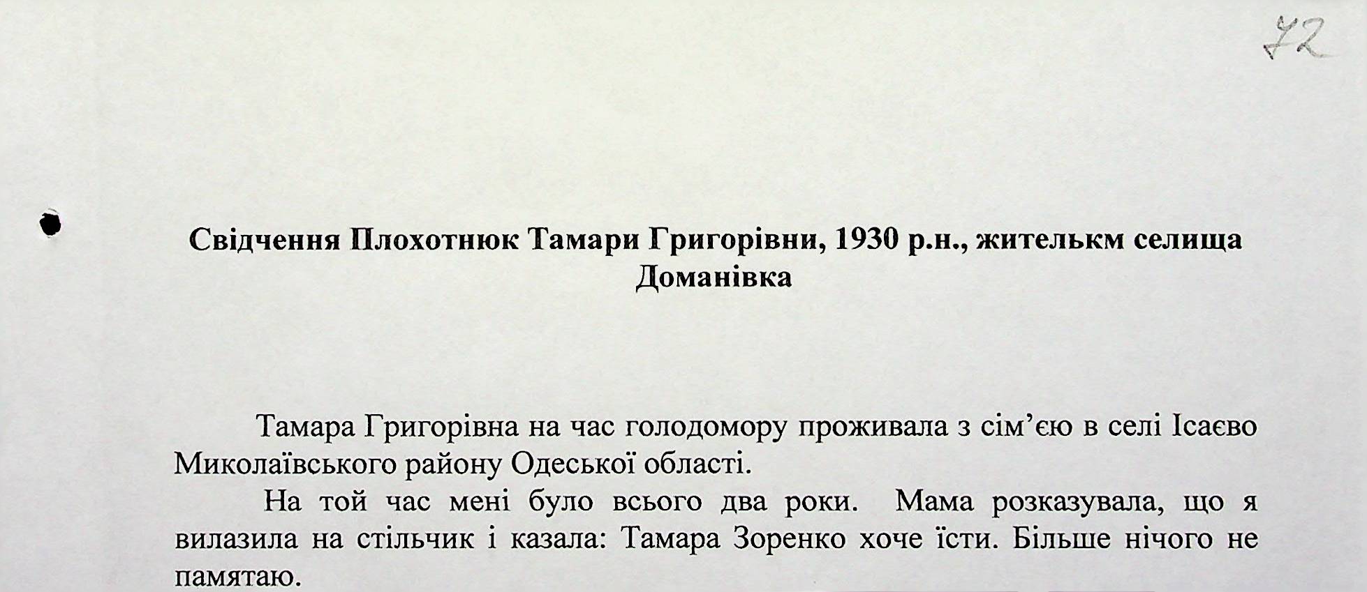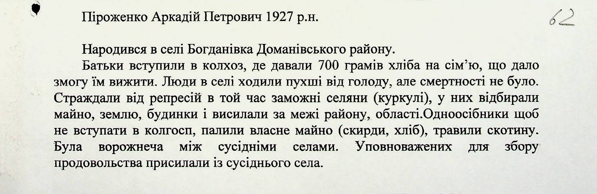 • • • • Справа № 28 “Свідчення очевидців Голодомору 1932-1933 років, які проживають у Доманівському районі, з прізвищами на літери О–Я”