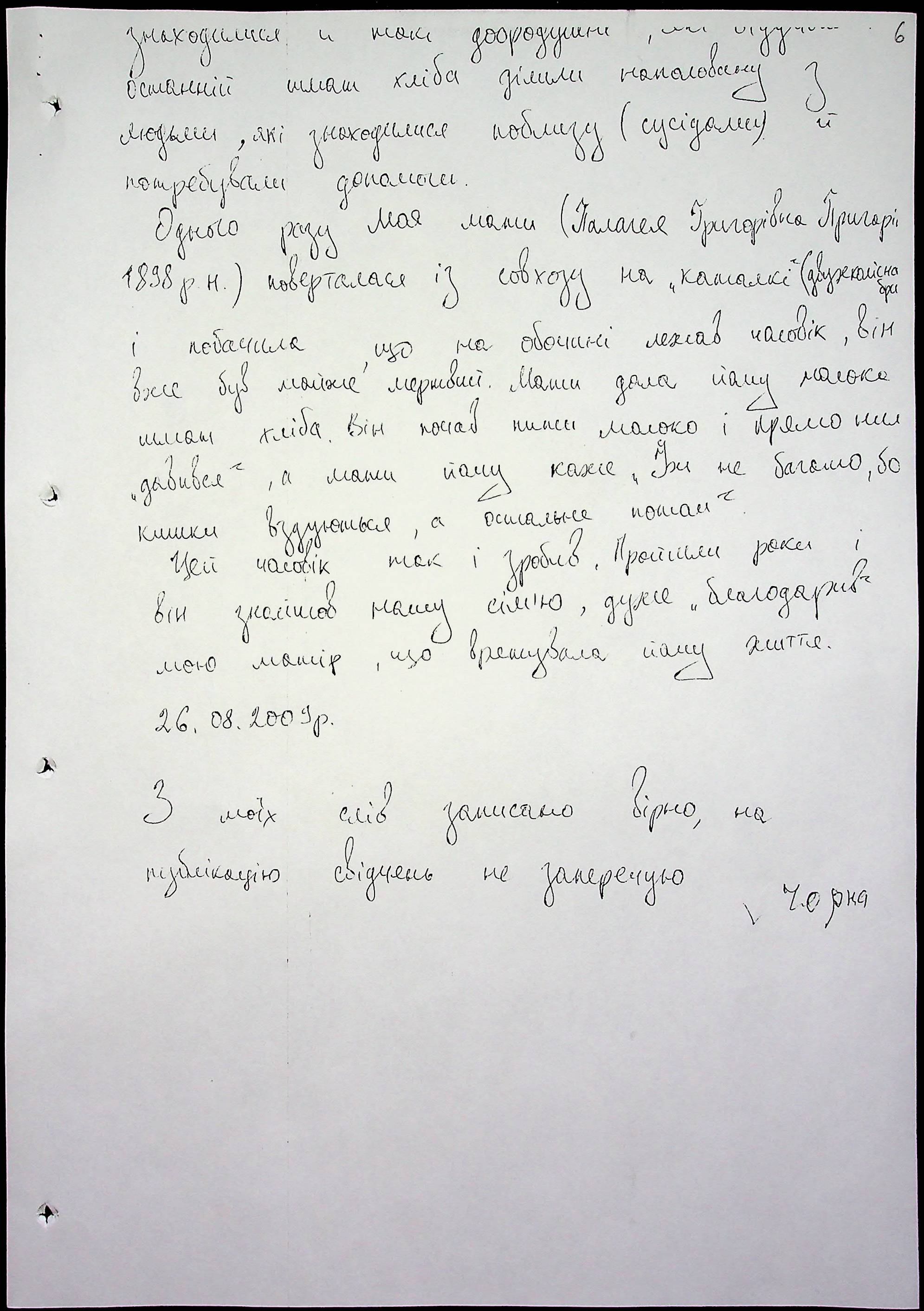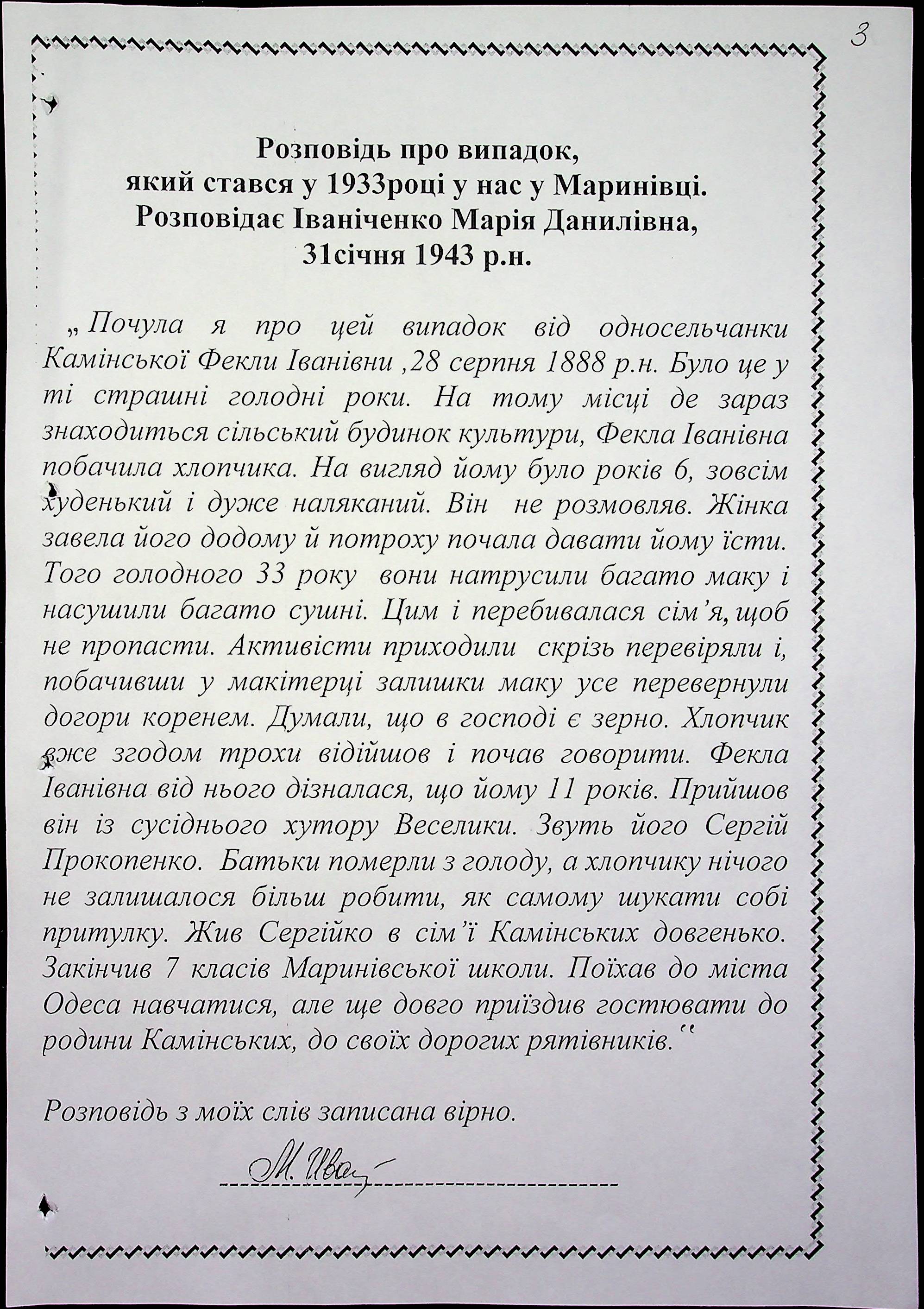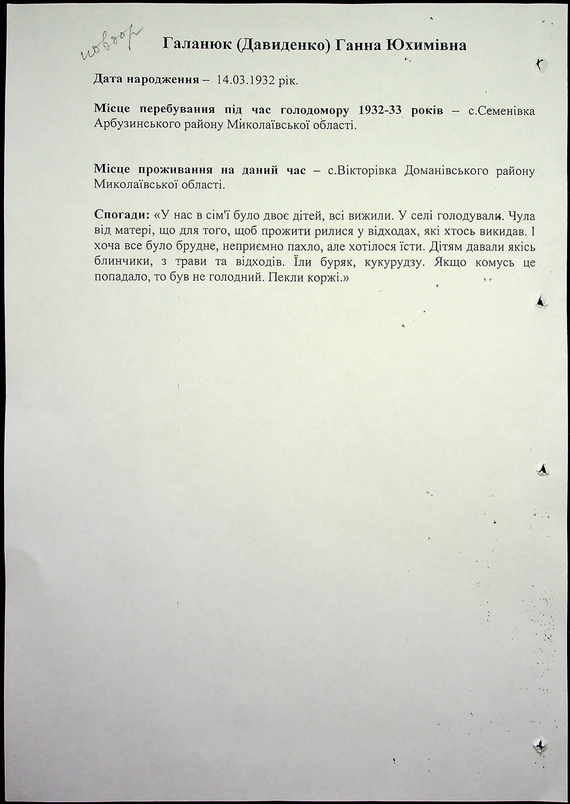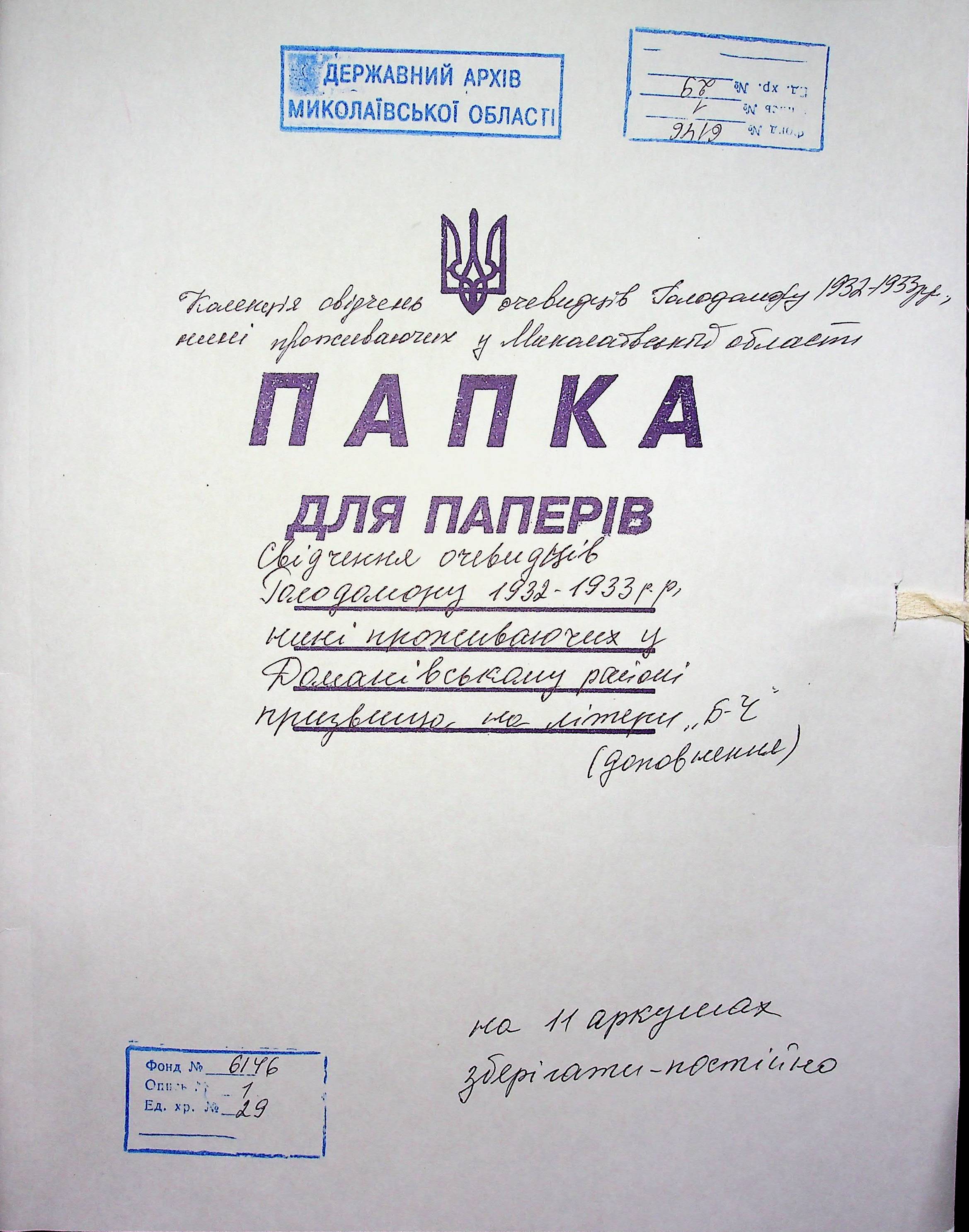 ◦ ◦ Фонд № 6146 “Колекція свідчень очевидців Голодомору 1932-1933 рр., нині проживаючих у Миколаївській області”