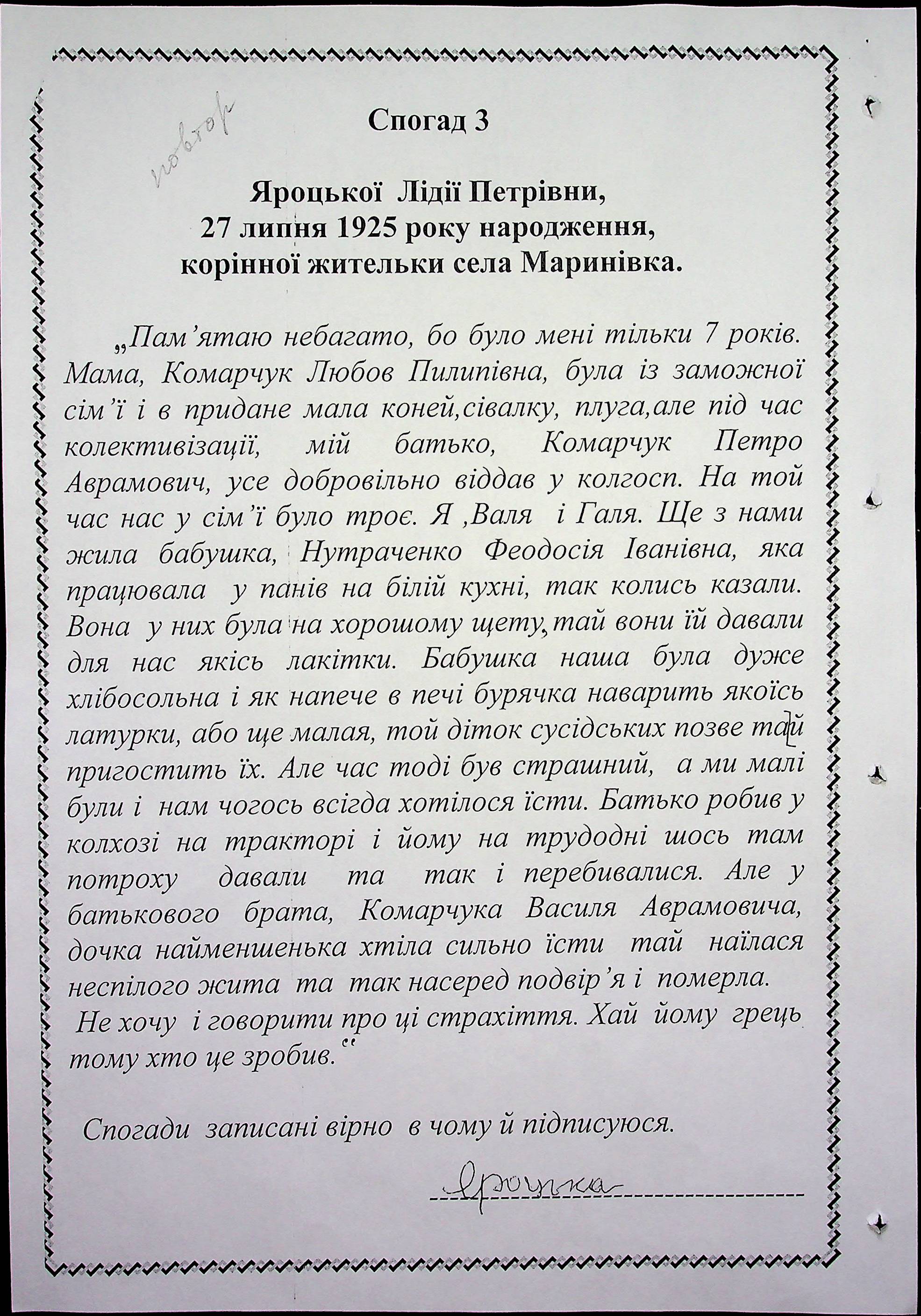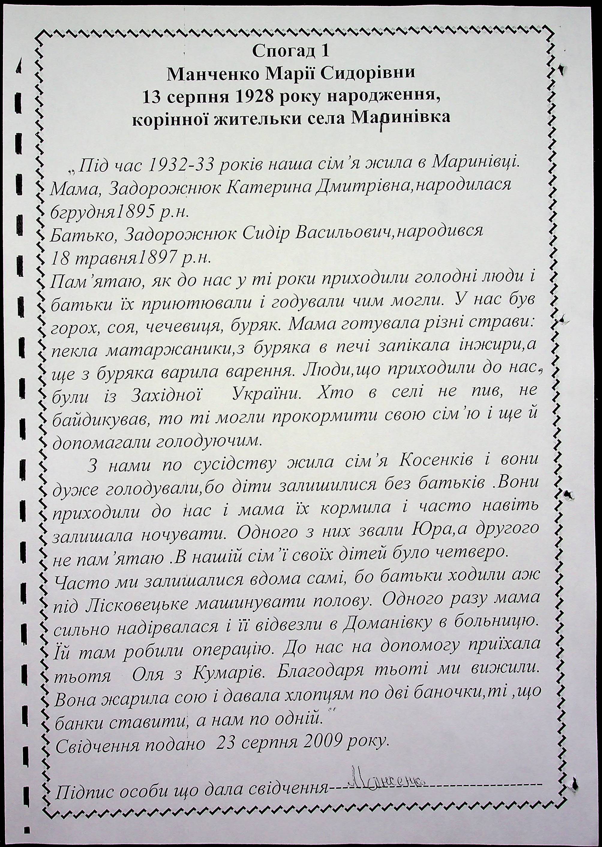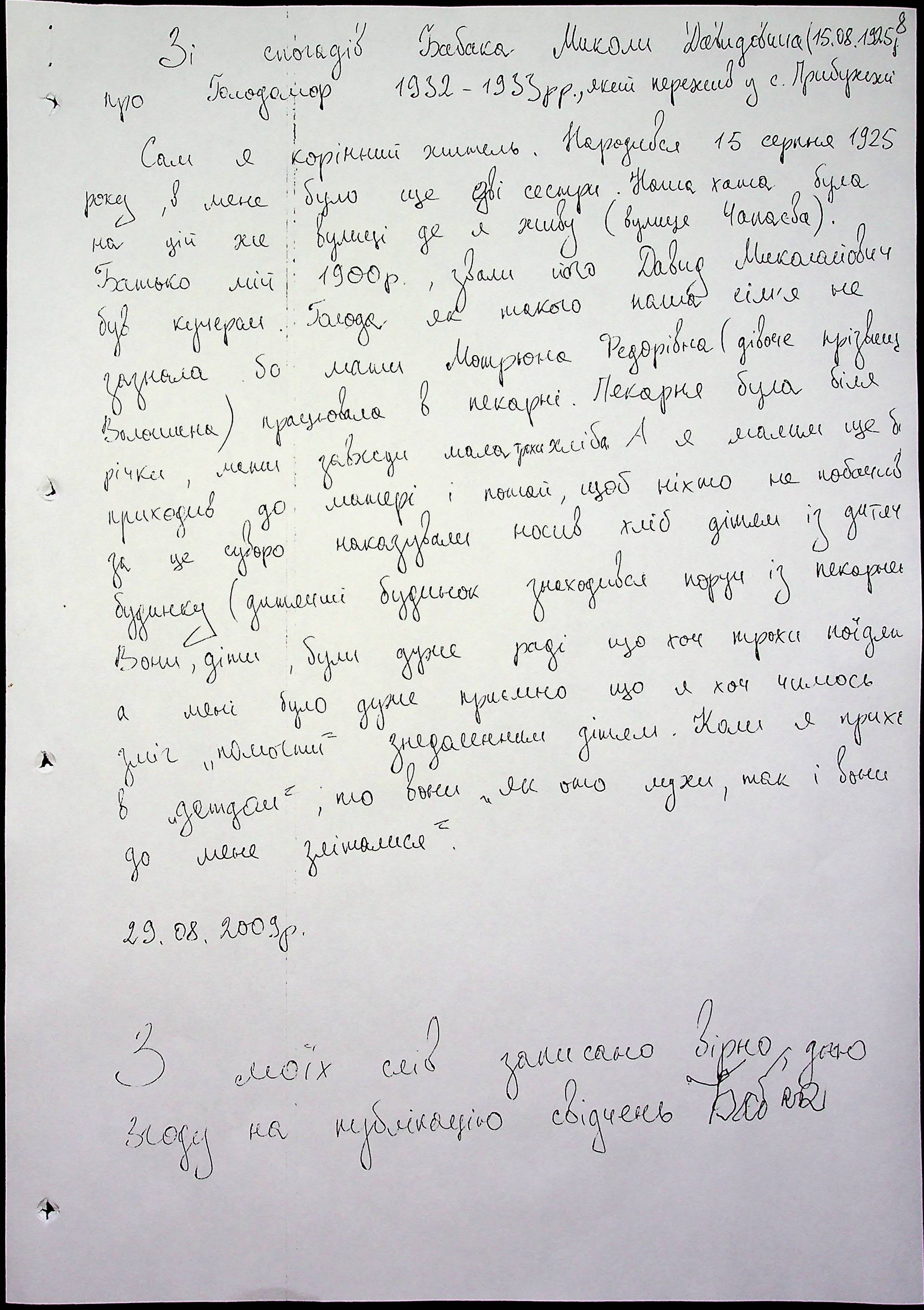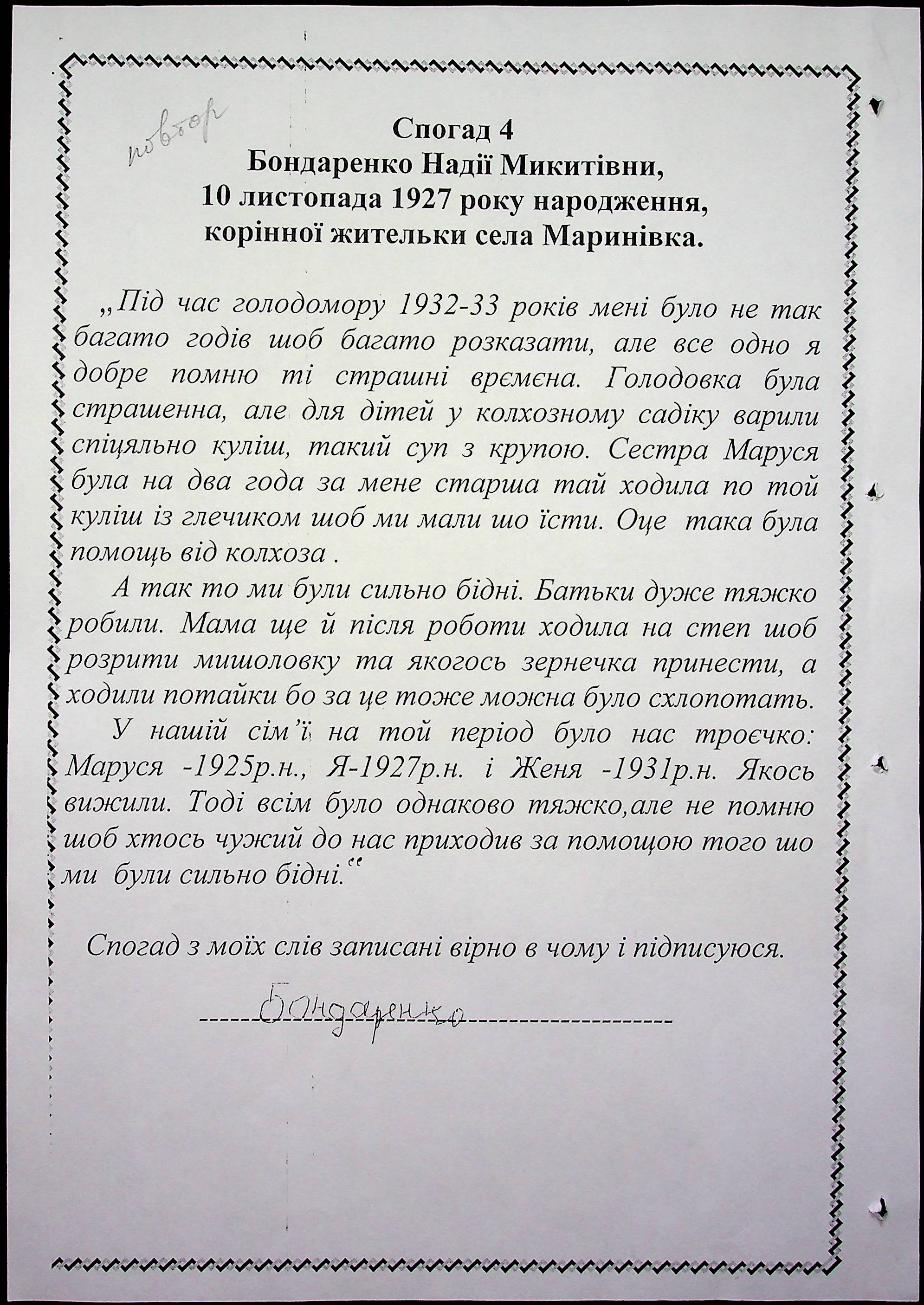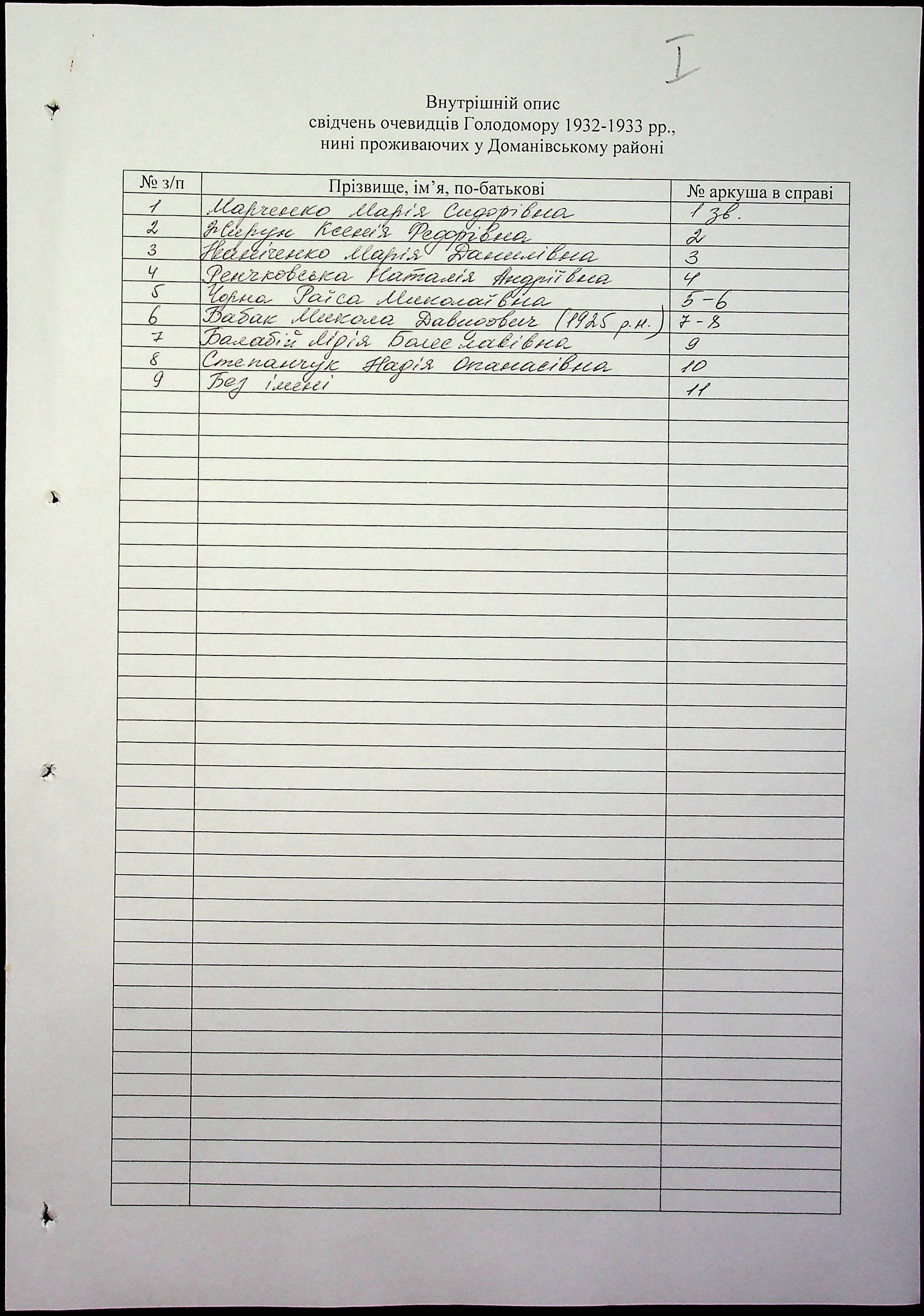 • • • • Справа № 29 “Свідчення очевидців Голодомору 1932-1933 років, які проживають у Доманівському районі, з прізвищами на літери Б-Ч (доповнення)”