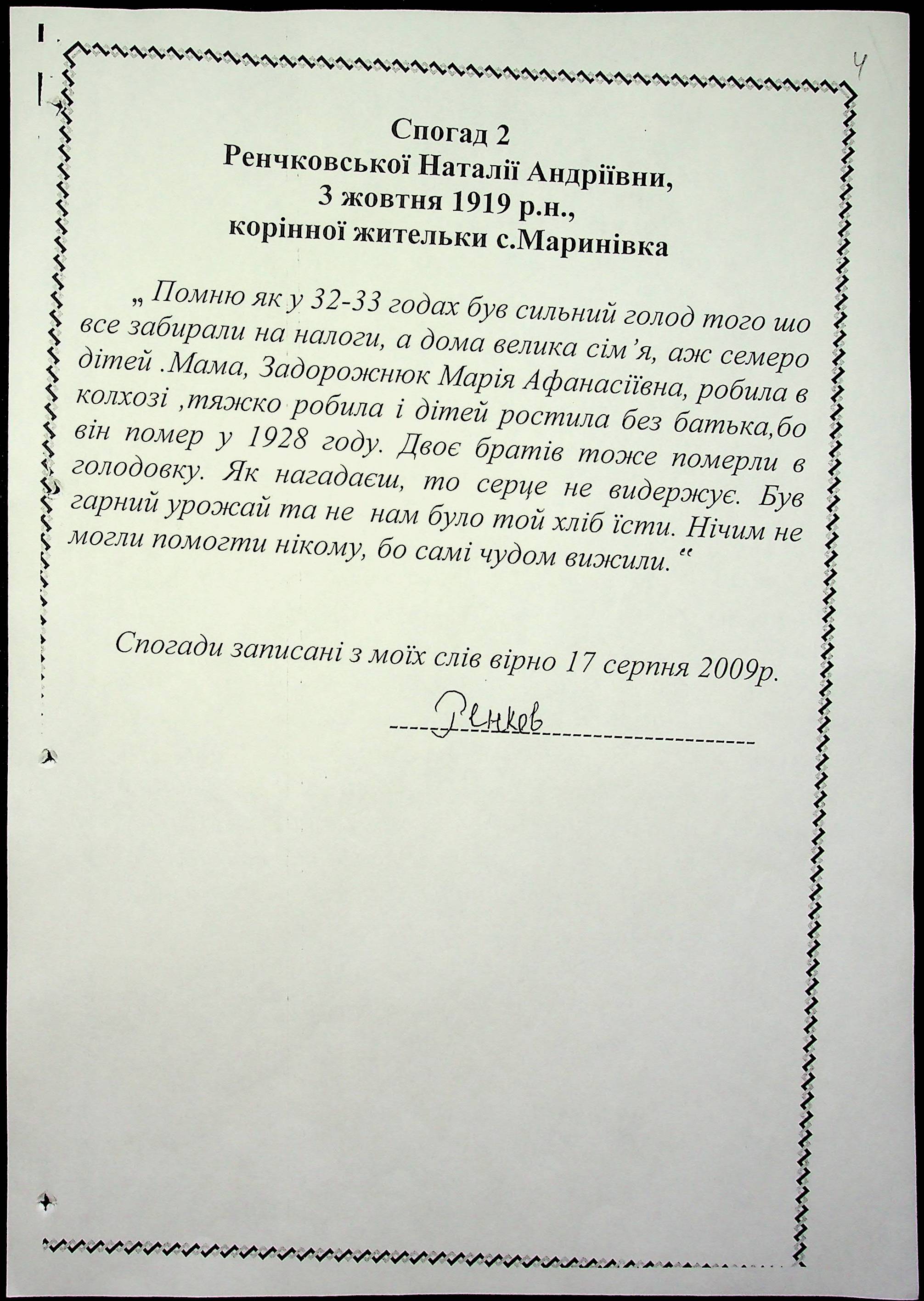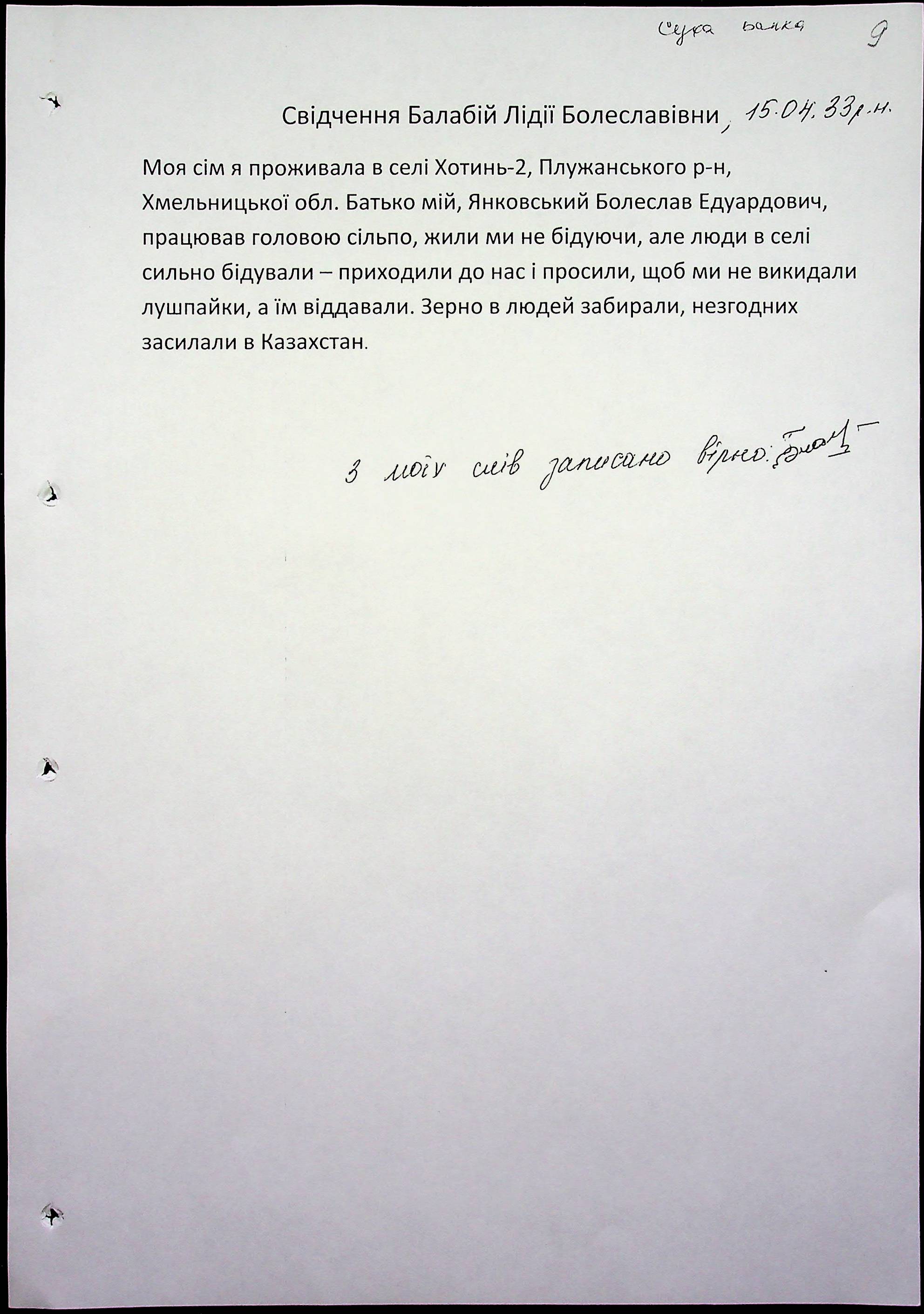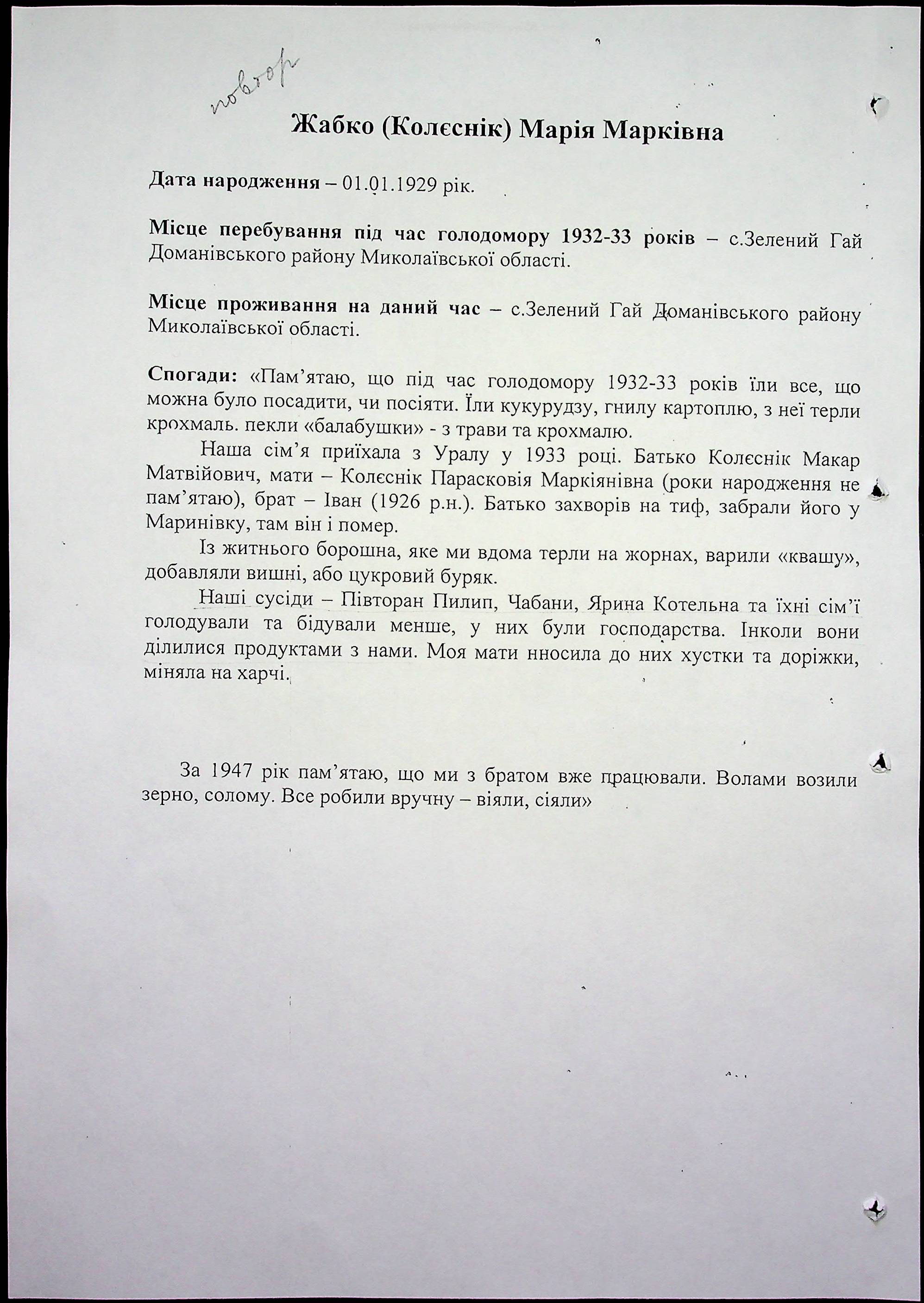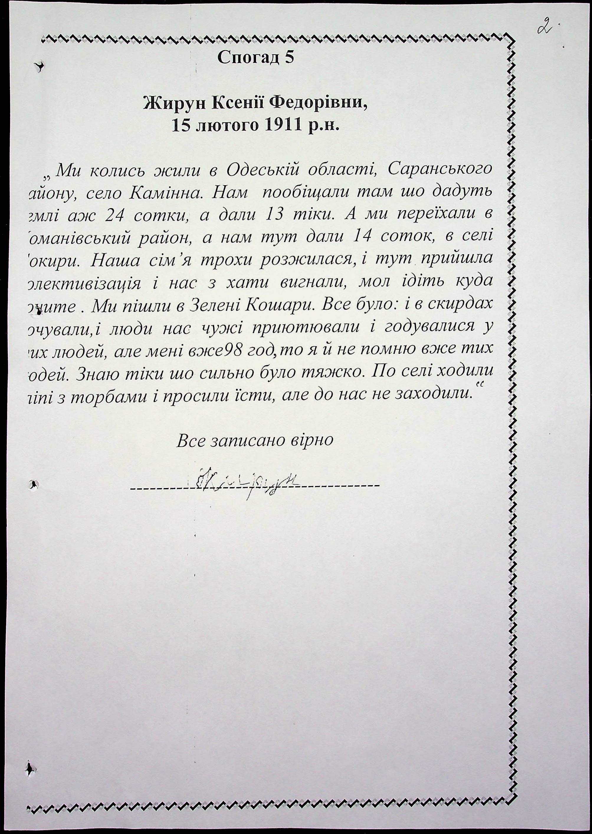 • • • • Справа № 29 “Свідчення очевидців Голодомору 1932-1933 років, які проживають у Доманівському районі, з прізвищами на літери Б-Ч (доповнення)”