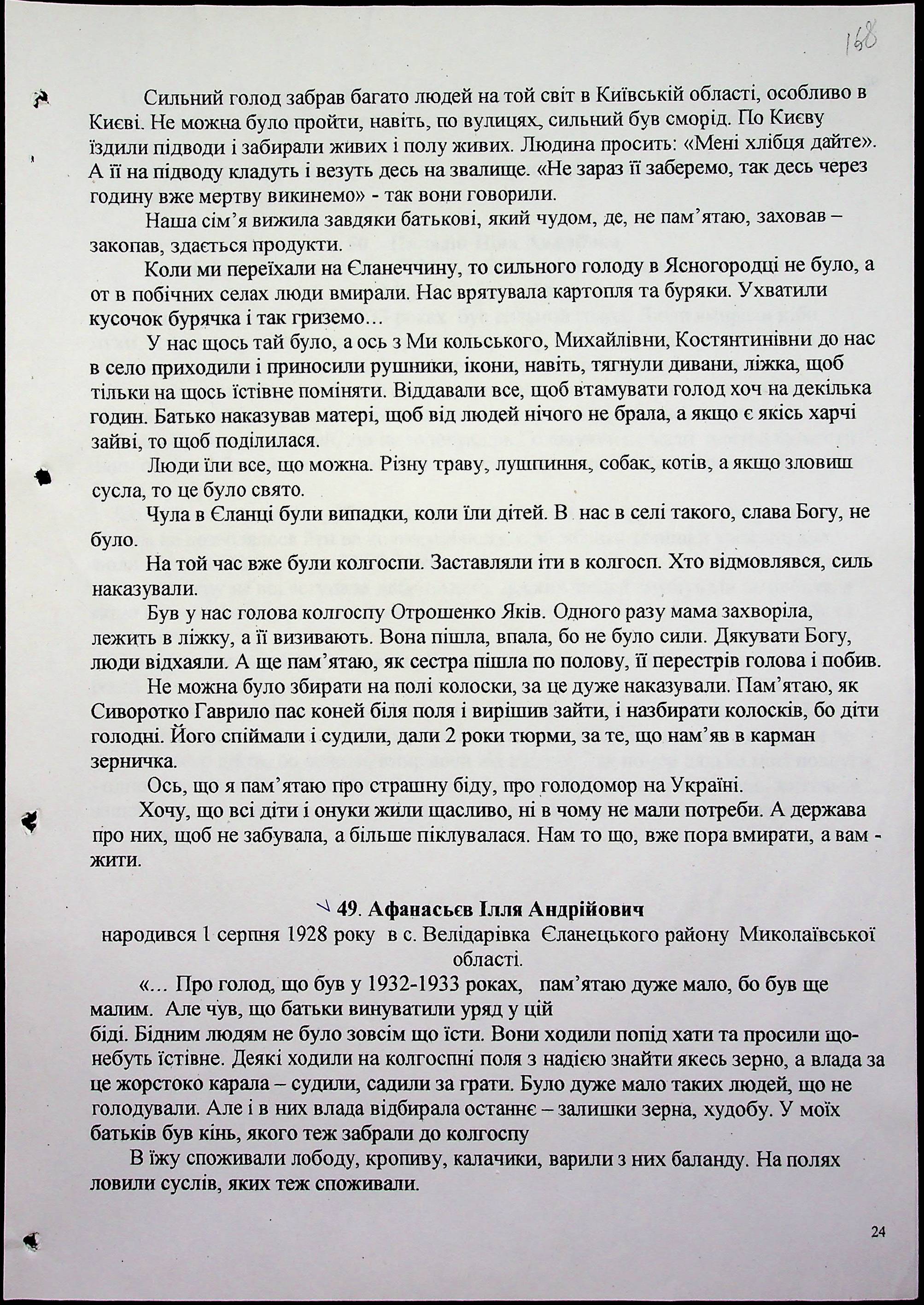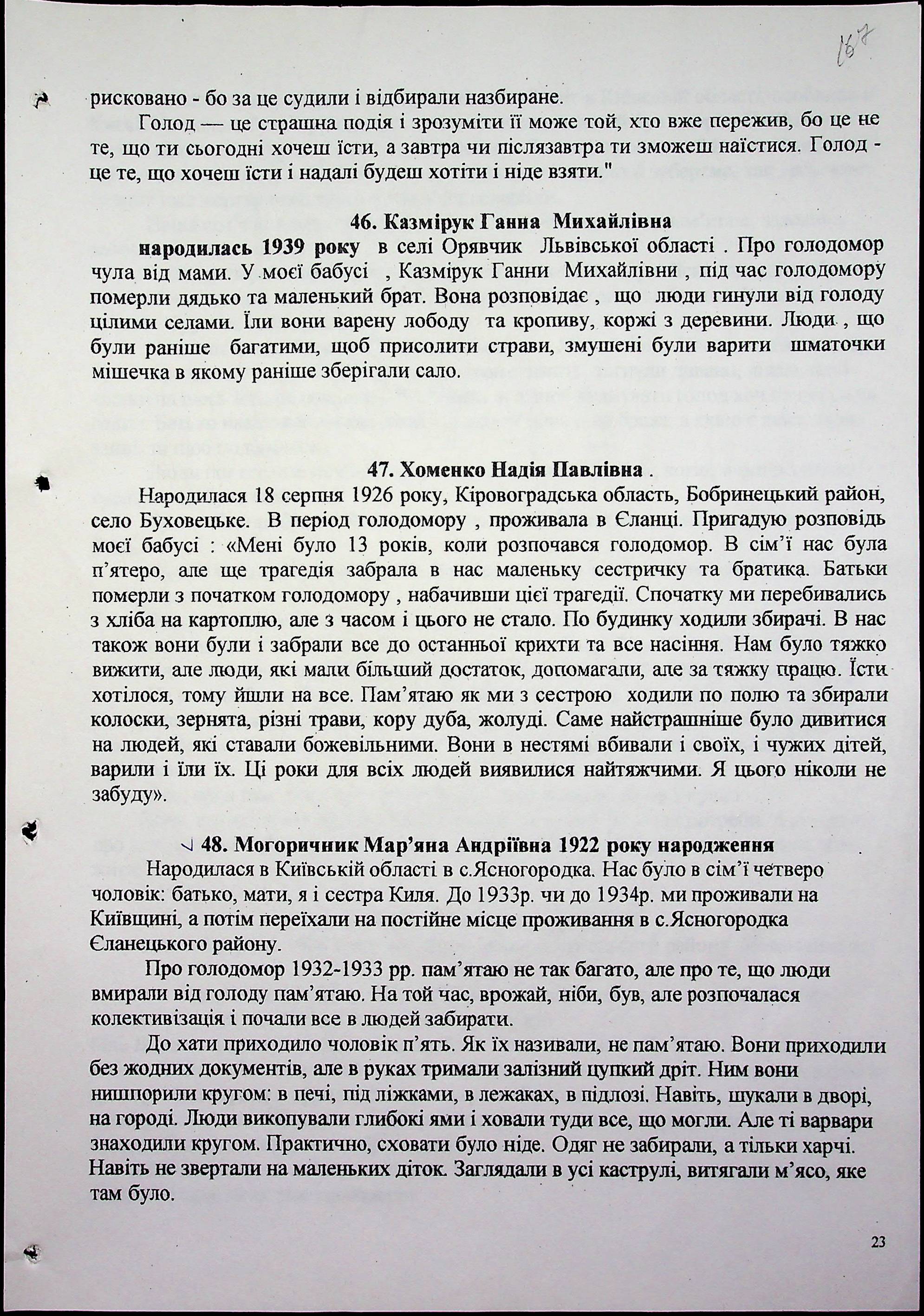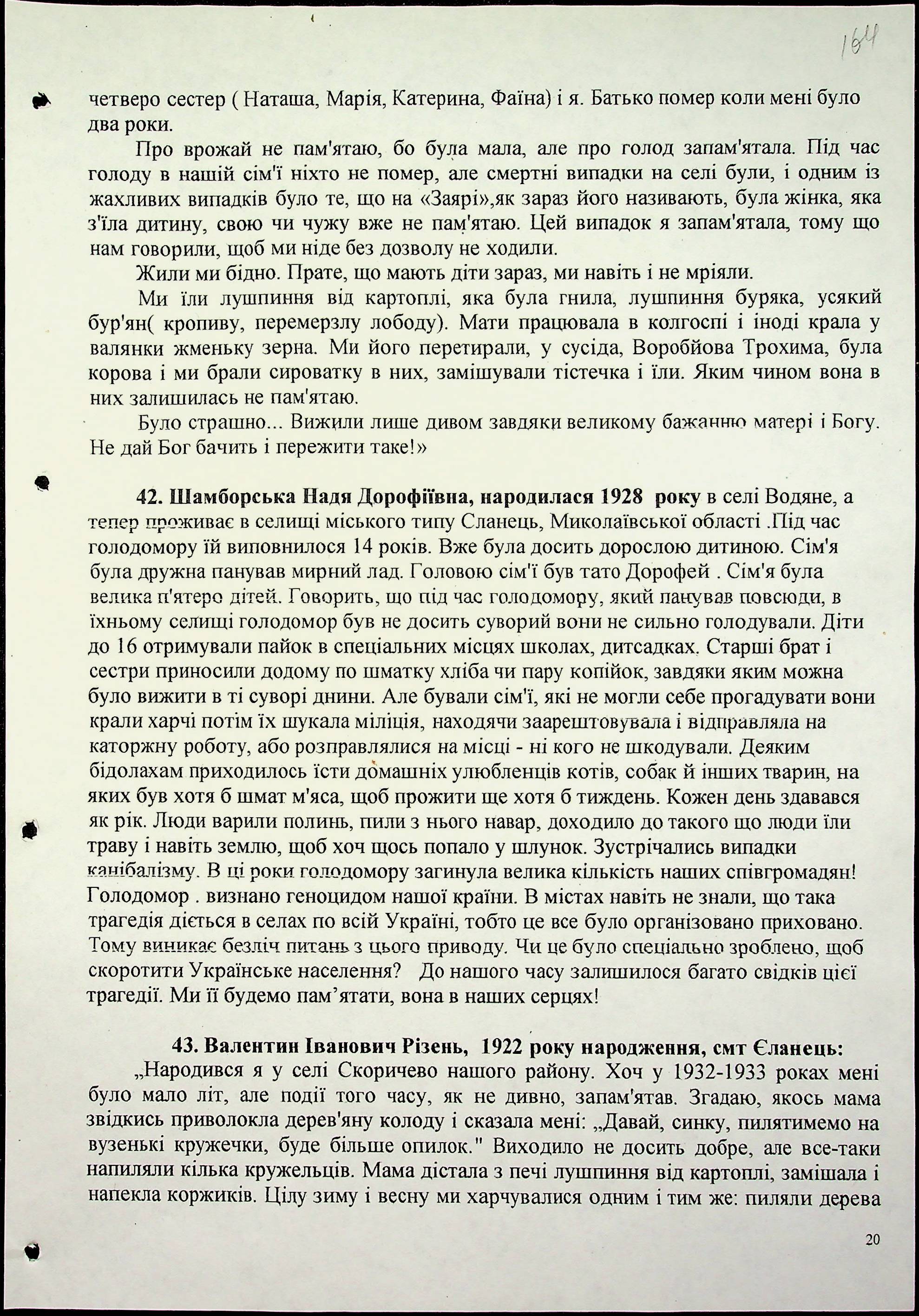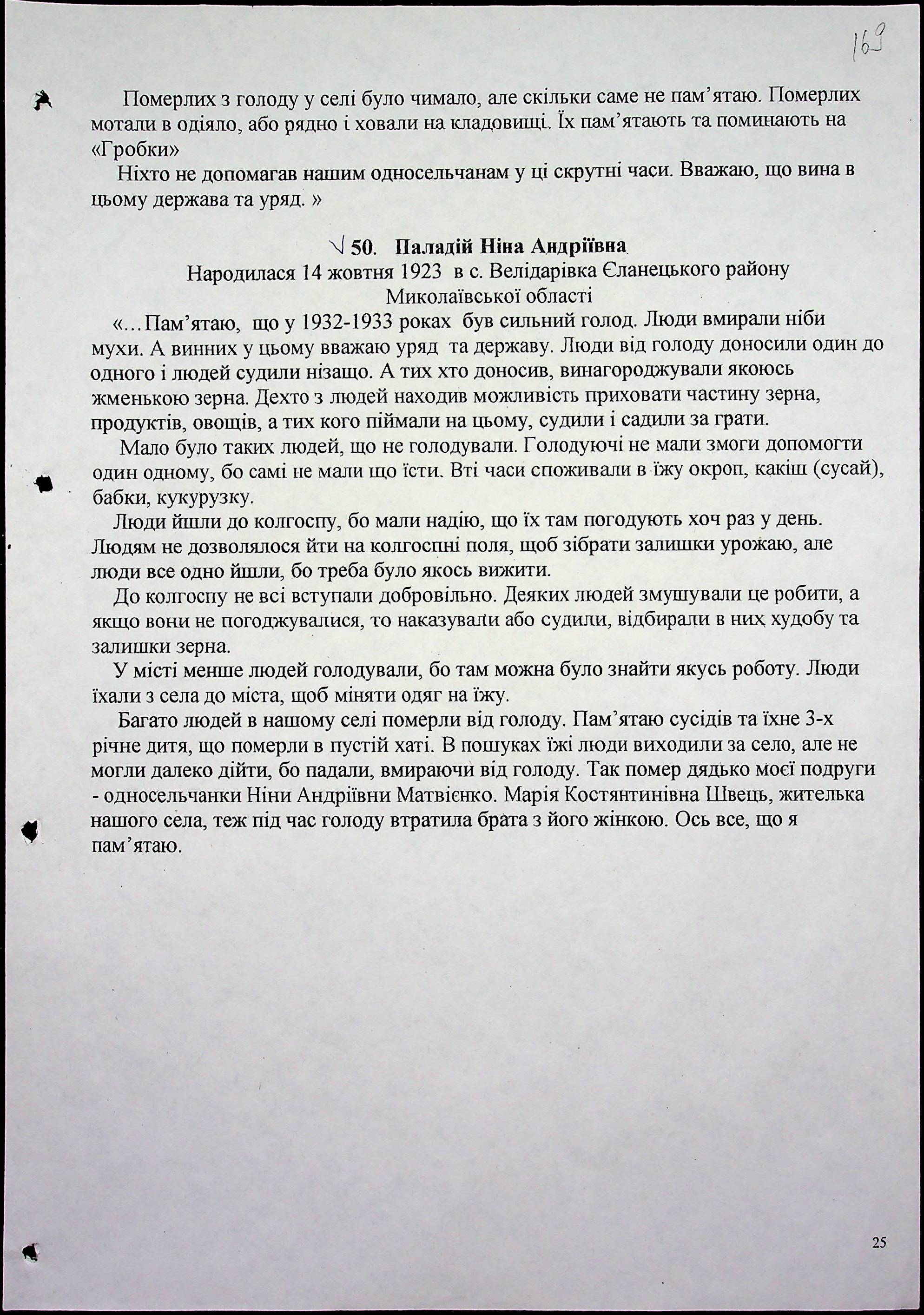 • • • • Справа № 30 “Свідчення очевидців Голодомору 1932-1933 років, які проживають в Єланецькому районі, з прізвищами на літери А-Ш (доповнення)”