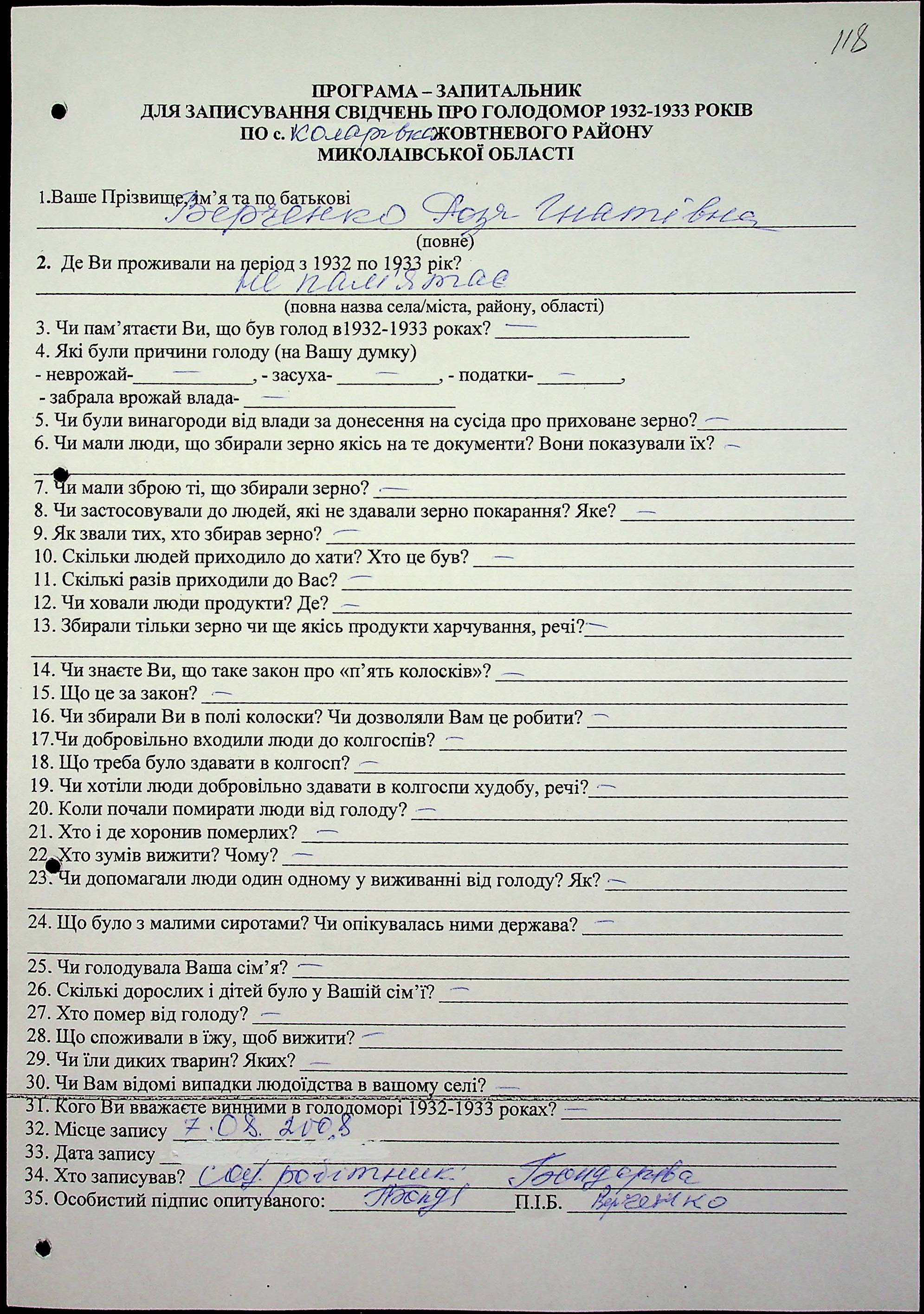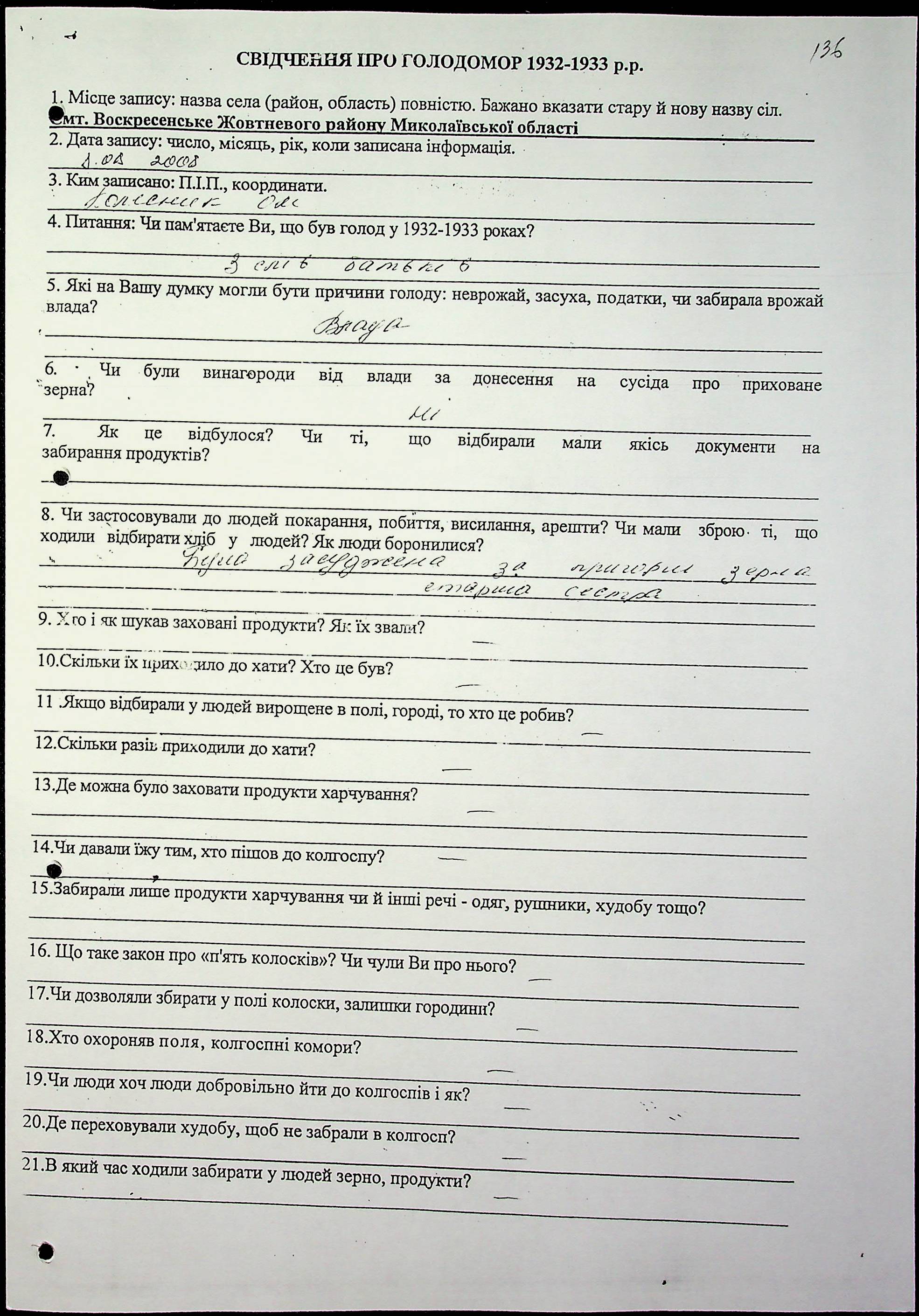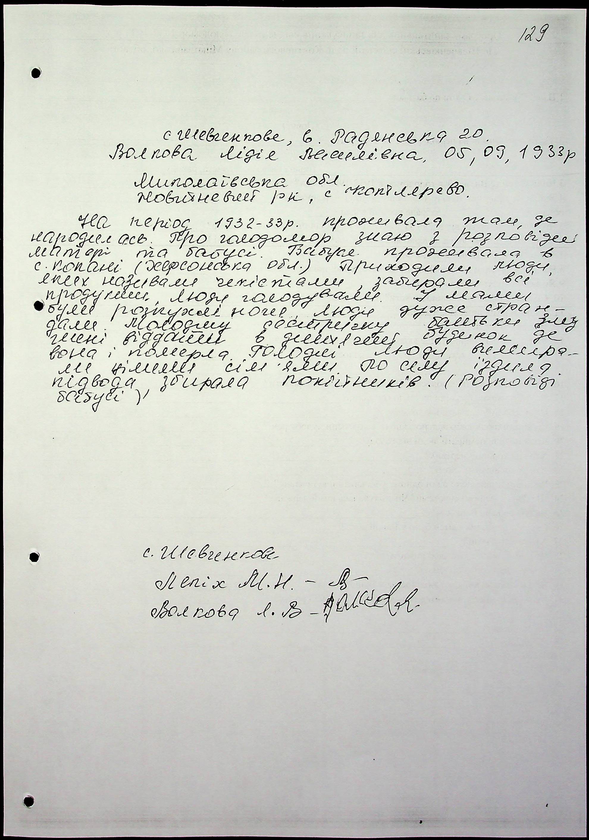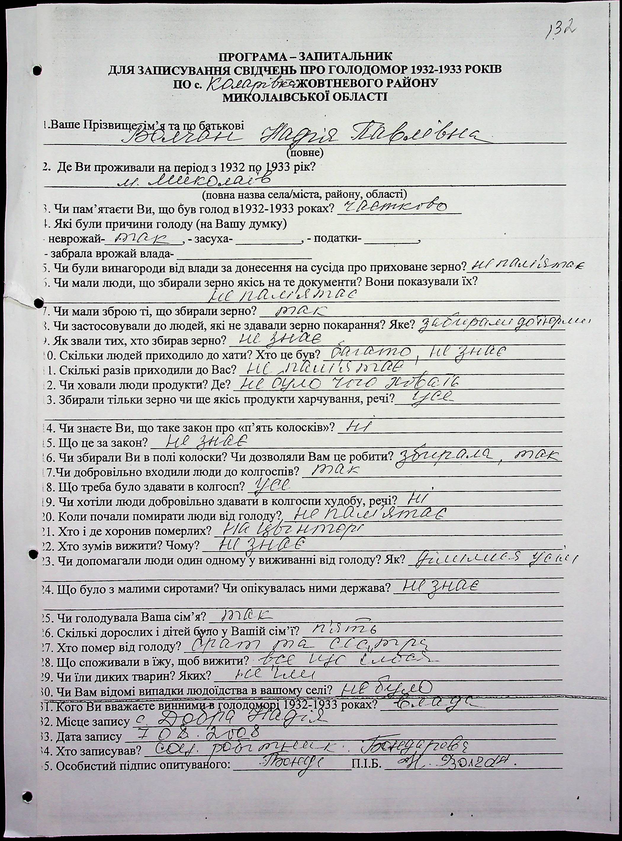 ◦ ◦ Фонд № 6146 “Колекція свідчень очевидців Голодомору 1932-1933 рр., нині проживаючих у Миколаївській області”