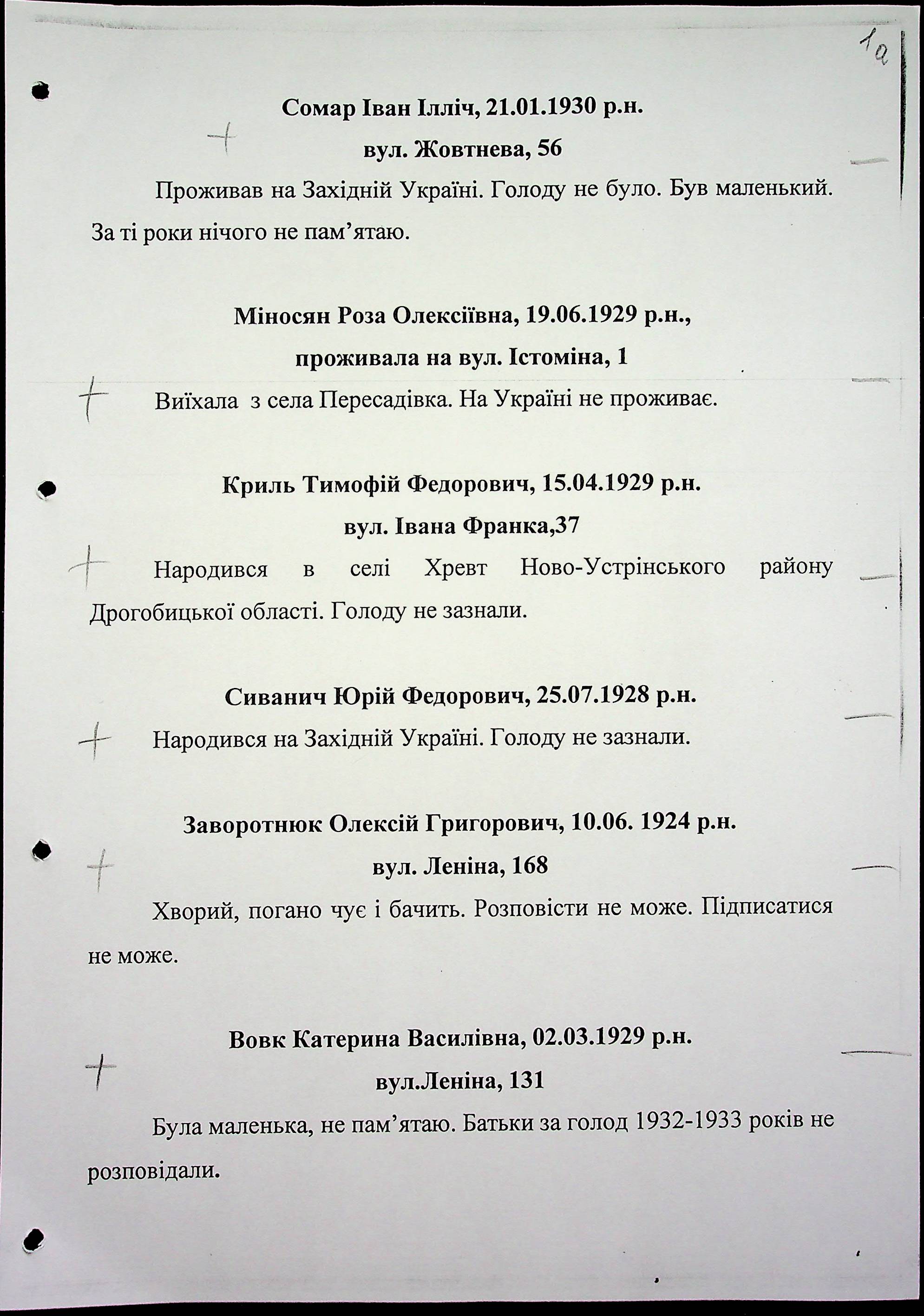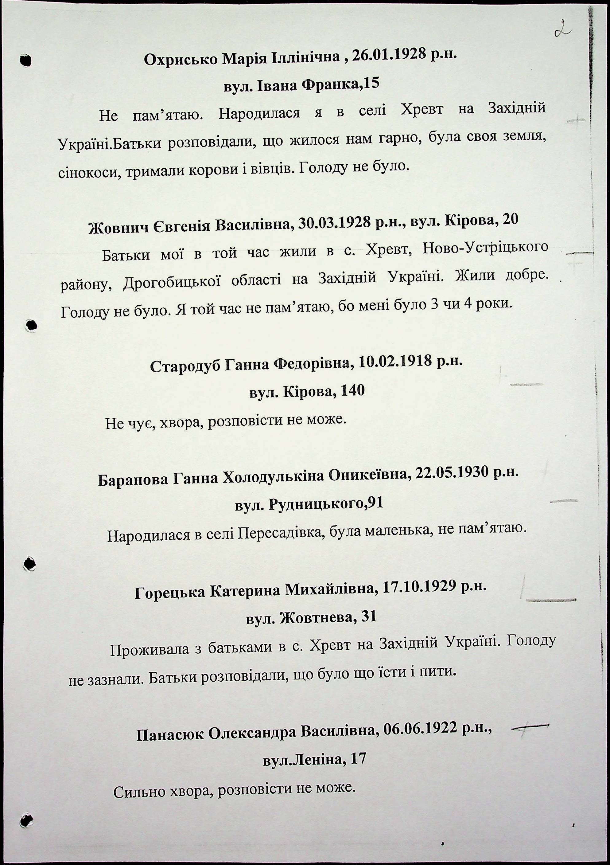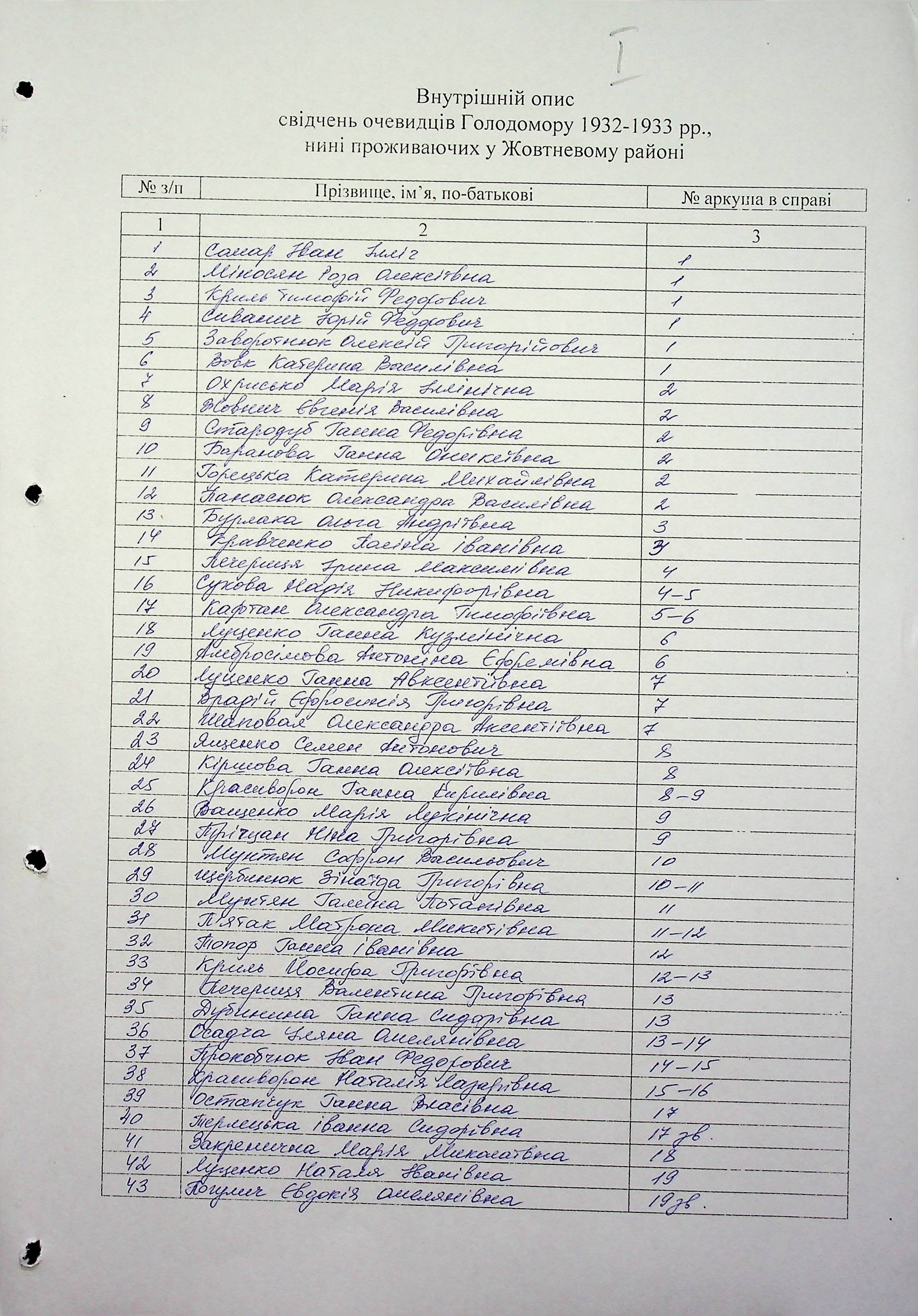 • • • • Справа № 35 “Свідчення очевидців Голодомору 1932-1933 років, які проживають у Жовтневому районі, з прізвищами на літери А–Я (доповнення). Том 1”