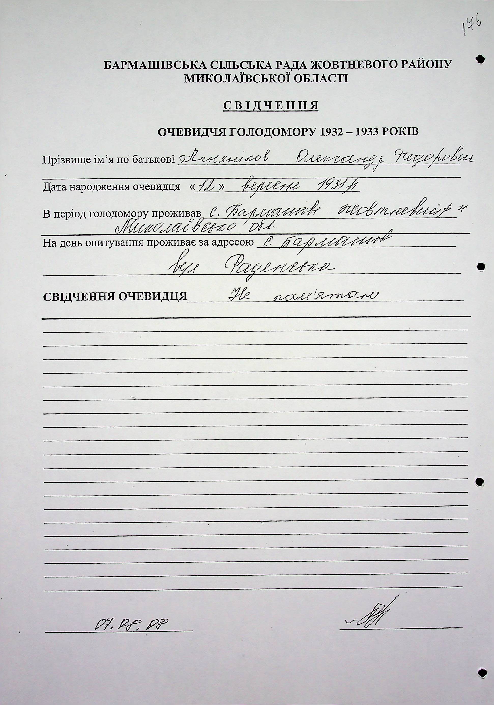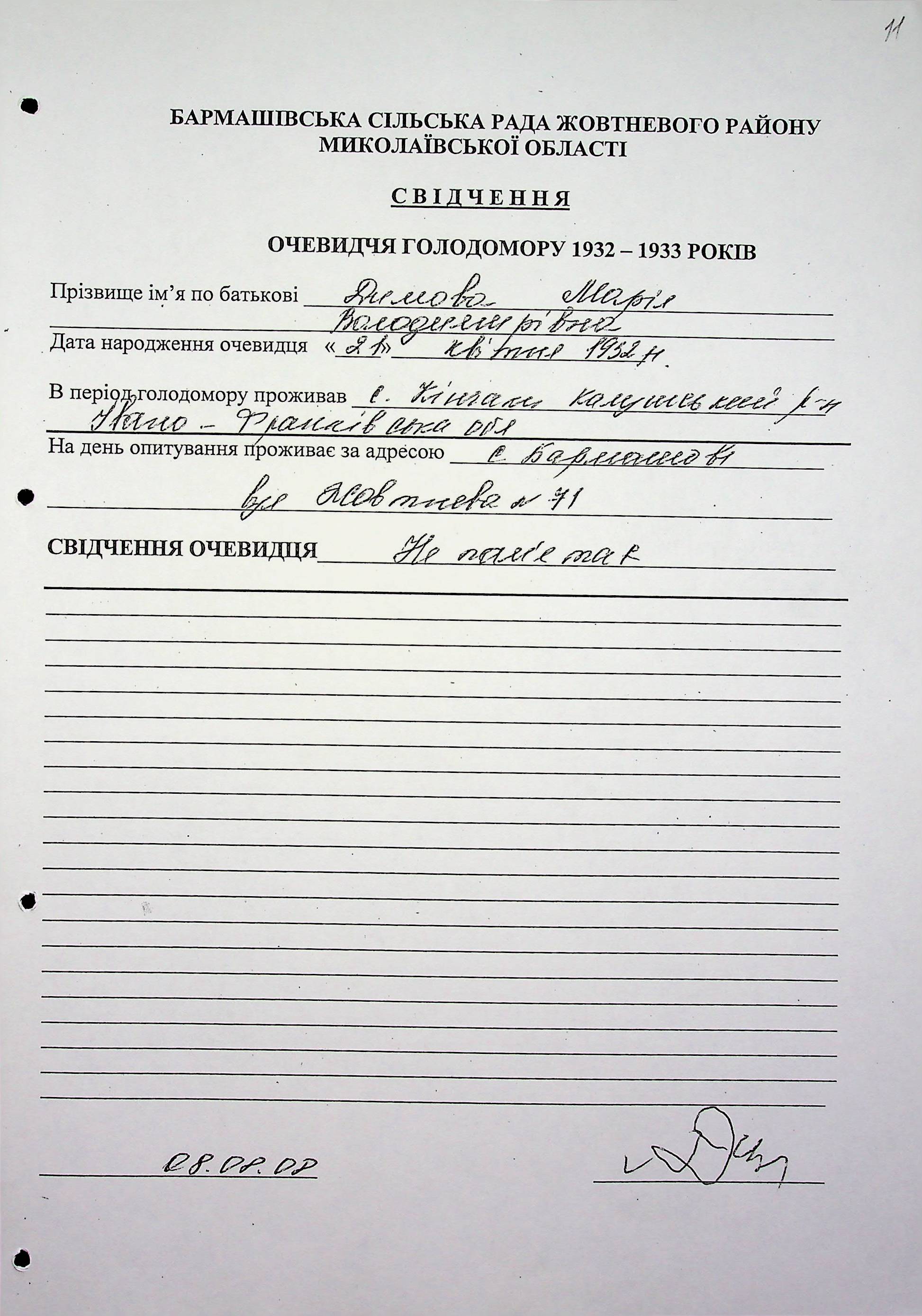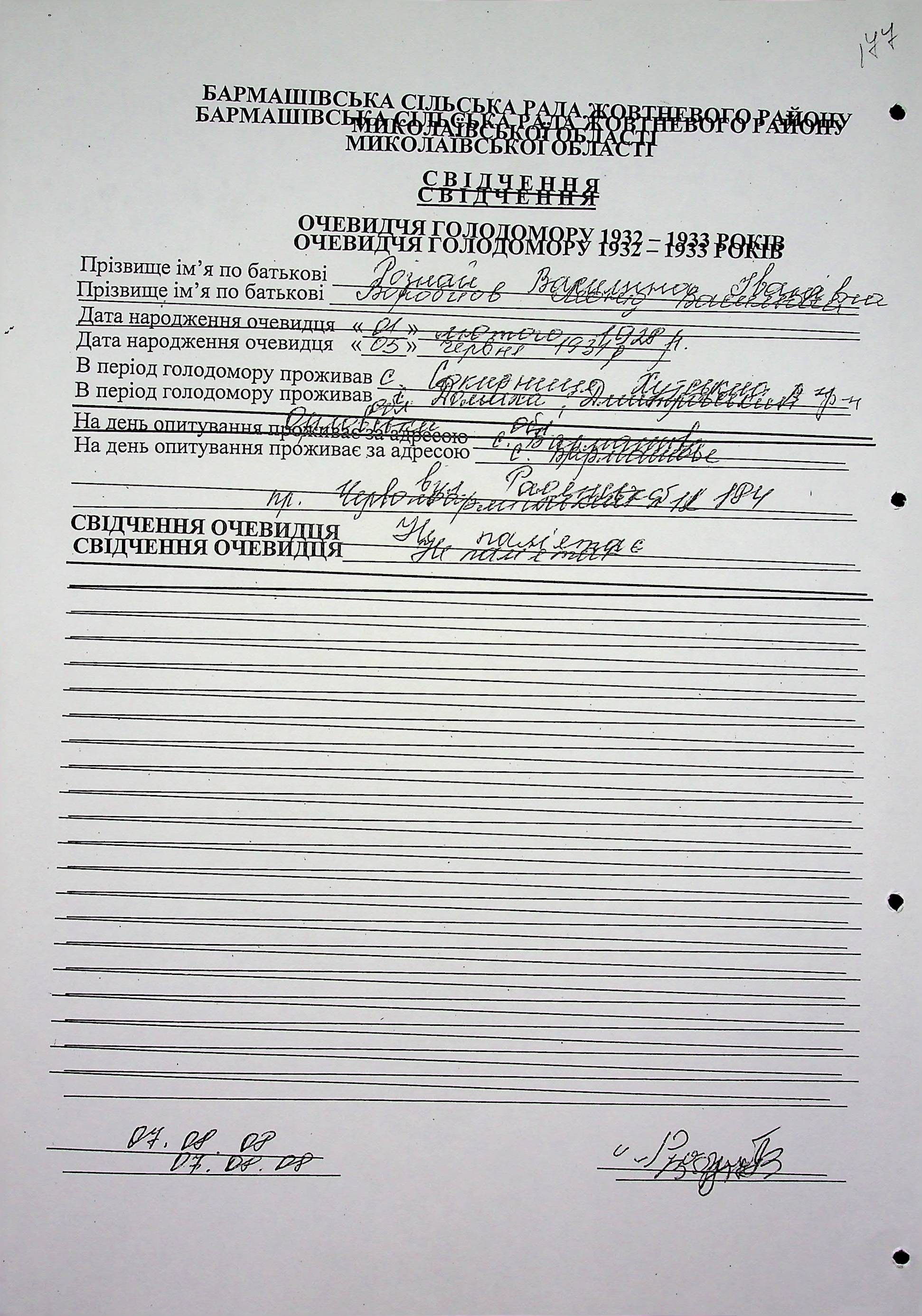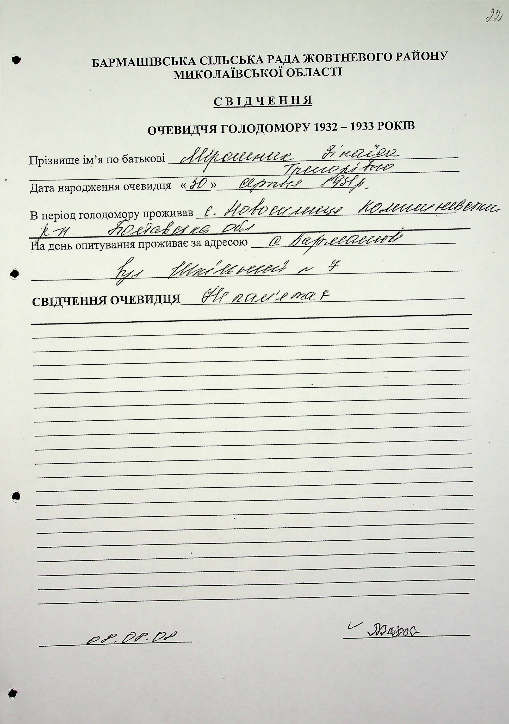 ◦ ◦ Фонд № 6146 “Колекція свідчень очевидців Голодомору 1932-1933 рр., нині проживаючих у Миколаївській області”