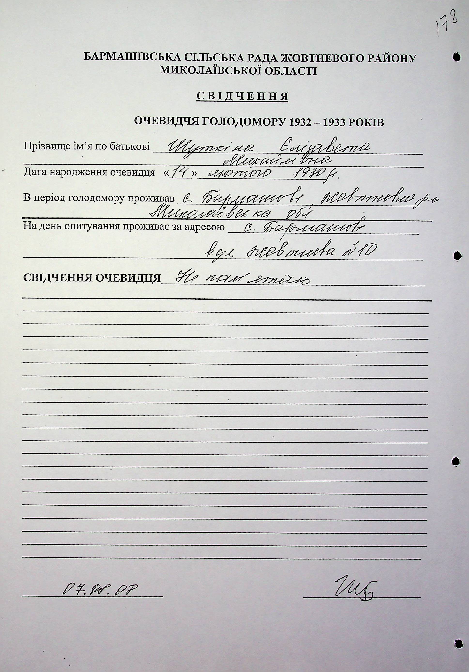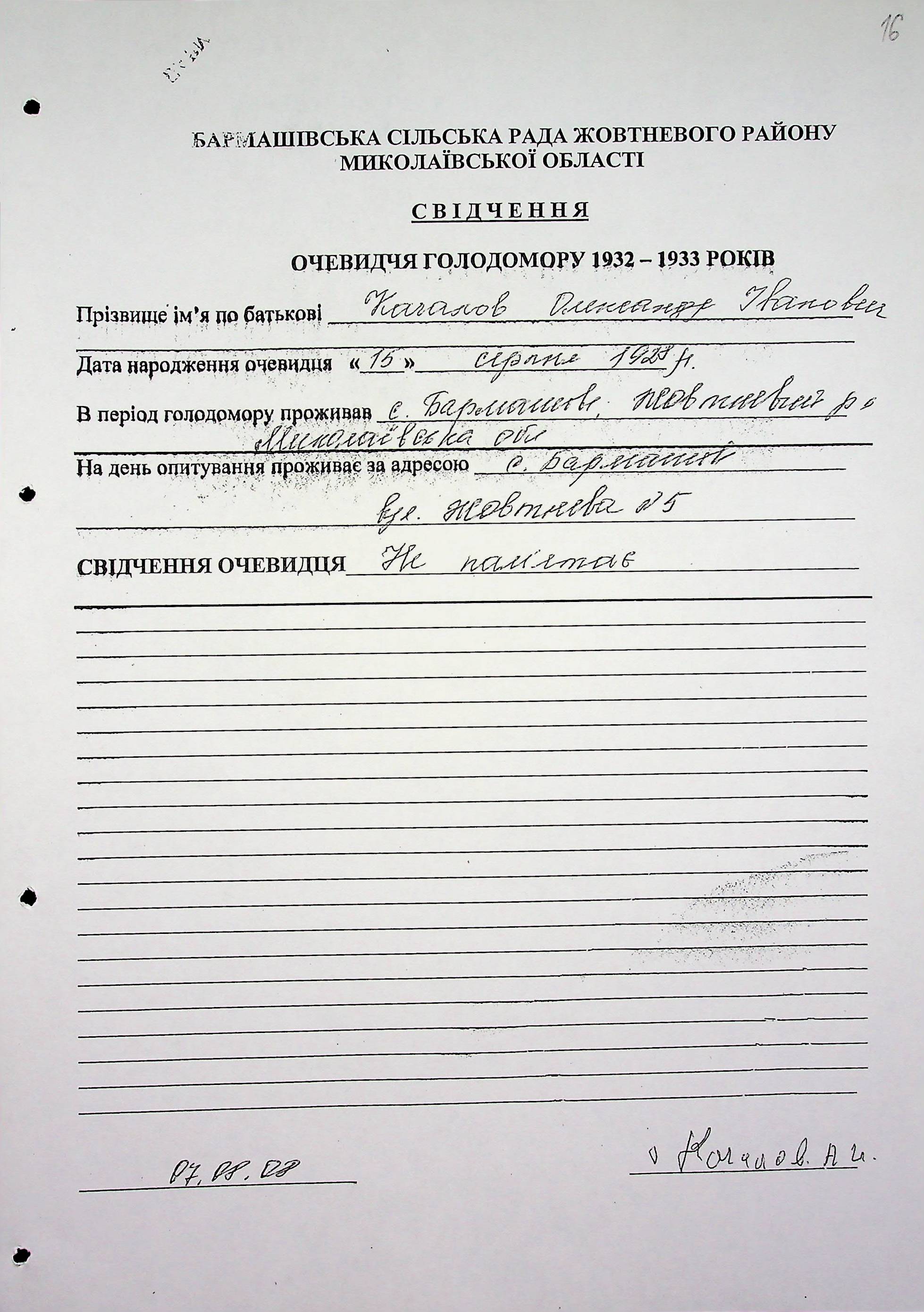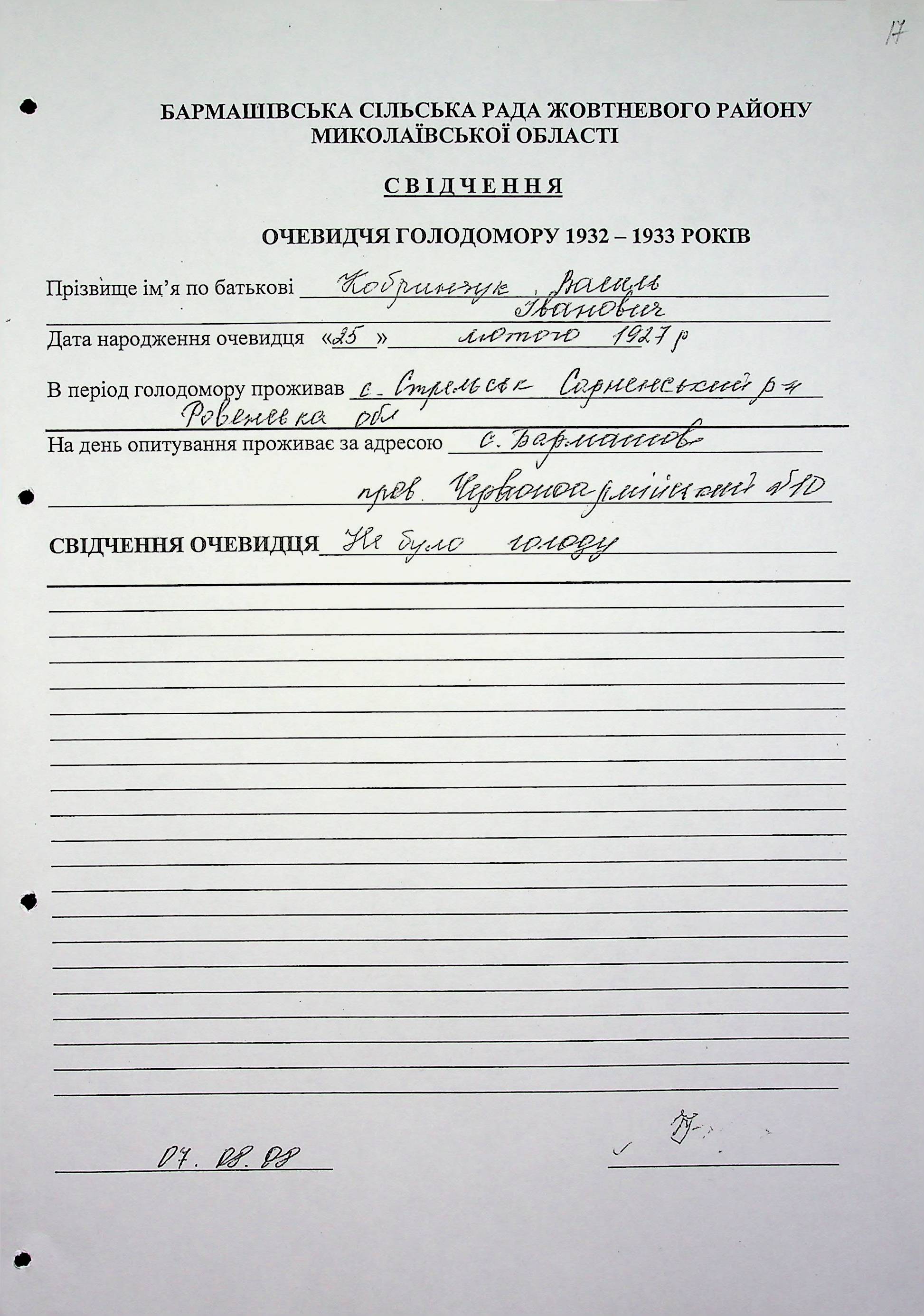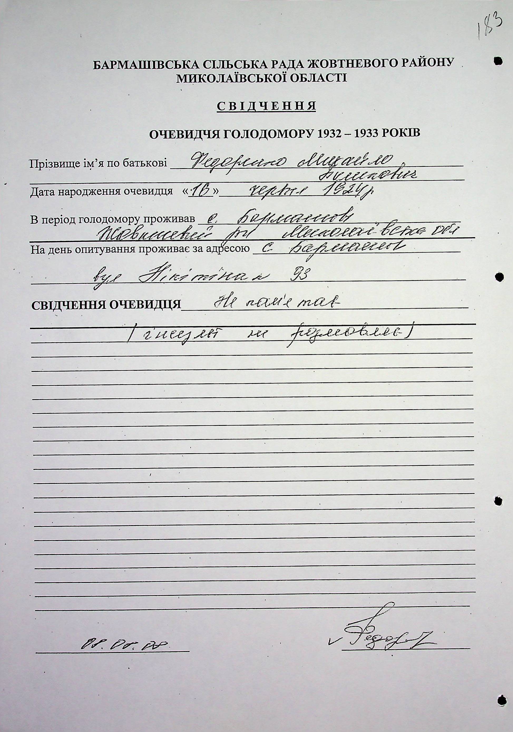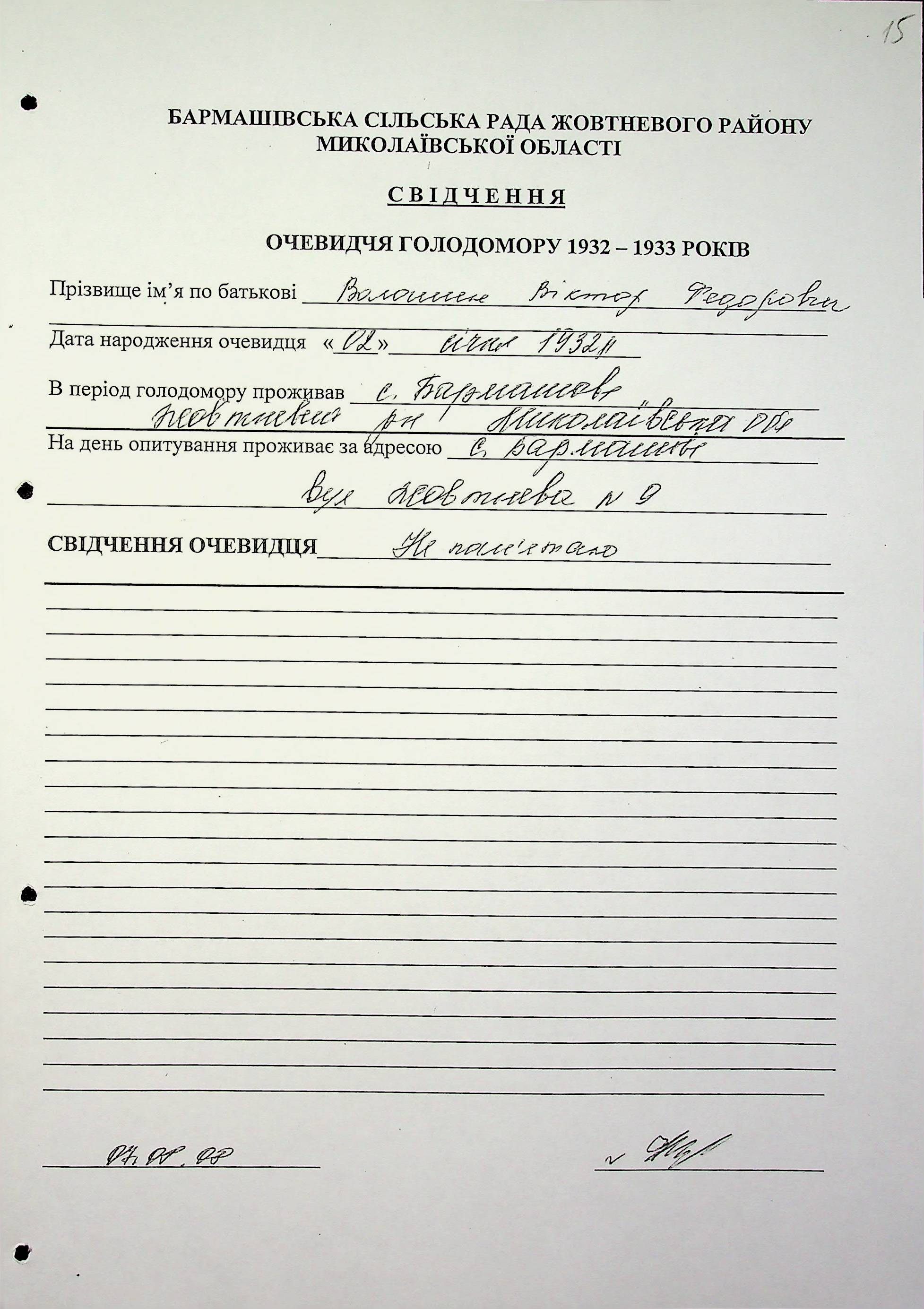 ◦ ◦ Фонд № 6146 “Колекція свідчень очевидців Голодомору 1932-1933 рр., нині проживаючих у Миколаївській області”