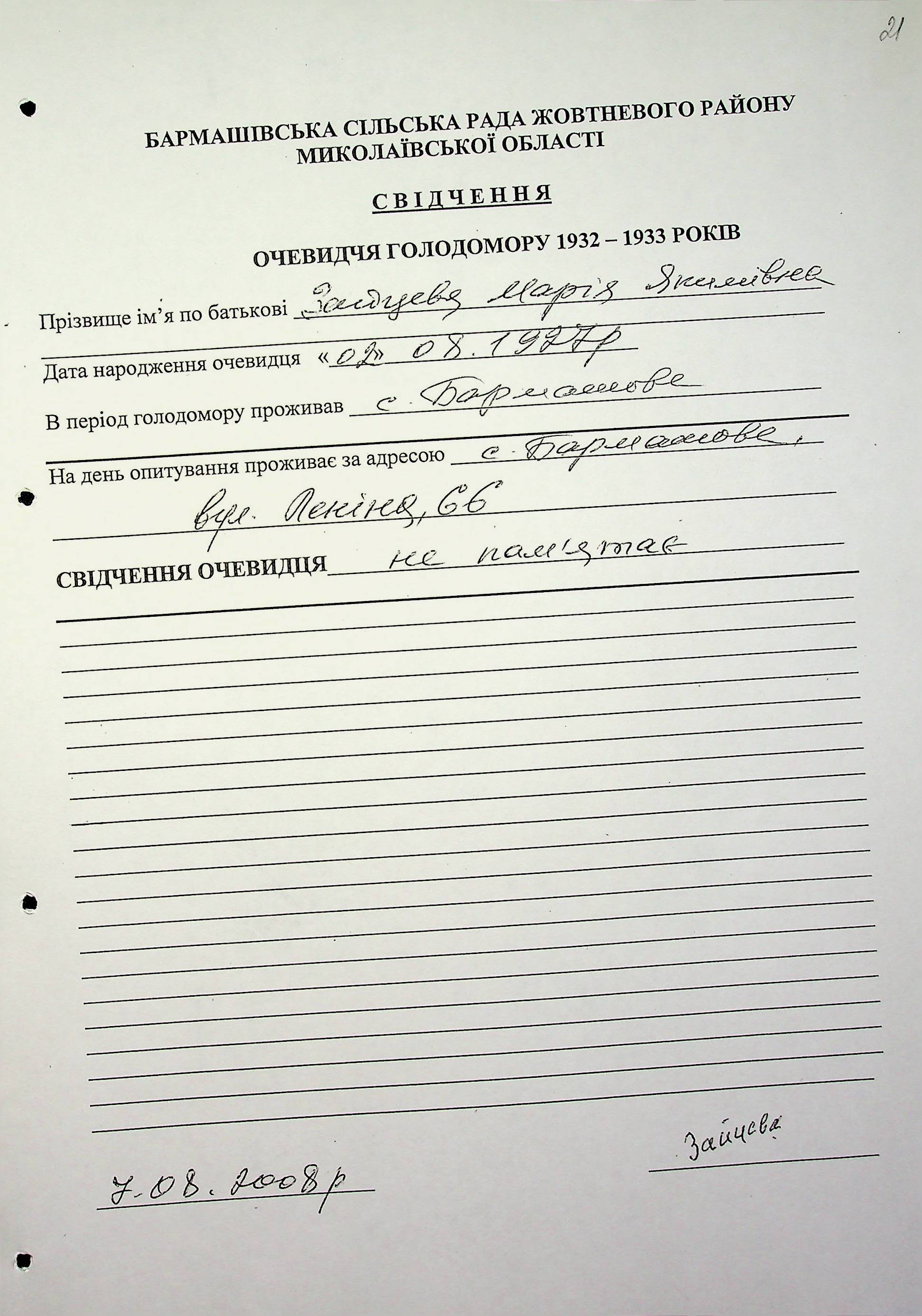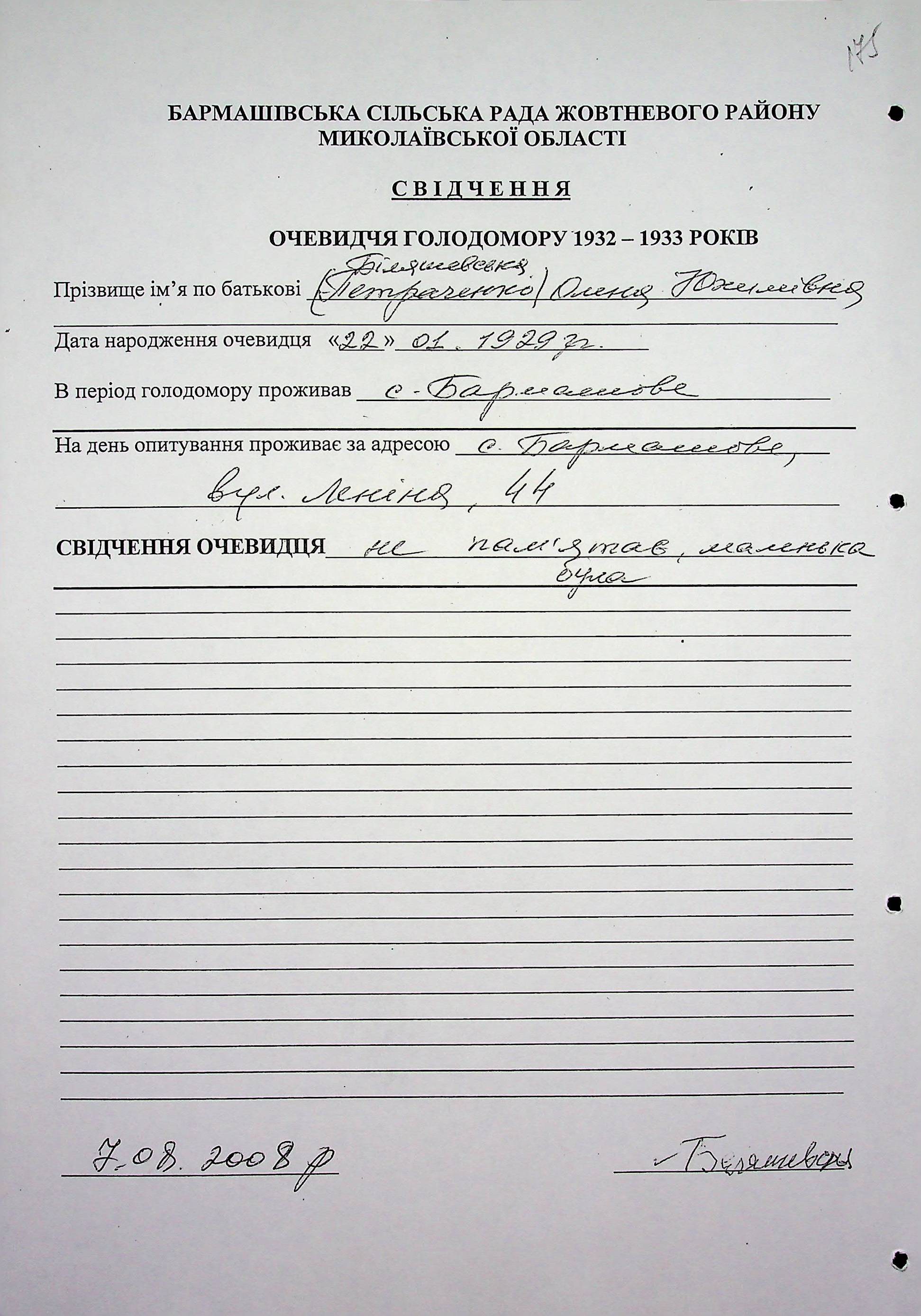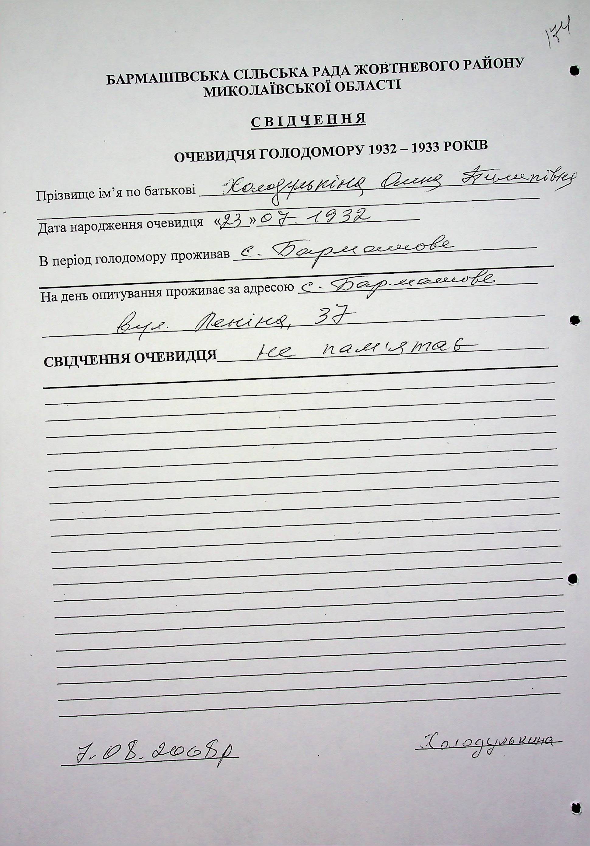 • • • • Справа № 36 “Свідчення очевидців Голодомору 1932-1933 років, які проживають у Жовтневому районі, з прізвищами на літери А–Я (доповнення). Том 2”