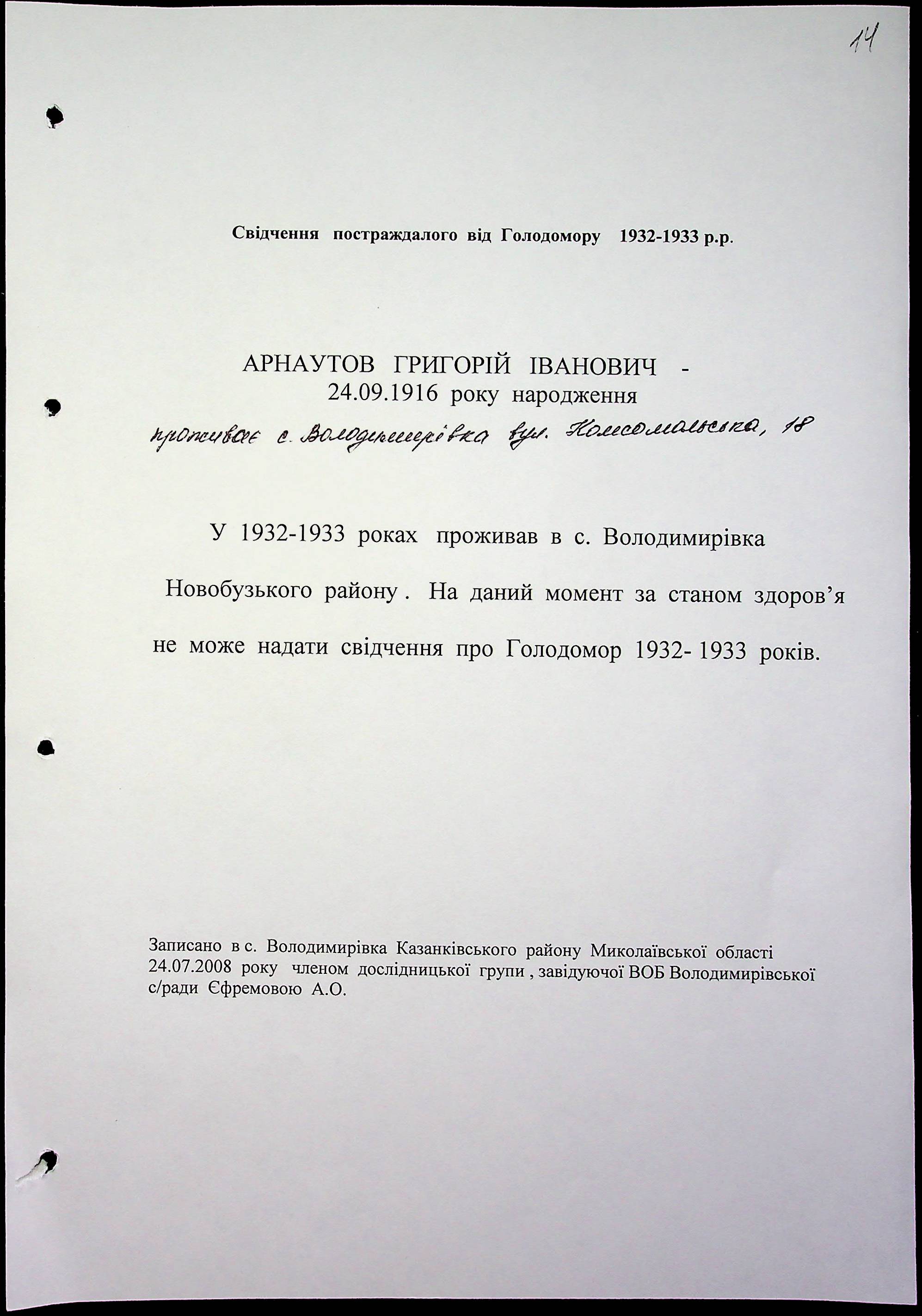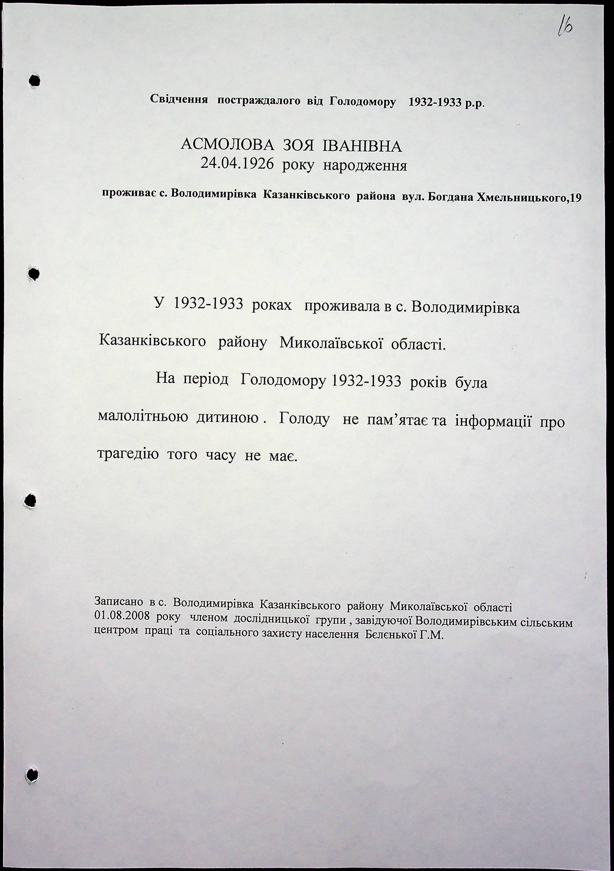 ◦ ◦ Фонд № 6146 “Колекція свідчень очевидців Голодомору 1932-1933 рр., нині проживаючих у Миколаївській області”