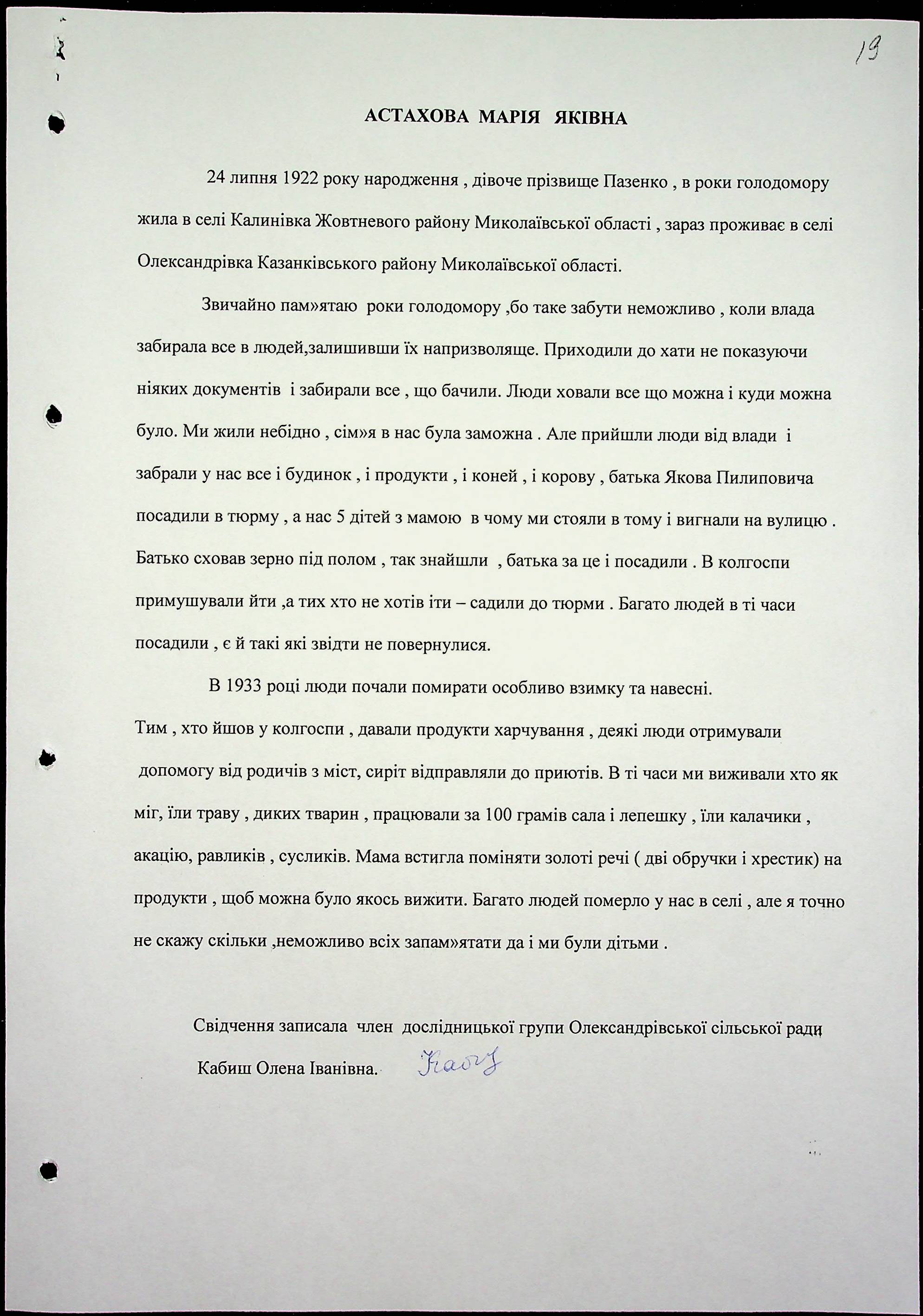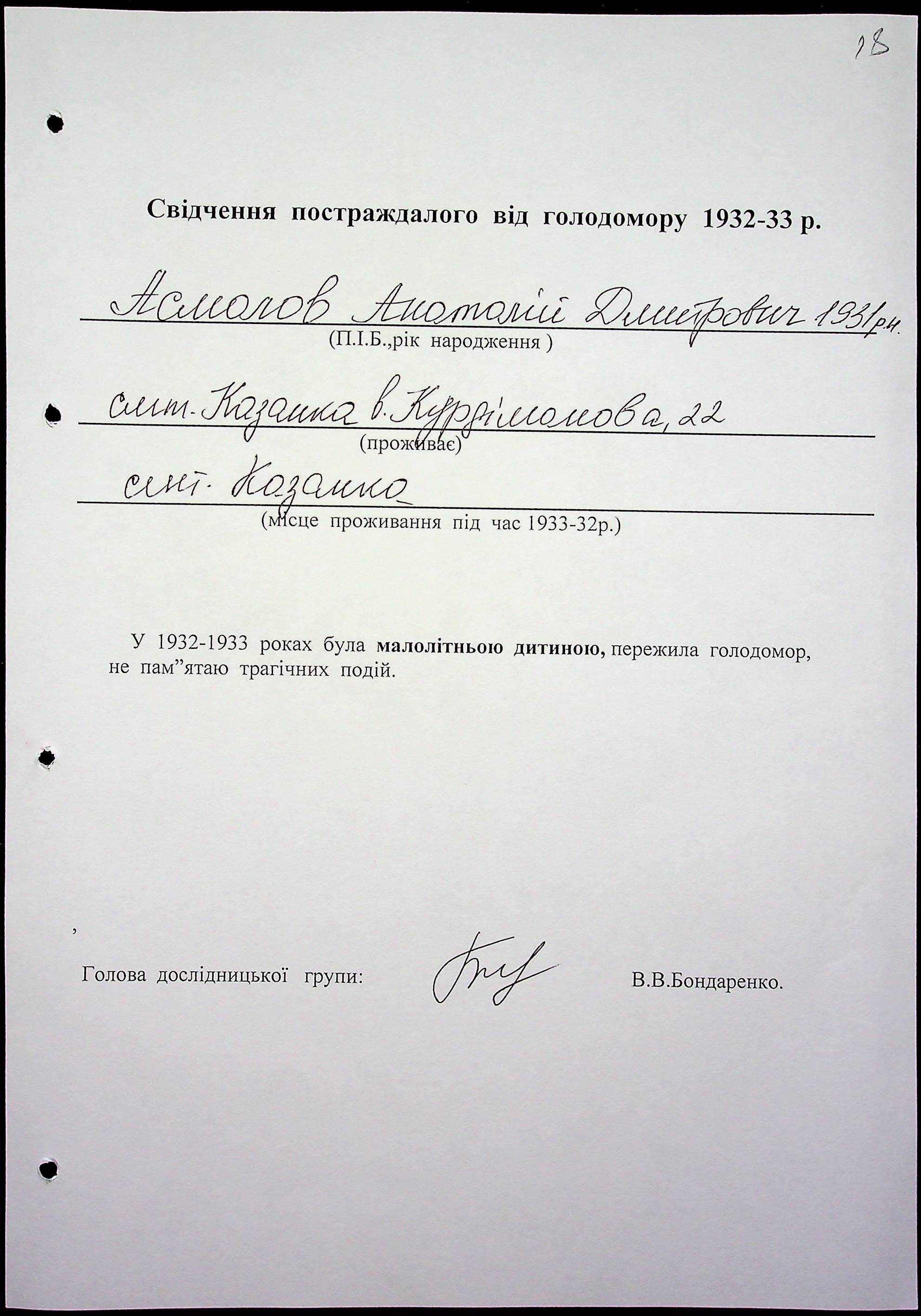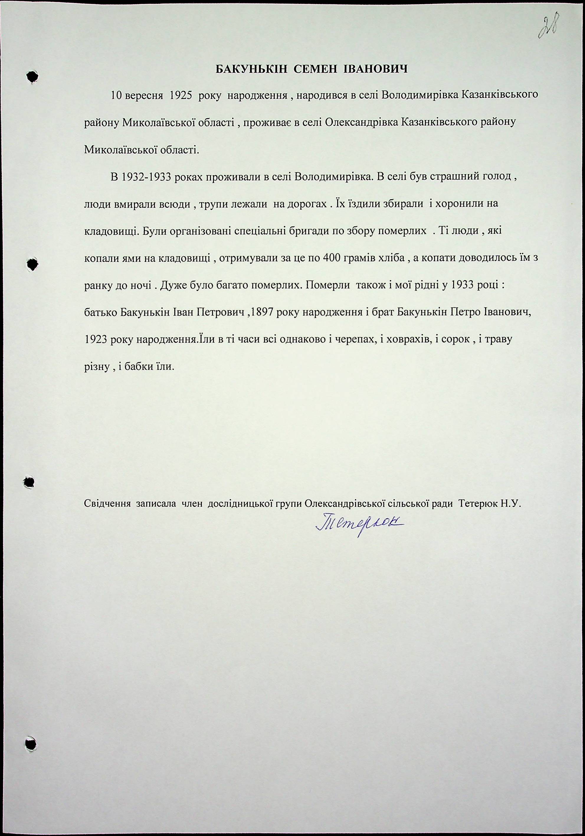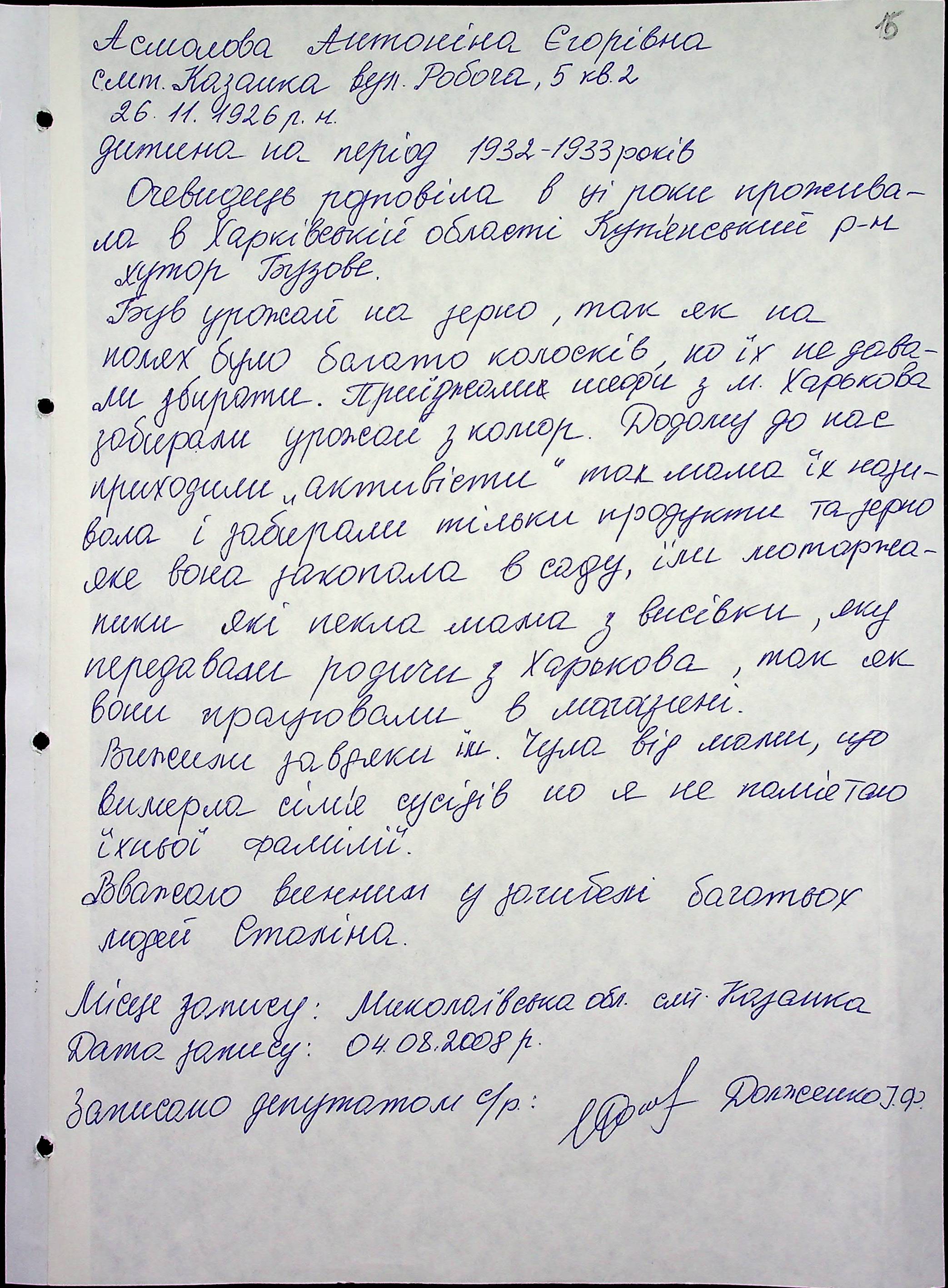 • • • • Справа № 38 “Свідчення очевидців Голодомору 1932-1933 років, які проживають у Казанківському районі, з прізвищами на літери А–І”