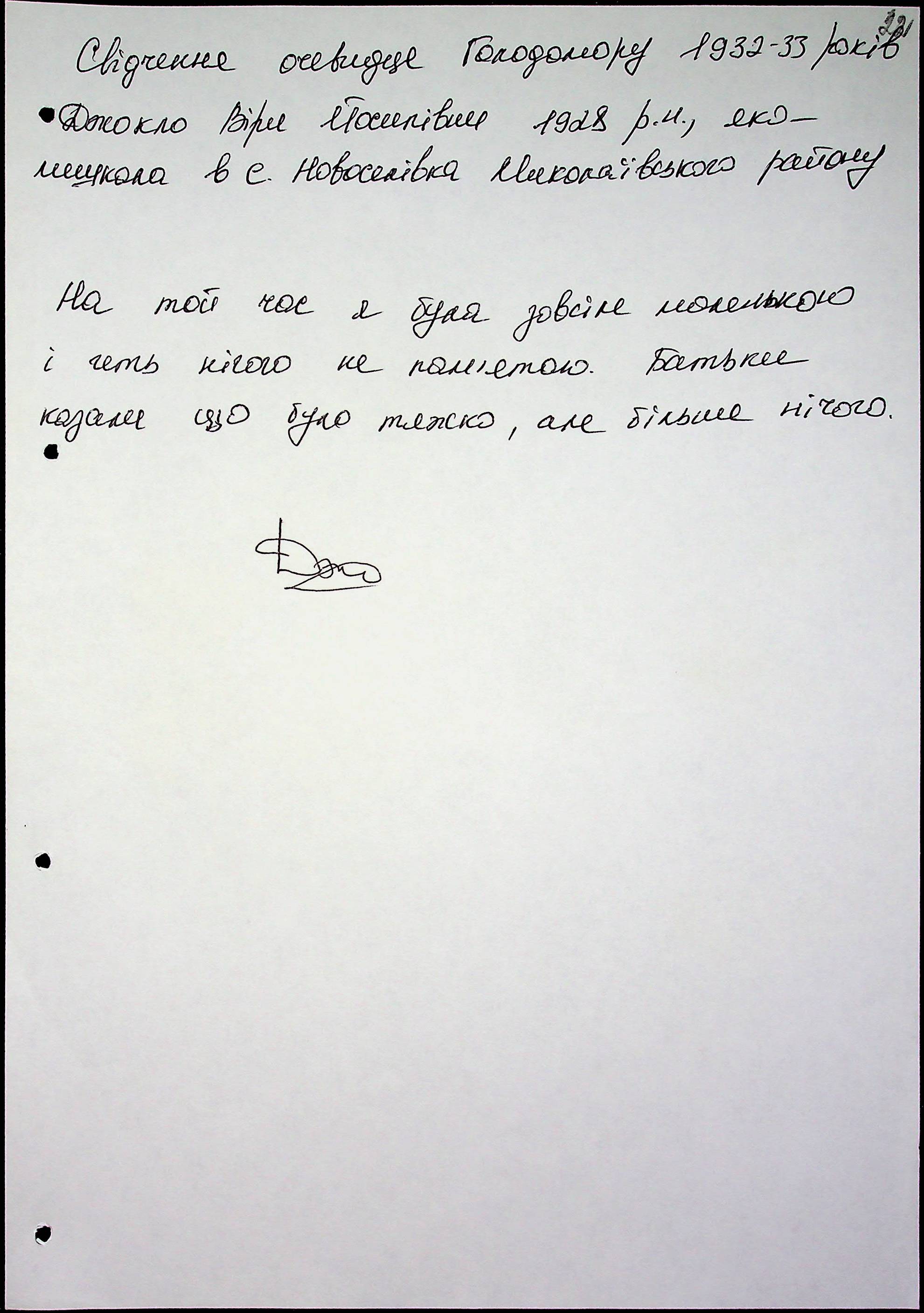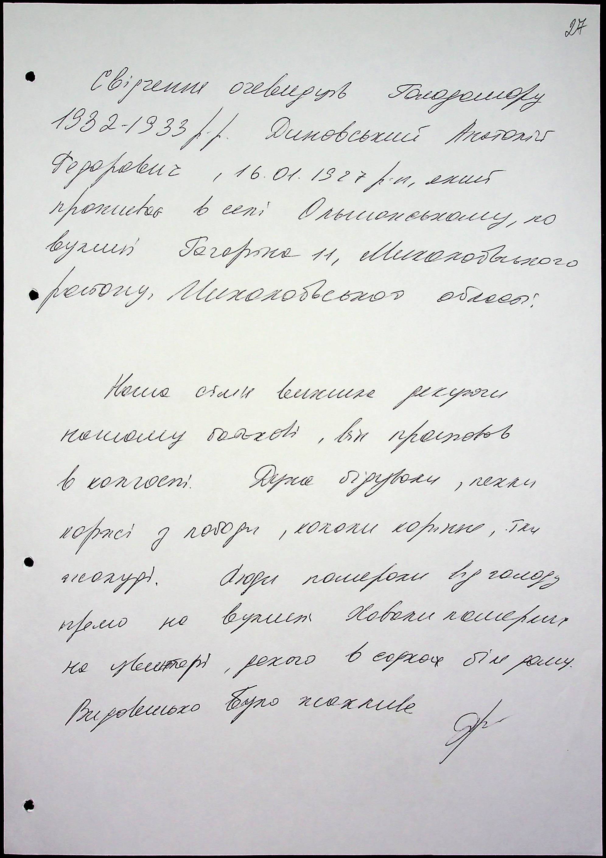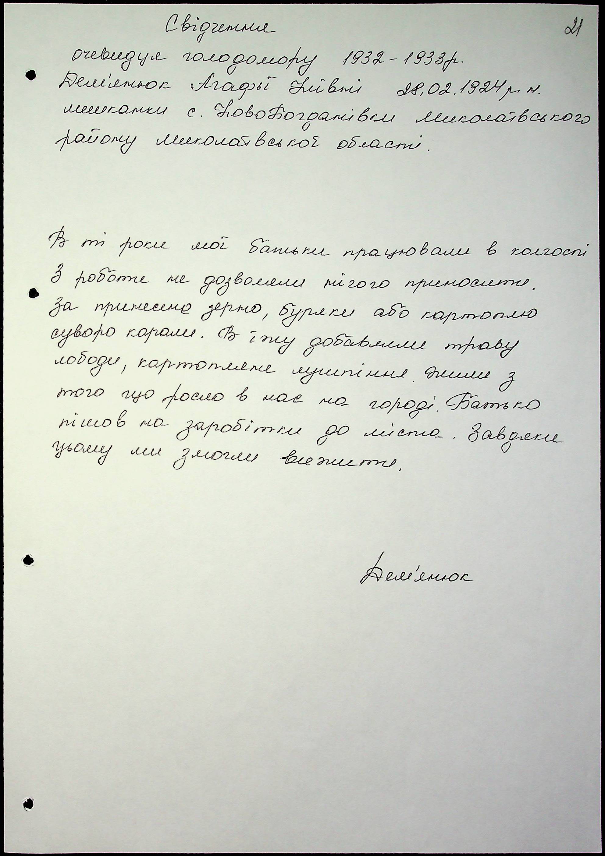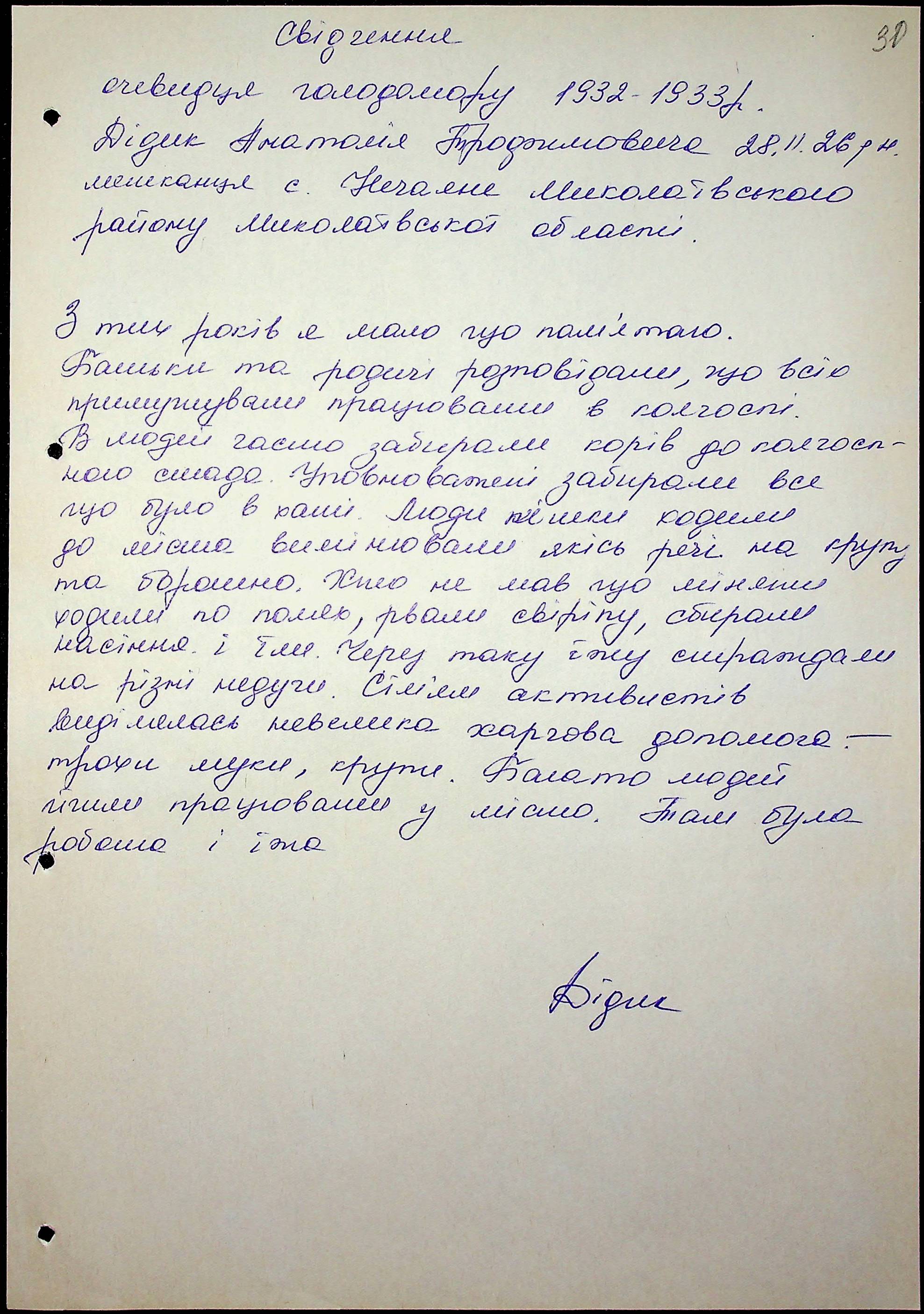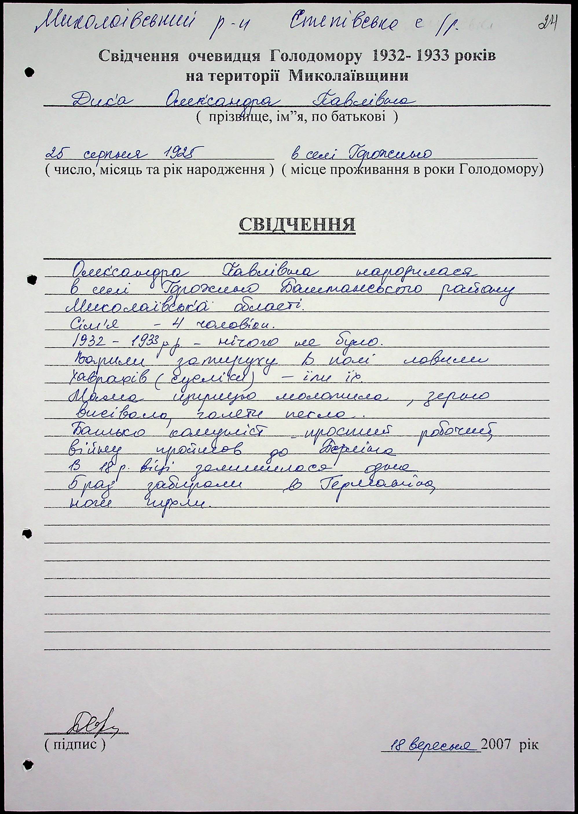 • • • • Справа № 47 “Свідчення очевидців Голодомору 1932-1933 років, які проживають у Миколаївському районі, з прізвищами на літери Д–І”
